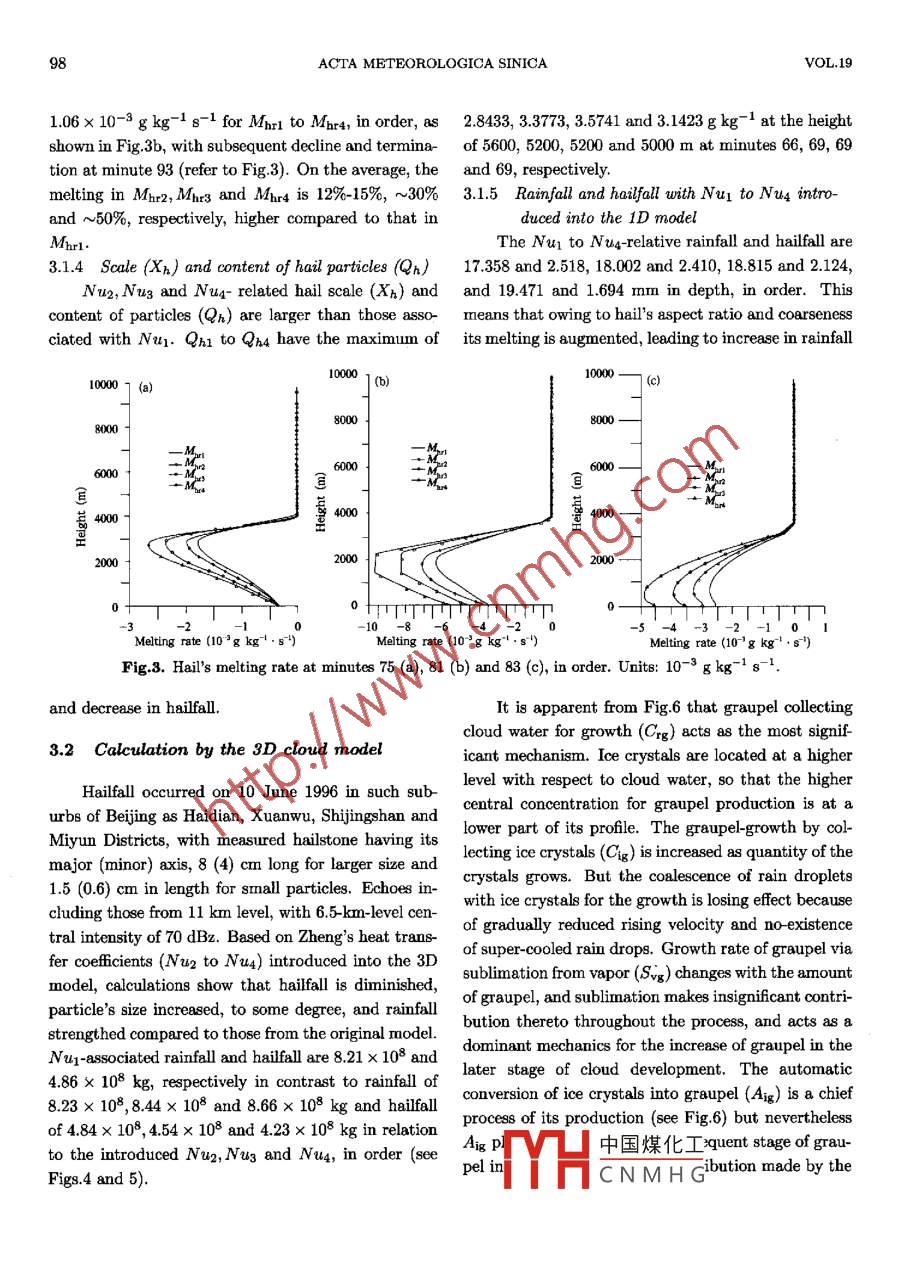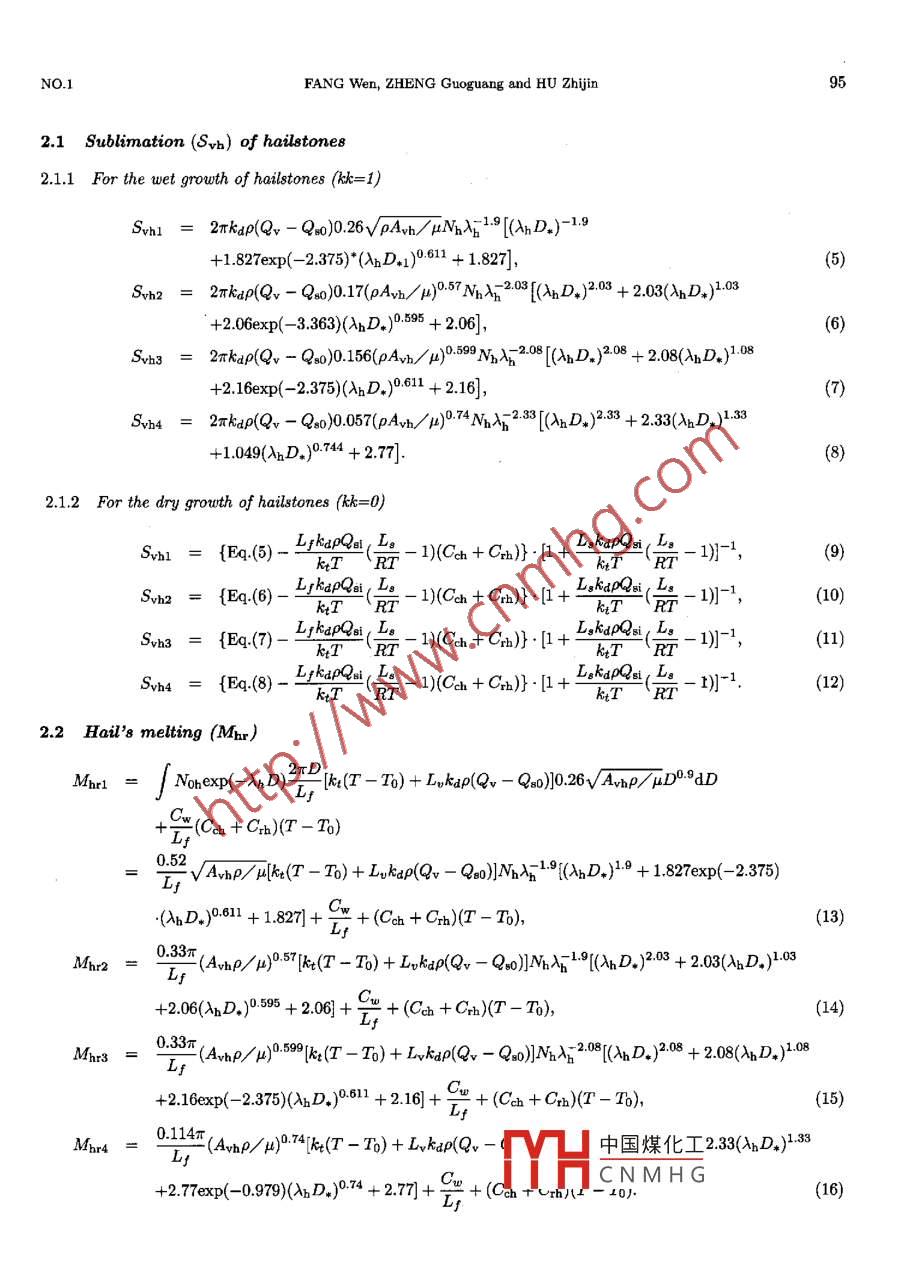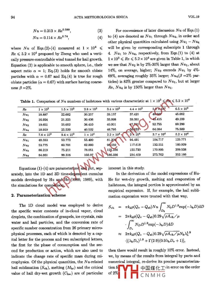 VOL.19 NO. 1ACTA METEOROLOGICA SINICA2005Numerical Simulations of the Physical Process forHailstone Growth*FANG Wen1,3 (房文), ZHENG Guoguang2 (鄭國(guó)光), and HU Zhjin3 (胡志晉)'Nanjing Univereity of Inforrmation Science and Technology, Nanjing 2100442 State Meteorological Administration of China, Beijing 1000813 Chinese Academy of Meterological Sciences, Bejjing 100081(Received March 30, 2004; revised August 31, 2004)ABSTRACTa determinant role in growth rates and different structures. However, many numerical model researchersmade extrapolation of the key heat transfer cofficient of the thermal balance expression from measurementsof evaporating water droplets obtained under small Renolds numbers (Re≤200) introduced by Ranz andMarshall, leading to great diference from reality. This paper is devoted to the parameterization of measuredheat transfer cofficients under Renolds numbers related to actual hail scales proposed by Zheng, which arethen applied, to Hu-He 1D and 3D models for hail growth respectively, indicating that the melting rateof a hailstone is 12% 50% bigger, the evaporation rate is 10%-20% higher and the dry-wet growth rate is10%-40% larger from the present simulations than from the prototype models.Key words: hail, paramneterization, numerical simulation, heat transfer1. Introductiontransfers are a lot more vigorous from oblate than fromspherical particles. Based on accurate measurementsTheoretical and experimental studies on the phys-of the surface temperatures of ice particles cooled onical processes of hail growth (Schumann, 1938; Lud-1.1 x 104≤Re≤5.2 x 104 using a thermal imag-lan, 1958; List, 1963) showed that its growth rate anding system, Zheng (1994) developed a numerical modelstructural characteristics depend on the heat and massfor defining a heat transfer coefficient denoted as Nutransfers; its dynamic characteristics determine hail-standing for Nusselt number and experiments indicatestone's movement and stay in clouds and damage donethat the obtained Nu is approximately 30% biggerto ground bodies, actually controlling the growth in-compared to the one coming from RM expression, 40%side clouds. As we know, the heat transfers affectslarger from oblate than from spherical particles withdirectly hailstone's wet growth, melting and evapo- the diameter equal to the major axis of the formerration. In their expression of heat balance equation,and even twice as large from coarse particles as fromhowever, a lot of researchers dealing with cloud-physicsspheroids of the same diamneter.models have adopted the heat transfer coefficient mea-In past studies, meteorological scientists employedsured from evaporating water drops at small Renoldsonly the measurement of evaporating water drops atnumbers (Re≤200) produced by Ranz and MarshallRe≤200 (vide ante) as the heat transfer cofficient(RM) and extended it to1x10≤Re≤1x 107, thus that is a key component of the thermal balance equa-leading to great difference from the conditions of ac-tion for hail growth, with the RM cofficient showntual hail particles (List, 1989; Zheng, 1994). Macklininvestigated by experiment the heat and vapor trans-Nu= 2.0+ 0.53 x Re-/2,(1)fer cofficients from melting particles, discovering thatcont中國(guó)煤化工the obtained transfers are considerably stronger com-pared to the equivalents given by RM and that theYHCNMHG.57,(2)"Supported by the National Natural Science Foundation of China under Grant No. 49775255.04ACTA METEOROLOGICA SINICAVOL.19Nu= 0.313 x Re0.599,(3)For convenience of later discussion Nu of Eqs.(1)Nu= 0.114 x Re0.74,(4to (4) are denoted as Nu1 through Nus, in order andother physical quantities calculated using Nu1 - Nuswhere Nu of Eqs.(2)-(4) measured at 1 x 104will be given by corresponding subscripts 1 throughRe≤5.2 x 104 proposed by Zheng who used a verti- 4. Nu1 to Nua, respectively, fom Eqs(1) to (4) atcally pesusenrtrollable wind tunnel for hail growth.1x103 ≤Re≤5.2x 104 are given in Table 1, in whichEquation (2) is applicable to smooth sphere, i.e., theirwe see that Nu2 is by 2%-30% larger than Nu, aboutaspect ratioa = 1; Eq.(3) holds for smooth oblate 14%, on average, higher; Nus exceeds Nu1 by 4%-particles witha= 0.67 and Eq.(4) is true for rough 69%, averaging roughly 35% larger; Nua(B = =2% par-oblate particles (a = 0.67) with surface having coarse ticle) is 83% greater compared to Nu, but at largerness β =2%.Re, Nus is by 150% larger than Nu1.Table 1. Comparison of Nu nunbers of hiltones with various characteristic at1x10°≤Re≤5.2x 10*R1x 1031.5x 1032.8x 1033.4 x 1034.4x 1035.2x 1036.5x 103Nu118.88722.68230.25733.13737.42140.50745.052u216.92421.32530.43633.99839.38143.41549.189Nu19.65125.05236.41040.90147.73152.75560.299Nua18.91925.53940.53246.79556.632 .64.08475.589Re7.6x 1039.4x 1031x 1042.2x 1043x 1043.7x 105.2x 10448.55353.77355.40081.20594.491104.717123.771Ne53.77560.70162.88098.559117.618132.551160.92966.21975.21178.051125.166150.720170.895209.538Nu484.86199.316103.97186.336234.409273.762352.166Equations (1)-(4) are parameterized and put, sep- interest in this study.arately, into the 1D and 3D time-dependent cumulusIn the derivation of the model expressions of Hu-models developed by Hu and He (1988; 1989), with He for wet-dry growth, melting and evaporation ofthe simulations for comparison.hailstones, the integral portion is approximated by anempirical expression. If, for example, the hail subli-2. Parameterization schememation expression were treated with that way,The 1D cloud model was employed to deriveSvh = πrkap(Qv - Qgo)NupooNoD'9exp( -入h D)dDthe specific water contents of in-cloud vepor, cloudJDgdroplets, the combination of graupels, ice crystals, rain= 2πkap(Qv - Qs0)0.29√pAvh/μwater and hail particles, and the conversion rate ofJ.NpDl-9exp(-AnD)dDspecific number concentration from 26 primary micro-physical processes, each of which is denoted by a cap-≈2πkap(Qv - Qso)0.29v pAvh/ μN(yùn)nH:9ital letter for the pr