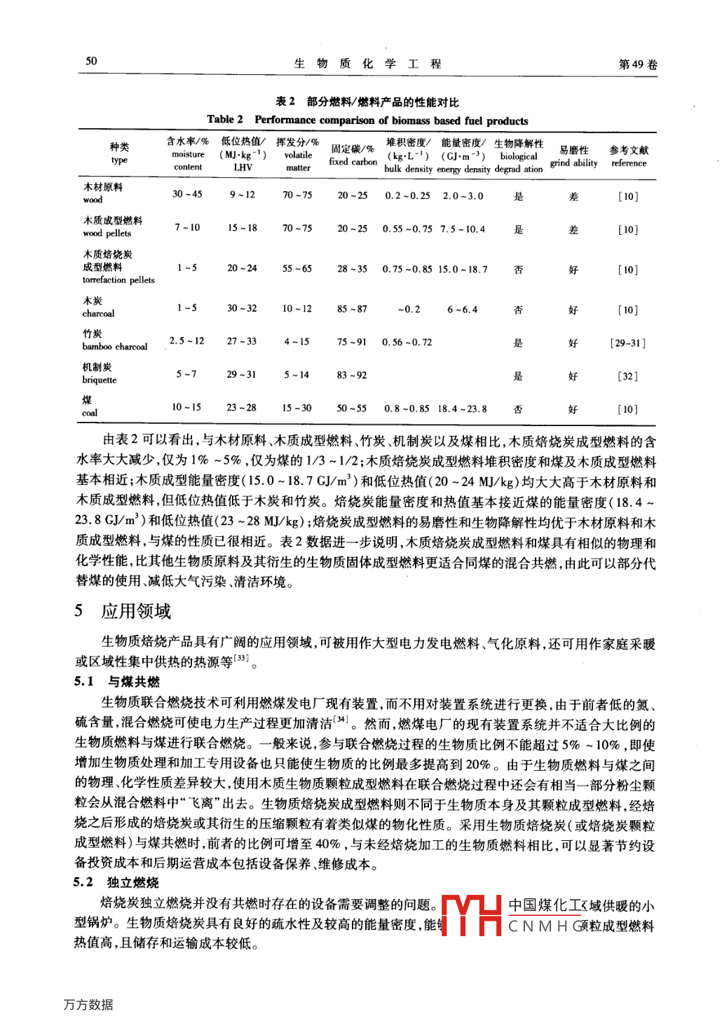 第49卷第5期生物質(zhì)化學(xué)工程Vol 49 No 52015年9月Biomass Chemical Engineeringsep.2015doi:10.3969/j.isn.16735854.2015.05.009綜述評論——生物質(zhì)能源·生物質(zhì)焙燒技術(shù)的研究與應(yīng)用進(jìn)展林啟晨,張文標(biāo),孫毅,張曉春!,汪孫國(1.浙江農(nóng)林大學(xué)工程學(xué)院,浙江臨安311300;2.加拿大新綠生物技術(shù)有限公司,基拉姆市T0B2L0,加拿大)摘要:綜述了國內(nèi)外生物質(zhì)焙燒原料、焙燒工藝與設(shè)備、焙燒產(chǎn)品性能及潛在應(yīng)用領(lǐng)堿等研究與應(yīng)用進(jìn)展,并提出了我國生物質(zhì)焙燒技術(shù)今后的重點(diǎn)研發(fā)方向。關(guān)鍵詞:生物質(zhì);焙燒炭;應(yīng)用中圖分類號:TQ35文獻(xiàn)標(biāo)識碼:A文章編號:1673-5854(2015)050047-06Overview of Biomass Torrefaction TechnologyLIN Qi-chen, ZHANG Wen-biao, SUN Yi, ZHANG Xiao-chun, WANG Sun-guo'(1. School of Engineering, Zhejiang A&F University, Lin'an 311300, China2. Nova Green INC, Killam, Alberta TOB 2LO, Canada)Abstract: This paper presents a global overview of the torrefaction raw materials, existing torrefaction technologies, characteristicsnd applications of products, as well as the future opportunities and challenges especially in ChinaKey words: biomass; torrefied biomass; application生物質(zhì)焙燒是在常壓隔氧、200~300℃溫度條件下進(jìn)行的一種生物質(zhì)熱處理技術(shù),其產(chǎn)物以固體焙燒炭為主,還有較少量的氣體和液體。通過焙燒能提高生物質(zhì)的能量密度、可研磨性及疏水性等性能,還能減少生物質(zhì)的運(yùn)輸和儲存成本。生物質(zhì)成型燃料是一種高效的清潔能源,可部分替代化石燃料,緩解人類面臨的能源和環(huán)境危機(jī),有效解決生物質(zhì)原料運(yùn)輸、儲存、防火等問題,具有廣闊的發(fā)展前景2。然而,當(dāng)生物質(zhì)成型燃料單獨(dú)使用或與煤共燃時(shí),容易引起鍋爐結(jié)渣、燃燒效率低等技術(shù)問題4,嚴(yán)重阻礙了生物質(zhì)成型燃料的產(chǎn)業(yè)化進(jìn)程。生物質(zhì)焙燒是指生物質(zhì)原料在隔絕空氣(缺氧)、溫度200~300℃條件下進(jìn)行的溫和熱解反應(yīng)過程。在此過程中生物質(zhì)表面特性發(fā)生改變,最終的固體產(chǎn)物通常稱為生物質(zhì)焙燒炭或生物質(zhì)煤53。生物質(zhì)通過焙燒能顯著提高其能量密度、可研磨性及疏水性,由此可大大減少運(yùn)輸和儲存成本。焙燒炭產(chǎn)品具有類似煤的物化性質(zhì),且氮、硫含量明顯低于煤,是種清潔能源,能與煤混合共燃并可以起到有效降低溫室氣體的作用◇圓。生物質(zhì)培燒炭在國外的研究較多,主要在北美和西歐等發(fā)達(dá)國家1,在國內(nèi)研究起步晚,最近幾年才有部分高校和科研院所研究者開始生物質(zhì)焙燒炭的研究31。隨著全球環(huán)保意識的增強(qiáng)、各國相關(guān)法律和法規(guī)的相繼出臺,生物質(zhì)焙燒技術(shù)作為一種切實(shí)可行的生物質(zhì)預(yù)處理技術(shù)開始得到世界范圍的廣泛重視。作者就國內(nèi)外生物質(zhì)焙燒原料、焙燒工藝、焙燒設(shè)備、焙燒產(chǎn)品性能及其潛在應(yīng)用領(lǐng)域等方面進(jìn)行了闡述,同時(shí)對焙燒技術(shù)的發(fā)展方向也進(jìn)行了展望。焙燒原料焙燒可采用的原料有很多種,國外一些研究者分別采用了松木、柳樹枝、采伐剩余物、甘蔗渣、芒草、收稿日期:20150206基金項(xiàng)目:國家科技部農(nóng)業(yè)科技成果轉(zhuǎn)化項(xiàng)目(2010cB2C200175);浙江省農(nóng)業(yè)科V凵中國煤化工浙江農(nóng)林大學(xué)科研發(fā)展基金項(xiàng)目(2034020049)CNMHG作者簡介:林啟晨(1989—),男,浙江紹興人,碩士生,研究方向?yàn)樯镔|(zhì)炭加工利用;Emai:oneonly88126.com通訊作者:張文標(biāo),男,浙江遂昌人,教授,博士,主要從事竹木材加工與利用研究工作;Emal:awb@afu.edu.cno生物質(zhì)化學(xué)工程第49卷橄欖油廢棄物和銀合歡等進(jìn)行了焙燒試驗(yàn)研究1。國內(nèi)研究者對稻殼、紅松、棒木松、稻稈、棉稈和沙柳等進(jìn)行了焙燒研究3120。不同的生物質(zhì)原料,經(jīng)焙燒后的生物質(zhì)炭的性能差異較大,有研究結(jié)果表明:并不是所有生物質(zhì)資源都是理想的焙燒原料,一般以含有大量纖維素、半纖維素和木質(zhì)素的木質(zhì)生物質(zhì)資源為最佳。而農(nóng)作物受季節(jié)性收獲的制約,且成分組成與木質(zhì)生物質(zhì)差異較高,灰分和揮發(fā)分含量較高焙燒產(chǎn)品會對設(shè)備性能造成不利影響同時(shí)還需要比燃用木質(zhì)生物質(zhì)焙燒產(chǎn)品增設(shè)更多的排放控制設(shè)施。因此,目前大多數(shù)國外企業(yè)還是主要采用木質(zhì)生物質(zhì)原料焙燒產(chǎn)品,用于與煤共燃。2焙燒工藝2.1焙燒機(jī)理通常認(rèn)為焙燒機(jī)理實(shí)質(zhì)上是半纖維素分解纖維素和木質(zhì)素解聚的過程,在不降低生物質(zhì)能量的情況下大幅縮減生物質(zhì)原料的質(zhì)量1。焙燒過程中,生物質(zhì)在100~170℃干燥并部分脫除揮發(fā)分,半纖維素在200℃左右開始分解,在260-300℃劇烈分解,產(chǎn)生大量的揮發(fā)性物質(zhì),木質(zhì)素和纖維素在200~300吸熱,分子鏈結(jié)構(gòu)發(fā)生變化,但是分解反應(yīng)弱2。2.2焙燒工藝條件生物質(zhì)焙燒工藝是指在一定的焙燒溫度(200-300℃)和保溫時(shí)間(30-90min)下,對生物質(zhì)原