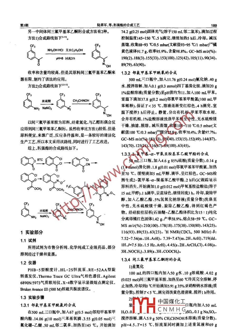 第50卷第3期Vl.50,No.32011年3月AGROCHEMICALSMar 2011研與開肟菌酯的合成工藝陸翠軍,劉建華,杜曉華浙江工業(yè)大學(xué)催化加氫研充中心,杭州310014)摘要:(方法]以苯酞為主要原料先與雙(三氯甲基)碳酸酯(BTC)開環(huán)反應(yīng)生成鄰氯甲基苯甲酰氯再與氰化鈉反應(yīng)得到鄰氯甲基苯甲酰氰,甲醇酯化然后與甲氧基胺鹽酸鹽肟化,最后與間三氟甲基苯乙酮肟縮合得到肟菌酯。[結(jié)果]合成路線5步總收率22%。[結(jié)論該工藝簡單經(jīng)濟(jì)條件溫和適合工業(yè)化生產(chǎn)。關(guān)鍵詞:殺菌劑;肟菌酯;鄰羥甲基苯甲酸內(nèi)酯;合成中圖分類號:TQ4603文獻(xiàn)標(biāo)志碼:A文章編號:10060413(201103018705Synthesis of TrifloxystrobinLU Cui-jun, LIU Jian-hua, DU Xiao-hua( Catalytic Hydrogenation Research Center, Zhejiang University of Technology, Hangzhou 310014, ChiAbstract: [Methods] Trifloxystrobin was synthesized using phthalide as a main starting material, by the reactions ofphthalide ring-opening with bis(trichloromethyl)carbonate to give o-chloromethylbenzoyl chloride, cyaniding to givea-chloromethylbenzoyl cyanide, esterifying with methanol, oximating with methoxyaminium chloride, and condensatingwith 3( trifluoromethyl)acetopheoxime. [Results] The total yield was 22% based on phthalide. [Conclusions] Thisprocess is simple, warm and economical, which is suitable for industrial scale manufacture.Key words: fungicide; trifloxystrobin; phthalide; synthesis肟菌酯 trifloxystrobin)是從天然產(chǎn)物 Strobilurins作為與甲氧基鹽酸鹽肟化,再經(jīng)N-溴丁二酰亞胺溴化得到2先導(dǎo)化合物成功開發(fā)的一種含氟殺菌劑。它能被植物蠟溴甲基-甲氧亞胺基苯乙酸甲酯,合成路線如下。質(zhì)層強(qiáng)烈吸附,對植物表面提供優(yōu)異的保護(hù)活性。主要用M,乙腰,cuBr2LBr于葡萄、蘋果、小麥、花生、香蕉、蔬菜等進(jìn)行莖葉處理、防治。肟菌酯在土壤中、水中可快速降解,對環(huán)境安全肟菌酯主要通過2-鹵代甲基-α-甲氧亞胺基苯乙酸酯與間三氟甲基苯乙酮肟縮合得到其中鹵素通常是氯或溴。按起始原料的不同,中間體2-鹵代甲基a-甲氧亞OOCH3胺基苯乙酸甲酯的合成方法可以歸納為以下10種。1)以鄰甲基苯乙酮為原料,經(jīng)高錳酸鉀的堿性氧化,與路線1)的不同之處在于2-氯甲基a-羰基苯乙酸甲甲醇酯化再與甲氧基鹽酸鹽肟化然后用N溴丁二酰亞酯通過步反應(yīng)得到看似簡化了反應(yīng)步驟但是第1步反胺溴化得到2-溴甲基—a-甲氧亞胺基苯乙酸甲酯,合成應(yīng)過程復(fù)雜,條件較苛刻且起始原料較昂貴不適合工業(yè)路線如下。化生產(chǎn)。3)以鄰甲基苯甲酸為原料,與亞硫酰氯回流得鄰甲基苯甲酰氯;與氰化鉀反應(yīng)得鄰甲基苯甲酰氰;然后酯化、肟化溴化得2-溴甲基a-甲氧亞胺基苯乙酸甲酯門,合成路線如下路線簡單,反應(yīng)條件溫和但是總收率較低,原子利用率不高;溴化過程難以控制容易產(chǎn)生二溴化合物。2)以鄰溴甲苯和乙二酰氯單甲酯為原料通過銅鋰試中國煤化工劑進(jìn)行偶聯(lián)反應(yīng)得到2-氯甲基α-羰基苯乙酸甲酯然后CNMHG牲較大的亞硫酰氯收稿日期:2010-12-15作者簡介:陸翠軍(1985),男江西九江人,碩士研究生。通訊作者:杜曉華。T:057188320430,E-mail::xiaohua@jut.edu.cn農(nóng)藥 AGROCHEMICALS產(chǎn)生有害氣體二氧化硫仍然采用了產(chǎn)率較低的溴化步驟第2步收率僅有30.3%,且該步驟中格式反應(yīng)難以控4)以鄰甲基苯甲醛為原料,5步反應(yīng)得2-溴甲基—a-甲制,形成的格式中間體不穩(wěn)定;第3步需要12MPa高壓反氧亞胺基苯乙酸甲酯,總收率16%,合成路線如下。應(yīng)對設(shè)備要求高8)以鄰羥甲基苯乙酸內(nèi)酯為原料,3步反應(yīng)得2-氯甲基a-甲氧亞胺基苯乙酸甲酯,總收率25%合成路線如下COo sx COOCHCH3OH路線較長,收率較低,溴代過程用到毒性較大的溴素亞硫酰氯四氯化碳5)以NN-二甲基芐胺和草酸二甲酯為起始原料,經(jīng)起始原料鄰羥甲基苯乙酸內(nèi)酯難以獲得,甲某化試劑3步反應(yīng)得2氯甲基-甲氧亞胺基苯乙酸甲酯,3步總收硫酸二甲酯毒性較大,亞硫酰氯使用過程中產(chǎn)生污染環(huán)境率55%,合成路線如下。的二氧化硫氣體。以鄰甲基苯乙酸甲酯為原料,經(jīng)二氧化硒氧化得2-氯甲基-α-羰基苯乙酸甲酯然后肟化、溴化得2-溴甲基—a-甲氧亞胺基苯乙酸甲酯,合成路線如下。O OCH3該路線相對簡單收率較高,但是第1步反應(yīng)需要用到貴的四丁基鋰,不利于工業(yè)化生產(chǎn)6)以鄰甲基苯乙腈為原料,5步反應(yīng)得2-氯甲基a-甲氧亞胺基苯乙酸甲酯,總收率239%,合成路線如下。該路線只在文獻(xiàn)中提到,沒有操作實(shí)例,并且原料二氧化硒價(jià)格較貴10)以鄰羥甲基苯甲酸內(nèi)酯為起始原料,4步反應(yīng)得2-氯甲基a-甲氧亞胺基苯乙酸甲酯,總收率46%,合成路NOCH3線如下。COOCH3COOCH第1步溴代反應(yīng)收率僅45%易產(chǎn)生多溴代物難以分離;第3步反應(yīng)需要無水無氧操作,且用到毒性較大的硫酸7)以鄰氯芐氯為原料,4步反應(yīng)得2-氯甲基α-甲氧亞苯酞開環(huán)生成酰氯基和氯甲基,省去了低收率的溴化胺基苯乙酸甲酯,總收率22%,合成路線如下?;蚵然襟E各步反應(yīng)條件溫和,總收率較高。但是該路線也存在較大的缺點(diǎn),開環(huán)反應(yīng)使用毒性較大的亞硫酰氯產(chǎn)生有害氣體二氧化硫,且后2步反應(yīng)需要使用過量氯化氫氣體對反應(yīng)設(shè)備的要求較高所以