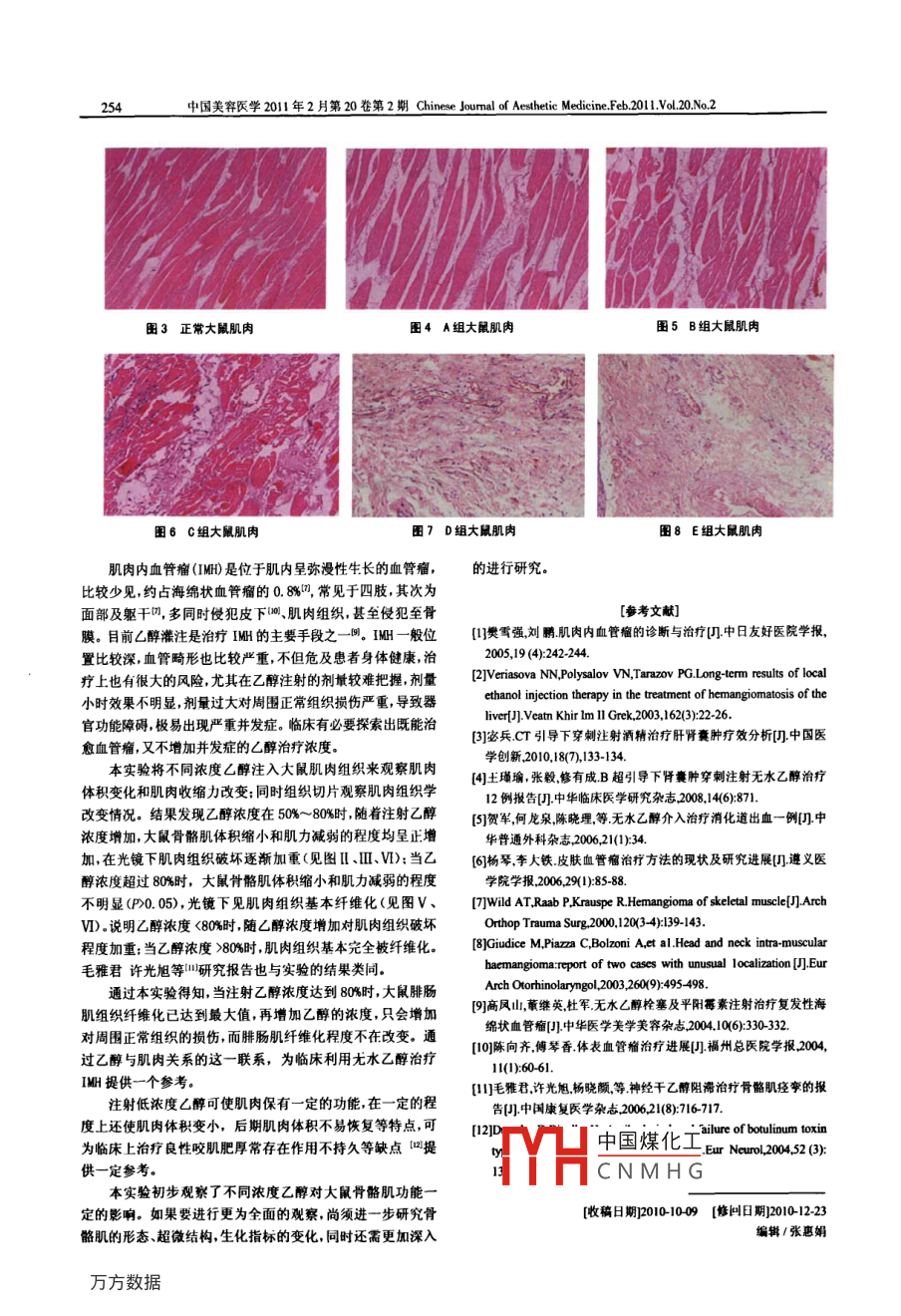 國美容醫(yī)學(xué)2011年2月第20卷第2期 Chinese Journal of Aesthetic Medicine Feh201lvo.20N2程度的加重,這種變化漸趨明顯。因此,癥痕組織的形成 for image interpretation[]. Echocardiography200623(2):103-107.可能與機體細胞免疫功能異常升高和體液免疫功能水平[7冷向鋒王德昌然等燒傷后增生性癩痕成纖維細胞中TRAL降低有關(guān)。受體的表達及意義門中華整形外科雜志200521(6):444[參考文獻]gical Reviews, 2006, 20(9): 5-9[]閆貴春表銀輝痕發(fā)生機制研究進展門中國美容醫(yī)學(xué)2010,19[9)Cilio CM. Daws MR,Malashicheva A, et al. Cytotoxic T lymphocyte(8):1251-1253.antigen 4 is induced in the thymus upon in vivo activation and its[2]郭建輝,曹毅.癥痕治療的研究進展門浙江中醫(yī)藥大學(xué)學(xué)報,blockade prevents anti-CD3-mediated depletion of thymocytes [].J2007,31(3):402404Exper Med,1998188(7:1239-1246.[3]Borondo F, Wisniacki DA, Vergini EG, et al. The scar mechanism [10JImami N, Aspinall RGotch F. Role of the thymus in T lymphocyterevisited[]. Europ Physi J, 2008, 65(12): 93-101reconstitution(comment)]. Transplantation, 20006,(11)2238-2239[jAquet K, Krause KT, Denschel JR,et al. Eduction of myocardial sc[1姜五章季曉輝李五峰等環(huán)磷酰胺和環(huán)孢素A對SLE患者外size after implantation of mesenchymal stem cells in rats: what is the周血Th細胞亞群兔疫調(diào)節(jié)的作用團細胞與分子免疫學(xué)雜志mechanism[]? Stem Cells and Development, 2005, 14(3): 299-309.2008,24(2):172-174Drobnik J, Karbownik-Lewinska M, Szczepanowska Aet al.[2陳海燕韓捷華詠等類風(fēng)濕關(guān)節(jié)炎患者Th細胞亞群的檢測及礎(chǔ)研究Regulatory influence of melatonin on collagen accumulation in the其臨床意義門中國誤診學(xué)雜志20088(6:1272-1274infarcted heart scar J]. J Pine Res, 2008, 45(3): 285-290.[6JTabel GM, Whittaker P, Vlachonassios K,et al. Collagen fiber[收稿日期]201011-21[修回日期]201101-16morphology determines echogenicity of myocardial scar: implications編輯/張惠娟不同濃度乙醇對大鼠肌內(nèi)糾織影響的探討李岳令,陳石海,劉柳,段紅鈺(廣西醫(yī)科大學(xué)第一附屬醫(yī)院整形美容外科廣西南寧530021)[摘要]目的:探討不同濃度乙醇對大鼠腓腸肌功能及組織學(xué)的影響.方法:選取等重的雄性SD大鼠75只,隨機分入A、B、C、DE五組,在各組大鼠左側(cè)腓腸肌注射D.2ml濃度分別為50、60%、70%、80%、9β%的乙醇,右側(cè)均注射相同量的生理鹽水,分別于注射后第3、7、14、21和28天分離大鼠左右側(cè)腓腸肌,檢測每只大鼠左右側(cè)腓腸肌的收編力差(△F)及肌體積差(△V),并取標本做巸?nèi)旧?光鏡下觀察肌肉組織學(xué)變化,結(jié)果:注射相同天數(shù),實驗組A、B、C、D組ΔF與△V隨乙醇濃度增加而明顯升高(R0.05),D組與E組之間無顯著差異(P0.05);同一乙醇濃度下,三周內(nèi),ΔF與ΔV均隨時間延長而明顯增加(R<0.05),與注射后第21天相比,注射后28天無明顯差異(P0.05)。光鏡下,隨著時間延長及濃度增大腓腸肌纖維化程度明顯加重.結(jié)論:隨著濃度(50%-80%)增加,乙醇對大鼠腓腸肌損傷程度加重;當乙醇濃度超過80%時,腓腸肌收縮功能基本喪失及組織學(xué)上基本纖維化。注射21天后,肌肉組織纖維化程度基本穩(wěn)定[關(guān)鍵詞]肌肉組織;乙醇;血菅瘤[中圖分類號]R732.2[文獻標識碼]A[文章編號]1008-64552011)02-0251-04To approach the different concentrations of alcohol on the myoideum of ratsLI Yue-ling, CHEN Shi-hai, LIU Liu, DUAN Hong-yu(Department of Plastic and Aesthetic Surgery The First Affiliated Hospital, Guangxi Medical University Nanning 530021Guangxi, China)Abstract: objective To explore the efficacy of the different concer中國煤化工of the functions andhistology of gastrocnemius muscle of rats. Methods 75 equipondeCN MH Gided into A.B. C DEfive groups randomly received the injection on the left of gastrocnemius muscle of rats in the 0.2ml of concentration ofalcohol that is 50%,60%,70%.80%.90% and on the right in the commensurate of physiological saline. Gastrocnemius通訊作者:陳石海,男,主任醫(yī)師,廣西醫(yī)科大學(xué)第一附屬氏院整形美容外科主任;主要研究方向:血管瘤皮瓣等E-mail: shihai003eyahoo com c中國美容醫(yī)學(xué)2011年2月第20卷第2期 Chinese Joumal of Aesthetie Medicine. Feb.2011Vol.20.No2muscle of rats was dissected 3, 7, 14, 21 and 28 days later, and detected the difference of contractility(AF)and organism(Av) Extracted the specimens in HE and observed the change of muscle tissue in light microscope. Results The groupsof d and E had no significant deviation (P>0.05)after the same of injection of days In the homo- concentration ofethanol, AF and Av increased obviously over time (P<0.05)in three weeks. Compared with 21 days later, 28 days laternad no significant deviation (P>0.05). With time and concentration obviously increased, the gastrocnemius increased thedegree of myofibrosis aggregately. Conclusion When the concentration of alcohol over 80%, the contractile function ofgastrocnemius muscle loss and organization of basic fibrosis. The degree of myofibrosis stabled basically 21 days later.Key words: muscle tissue; alcohol; hemangioma無水乙醇腫瘤內(nèi)灌注技術(shù)是近年來臨床上用于治療海1.5HE染色切片分析:測量體積后切取注射部位腓腸肌組綿狀血管瘤尤其是肌肉血管瘤( intramuscular織,10%甲醛固定,常規(guī)石蠟包埋切片,染色,光鏡下觀察肌hemangioma,IMD有效方法之一,但由無水乙醇對病變周圍細胞結(jié)構(gòu)、肌膜、肌纖維及細胞核的變化肌肉神經(jīng)等正常組織的損傷在一定程度上影響了疾病的治1.6統(tǒng)計方法:采用SPSs13.0統(