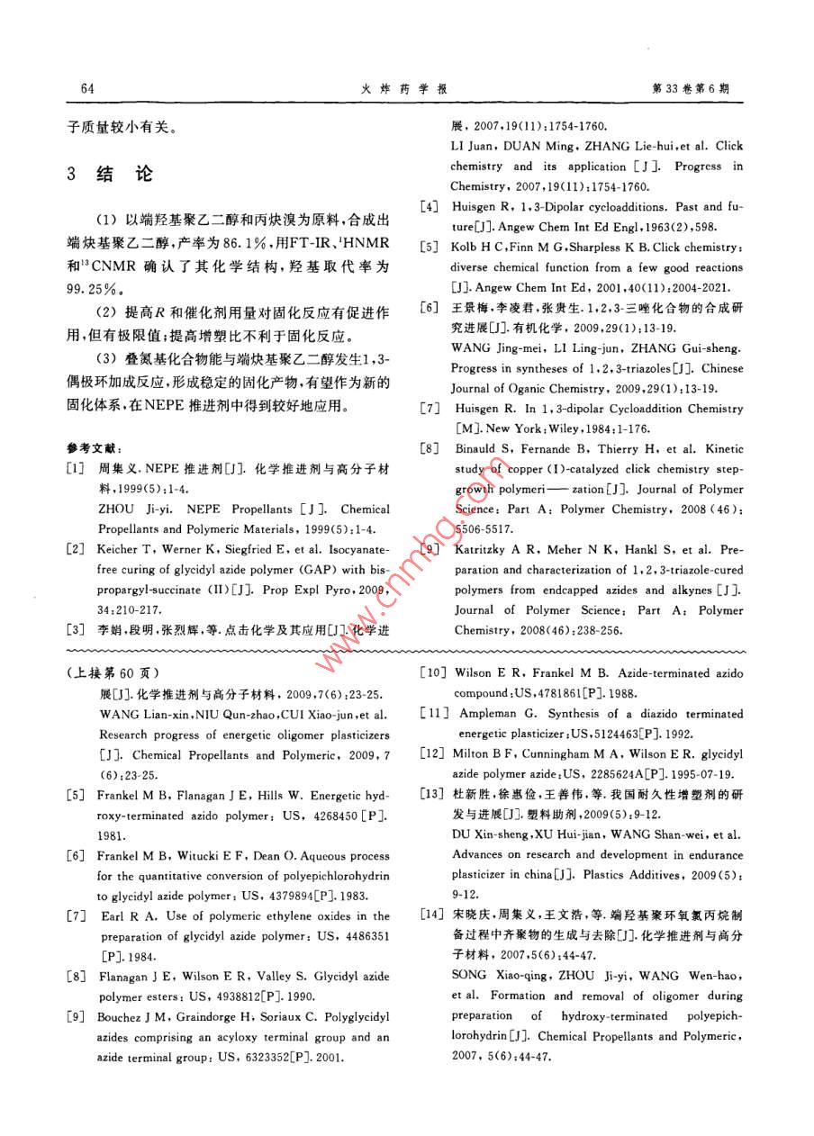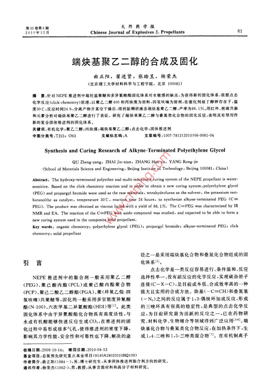 第33卷第6期火炸藥學報2010年12月 Chinese Journal of Explosives&. Propellants61端炔基聚乙二醇的合成及固化曲正陽,翟進賢,張晗昱,楊榮杰(北京理工大學材料科學與工程學院,北京100081)摘要:針對NEPE推進劑中端羥基聚醚和多異氰酸酯固化體系對水敏感的缺點,為獲得新的固化體系,依據(jù)點擊化學反應(click-chemistry-)原理,以聚乙二醇400和丙炔溴為原料,四氫呋喃為溶劑,在催化劑叔丁醇鉀存在下,溫度30C,反應時間24h,分離產物并真空干燥后,得到黏稠狀液態(tài)端炔基聚乙二醇,產率為86.1%用紅外、核磁共振和元素分析對端炔基聚乙二醇進行了表征。研究了端炔基聚乙二醇與疊氮類化合物的固化反應,表明其有望用作新的復合固體推進劑的固化體系。關鍵詞:有機化學;聚乙二醇;丙炔溴;端炔基聚乙二醇點擊化學固體推進劑中圖分類號:TJ55063文獻標志碼:A文章編號:1007-7812(201006-0061-04 Synthesis and Curing Research of Alkyne-Termin- Polyethylene Glycol QU Zheng-yang, ZHAI Jin-xian, ZHANG Han-yu, YANG Rong-ijie (School of Materials Science and Engineering, Beijing Institute of Technology, Beijing 100081, China) Abstract: The hydroxy-terminated polyether and multi-isocyanate curing system of the NEPE propellant is water- sensitive. Based on the click chemistry reaction and in order to obtain a new curing system, polyethylene glycol (PEG)and propargyl bromide were used as the raw materials, tetrahydrofuran as the solvent, the potassium tert- butanolthe as catalyst, temperature 30C, reaction time 24 hours, to synthesize alkyne-terminated PEG(C= PEG). The product was obtained as viscous liquid with a yield of 86. 1%. The C=PEG was characterized by IR NMR and EA. The reaction of the C=PEG with azido compound was studied, and expected to be able to form a new curing system used in the composite solid propellant. Key words: organic chemistry polyethylene glycol(peg) propargyl bromide; alkyne-termi- PEG; click chemistry: solid propellant徑之一是采用端炔基化合物和疊氮化合物組成的固引言化體系2點擊化學是一類反應容易進行、條件溫和、反應NEPE推進劑中的黏合劑一般采用聚乙二醇選擇性單一、沒有副反應的化學反應,實現(xiàn)碳雜原子PE)聚己酸內酯(PCL)或聚己酸內酯聚合物連接(C-X-C),是目前成本低、合成效率高的一種(PCP)、聚己二酸乙二醇酯(PGA)聚(環(huán)氧乙烷四強大且實用的合成方法。炔基(-C=CH)和疊氨基氫呋喃)共聚醚等,固化劑一般采用多官能度異氰酸(-N3)之間的反應屬于1,3偶極環(huán)加成反應,形成酯(N-100)、六次甲基二異氰酸酯(HDI)等此類的三唑環(huán)具有很高的穩(wěn)定性,是典型的點擊化學反固化體系中由于異氰酸酯化合物具有高度活性與應,為目前研究最為活躍的反應之一,已在藥物研水或有機酸能夠快速反應生成CO2在推進劑的固究、材料化學、生物綴合等領域得到廣泛應用6。端化過程中易形成很多氣孔使得推進劑的密度下降,炔基化合物與疊氮類化合物反應,在加熱條件下,生影響其力學性能,安全性和可靠性也下降解決的途成1,4-三唑和1,5-三唑類混合物。在有機銅離子收稿日期:2009-10-14;修回日期:2010-04-13基金項目:總裝預先研究重點基金項目(91028020510BQ109作者簡介:曲正陽(1984),男,博七研究生,從事固體推進劑黏合劑方向的研究。通訊作者:楊榮杰(1962-),男,教授,從事含能材料和高分子材料研究。62火炸藥學報第33卷第6期的催化作用下,選擇性地生成1,4-三唑類化合物.口燒瓶中分別加入1.4g叔丁醇鉀,2.0g聚乙二醇本研究以聚乙二醇400和丙炔溴為原料,四氫400,3.0g丙炔和95mL四氫呋喃,通氮氣保護,呋喃為溶劑,合成了端炔基聚乙二醇(Alkyne-水浴加熱,反應溫度30C,反應24h用飽和食鹽水 Terminated PEG,=Pe400),以期以兩個端炔溶液萃取,上層液旋蒸,真空干燥后,得到黏稠狀液基與多疊氮基有機化合物組成新的固化體系,在態(tài)產物產率86.1%NEPE推進劑中得到應用。將得到的產物與官能度為3.82的某疊氮類固化劑進行固化反應,以CuI為催化劑,醋酸三甘油酯1實驗為增塑劑,得到固化產物。1.1材料及儀器2結果與分析材料:丙炔溴和叔丁醇鉀,化學純, Alfa Aesar公司;聚乙二醇400,化學純,廣東汕頭市西龍化工廠;2.1C=PEG的反應機理四氫呋喃、氯化鈉和水,化學純,北京化學試劑公司。叔丁醇鉀具有強堿性,置換出PEG端羥基中的儀器: Nicolet67ft-i(全反射法)美國熱氫,生成PEG的鉀鹽C-X(X為鹵原子)鍵具有極電公司; AVANCE DRX-500型超導核磁共振波譜性,鹵原子帶部分負電荷,與之相連的碳原子帶部分儀,德國布魯克公司; Vario元素分析儀,德國正電荷,易受帶負電荷或未共用電子對試劑的進攻, Elementar公司。鹵原子帶一對電子離開,發(fā)生取代反應,烯丙型鹵代1.2實驗烴分子中的鹵原子活潑,容易與親核試劑作用,發(fā)生在裝有磁力攪拌器、回流冷凝管和溫度計的三取代反應。其反應式如下:HH HO fCH,-CH,-Of H+H,C-C-CH, THE +K-ofCH,-CH,-OfK"+H,C-C-CH.n o-K OH K-OfCH,-CHI-OfK+HC=C-CH,-Br-TE HC=C-CH-O fCH,-CH-O-CH,-C=CH+ KBr2.2C=PE400的結構表征2.2.2核磁共振譜圖分析2.2.1紅外譜圖分析以TMS為內標,CDCl3為溶劑,假定PEG400PEG400和C=PEG400的紅外譜圖見圖1和C=PEG400的分子結構和不同化學環(huán)境H的位100置如式(1)和式(2)所示。 80 C=6032412107669ho------4012342070344356750對PEG400和C=PEG400進行HNMR分析。400030000 PEG400:HNMR (CDCl3), 3.14(s,2H,site1),3.54~3.56(t,4h,site3),3.59~3.61(m,圖1PEG400和CPEG400的紅外譜圖24h,site4),3.65~3.68(t,4h,site2) Fig. IR spectra of PEG-400 and C=PEG400 C=PEG400: HNMR (CDCl3), 8: 2. 46(s,由圖1可知,在3443cm-1處,C=PEG