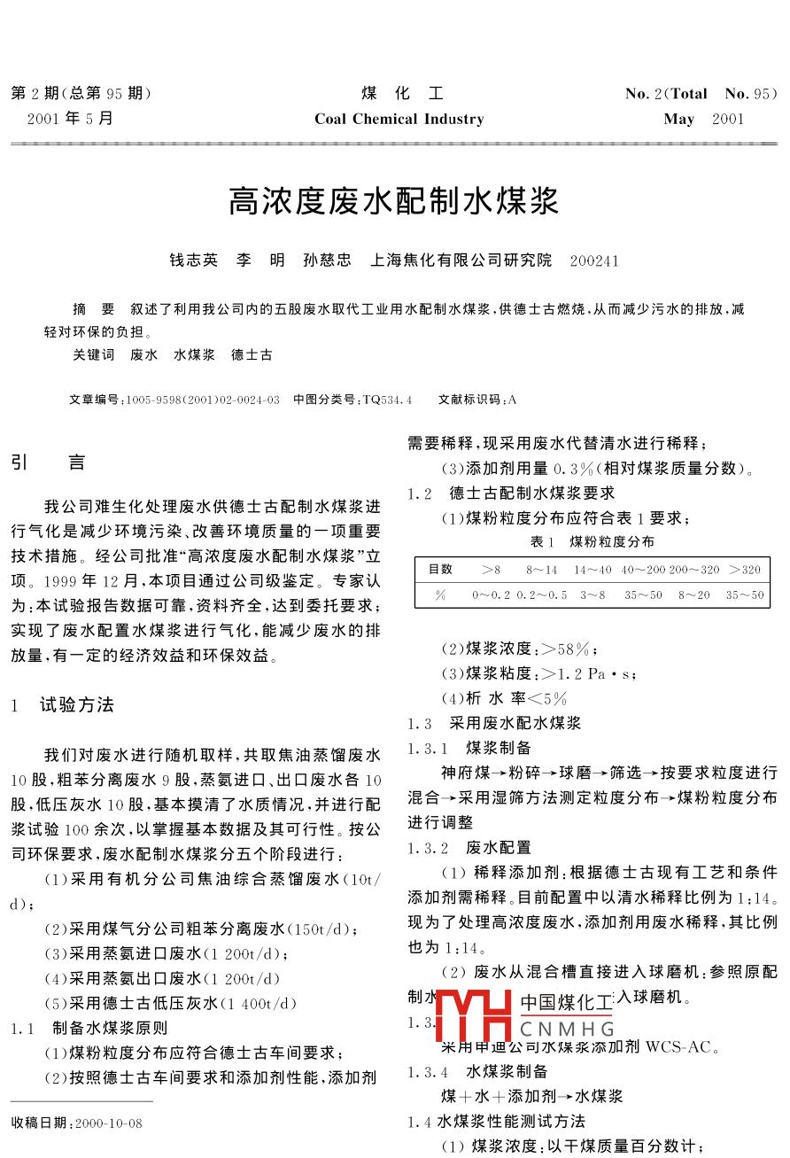 高濃度廢水配制水煤漿
