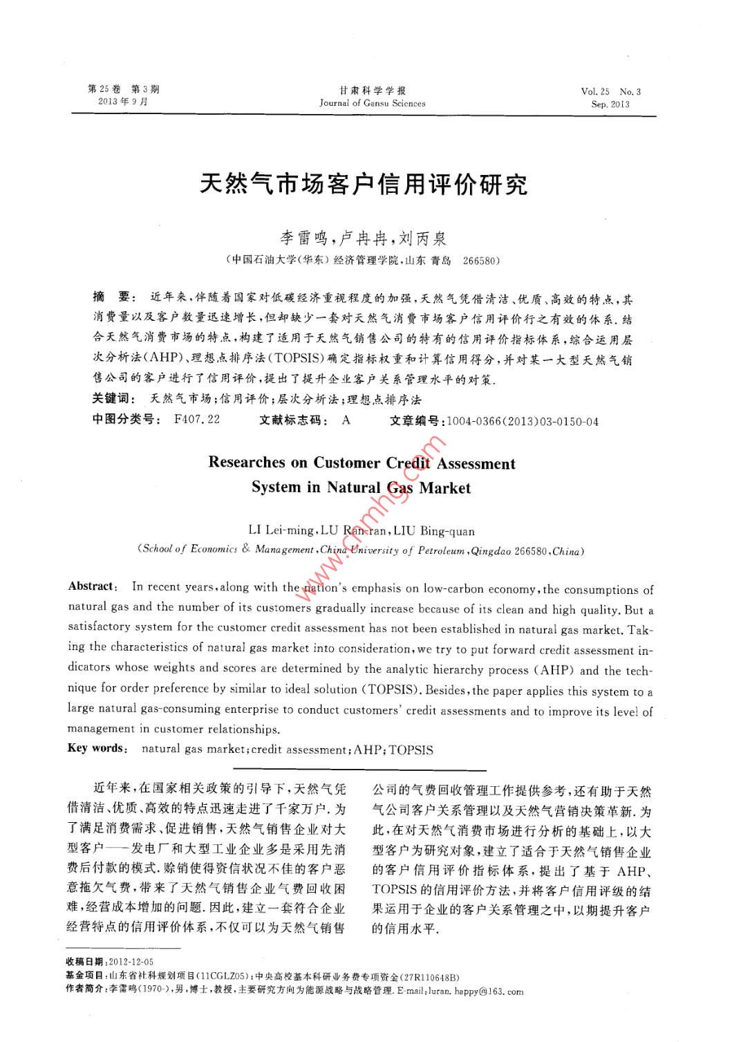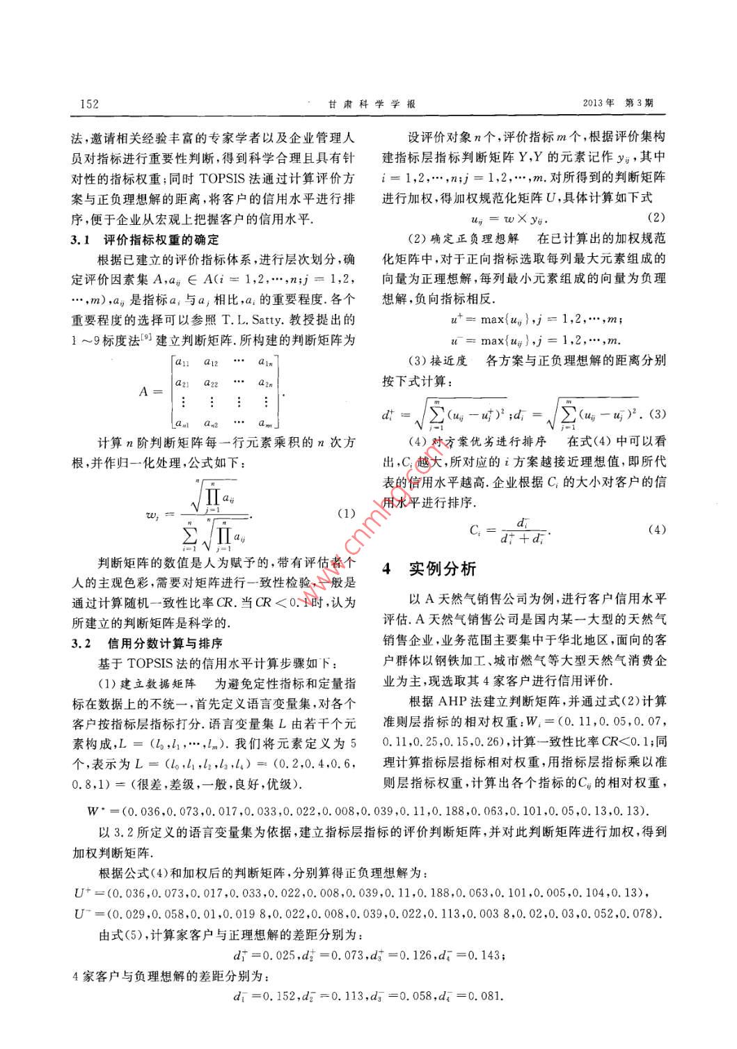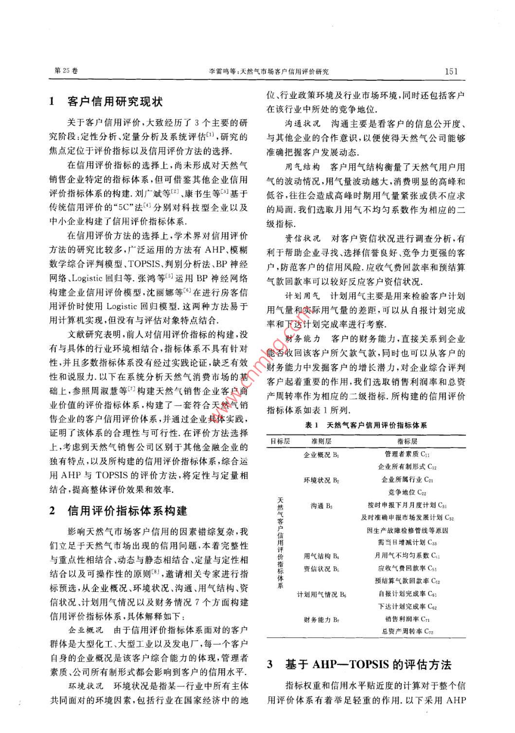 第25卷第3期甘肅科學學報Vol.25 No. 32013年9月Journal of Gansu SciencesSep. 2013天然氣市場客戶信用評價研究李雷鳴,盧冉冉,劉丙泉(中國石油大學(華東)經(jīng)濟管理學院,山東青島266580)摘要:近年來,伴隨著國家對低碳經(jīng)濟重視程度的加強,天然氣憑借清潔、優(yōu)質、高效的特點,其.消費量以及客戶數(shù)量迅速增長,但卻缺少一套對天然氣消費市場客戶信用評價行之有效的體系.結合天然氣消費市場的特點,構建了適用于天然氣銷售公司的特有的信用評價指標體系,綜合運用層次分析法(AHP)、理想點排序法(TOPSIS)確定指標權重和計算信用得分,并對某一大型天然氣銷售公司的客戶進行了信用評價,提出了提升企業(yè)客戶關系管理水平的對策,關鍵詞:天 然氣市場;信用評價;層次分析法;理想點排序法中圖分類號: F407. 22文獻標志碼: A文章編號:1004-0366(2013)03-0150-04Researches on Customer Credit AssessmentSystem in Natural Gas MarketLI Lei- ming,LU Ran ran,LIU Bing-quan(School of Economics & Mana gement ,China Univrsity of Petroleum ,Qingdao 266580,China)Abstract:In recent years,along with the nation's emphasis on low-carbon economy,the consumptions ofnatural gas and the number of its customers gradually increase because of its clean and high quality. But asatisfactory system for the customer credit assessment has not been established in natural gas market. Tak-ing the characteristics of natural gas market into consideration, we try to put forward credit assessment in-dicators whose weights and scores are determined by the analytic hierarchy process (AHP) and the tech-nique for order preference by similar to ideal solution (TOPSIS). Besides, the paper applies this system toalarge natural gas-consuming enterprise to conduct customers' credit asssments and to improve its leve! ofmanagement in customer relationships.Key words: natural gas market; credit assessment ;AHP; TOPSIS近年來,在國家相關政策的引導下,天然氣憑.公司的氣費回收管理工作提供參考,還有助于天然借清潔、優(yōu)質、高效的特點迅速走進了千家萬戶.為氣公司客戶 關系管理以及天然氣營銷決策革新.為了滿足消費需求、促進銷售,天然氣銷售企業(yè)對大此,在對天然氣消費市場進行分析的基礎上,以大型客戶一發(fā)電廠 和大型工業(yè)企業(yè)多是采用先消型客戶為研究對象,建立了適合于天然氣銷售企業(yè)費后付款的模式.賒銷使得資信狀況不佳的客戶惡.的客戶信用評價指標體系,提出了基于AHP、意拖欠氣費,帶來了天然氣銷售企業(yè)氣費回收困TOPSIS的信用評價方法,并將客戶信用評級的結難,經(jīng)營成本增加的問題.因此,建立-套符合企業(yè)果運用于企業(yè)的客戶關系管理之中,以期提升客戶.經(jīng)營特點的信用評價體系,不僅可以為天然氣銷售的信用水平.收稿日期:2012-12-05基金項目:山東省社科規(guī)劃項目(11CGLZ05):中央高?;究蒲袠I(yè)務費專項資金(27R110648B)作者簡介:李雷鳴(1970-),男.博士,教授,主要研究方向為能源戰(zhàn)略與哉略管理. E miluten. heppy@163. com第25卷李雷鳴等:天然氣市場客戶信用評價研究151位行業(yè)政策環(huán)境及行業(yè)市場環(huán)境,同時還包括客戶1客戶信用研究現(xiàn)狀在該行業(yè)中所處的競爭地位.關于客戶信用評價,大致經(jīng)歷了3個主要的研溝通狀況溝通主要是看客戶 的信息公開度、究階段:定性分析、定量分析及系統(tǒng)評估中,研究的與其他企業(yè)的合作意識,以便使得天然氣公司能夠焦點定位于評價指標以及信用評價方法的選擇.準確把握客戶發(fā)展動態(tài).在信用評價指標的選擇上,尚未形成對天然氣用氣結構客戶用氣結構衡量了 天然氣用戶用銷售企業(yè)特定的指標體系,但可借鑒其他企業(yè)信用氣的波動情況,用氣量波動越大,消費明顯的高峰和評價指標體系的構建.劉廣斌等[2]、康書生等01基于低谷,往往會造成高峰時期用氣量緊張或供不應求傳統(tǒng)信用評價的“5C"法叮分別對科技型企業(yè)以及的局面.我們選取月用氣不均勻系數(shù)作為相應的二中小企業(yè)構建了信用評價指標體系.級指標..在信用評價方法的選擇.上,學術界對信用評價資信狀況對客戶 資信狀況進行調查分析,有方法的研究比較多,廣泛運用的方法有AHP、模糊利于幫助企業(yè)尋找、選擇信譽良好、競爭力更強的客數(shù)學綜合評判模型、TOPSIS,判別分析法、BP神經(jīng)戶,防范客戶的信用風險.應收氣費回款率和預結算網(wǎng)絡.Logistic回歸等.張鴻等叮運用BP神經(jīng)網(wǎng)絡氣款回款率可以較好反應客戶資信狀況.構建企業(yè)信用評價模型,沈麗娜等[63在進行房客信計劃用氣計劃用氣主要 是用來檢驗客戶計劃用評價時使用Logistic 回歸模型.這兩種方法易于用氣量和實際用氣量的差距,可以從自報計劃完成用計算機實現(xiàn),但沒有與評估對象特點結合.率和下達計劃完成率進行考察.文獻研究表明,前人對信用評價指標的構建,沒財務能力客戶的財務 能力,直接關系到企業(yè)有與具體的行業(yè)環(huán)境相結合,指標體系不具有針對能否收回該客戶所欠款氣款,同時也可以從客戶的.性,并且多數(shù)指標體系沒有經(jīng)過實踐論證,缺乏有效財務能力中發(fā)掘客戶的增長潛力,對企業(yè)綜合評判性和說服力.以下在系統(tǒng)分析天然氣消費市場的基.客戶起著重要的作用,我們選取銷售利潤率和總資礎上,參照周淑慧等印]構建天然氣銷售企業(yè)客戶商產(chǎn)周轉率作為相應