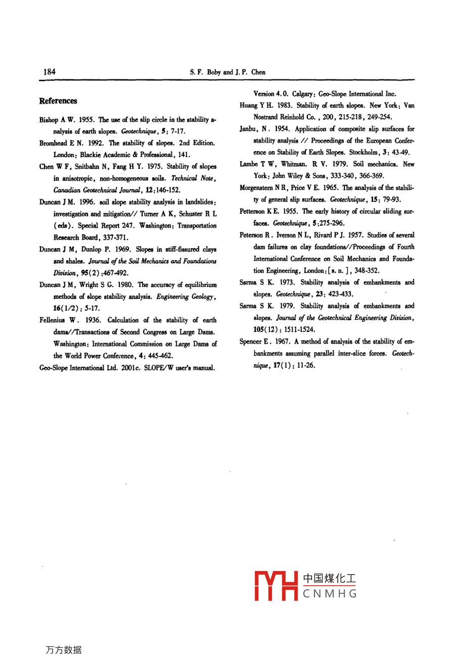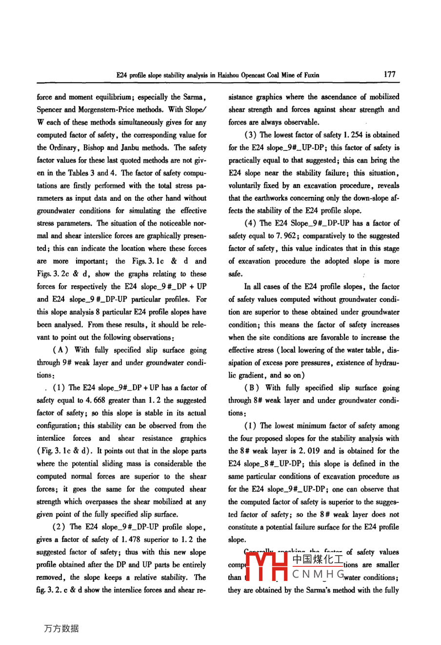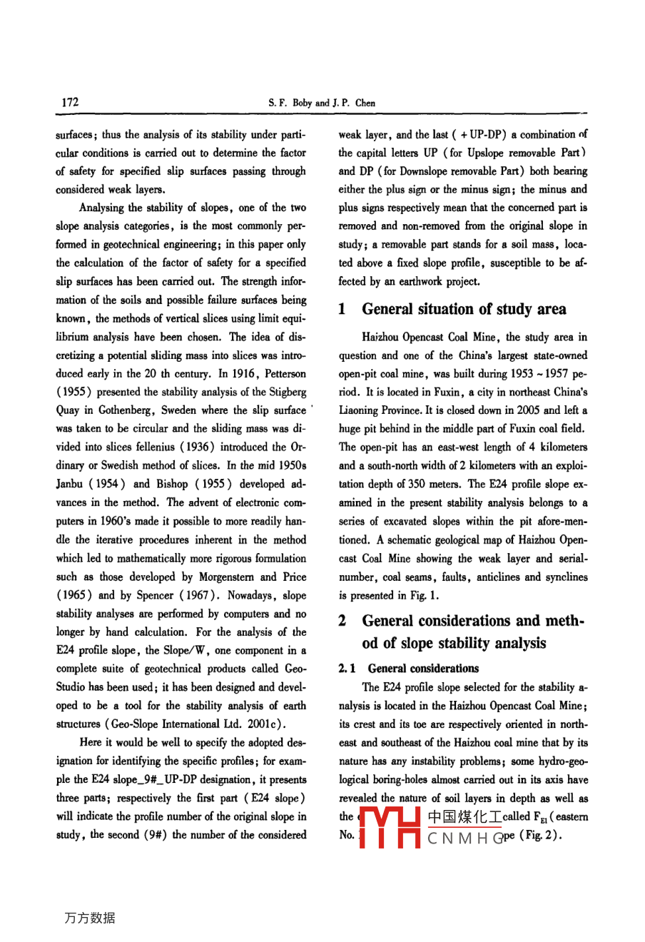 Global Geology,10(2):171-184(2007)Article Im:l6739736(2007)020171-4E24 profile slope stability analysisin Haizhou Opencast Coal Mine of FuxinSimplice F. BOBY and Jianping CHENollege of Construction Engineering, Jilin University, Changchun 130026, ChinaAbstract: The E24 profile slope analyzed belongs to a series of excavated slopes of the haizhou Opencast CoalMine. It seems to be divided into Downslope Part and Upslope Part. Its profile comprises two noticeable coalseams, called the 8# and 9# weak layers, considered as the potential failure surfaces. In consideration of theactual configuration as in the perspective of any modification, assessing the stability of this slope with variousprofile forms under given conditions, and assessingof instability and quantifying the influence of earthworks or other modifications to the stability of this slope, have constituted the primordial objectives carried out.From assumed potential failure surfaces, any specific profiles and specified slip surfaces are defined. A factor ofsafety( Fos)is computed for each specified slip surface; the smallest Fos found corresponds to the least favoraethods of vertical slices implemented in Slope/W, computer program for slope stability analyses, have been a-dopted to perform the E24 slope stability analysis. The safety factor values computed with 9# weak layer anlower than for 8#; the factors of safety obtained with Sarma's method are the smallest; more, without groundwa-ter(long term) overall values are greater than those determined under groundwater condition( short term).Thelowest safety factor value is found for a profile depending on an adopted earthwork sequence. The E24 profileslope stability analysis shows the instability risk for the deepest weak layer, and also shows the short and longterm stability of this slope for the envisaged earth movements. However it demonstrates the existence of instabili-ty risk for any earthwork firstly affecting the downslope part.Key words: limit equlibrium; opencast Coal mine; slope stability safety factor; weak layerIntroductionprise any weak layers less favorable to their stabilityseeing that they generally constitute potential failureAfter the closure of the Haizhou Opencast Coal surfaces. Consequently, assessing the risk of theirMine, the spectacular slopes formed by deep excava- stability and quantifying the influence of any modifications resulting of its long mining, have always raised tion to their stability have to be necessarily analysedthe unavoidable question of short term or long term The E24 profile slope, in its actual configurationstability analysis of slopes; these slopes mostly com- veals two weak layers considered as potential faiYH中國(guó)煤化工Received 8 July, 2007; accepted 10 September, 2007ported by Project o NSFC(No. 40472136): Scientific Research Foundation for theCNMHNo.120413133);985 Project of Jilin University(No.1052132000007172S. F. Boby and J. P. Chensurfaces; thus the analysis of its stability under parti- weak layer, and the last(+ UP-DP)a combination nfcular conditions is carried out to determine the factor the capital letters UP ( for Upslope removable Part)of safety for specified slip surfaces passing through and DP( for Downslope removable Part)both bearingconsidered weak layerseither the plus sign or the minus sign; the minus andAnalysing the stability of slopes, one of the two plus signs respectively mean that the concerned part isslope analysis categories, is the most commonlyremoved and non-removed from the original slope informed in geotechnical engineering; in this paper only study; a removable part stands for a soil massthe calculation of the factor of safety for a specifiedd above a fixed slope profile, susceptible toslip surfaces has been carried out. The strength infor- fected by an earthwork projectmation of the soils and possible failure surfaces beingknown, the methods of vertical slices using limit equi-1 General situation of study arealibrium analysis have been chosen. The idea of disHaizhou Opencast Coal Mine, the study area incretizing a potential sliding mass into slices was intro-tion and one of the China s larduced early in the 20 th century. In 1916, Petterson open-pit coal mine, was built during 1953-1957 pe-(1955)presented the stability analysis of the Stigberg riod. It is located in Fuxin, a city in northeast China'sQuay in Gothenberg, Sweden where the slip surface Liaoning Province. It is closed down in 2005 and left awas taken to be circular and the sliding mass was dihuge pit behind in the middle part of Fuxin coal fieldvided into slices fellenius(1936)introduced the Or- The open-pit has an east-west length of 4 kilometersdinary or Swedish method of slices. In the mid 1950and a south-north width of 2 kilometers with an explJanbu(1954 )and Bishop(1955)developed ad- tation depth of 350 meters. The E24 profile slope exvances in the method The advent of electronic com-amined in the present stability analysis belongs to aputers in 1960, s made it possible to more readily han- series of excavated slopes within the pit afore-mensuch as those developed by Morgenstern and Pricefaults, anticlines and synclines(1965 )and by Spencer(1967). Nowadays, slope is presented in Fig. 1s areformed by2 General considerations and meth-longer by hand calculation. For the analysis of thenentod of slope stability analysiscomplete suite of geotechnical products called Geo2.1 General considerationsStudio has been used; it has been designed and develThe E24 profile slope selected for the stability a-nalysis is located in the Haizhou Opencast Coal Minestructures( Geo-Slope International Ltd. 2001c)its crest and its toe are respectively oriented in northHere it would be well to specify the adopted des- east and southeast of the haizhou coal mine that by itsignation for identifying the specific profiles; for exam- nature has any instability problems; some hydro-geople the E24 slope_9#_UP-DP designation, it presentlogical boring-holes almo