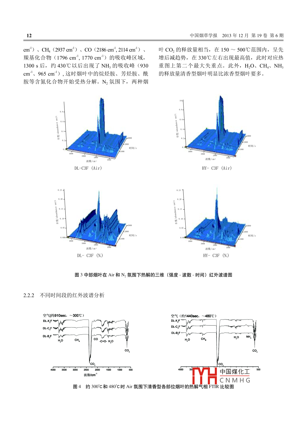陳翠玲等不同部位煙葉的熱失重和熱裂解行為研究不同部位煙葉的熱失重和熱裂解行為研究陳翠玲,孔浩輝',曾金2,官衛(wèi)東,周海云21廣東中煙工業(yè)有限責(zé)任公司技術(shù)中心,廣東省廣州市環(huán)翠南路88號(hào)5103852中山大學(xué)分析測(cè)試中心,廣東省廣州市新港西路135號(hào)510275摘要:利用熱重紅外聯(lián)用技術(shù)(TG-FTR)和熱裂解氣相色譜一質(zhì)譜聯(lián)用技術(shù)(Py-GCMS)比較研究了空氣和氮?dú)夥諊?清香型和濃香型各部位煙葉的熱失重和熱裂解行為。結(jié)果表明:空氣氛圍下樣品熱解更完全,N氛圍下不同熱解階段氣體的釋放情況差異更明顯。濃香型煙葉含有較高的堿性香氣成分,較髙的異戊酸和苯甲酸含量以及類胡蘿卜素降解產(chǎn)物,而清香型煙葉含有較高的非酶棕色化反應(yīng)產(chǎn)物。中上部煙葉的香氣成分均高于下部煙葉關(guān)鍵詞:熱失重;熱裂解;熱重一傅立葉紅外;煙葉doi:10.3969/ssn.10045708.2013.06.002中圖分類號(hào):06423,TS411文獻(xiàn)標(biāo)識(shí)碼:A文章編號(hào):1004-5708(2013)06-0009010Research on thermogravimetry and pyrolysis behavior oftobacco leaves from various stalk positionsCHEN Cuiling, KONG Haohui, ZENG Jin, GUAN Weidong, ZHOU HaiyunI Technology Center, China Tobacco Guangdong Industrial Co, Ltd, Guangzhou 510385, China;2 Instrumental and Analysis Research Center, Sun Yat-sen University, Guangzhou 510275, ChinaAbstract: Thermogravimetry and pyrolysis behavior of tobacco leaves from various stalk positions of light-flavor and strong-flavorwere investigated using thermo-gravimetric analysis coupled with Fourier transform infrared spectroscopy(TG-FTIR)and pyrolysis-gaschromatography/mass spectrometry(Py-GC/MS). Results showed that leaf tobacco was pyrolyzed more thoroughly under air atmospherethan under nitrogen atmosphere. Differences in pyrolysis behaviors among stages under nitrogen atmosphere were observed. More alkaliaroma components, isovaleric acid, benzoate and carotenoid degradation products were determined in strong-flavor tobacco leaves whilemore Maillard reaction products were found in light-flavor tobacco leaves. Upper-middle tobacco plant leaves had more aroma componentsthan lower-middle tobacco plant leavesKeywords: thermogravimetry; pyrolysis; TG-FTIR; tobacco大量研究指出,煙葉內(nèi)在化學(xué)成分的變化與的香味組分進(jìn)行研究,而對(duì)煙葉經(jīng)熱解釋放進(jìn)入煙感官質(zhì)量存在較高的相關(guān)性,香氣是煙葉內(nèi)在質(zhì)量的氣后其香味組分的變化情況研究不多,尤其是不同部個(gè)重要指標(biāo)。過(guò)去人們對(duì)煙葉香氣成分的研究主要位、不同香型煙葉各香氣組分變化情況的研究則更少是通過(guò)先蒸餾、溶劑萃取等前處理技術(shù)將香味成分進(jìn)本研究利用熱重紅外聯(lián)用技術(shù)(TG-FTIR)和熱裂解提取分離后,再借助各種分析技術(shù)對(duì)煙葉本身含有氣相色譜質(zhì)譜聯(lián)用技術(shù)( Py-GC/MS)尋找上、中下三個(gè)部位清香型煙葉和濃香型煙葉之間的共性和差作者簡(jiǎn)介:陳翠玲(1981-),碩士,工程師,從事煙草化學(xué)香味成異,為煙草致香機(jī)理的闡明以及卷煙配方設(shè)計(jì)研究提分分析研究,Tel:020-81233847,供參考。中國(guó)煤化工通訊作者:孔浩輝(1974-),碩士,高級(jí)工程師,從事煙草化學(xué)香味成本實(shí)驗(yàn)前CNMHG條件進(jìn)行了優(yōu)分分析研究,Tel:020-81233858,化,建立了合造的我氣相色譜-質(zhì)譜聯(lián)用技術(shù)模Email:konghh@gdzygy.com擬卷煙燃吸過(guò)程的分析條件,本研究中各部位煙葉的收稿日期:2013-01-210中國(guó)煙草學(xué)報(bào)2013年12月第19卷第6期熱解行為的比較分析建立在此分析條件之上。于熱裂解儀的石英管中,用石英棉堵塞管子的兩端,然后將石英管裝入熱裂解儀1實(shí)驗(yàn)部分裂解條件:裂解器附件初始溫度50℃;終溫1.1儀器及材料250℃,保持4min。裂解絲初始溫度50℃,保持20TG209熱重分析儀( Netzsch, Germany); Vector22而后以10℃/ms升至80℃,并維持20s吸附肼條件紅外光譜儀( Bruker, Germany);CDS5200熱裂解儀吸附溫度35℃,脫附溫度280℃,脫附及進(jìn)樣時(shí)間4(CDS,USA);6890N5975B氣相色譜/質(zhì)譜聯(lián)用儀min。在裂解實(shí)驗(yàn)之間均穿插進(jìn)行空白試驗(yàn),以觀察(Agln,UsA),配置Ura2毛細(xì)管柱(50m×0.32樣品是否脫附完全。裂解輔助氣:空氣(Air),流速(mm,0.52um, Agilent,USA);CP225D型十萬(wàn)分20±1)mL/min之一天平( Sartorius, Germany);ADM2000流速儀氣相色譜質(zhì)譜條件:Utra2(50m×0.32mm,0.52(Agilent, USA)μm)毛細(xì)管柱。分流比10:1;進(jìn)樣口溫度為250℃實(shí)驗(yàn)樣品采用云南大理清香型煙葉和湖南衡陽(yáng)濃氦氣流速:lmL/min;升溫程序?yàn)?起始溫度50℃,保香型煙葉,分別選取上、中、下三個(gè)部位。從不同部持10min,以2℃min升溫至150℃保持l5min,再位取樣編號(hào)為DL-B2F(大理上部),DLC3F(大理以2℃min升至270℃,保持10min,總運(yùn)行時(shí)間145中部),DL-X2F(大理下部);HYB2F(衡陽(yáng)上部),min。GCMS接口(AUX)溫度:280℃;電子轟擊(EDHYC3F(衡陽(yáng)中部),HYX2F(衡陽(yáng)下部)。每種離子源溫度:230℃;四極桿溫度:150℃;電離能:70eV;煙葉制成煙絲后,置于烘箱40(±1)℃干燥2h,質(zhì)量掃描范圍:35~350amu。Niso5.d標(biāo)準(zhǔn)譜庫(kù)檢索而后粉碎并過(guò)40目篩。所得煙末試樣供熱失重和熱定性裂解實(shí)驗(yàn)使用。1.2TG-FTIR分析條件2結(jié)果與討論在專用的鉑金坩堝中稱取35mg(精確至±0.22.1大理和衡陽(yán