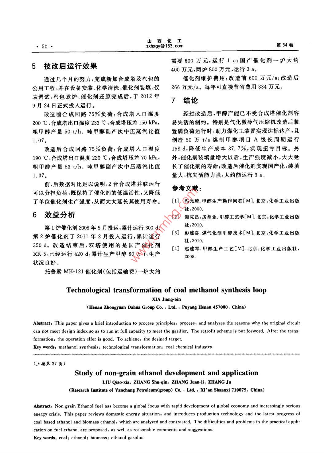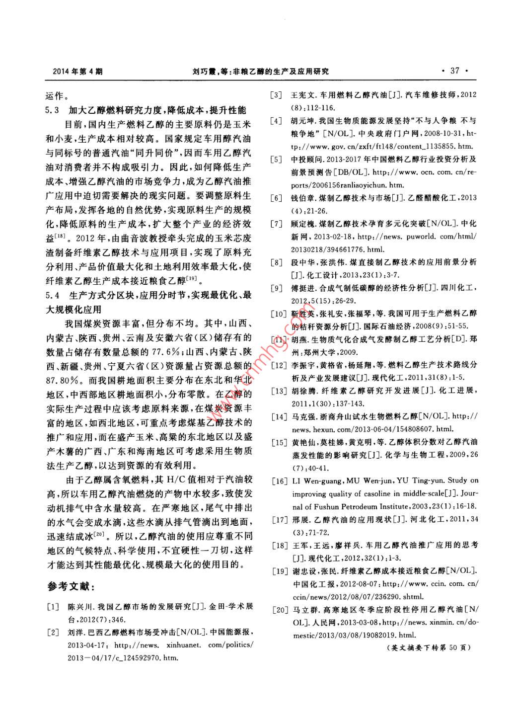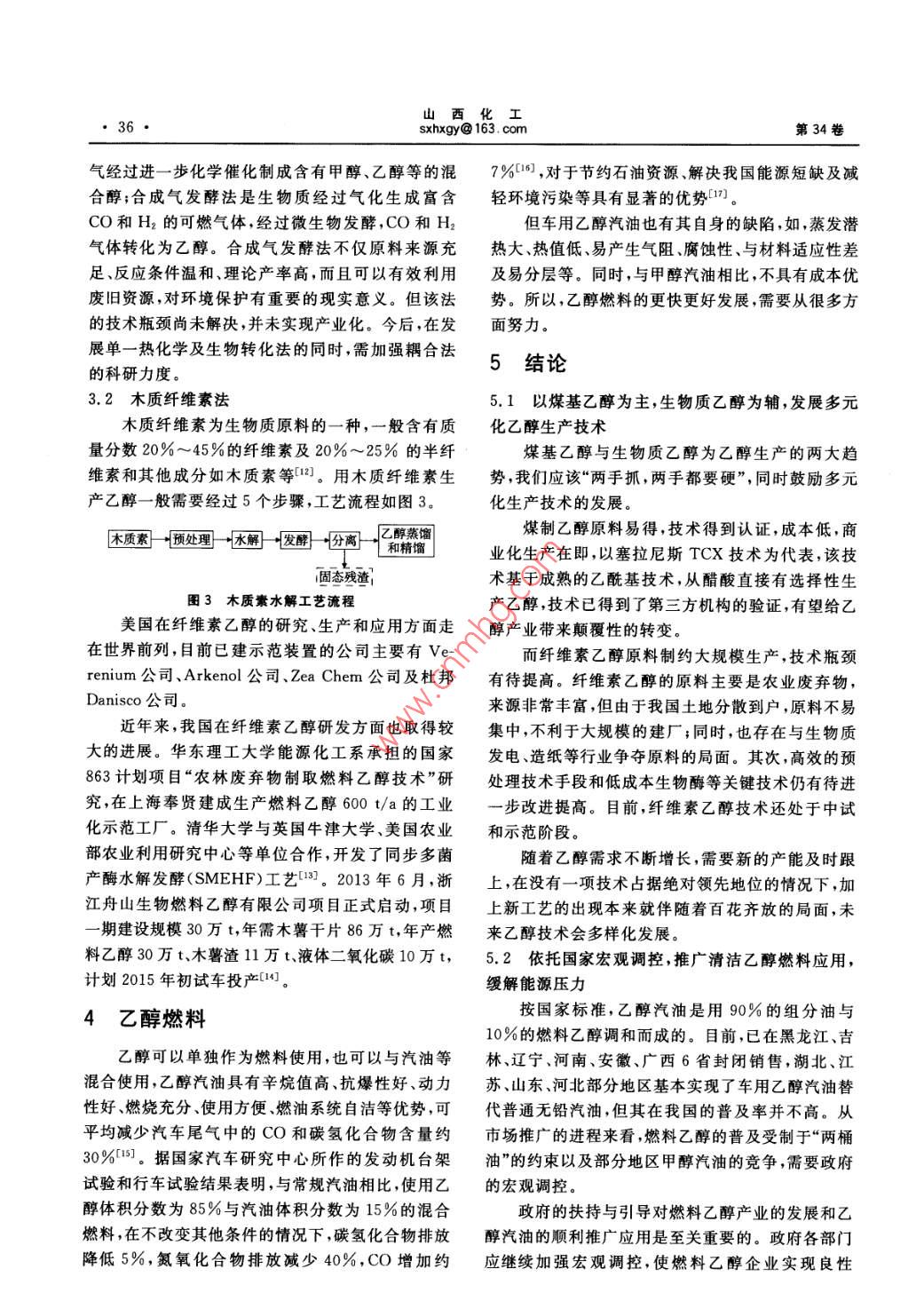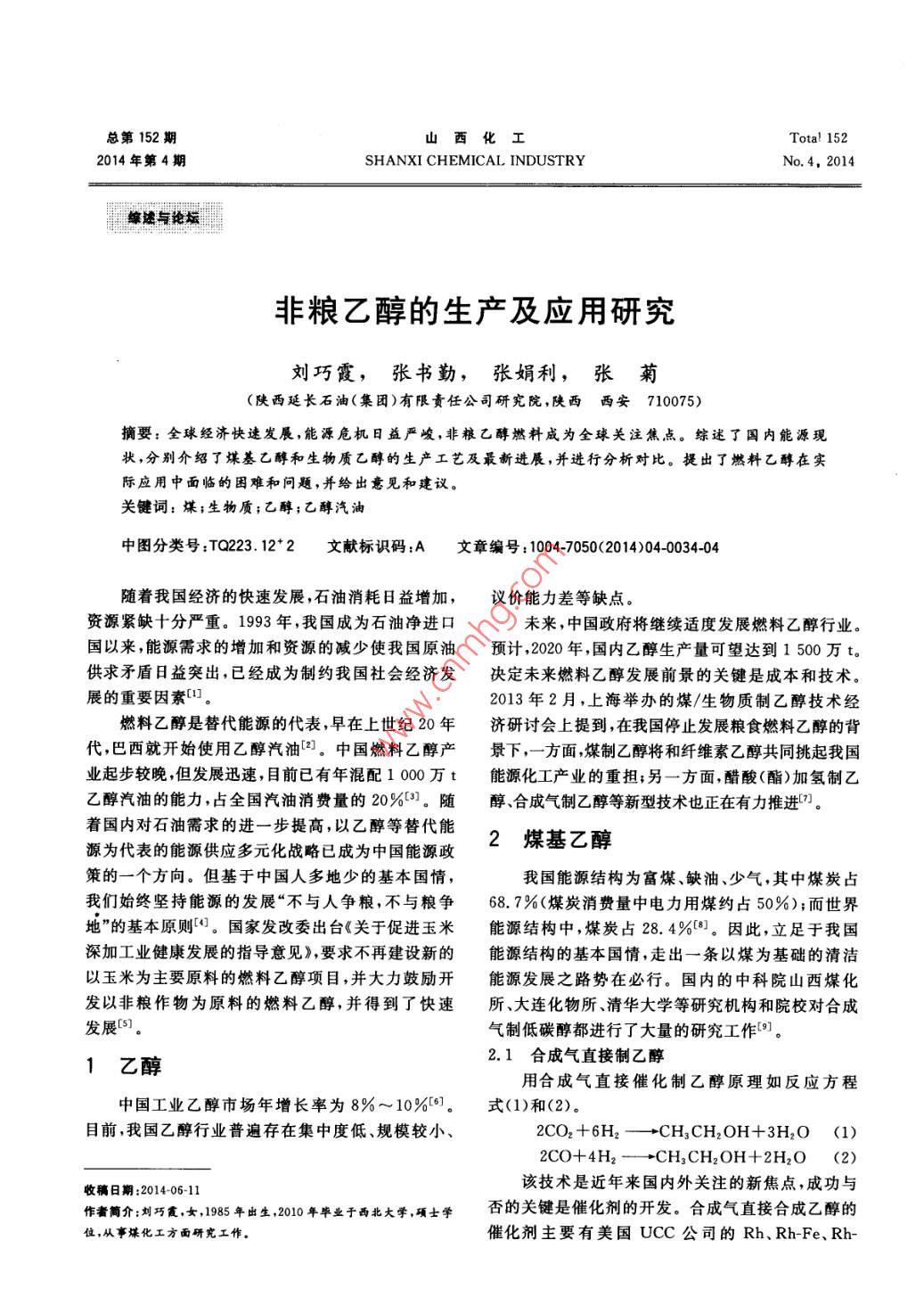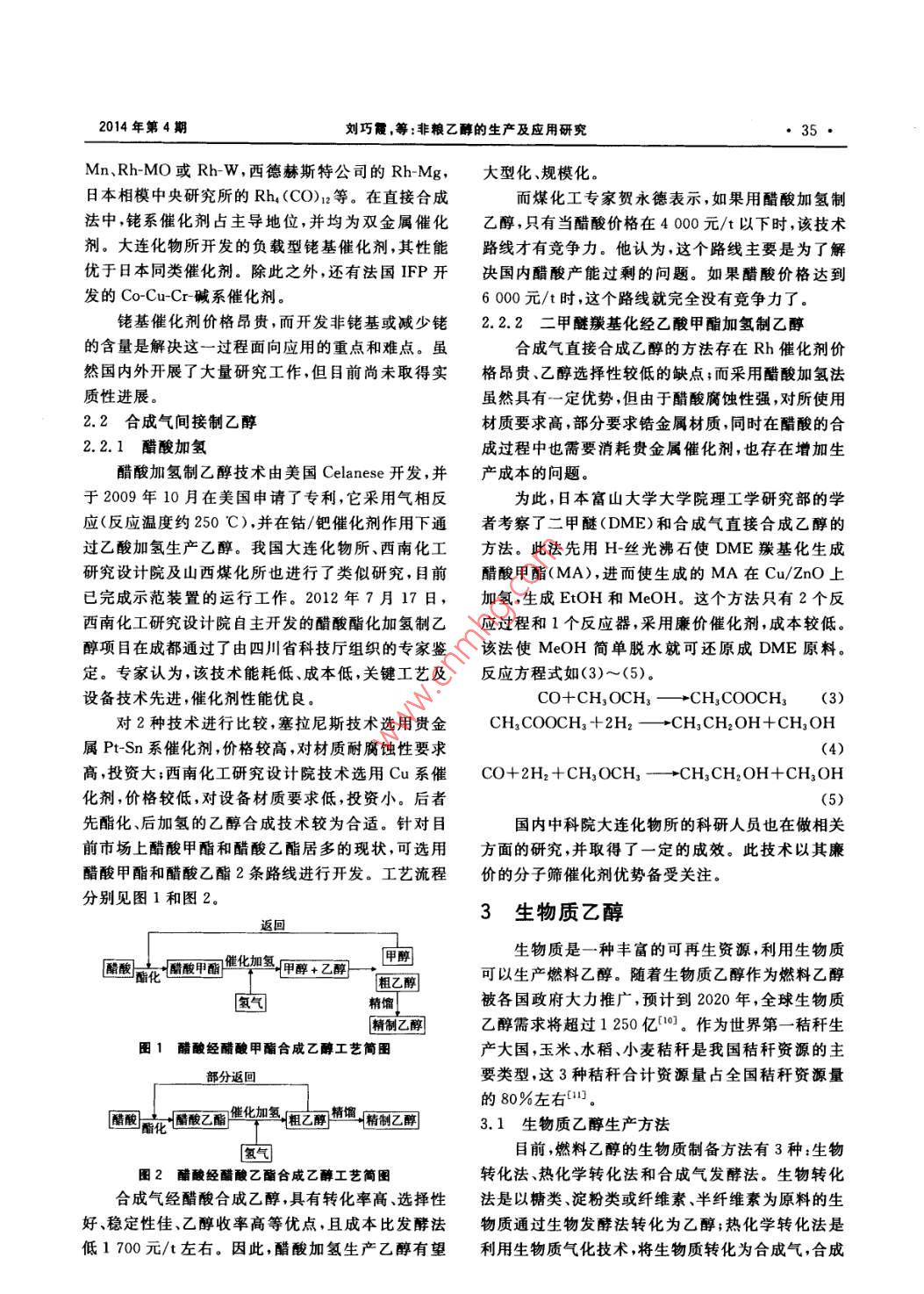 總第152期山西化工Total 12014年第4期SHANXI CHEMICAL INDUSTRYNo.4,2014排綜途與論壇非糧乙醇的生產(chǎn)及應(yīng)用研究劉巧霞,張書勤,張娟利,張菊(陜西延長石油(集團(tuán))有限責(zé)任公司研究院,陜西西安710075)摘要:全球經(jīng)濟(jì)快速發(fā)展,能源危機(jī)日益嚴(yán)峻,非糧乙醇燃料成為全球關(guān)注焦點(diǎn)。綜述了國內(nèi)能源現(xiàn)狀,分別介紹了煤基乙醇和生物質(zhì)乙醇的生產(chǎn)工藝及最新進(jìn)展,并進(jìn)行分析對比。提出了燃料乙醇在實(shí)際應(yīng)用中面臨的困難和問題,并給出意見和建議。關(guān)鍵詞:煤;生物質(zhì);乙醇;乙醇汽油中圖分類號(hào):TQ223.122文獻(xiàn)標(biāo)識(shí)碼:A文章編號(hào):1004-7050(2014)04003404隨著我國經(jīng)濟(jì)的快速發(fā)展,石油消耗日益增加,議價(jià)能力差等缺點(diǎn)。資源緊缺十分嚴(yán)重。1993年,我國成為石油凈進(jìn)口未來,中國政府將繼續(xù)適度發(fā)展燃料乙醇行業(yè)國以來,能源需求的增加和資源的減少使我國原油預(yù)計(jì),2020年,國內(nèi)乙醇生產(chǎn)量可望達(dá)到1500萬t。供求矛盾日益突出,已經(jīng)成為制約我國社會(huì)經(jīng)濟(jì)發(fā)決定未來燃料乙醇發(fā)展前景的關(guān)鍵是成本和技術(shù)。展的重要因素(。2013年2月,上海舉辦的煤/生物質(zhì)制乙醇技術(shù)經(jīng)燃料乙醇是替代能源的代表,早在上世紀(jì)20年濟(jì)研討會(huì)上提到,在我國停止發(fā)展糧食燃料乙醇的背代,巴西就開始使用乙醇汽油2。中國燃料乙醇產(chǎn)景下,一方面煤制乙醇將和纖維素乙醇共同挑起我國業(yè)起步較晚,但發(fā)展迅速,目前已有年混配1000萬t能源化工產(chǎn)業(yè)的重?fù)?dān);另一方面,醋酸(酯)加氫制乙乙醇汽油的能力古全國汽油消費(fèi)量的20%。隨醇合成氣制乙醇等新型技術(shù)也正在有力推進(jìn)?。著國內(nèi)對石油需求的進(jìn)一步提高,以乙醇等替代能源為代表的能源供應(yīng)多元化戰(zhàn)略已成為中國能源政2煤基乙醇策的一個(gè)方向。但基于中國人多地少的基本國情,我國能源結(jié)構(gòu)為富煤、缺油、少氣,其中煤炭占我們始終堅(jiān)持能源的發(fā)展“不與人爭糧,不與糧爭68.7%(煤炭消費(fèi)量中電力用煤約占50%);而世界地”的基本原則4。國家發(fā)改委出臺(tái)《關(guān)于促進(jìn)玉米能源結(jié)構(gòu)中,煤炭占28.4%8。因此,立足于我國深加工業(yè)健康發(fā)展的指導(dǎo)意見》要求不再建設(shè)新的能源結(jié)構(gòu)的基本國情,走出一條以煤為基礎(chǔ)的清潔以玉米為主要原料的燃料乙醇項(xiàng)目,并大力鼓勵(lì)開能源發(fā)展之路勢在必行。國內(nèi)的中科院山西煤化發(fā)以非糧作物為原料的燃料乙醇,并得到了快速所、大連化物所清華大學(xué)等研究機(jī)構(gòu)和院校對合成發(fā)展氣制低碳醇都進(jìn)行了大量的研究工作9。1乙醇2.1合成氣直接制乙醇用合成氣直接催化制乙醇原理如反應(yīng)方程中國工業(yè)乙醇市場年增長率為8%~10%61。式(1)和(2)。目前,我國乙醇行業(yè)普遍存在集中度低、規(guī)模較小2CO2+6H2-CH3 CH, OH+3H,O (1)2C0+4H2 -CH3 CH2 OH+2H,0(2)收稿日期:201406-11該技術(shù)是近年來國內(nèi)外關(guān)注的新焦點(diǎn),成功與作者茼介:劉巧霞,女,1985年幽生,2010年畢業(yè)于西北大季,項(xiàng)士學(xué)否的關(guān)鍵是催化劑的開發(fā)。合成氣直接合成乙醇的位,從事煤化工方面研究工作。催化劑主要有美國UCC公司的Rh、RhFe、Rh2014年第4期劉巧霞,等:非糧乙醇的生產(chǎn)及應(yīng)用研究35Mn、RhMO或RhW,西德赫斯特公司的RhMg,大型化、規(guī)模化日本相模中央研究所的Rh4(CO12等。在直接合成而煤化工專家賀永德表示,如果用醋酸加氫制法中,銠系催化劑占主導(dǎo)地位,并均為雙金屬催化乙醇只有當(dāng)醋酸價(jià)格在4000元/t以下時(shí),該技術(shù)劑。大連化物所開發(fā)的負(fù)載型銠基催化劑其性能路線才有競爭力。他認(rèn)為這個(gè)路線主要是為了解優(yōu)于日本同類催化劑。除此之外,還有法國IFP開決國內(nèi)醋酸產(chǎn)能過剩的問題。如果醋酸價(jià)格達(dá)到發(fā)的 Co-Cu-Cr-堿系催化劑。6000元/t時(shí),這個(gè)路線就完全沒有競爭力了銠基催化劑價(jià)格昂貴,而開發(fā)非銠基或減少銠2.2.2二甲醚羰基化經(jīng)乙酸甲酯加氫制乙醇的含量是解決這一過程面向應(yīng)用的重點(diǎn)和難點(diǎn)。雖合成氣直接合成乙醇的方法存在Rh催化劑價(jià)然國內(nèi)外開展了大量研究工作但目前尚未取得實(shí)格昂貴、乙醇選擇性較低的缺點(diǎn);而采用醋酸加氫法質(zhì)性進(jìn)展。雖然具有一定優(yōu)勢,但由于醋酸腐蝕性強(qiáng),對所使用2.2合成氣間接制乙醇材質(zhì)要求高,部分要求鋯金屬材質(zhì),同時(shí)在醋酸的合2.2.1醋酸加氫成過程中也需要消耗貴金屬催化劑,也存在增加生醋酸加氫制乙醇技術(shù)由美國 Celanese開發(fā),并產(chǎn)成本的問題。于2009年10月在美國申請了專利,它采用氣相反為此,日本富山大學(xué)大學(xué)院理工學(xué)研究部的學(xué)應(yīng)(反應(yīng)溫度約250℃),并在鈷/鈀催化劑作用下通者考察了二甲醚(DME)和合成氣直接合成乙醇的過乙酸加氫生產(chǎn)乙醇。我國大連化物所、西南化工方法。此法先用H絲光沸石使DME羰基化生成研究設(shè)計(jì)院及山