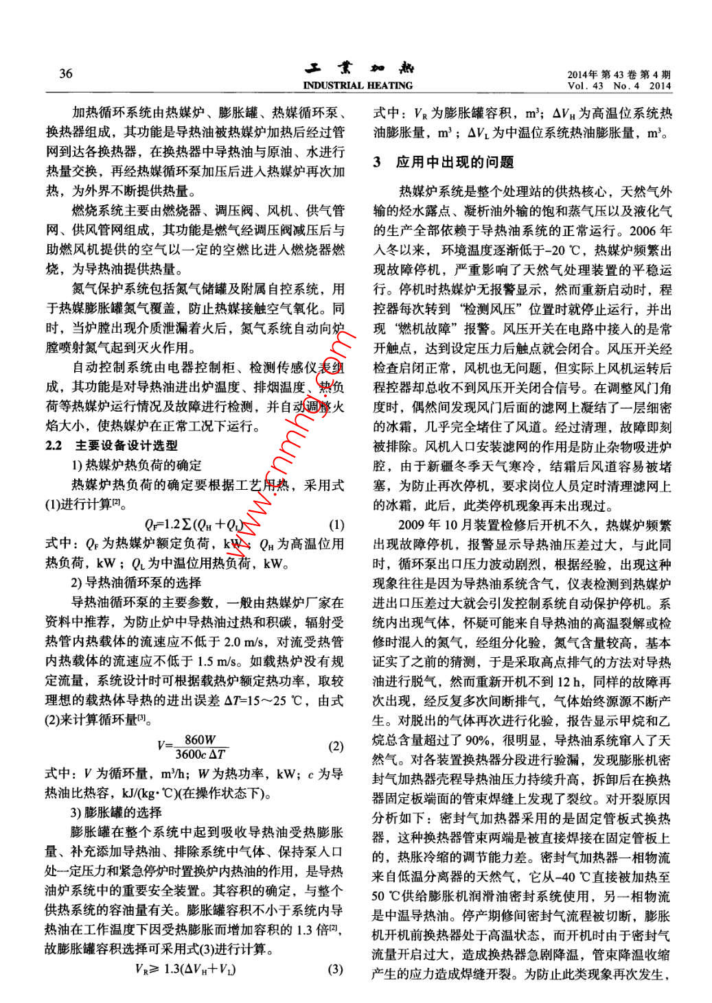 2014年第43卷第4期子業(yè)加漱35Vol. 43 No.4 2014INDUSTRIAL HEATINGDOI: 10.3969/j. issn. 1002-1639.2014.04.011熱媒爐系統(tǒng)在天然氣處理站的應(yīng)用周國英1,楊剛',謝爽2(1.中國石油化工股份有限公司西北油 田分公司雅克拉采氣廠,新疆庫車842017;2.中國石油化工股份有限公司西北油 田分公司勘探開發(fā)研究院,新疆烏魯木齊830011)摘要:以某集氣處理站為例,從設(shè)計(jì)的角度介紹了導(dǎo)熱油加熱系統(tǒng)在天然氣處理工藝中的應(yīng)用情況,描述了實(shí)際應(yīng)用中出現(xiàn)的問題和在今后使用中應(yīng)該注意的事項(xiàng)。關(guān)鍵詞:熱媒爐;導(dǎo)熱油;雙溫位中圖分類號: TE64文獻(xiàn)標(biāo)志碼: A文章編號: 1002-1639 (2014) 04-005-03Application of HTM Furnace System to Natural Gas Treatment StationZHOU Guoying', YANG Gang', XIE Shuang2(1. Yakela Gas Production Plant Northwest Oilfeld Branch Company of SINOPEC, Kuqa 842017, China;2. Exploration and Development Instiutet Northwest Oilfield Branch Company of SINOPEC, Urumqi 830011, China )Abstract: Taking some gas collection station as an example, from the design point of the beat conducting oil heating system in the naturalgas treatment aplication process, described the problems in practical application and the use of matters sbould be paid atention to in the future.Key words: heat medium heater; beat transfer oil; double temperature某集氣處理站于2005年11月建成投產(chǎn),裝置供據(jù)油氣處理場站中多個熱用戶的用熱參數(shù)對熱源進(jìn)行熱采用了兩臺4000kW熱媒爐,投用以來,系統(tǒng)具有梯級利用的一種供熱方式"。根據(jù)表I中的介質(zhì)溫度,自動化程度高、熱效率高、環(huán)境污染低、安全系數(shù)高、將再生氣加熱器、液化氣塔底重沸器、凝析油穩(wěn)定塔運(yùn)行費(fèi)用低等特點(diǎn),較好滿足了油、氣、水對不同溫重沸器劃為高溫位用戶,其余用熱裝置為中溫位用度的需求,確保了該站天然氣處理裝置高效平穩(wěn)運(yùn)行。戶。導(dǎo)熱油經(jīng)熱媒爐加熱至278 C, -部分直接供給高溫用戶,另-部分與從中溫用戶返回的導(dǎo)熱油進(jìn)行1裝置及供熱流程簡介混合(175 °C)后供給中溫用戶。天然氣處理流程包含天然氣脫水脫汞、輕烴回2導(dǎo)熱油加熱 系統(tǒng)設(shè)計(jì)收、原油穩(wěn)定、污水處理等多項(xiàng)工藝,其主要用熱設(shè)備溫度及熱負(fù)荷參數(shù)如表1所示。2.1 系統(tǒng)組成表1 主要用熱設(shè)備溫度及熱負(fù)荷集氣處理站熱媒爐系統(tǒng)主要由注油、加熱循環(huán)、用熱裝置介質(zhì)溫度/C熱負(fù)荷 /kW燃燒、氮?dú)獗Wo(hù)及自動控制5個子系統(tǒng)組成,系統(tǒng)組再生氣加熱器230200成及工藝流程如圖1所示。凝析油穩(wěn)定塔底重沸器1251 100液化氣塔底重沸器145700膨脹罐)分離器高溫用戶返回脫乙烷塔底重沸器71 380r[熱媒爐]L鍋中溫用戶返回膨脹機(jī)密封氣加熱器590嗥p清水換熱器(建筑物采暖用熱)2102去中溫用戶其他用熱40~8045注油泵熱媒爐一4票E9中溫導(dǎo)熱油循環(huán)泵由于各裝置用熱溫度及負(fù)荷差異較大,為了滿足去高溫用戶(儲油罐)各裝置對用熱溫度及熱負(fù)荷的不同需求,集氣處理站采用了雙溫位法進(jìn)行供熱。所謂雙溫位供熱,就是根圖1熱媒爐系統(tǒng)組 成及工藝流程圖注油系統(tǒng)主要由注油泵、過濾器及管線組成,其收稿日期: 2014-01-14作者簡介:周國英(1980- -), 男,本科,工程師,主要從事天功能是當(dāng)?shù)谝淮螁⒂没蛳到y(tǒng)導(dǎo)熱油不足時,通過注油然氣處理和采油氣井管理工作.泵將導(dǎo)熱油輸送至膨脹罐內(nèi)經(jīng)過熱油循環(huán)泵加入循環(huán)系統(tǒng)。362014年第43卷第4期INDUSTRIAL HEATINGVol. 43 No.4 2014加熱循環(huán)系統(tǒng)由熱媒爐、膨脹罐、熱媒循環(huán)泵、式中: Vk為膨脹罐容積,m'; AV; 為高溫位系統(tǒng)熱換熱器組成,其功能是導(dǎo)熱油被熱媒爐加熱后經(jīng)過管油膨脹量, m3 ; AV_ 為中溫位系統(tǒng)熱油膨脹量, m’。網(wǎng)到達(dá)各換熱器,在換熱器中導(dǎo)熱油與原油、水進(jìn)行3應(yīng)用中出現(xiàn)的問題熱量交換,再經(jīng)熱媒循環(huán)泵加壓后進(jìn)人熱媒爐再次加熱,為外界不斷提供熱量。熱媒爐系統(tǒng)是整個處理站的供熱核心,天然氣外燃燒系統(tǒng)主要由燃燒器、調(diào)壓閥、風(fēng)機(jī)、供氣管輸?shù)臒N水露點(diǎn)、凝析油外輸?shù)娘柡驼魵鈮阂约耙夯瘹饩W(wǎng)、供風(fēng)管網(wǎng)組成,其功能是燃?xì)饨?jīng)調(diào)壓閥減壓后與的生產(chǎn)全部依賴于導(dǎo)熱油系統(tǒng)的正常運(yùn)行。2006年助燃風(fēng)機(jī)提供的空氣以一.定的空燃比進(jìn)人燃燒器燃人冬以來,環(huán)境溫度逐漸低于-20 C,熱媒爐頻繁出燒,為導(dǎo)熱油提供熱量。現(xiàn)故障停機(jī),嚴(yán)重影響了天然氣處理裝置的平穩(wěn)運(yùn)氮?dú)獗Wo(hù)系統(tǒng)包括氮?dú)鈨藜案綄僮钥叵到y(tǒng),用行。停機(jī)時熱媒爐無報(bào)瞥顯示,然而重新啟動時,程于熱媒膨脹罐氮?dú)飧采w,防止熱媒接觸空氣氧化。同控器每次轉(zhuǎn)到“檢測風(fēng)壓”位置時就停止運(yùn)行,并出時,當(dāng)爐膛出現(xiàn)介質(zhì)泄漏著火后,氮?dú)庀到y(tǒng)自動向爐現(xiàn)“燃機(jī)故障”報(bào)警。風(fēng)壓開關(guān)在電路中接人的是常膛噴射氮?dú)馄鸬綔缁鹱饔?。開觸點(diǎn),達(dá)到設(shè)定壓力后觸點(diǎn)就會