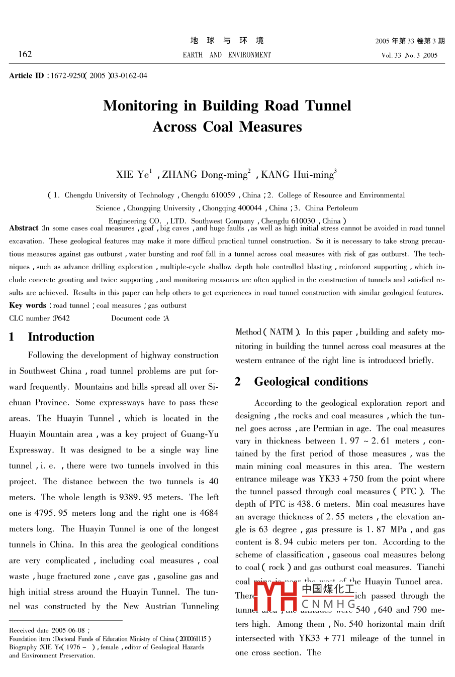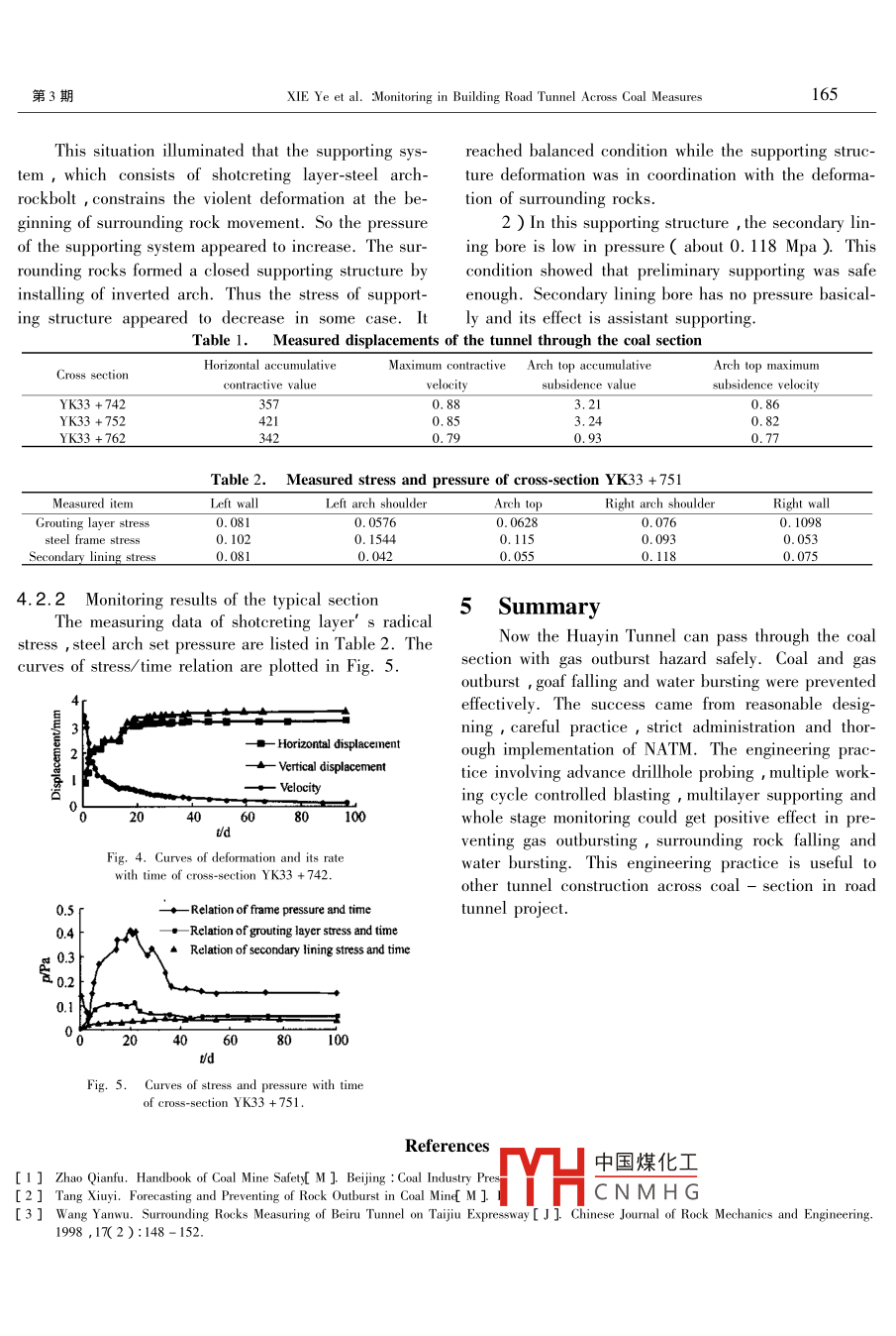 地球與環(huán)境05年第33卷第3期162EARTH AND ENVIRONMENVol.33No.32005rticle ID:16729250200503-0162404Monitoring in Building Road TunnelAcross Coal measuresXIE Ye, ZHANG Dong-ming, KANG Hui-ming(I. Chengdu University of Technology Chengdu 610059, China 2. College of Resource and EnvironmentalScience, Chongqing University Chongqing 400044, China 3. China PertoleumEngineering CO., LTD. Southwest Company Chengdu 610030, ChinaAbstract In some cases coal measures goaf, big caves and huge faults as well as high initial stress cannot be avoided in road tunnelexcavation. These geological features may make it more difficul practical tunnel construction. So it is necessary to take strong precautious measures against gas outburst water bursting and roof fall in a tunnel across coal measures with risk of gas outburst. The techniques such as advance drilling exploration multiple-cycle shallow depth hole controlled blasting reinforced supporting which in-clude concrete grouting and twice supporting, and monitoring measures are often applied in the construction of tunnels and satisfied re-sults are achieved. Results in this paper can help others to get experiences in road tunnel construction with similar geological featuresKey words road tunnel coal measures gas outbyCLC number P642Document code :A1 IntroductionMethod NATM ) In thisbuilding and safetynitoring in building the tunnel across coal measures at theFollowing the development of highway constructionwestern entrance of the right line is introduced brieflyin Southwest China, road tunnel problems are put forward frequently. Mountains and hills spread all over Si2 Geological conditionshuan Province. Some expressways have to pass theseAccording to the geological explorationandareas.The Huayin Tunnel, which is located in the designing, the rocks and coal measures, whichHuayin Mountain area was a key project of Guang-Yunel goes across are Permian in age. The coal measuresvary in thickness between 1. 97-2. 61 meters,conEessway. It was designed to be a single way line tained by the first period of those measures,was theunnel, i.e., there were two tunnels involved in this main mining coal measures in this area. The westernThe distance between the two tunnels is 40 entrance mileage was YK33 +750 from the point wheremeters. The whole length is 9389. 95 metersleft the tunnel passed through coal measures( PTC).Thedepth of PTC is 438. 6 meters. Min coal measures haveone is 4795. 95 meters long and the right one is 4684an average thickness of 2. 55 meters, the elevation an-meters long. The Huayin Tunnel is one of the longest gle is 63 degree, gas pressure is 1. 87 MPa, and gastunnels in China. In this area the geological conditions content is 8. 94 cubic meters per ton. According to theare very complicated, including coal measures coalscheme of classification, gaseous coal measures belorto coal rock)and gas outburst coal measures. Tianchiwaste, huge fractured zone cave gas gasoline gascoalf +he huayin tunnel areahigh initial stress around the Huayin Tunnel. The tun中國煤化ich passed through thenel was constructed by the New Austrian TunnelingtuniCNMG540, 640 and 790 meReceived date 2005-06-08ters high. Among them, No 540 horizontal main driftFoundation item: Doctoral Funds of Ecucation Ministry of China( 2m61115)intersected with YK33 +771 mileage of the tunnel inBiography XIE Yd 1976-), female editor of Geological Hazardone cross section The第3期XIE Ye et al. Monitoring in Building Road Tunnel Across Coal Mea163lowest point of No 540 drift and its goa36 age. Then, the lower section was excavated. Becausemeters from arch point in the cross section of the road of gas outburst hazard and short distance between Ptotunnel. The goaf was closed 9 years ago. So plenty of and Tianchi mine goaf, blasting working of touchingas and water was accumulated, the surrounding rocks and excavating of the coal section must be short work-were severely unstable due to the development of frac- ing cycle( 1.5-2. 0 meters per working cycle ) multures. The conditions would affect road tunnel s stabil- tiple working cycle and long distance blasting. Thus,itcould be done well to prevent gas outburst and tunnel3 Excavation across coal measureselapsing. In blasting working the millitor and electric initiating device were adoptedAccording to local geological conditions meticu- 3. 3 Coal section supporting( structurelous schedule should be instituted in the coal section toWith the aim of preventing outburst collapse andprevent coal and gas outburst, and collapse of coal water and local practical situation short diametermeasures and goaftransporting tube and self-going rockbolt were adopted3. 1 Advance drillhole probing(42 steel tube and R32N, R25N were chosen as transWorking place stopped to excavate at 10 meters porting tube and rockbolt. Tubes and rockbolts werefrom coal measures 4 advance drillholes were arranged laid in three layers. The first layer had R32N self-go-n the working place in the front direction to find out ing rockbolts each rockbolt was 9 meters long and hadwhere the coal measures were located and their occur- 3-5 elevation angle. 42 steel tube was laid as thesecond layer, the reach tube was 9 meters long with 8Excavation in the working place stopped again at 5 12 elevation angle. In the third layer R25N self-goure. At the same time ,3 ing rockbolts were laid. Every rockbolt was 10 meterspredicting drillholes and 1 press-measuring drillhole long with 15-18 elevation angleere made to detect outburst hazard of coal measuresThe distance between the frame holes of the layersBy these drillholes the angle on the strike was 34 de- was 20 centimeters. Radial distance between the holesgree, inclined angle was 65 degree, coal measure was 20 centimeters, too. Frame hole diameter was 50thickness was 3. 4 meters and the angle between the millimeters. Cement and sodium silicate mixture wascoal measures and the center line of the tunnel was 85 grouted to fix surrounding ro