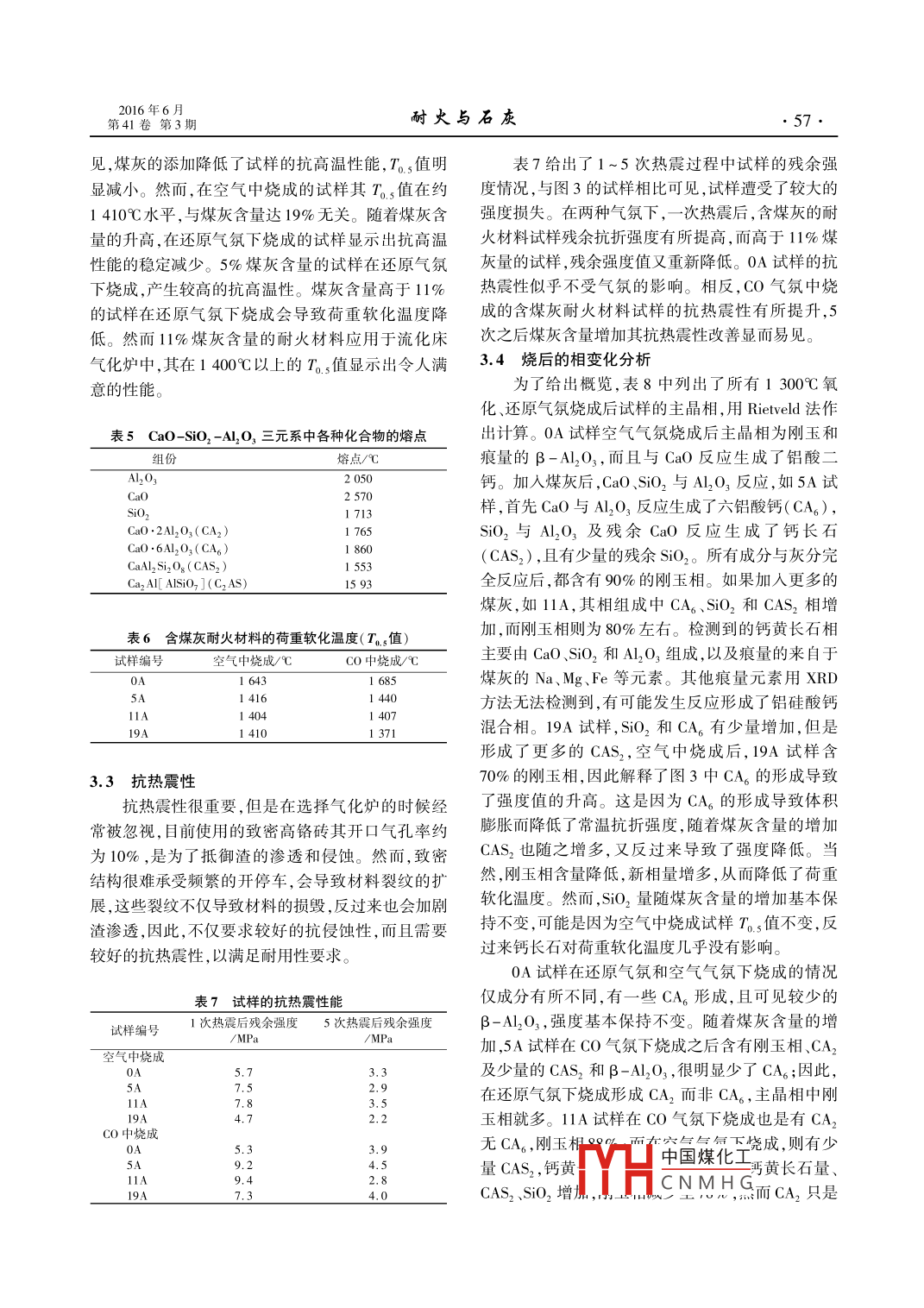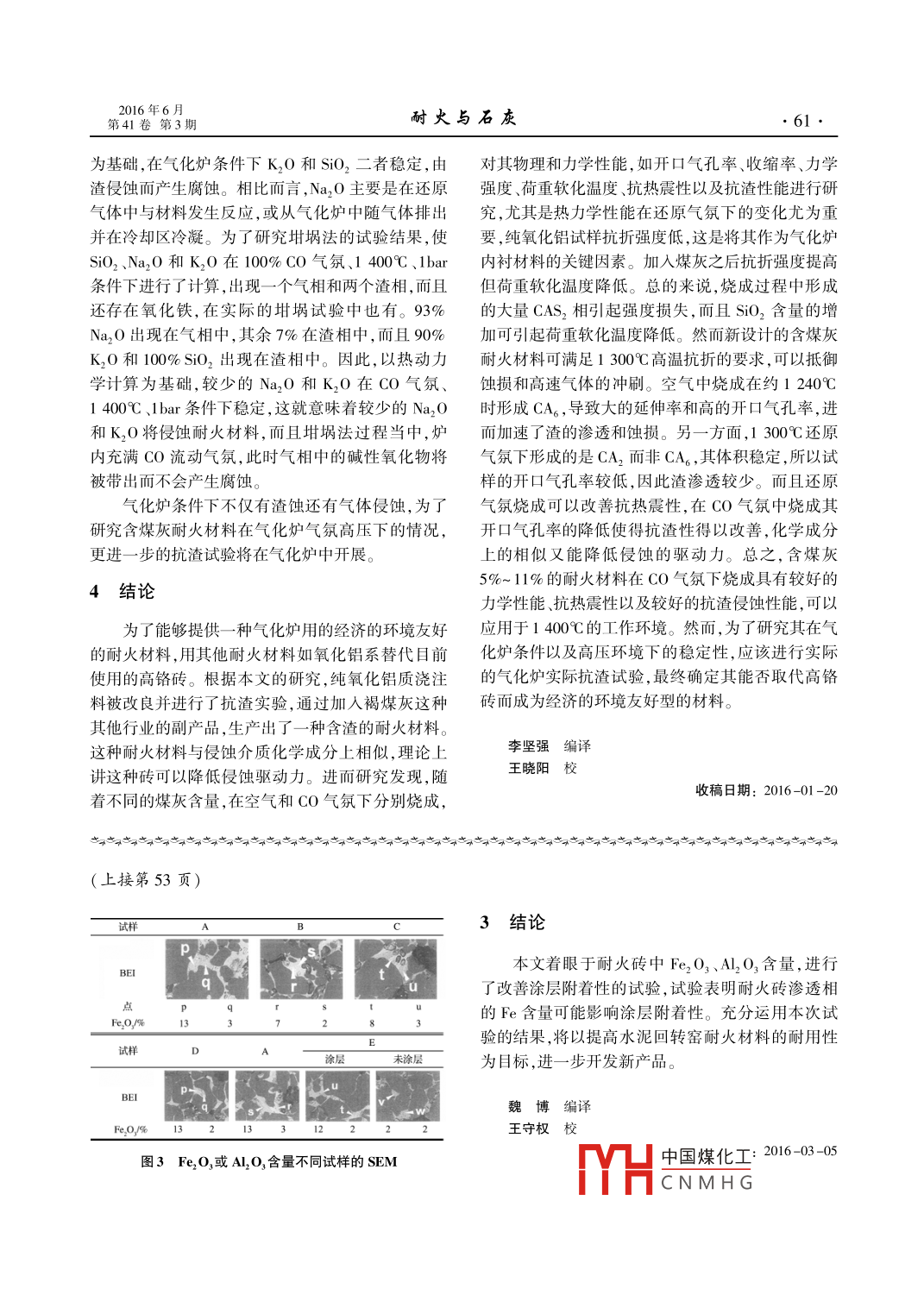 Jun. 2016REFRACTORIES & LIMEVol.41 No.3含渣耐火材料在氣化爐中的應(yīng)用摘要:氣化工藝是指將原料碳、氧氣及水反應(yīng)生產(chǎn)合成氣的過(guò)程,新氣化工藝技術(shù)將爐壁內(nèi)襯的溫度降至了1 300C ,因此,從經(jīng)濟(jì)效益和生態(tài)效益出發(fā),目前使用的高鉻材料可被無(wú)鉻材料所取代。本研究將含有不同褐煤灰含量的氧化鋁質(zhì)澆注料在不同氣氛中燒成,并在與氣化工藝類(lèi)似的工況條件下通過(guò)熱力學(xué)性能、相組成和抗熱震性進(jìn)行了分析。發(fā)現(xiàn)含11%煤灰并在還原氣氛中燒成的試樣,其力學(xué)性能和抗渣性能較好,在1 400C下作為氣化爐內(nèi)襯爐壁使用很有發(fā)展前景。關(guān)鍵詞:氧化鋁質(zhì)耐火材料;抗熱震性;侵蝕;氣化中圖分類(lèi)號(hào): TQ175.719文獻(xiàn)標(biāo)識(shí)碼: A文章編號(hào): 1673-7792 (2016) 03-0054-08在實(shí)驗(yàn)室條件下,氧化鉿、鉿硅酸鹽、硅酸鋯具有較1介紹.好的抗侵蝕性。此外,還研究了垃圾焚燒爐中使用化石燃料,如天然氣和原油- -般用于發(fā)電,但也的SiC材料的侵蝕機(jī)理和耐火材料在此工況下的反可以作為基礎(chǔ)的工業(yè)材料使用。未來(lái)由于化石燃料應(yīng)。的需求量將會(huì)不足,煤作為碳源將走向前列,使用焦新型的氣化工藝已經(jīng)發(fā)展至低的爐溫,其操作炭作為碳源的一種氣化工藝將是不可或缺的工藝過(guò)溫度在1300~14009C之間,這樣給經(jīng)濟(jì)型和生態(tài)程。以氣化爐為容器,褐煤等含碳材料、氧氣及水在友好型新材料創(chuàng)造了很大機(jī)會(huì),這種材料要具備較1 300~1 600C、壓力約20~40bar還原氣氛下可生好的抗熱震性能,在高溫、還原氣氛、高堿度以及壓成合成氣。另外,新技術(shù)需要在今后的一段時(shí)間提力環(huán)境下具有較好的抗渣性。高效率、增加靈活性減少CO2排放,并保持氣化爐礬土是廣泛使用的廉價(jià)耐火原料,其以較好的的可持續(xù)性。機(jī)械性能、良好的抗酸堿侵蝕性著稱(chēng),然而實(shí)驗(yàn)結(jié)果在氣化過(guò)程中耐火材料內(nèi)襯在高溫下保護(hù)著氣表明,氧化鋁和褐煤渣會(huì)發(fā)生反應(yīng)形成低熔相并導(dǎo)化爐鋼殼,使其免受熱震損毀、固態(tài)顆粒煤渣的磨致顯微結(jié)構(gòu)的損壞。改善氧化鋁耐火材料抗渣侵蝕蝕、蠕變以及堿性和堿土金屬組成的熔渣的侵蝕。性能將是-一個(gè)較好的研究課題,可以加人褐煤渣制總的來(lái)講,耐火材料與這些組分的接觸引起了低熔成所謂的含渣耐火材料,作為在1 300C還原氣氛下物形成以及耐火材料向熔渣中的溶解或者熱面上結(jié)使用的內(nèi)襯耐火材料,總的來(lái)說(shuō)含煤渣耐火材料是合相的溶解,導(dǎo)致耐火材料的剝落。這是因?yàn)槟突饛U料中加人CaO SiO2 、Al203以及不同的堿性金屬材料與熔渣反應(yīng)形成了新的固相,其密度較低、會(huì)導(dǎo)氧化物,然而,其特定的組成受到渣產(chǎn)生的工藝過(guò)程.致體積膨脹和大量耐火材料的不規(guī)則剝蝕。的影響,比如煉鋼中產(chǎn)生的渣含有重金屬鉻和釩,燃上世紀(jì)70~ 80年代,在氣化工藝中使用了大量煤或煤氣化過(guò)程產(chǎn)生的渣含有更多的堿金屬,硫和的耐火材料進(jìn)行評(píng)價(jià)試驗(yàn),主要包括硅酸鋁、高鋁、氧化鐵則取決于原煤的組成。目前有兩種生產(chǎn)含渣鉻-鎂鋁尖晶石、鋁-鎂、鋁-鉻和碳化硅材料等。試耐火材料的工藝:一種是在工藝中充填熔渣鑄造成驗(yàn)研究和工業(yè)生產(chǎn)證明:由于氧化鉻在褐煤渣中具.磚,冷卻之后可做為廉價(jià)的基礎(chǔ)建筑材料;另一種是有較低的溶解度,只有內(nèi)襯使用75% (質(zhì)量)的氧化來(lái) 自燃煤電廠(chǎng)過(guò)濾器的煤灰,Schiie 等研究了水泥鉻的材料才能較好的滿(mǎn)足要求,另一方面,氧化鉻與和火山灰混凝物,加入的煤灰改善了水泥抗氯化物渣中的鐵反應(yīng)形成鉻鐵尖晶石可以封閉鉻磚的表及硫酸鹽的侵蝕性。面,阻止渣的進(jìn)--步滲透,但是,形成的鉻鐵尖晶石加入大量煤渣的耐火澆注料在高溫下的使用是層卻極易剝落。有前途的,尤其是化學(xué)成分上與褐煤渣相類(lèi)似的煤耐火材料中加人磷酸鹽化合物能改善其抗渣渣加入后耐火中國(guó)煤化工高,這是由 于性,并降低渣對(duì)材料的滲透。為了降低生產(chǎn)成本,提侵蝕介質(zhì)褐煤此氣化過(guò)程高其與環(huán)境的相容性,很多學(xué)者開(kāi)始研究無(wú)鉻材料:中耐火材料的|YHCNMH;頂件以。但定,這一理論是建立在2016年6月第41卷第3期耐火與石灰●55●實(shí)驗(yàn)室條件下的,而且這種方法只適用于渣成分不熱震循環(huán)5次之后測(cè)試了殘余強(qiáng)度保持率。假設(shè)試會(huì)嚴(yán)重降低材料熔融溫度(形成低溶物)前提下的。樣是在還原氣氛下燒成的,急冷實(shí)驗(yàn)的熱源來(lái)自于為了檢驗(yàn)這一-課題的可行性,研究了氧化鋁材料在碳化床。另外采用含有CuKax衍射的X射線(xiàn)衍射儀還原氣氛下使用時(shí)的性能,尤其是熱力學(xué)性能。測(cè)試了4種樣條試樣的相組成。采用坩堝法研究其抗渣性能,加入30g酸性褐2材料和研究方法煤灰,分別于1300°C、3h 和1450熱處理;而且模為了制得不同的樣品,按照Fuak和Dinger的擬了氣化過(guò)程中渣從內(nèi)襯壁上流下的過(guò)程,即“指粒度分布模型設(shè)