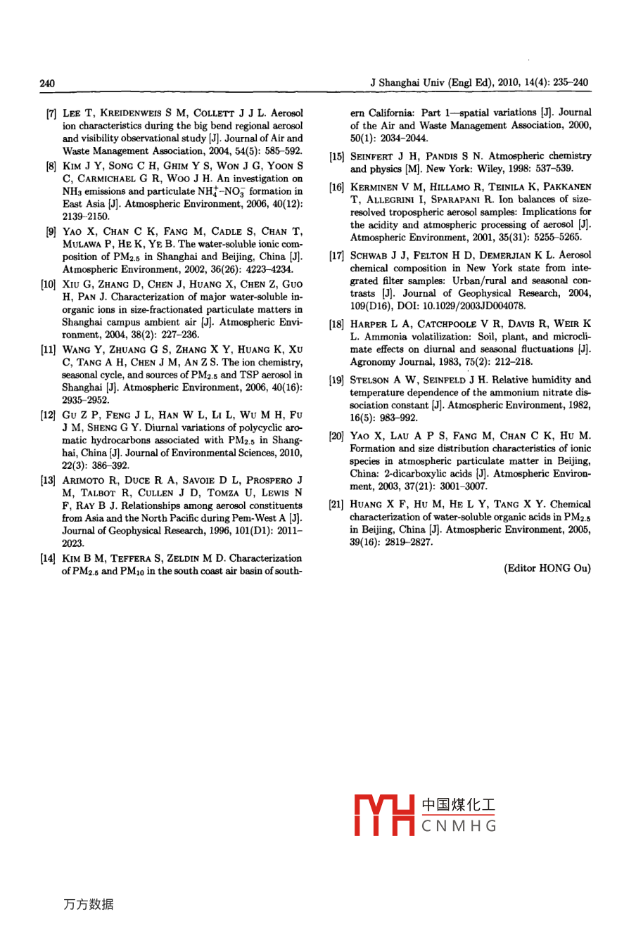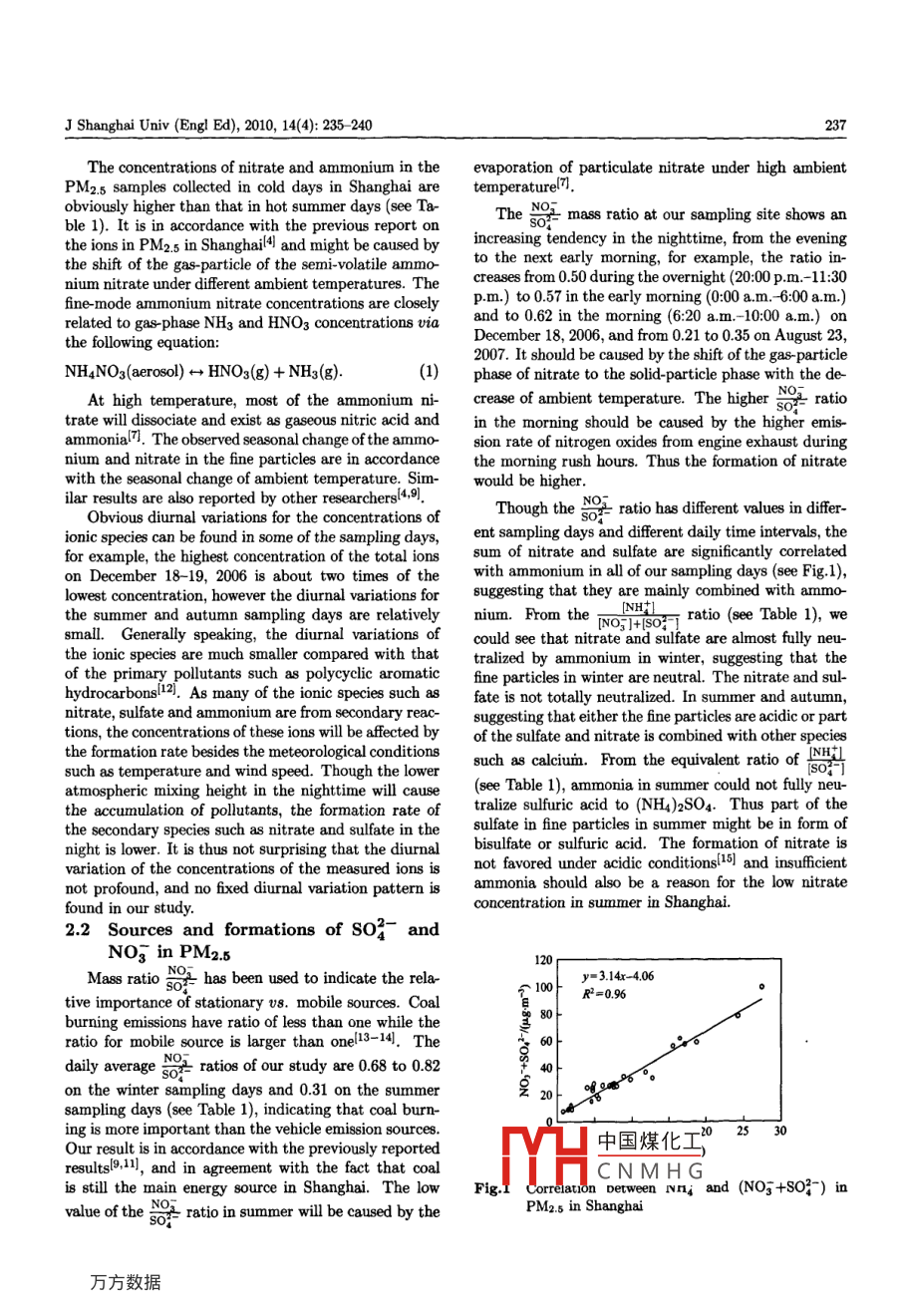 J Shanghai Univ (Engl Ed), 2010, 14(4): 235 -240Digital Object Identifier(DOI): 10.1007/s11741-010-0636-2Diurnal variations of water-soluble ions in PM2.5 in ShanghaiFENG Jia-liang (馮加良),GUAN Jing-jing (管晶晶), . GU Ze-ping (顧澤平)School of Environmental and Chemical Engineering, Shanghai University, Shanghai 200444, P. R. China(Communicated by JIAO Zheng)OShanghai University and Springer-Verlag Berlin Heidelberg 2010Abstract Thirty-six daily time interval PM2.5 samples were collected in diferent seasonal dates in urban Shanghai, and theconcentrations of four anions (C1 , NOg, so2- , C202- ) and five cations (NHt, Na+, k+, Ca2+, Mg2+) were analyzed withion chromatography. Sulfate, nitrate and ammonium were found to be the dominant species, accounting for about 80% ofthe total ions. The daily nitrate to sulfate mass ratio ranged from 0.31 to 0.82, indicating that coal combustion was still themain pollution source in Shanghai. The equivalent ratio of ammonium to sum of nitrate and sulfate showed fixed diurnalvariation pattern in all the sampling days with higher values in the nighttime, suggesting that fine particles in the night weremore neutralized. The oxalate to sulfate ratio was lower in the winter sampling days than that in hotter summer and autumnsampling days. Oxalate was significantly correlated with sulfate in winter sampling days, but not in the summer and autumn,suggesting that the formation mechanism of oxalate and sulfate was similar in winter, however different in hot days.Keywords PM2.5, water -oluble ions, diurnal variation, ShanghaiIntroductiongreatly in recent years in east Asia due to the increasingFine particles (less than 2.5 μm in diameter, alsoemissions of anthropogenic pollutants and the decreas-called as PM2.5) in the atmosphere are of more anding concentration of coarse particlesl8.more concern because they are hazardous to humanShanghai is the biggest industrial and commercialhealth4l. Fine particles can also scatter sunlight andcity in China. The rapid economic progress in the lastcause visibility degradation and global climate changel2].several decades has laid great pressure on the atmo-Water-soluble ionic species are a major part of thespheric environment. Great efforts have been made toaerosol mass, accounting for about half of the PM2.5 incontrol air pollution in China by the government in themany casesl3- 4. Water soluble species are hygroscopiclast two decades. The atmospheric loading of total sus-and can be the cloud condensation nuclei (CCN)5.pended particles (TSP) and inhalable particles (PM1o)Study on the composition and formation mechanism andhave been decreased since the 1990s. However the oC-sources of water soluble species is important to the un-currence frequency of haze or low visibility is increas-derstanding and controlling of urban haze and globaling in the recent years and is of more and more con-climate change.cern. As water-soluble ions in fine particles are of greatSulfate (S0?-), nitrate (NOz) and ammoniumimportance in solar radiation scattering and visibility(NH+) are the most abundant species among water-degradation, their compositions and possible formationsoluble ions. Atmospheric sulfate and ammonium mainlymechanisms and sources have been widely studied inexist in fine particles and sulfate is mainly associatedShanghai in recent years based on integrated sampleswith ammonium3). Nitrate may be found in both fineof 12 48 h4.9-11I. Unfortunately, the formation mecha-particles and coarse particles6. Gaseous nitric acidnism is still not clear, partly due to the similarity of the(HNO3) can react with sea-salt particles to form coarseintegrated daily samples collected in different days of themode sodium nitrate. While nitrate formed by reac-same season. Studies on samples with higher time reso-tion of HNO3 with NH3 is in fne particles, NHNO3 islution is believed to give better insight into the sourcesvolatile and likely dissociates to gaseous HNO3 and NH3of the air borne fine particles and atmospheric reactions.at low relative humidity (RH) and high temperaturel1.In this study, we analyzed the diurnal variation of theIt was found that the fine mode NH4NO3 increasedionic species in fine particles in Shanghai based on dailyReceived Nov.19, 2009; Revised Dec.30, 2009中國煤化工Project supported by the National Natural Science Foundation of CIthe Shanghai LeadingAcademic Discipline Project (Grant No.S30109)MHCNMHGCorresponding author FENG Jia-liang, Ph D, Assoc Prof, E-mail: fengjiaiangoshu.edu.cn236J Shanghai Univ (Engl Ed), 2010, 14(4): 235 240time interval samples of about 4 h and discussed theC202-) and five cations (NH , Na+ , K+, Ca2+, Mg2+)impacting factors on the composition of ions.were analyzed by a dual channel ion chromatography(Metrobm IC, Switzerland). Anions and cations were1 Experimentsanalyzed by using Metrosep A SUPP 5 column with anA SUPP 5 guard column, and Metrosep C2 column with1.1 Sampling sitea C2 guard column respectively. The eluents were 3.2The sampling site is located in the Yanchang Cam-mmol/L Na2CO3/1.0 mmol/L NaHCO3 for the anionspus of Shanghai University in Zhabei District. The sam-and 4.0 mmol/L tartalic acid/0.75 mmol/[L dipicolinicpler was placed on the rooftop of a nine-storey buildingacid for the cations. The relative standard deviation of(about 30 m above ground). This site is surrounded byeach ion was less than 5% for reproducibility test. Thelow rise office and residential buildings. A road withdetection limits (S/N = 3) were less than 0.05 mg/Lmoderate traffic is about 300 m away to the north, andfor all the measured ions. We focused on the ions ofanother road with heavy traffic lies about 800 m awayNO3,so2-,C202- and NHt, whose concentrationsto the west. The sampling site is representative of thewere relatively high and the background contaminationurban atmospheric environment in Shanghai.. were very low.1.2 SamplingSamples were collected on glass fiber filters (What-2 Results and 
