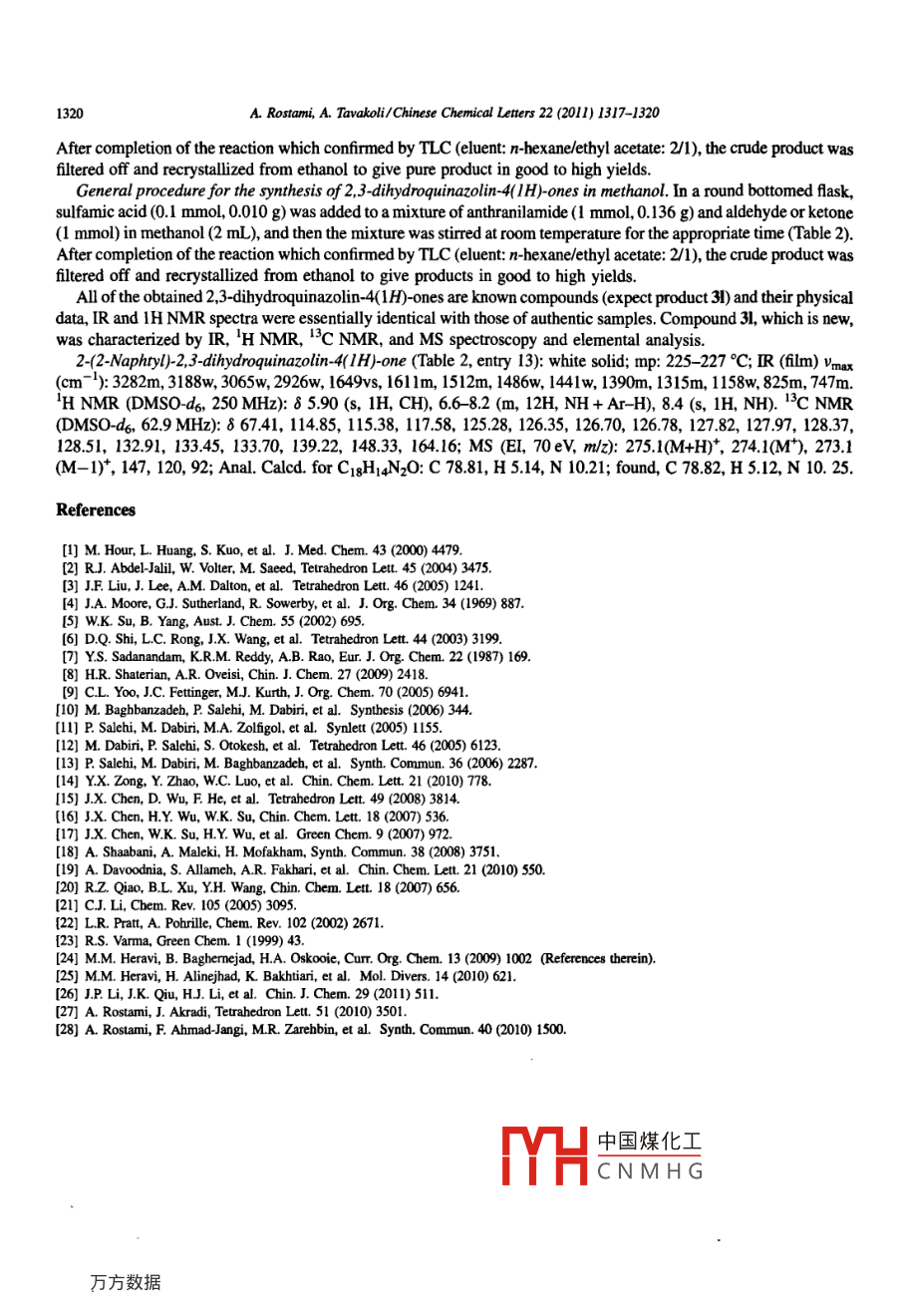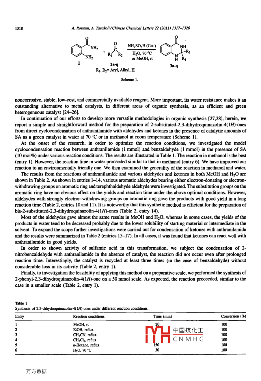 Available online at www.sciencedirect.comCHINESEScienceDirectC HEMICALL .ETTERSEI SEVIERChinese Chemical Letters 22 (2011) 1317-1320www.elsevier.com/locate/ccletSulfamic acid as a reusable and green catalyst for efficient andsimple synthesis of 2-substituted-2,3-dihydroquinazolin-4(1H)-onesin water or methanolAmin Rostami *, Ashkan TavakoliDepartment of Chemistry, Faculty of Science, University of Kurdistan, Sanandaj 6617715143, lranReceived 19 April 2011Available online 29 July 2011AbstractA series of 2.3-dihydroquinazolin 4(1H)-ones have been synthesized in good to excellent yields through direct cyclocondensa-tion of anthranilamide and aryl aldehydes or ketones in water or methanol under mild conditions. The reaction was efficientlypromoted by 10 mol% sulfamic acid (SA, H2NSOzH) and the catalyst could be recovered easily after the reactions and reusedwithout evident loss of reactivity.O 2011 Amin Rostami. Published by Elsevier B.V. on behalf of Chinese Chemical Society. All rights reserved.Keywords: Sulfamic acid; Catalyst; Anthranilamide; Aldehyde; Ketone; 2.3-Dibydroquinazolin 4(1H)-oncs2,3-Dihydroquinazolinones are a class of heterocycles that atracted much attention because they have beenreported to possess a wide range of pharmaceutical activities including antifertility, antibacterial, antitumor,antifungal, and mono amine oxidase inhibition [1]. In addition, these compounds can easily be oxidized to theirquinazolin-4(3H)- one analogues [2], which also include important pharmacologically active compounds [3]. Severalmethods have been reported for the synthesis of 2,3-dihydroquinazolinones [4- -20]. The typical procedure for thesynthesis of 2,3-dihydroquinazolin 4(1H)-ones involves the condensation reaction of anthranilamide with aldehyde orketone using acids as a catalyst under various conditions [4,8,10,14 -20]. However, some of these methodologies havelimitations such as harsh reaction conditions, use of expensive acid catalysts in organic solvents, long reaction timeand tedious work up. Hence, the development of simple, efficient, clean, high-yielding, and environmentally benignprotocols using green catalysts for the synthesis of these important compounds is still desirable and is in demand.The use of water as a solvent has many advantages in organic synthesis from both economic and environmentalpoints of view [21]. Also, water has become an attractive medium for many organic reactions, not only as one canavoid using drying reactants and expensive catalysts and solvents, but also rendering unique reactivity and selectivity[22]. In recent years, the use of solid acidic catalysts has offered important advantages in organic synthesis, some ofthese advantages are: operational simplicity, environmental compatibility, non-toxicity, reusability, low cost, and easeof isolation [23]. Sulfamic acid (SA, H2NSOzH) is a common inorganic acid with a mild acidity that is nonvoltile,* Corresponding author.中國(guó)煤化工E-mail address: a srostami372@yahoo.com (A. Rostami),MHCNMHG1001-8417/S - see front matter◎2011 Amin Rostami. Published by EIlsevier B.V. on behalf of Chinese Chemical Society, All rights reserved.doi:10.1016j.ce.2011.06.0081318A. Rostami, A. Tavakoli/Chinese Chemical Letters 22 (2011) 1317-1320NH2NH2SOzH (Cat)H2O, 700C-R2or MeOH, rtH R;2aq3aqR, R2= Aryl, Alkyl, HScheme 1.noncorrosive, stable, low-cost, and commercially available reagent. More important, its water resistance makes it anoutstanding alternative to metal catalysts, in different areas of organic synthesis, as an efficient and greenheterogeneous catalyst [24 -26].In continuation of our efforts to develop more versatile methodologies in organic synthesis [27,28], herein, wereport a simple and straightforward method for the preparation of 2-substituted-2,3-dihydroquinazolin-4(1H)-onesfrom direct cyclocondensation of anthranilamide with aldehydes and ketones in the presence of catalytic amounts ofSA as a green catalyst in water at 70。C or in methanol at room temperature (Scheme 1).At the onset of the research, in order to optimize the reaction conditions, we investigated the modelcyclocondensation reaction between anthranilamide (1 mmol) and benzaldehyde (1 mmol) in the presence of SA(10 mol%) under various reaction conditions. The results are ilustrated in Table 1. The reaction in methanol is the best(entry 1). However, the reaction time in water proceeded similar to that in methanol (entry 6). We have improved ourreaction to an environmentally friendly one. We then examined the generality of the reaction in methanol and water.The results from the reactions of anthranilamide and various aldehydes and ketones in both MeOH and H2O areshown in Table 2. As shown in entries 1-14, various aromatic aldehydes bearing either electron-donating or electron-withdrawing groups on aromatic ring and terephthaldehyde aldehyde were investigated. The substitution groups on thearomatic ring have no obvious effect on the yields and reaction time under the above optimal conditions. However,aldehydes with strongly electron-withdrawing groups on aromatic ring gave the products with good yield in a longreaction time (Table 2, entries 10 and 11). It is noteworthy that this synthetic method is efficient for the preparation ofbis- 2-substituted-2,3-dihydroquinazolin-4(1H)-ones (Table 2, entry 14).Most of the aldehydes gave almost the same results in MeOH and H2O, whereas in some cases, the yields of theproducts in water tend to be decreased probably due to the lower solubility of starting material or intermediate in thesolvent. To expand the scope further investigations were carried out for condensation of ketones with anthranilamideand the results were summarized in Table 2 (entries 15- -17). In all cases, it was found that ketones can react well withanthranilamide in good yields.In order to shown activity of sulfamic acid in this transformation, we subject the condensation of 2-nitrobenzaldehyde with anthranilamide in the absence o