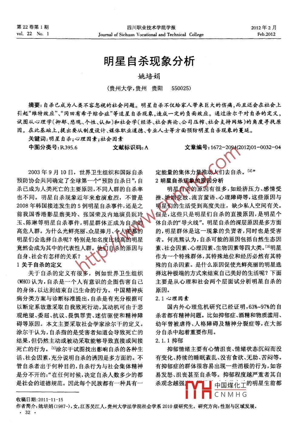 第22卷第1期四川職業(yè)技術(shù)學(xué)院學(xué)報(bào)2012年2月vol. 22 No. 1Jourmal of Sichuan Vocational and Technical CollegePeb.2012明星自殺現(xiàn)象分析姚培娟(貴州大學(xué),貴州貴陽(yáng)550025)摘要:自殺已成為人類不容忽視的社會(huì)問(wèn)題。明星自殺不僅給家人帶來(lái)巨大的傷痛,而且還會(huì)在社會(huì)上引起“維特效應(yīng)”、“岡田有希子綜合癥”等追星自殺現(xiàn)象,造成一定的負(fù)面效應(yīng)。通過(guò)涂爾干對(duì)自殺的定義,試圖從心理學(xué)(抑郁、悲觀、個(gè)性認(rèn)知)和社會(huì)學(xué)(經(jīng)濟(jì)、社會(huì)輿論、公司壓榨、社會(huì)支持網(wǎng)絡(luò))的角度尋找原因。在此基礎(chǔ)上,提出要從制度設(shè)計(jì)、媒體職業(yè)道德、專業(yè)人士等方面預(yù)防明星自殺現(xiàn)象的蔓延。關(guān)鍵詞:明星自殺;心理因素;社會(huì)因素中圖分類號(hào): R395.6文獻(xiàn)標(biāo)識(shí)碼:A文章編號(hào): 1672- 2094(2012)01 -0032-042003年9月10日,世界衛(wèi)生組織和國(guó)際自殺定能量的集體力量推動(dòng)人們?nèi)プ詺?。[27”預(yù)防協(xié)會(huì)共同確定了全球第一個(gè)“預(yù)防自殺日”,自2明星自殺現(xiàn)象的原因分析殺已成為人類死亡的主要原因,不同人群的自殺率.明星自殺的原因有很多,如經(jīng)濟(jì)壓力、感情受也不同。明星自殺現(xiàn)象近年來(lái)愈演愈烈,不管是挫、婚姻變故、流言蜚語(yǔ)、心理障礙等,這些原因與2008年韓國(guó)接連發(fā)生的5例明星自殺事件,還是之明星們的生活受到高度關(guān)注,缺少私人空間有關(guān)。前我國(guó)香港影星翁美玲、張國(guó)榮及內(nèi)地演員阮玲但是,這些只是明星們自殺的直接原因,是明星個(gè)玉、陳琳等明星自殺事件,明星群體正成為自殺的體自殺的“導(dǎo)火線”。明星自殺的深層原因是多方面高危人群。為什么光鮮亮麗、眾星捧月、令人羨慕的的,明星群體是這一現(xiàn)象的負(fù)責(zé)者,同時(shí)也是受害明星們會(huì)選擇自殺呢?特別是知名度比較高的明星者。何兆熊認(rèn)為,自殺可能的原因包括自然生態(tài)因竟然會(huì)成為其中的代表性人群。他們自殺的原因與素、社會(huì)因素心理因素、生物因素等四大類。[31明星自身、社會(huì)有怎樣的關(guān)系?作為一個(gè)特殊群體,其特殊地位和經(jīng)歷必然有其特1關(guān)于自殺的定義殊的自殺因素。是什么原因促使光鮮亮麗的明星選關(guān)于自殺的定義有很多,例如世界衛(wèi)生組織擇這種極端的方式來(lái)結(jié)束自己美好的生活呢?下面(WHO)認(rèn)為,自殺是一個(gè)人有意識(shí)的企圖傷害自己主要是從心理和社會(huì)兩個(gè)層面試分析明星自殺的的身體,以達(dá)到結(jié)束自己生命的行為。中國(guó)精神疾原因。病分類方案與診斷標(biāo)準(zhǔn)提出,自殺是有充分根據(jù)可2.1心理因素以斷定系故意采取自我致死行動(dòng),其動(dòng)機(jī)可由于悲國(guó)內(nèi)外心理危機(jī)研究已經(jīng)證明,63%~97%的自觀絕望、委屈、抗議、畏懼罪貴、迷信驅(qū)使和精神障殺者都有精神問(wèn)題。比如抑郁癥、酒精和物質(zhì)濫用、礙等原因。本文主要采取社會(huì)學(xué)家涂爾干的定義。幼年曾被虐待、人格障礙及精神分裂癥等,在大部涂爾干認(rèn)為,自殺指的是受害者知道會(huì)導(dǎo)致死亡的分自殺中起著重要作用。結(jié)果,但仍然主動(dòng)或被動(dòng)采取能夠?qū)е轮苯踊蜷g接2.1.1抑郁死亡的行為。1涂爾干試圖找出影響自殺的各種生抑郁情緒主要有心情沮喪、情緒狀態(tài)沉悶而沒(méi)活、社會(huì)因素,充分說(shuō)明自殺的誘因是多方面的。不有變化、持續(xù)的睡眠紊亂、沒(méi)有食欲、無(wú)助、苦悶等。管自殺者出于何種目的,自殺行為與社會(huì)集體精神有抑郁癥的群體很容易出現(xiàn)一些消極的行為,如容是分不開(kāi)的:“在任何時(shí)候,決定自殺人數(shù)多少的都易發(fā)怒、沮喪甚至自殺等。抑郁程度越嚴(yán)重者其自是社會(huì)的道德規(guī)范。因此每個(gè)民族都有一種具有一殺觀念越強(qiáng)中國(guó)煤化工的明星生前都YHCNMHG收稿日期:2011-11-15作者簡(jiǎn)介:姚培娟(1987-),女,江蘇吳江人,貴州大學(xué)法學(xué)院社會(huì)學(xué)系2010級(jí)研究生。研究方向:性別與區(qū)域發(fā)展。2.姚培娟明星自殺現(xiàn)象分析有很嚴(yán)重的消極情緒,張國(guó)榮在他的自傳中寫(xiě)到:變、自我中心等個(gè)性,往往通過(guò)自殺逃避危機(jī),吸引“我想自己可能患上抑郁癥,至于病源是對(duì)自己不他人關(guān)注。人格障礙與自殺的發(fā)生有關(guān)。許多研究滿,對(duì)別人不滿,對(duì)世界更加不滿?!北砻?,偏態(tài)人格的形成與個(gè)體早期的經(jīng)歷有著密切其實(shí)很多患有抑郁癥自殺的明星們都是出自的關(guān)系,加強(qiáng)自殺者人格研究對(duì)自殺的預(yù)防、干預(yù)于單親或混亂的家庭,或者早年失去了父母的愛(ài),起到積極有效的作用。這些給他們留下了一生的陰影。據(jù)有關(guān)研究發(fā)現(xiàn),62.1.4認(rèn)知?dú)q以前的童年經(jīng)歷對(duì)一個(gè)人的影響是關(guān)乎終身的,自殺是一種有意殘害自己的行為,它的發(fā)生受尤其是在兩三歲之前,和自己母親的關(guān)系至關(guān)重到自殺者認(rèn)