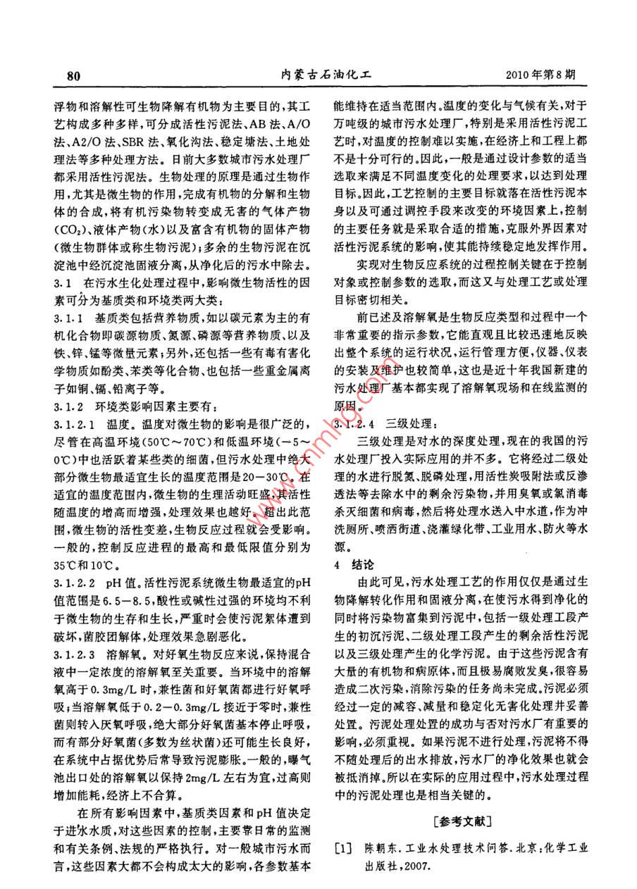 2010年第8期內(nèi)蒙古石油化工79淺談工業(yè)污水水處理郅前標(biāo),高慧芳(中海石油天野化工有限公司)摘要:工業(yè)污水水處理的方式方法以及一般的水處理工藝。關(guān)鍵詞:污水水處理工藝;機(jī)械處理;生化處理中圖分類號:TQ085文獻(xiàn)標(biāo)識碼:A文章編號:1006-7981(2010)08-00790水的處理方法可以概括為三種方式:①最常用對污水進(jìn)行消毒??赡芨鶕?jù)處理的目標(biāo)和水質(zhì)的不的是通過去除原水中部分或全部雜質(zhì)來獲得所需要同,有的污水處理過程并不是包含上述所有過程。的水質(zhì);②通過在原水中添加新的成分來獲得所需2機(jī)械處理工段要的水質(zhì);③對原水的加工不涉及去除雜質(zhì)或添加機(jī)械(一級)處理工段包括格柵、沉砂池、初沉池新成分的問題。等構(gòu)筑物,以去除粗大顆粒和懸浮物為目的,處理的軟化水處理:用化學(xué)”樹脂"處理,如硬水軟化。原理在于通過物理法實(shí)現(xiàn)固液分離,將污染物從污常用的污水處理技術(shù)有生物化學(xué)法,如活化污水中分離,這是普遍采用的污水處理方式。機(jī)械(泥法,生物結(jié)層法,混合生物法等;物理化學(xué)法如粒級)處理是所有污水處理工藝流程必備工程(盡管有質(zhì)過濾法,活化炭吸附法,化學(xué)沉淀法,膜濾/析法時有些工藝流程省去初沉池),城市污水一級處理等;自然處理法,如穩(wěn)定塘法,氧化溝法,人工濕地BOD5和SS的典型去除率分別為25%和50%。在生法,化學(xué)色可賽思樹脂處理法。物除磷脫氮型污水處理廠,一般不推薦曝氣沉砂池,1水處理工藝以避免快速降解有機(jī)物的去除;在原污水水質(zhì)特性污水處理一般來說包含以下三級處理:一級處不利于除磷脫氮的情況下,初沉的設(shè)置與否以及設(shè)理是它通過機(jī)械處理,如格柵、沉淀或氣浮,去除污置方式需要根據(jù)水質(zhì)特注的后續(xù)工藝加以仔細(xì)分析水中所含的石塊、砂石和脂肪、油脂等。二級處理是和考慮,以保證和改善除磷除脫氮等后續(xù)工藝的進(jìn)生物處理,污水中的污染物在微生物的作用下被降水水質(zhì)。解和轉(zhuǎn)化為污泥。三級處理是污水的深度處理,它包3污水生化處理括營養(yǎng)物的去除和通過加氯、紫外輻射或臭氧技術(shù)污水生化處理屬于二級處理,以去除不可沉懸服點(diǎn)的六分之一,且不大于50MPa時的工況壓計(jì)算其一次總體薄膜應(yīng)力,所以選取Pt=0.次總薄膜應(yīng)力(環(huán)向應(yīng)力),校核計(jì)算14MPa。臥式容器:=13.9MPa;而16MnR標(biāo)準(zhǔn)常臥式容器:0=2+xR26溫屈服點(diǎn)as=345MPa;∴∝≤s/6=57.5MPa且?!?0MPa,因此,滿足GB150-1998《鋼制壓力容器》中M2=E,1+2(Rm-一次總體薄膜應(yīng)力小于材料標(biāo)準(zhǔn)常溫屈服點(diǎn)的六分之一,且不大于50MPa綜上所述,液氯儲槽的設(shè)計(jì)在低溫低應(yīng)力工況57406×9.8下以50℃的液氣飽和蒸汽壓為依據(jù)進(jìn)行設(shè)計(jì)是合理FN=2812894N的同時也考慮了低溫的影響,在結(jié)構(gòu)設(shè)計(jì)等方面也m=設(shè)備重量與介質(zhì)重量之和10506+46900采取了一些有利低溫的結(jié)構(gòu),這樣的設(shè)計(jì)即滿足了=57406Kg;設(shè)備重:10506Kg,充裝介質(zhì)重:安全性,同時也降低了設(shè)備造價46900Kg;L=8000+2×40=8080mm,M1=2.17[參考文獻(xiàn)]X108N. mm[1]GB150-98《鋼制壓力容器》.此時設(shè)備內(nèi)按介質(zhì)最低工作溫度小的飽和蒸汽[2]HG20585-1998《鋼制低溫容器技術(shù)規(guī)》.收稿日期:2010-02-15內(nèi)蒙古石油化工2010年第8期浮物和溶解性可生物降解有機(jī)物為主要目的,其工能維持在適當(dāng)范圍內(nèi)溫度的變化與氣候有關(guān),對于藝構(gòu)成多種多樣,可分成活性污泥法、AB法、A/O萬噸級的城市污水處理廠,特別是采用活性污泥工法、A2/O法、SBR法、氧化溝法、穩(wěn)定塘法、土地處藝時,對溫度的控制難以實(shí)施,在經(jīng)濟(jì)上和工程上都理法等多種處理方法。日前大多數(shù)城市污水處理廠不是十分可行的因此,一般是通過設(shè)計(jì)參數(shù)的適當(dāng)都采用活性污泥法。生物處理的原理是通過生物作選取來滿足不同溫度變化的處理要求,以達(dá)到處理用,尤其是微生物的作用,完成有機(jī)物的分解和生物目標(biāo)因此,工藝控制的主要目標(biāo)就落在活性污泥本體的合成,將有機(jī)污染物轉(zhuǎn)變成無害的氣體產(chǎn)物身以及可通過調(diào)控手段來改變的環(huán)境因素上,控制(CO2)、液體產(chǎn)物(水)以及富含有機(jī)物的固體產(chǎn)物的主要任務(wù)就是采取合適的措施,克服外界因素對微生物群體或稱生物污泥);多余的生物污泥在沉活性污泥系統(tǒng)的影響,使其能持續(xù)穩(wěn)定地發(fā)揮作用。淀池中經(jīng)沉淀池固液分離,從凈化后的污水中除去。實(shí)現(xiàn)對生物反應(yīng)系統(tǒng)的過程控制關(guān)鍵在于控制3.1在污水生化處理過程中,影響微生物活性的因?qū)ο蠡蚩刂茀?shù)的選取,而這又與處理工藝或處理素可分為基質(zhì)類和環(huán)境類兩大類:目標(biāo)密切相關(guān)。3.1.1基質(zhì)類包括營養(yǎng)物質(zhì),如以碳元素為主的有前已述及溶解氧是生物反應(yīng)類型和過程中一個機(jī)化合物即碳源物質(zhì)、氮源、磷源等營養(yǎng)物質(zhì)、以及非常重要的指示參數(shù),它能直觀且比較迅速地反映鐵鋅、錳