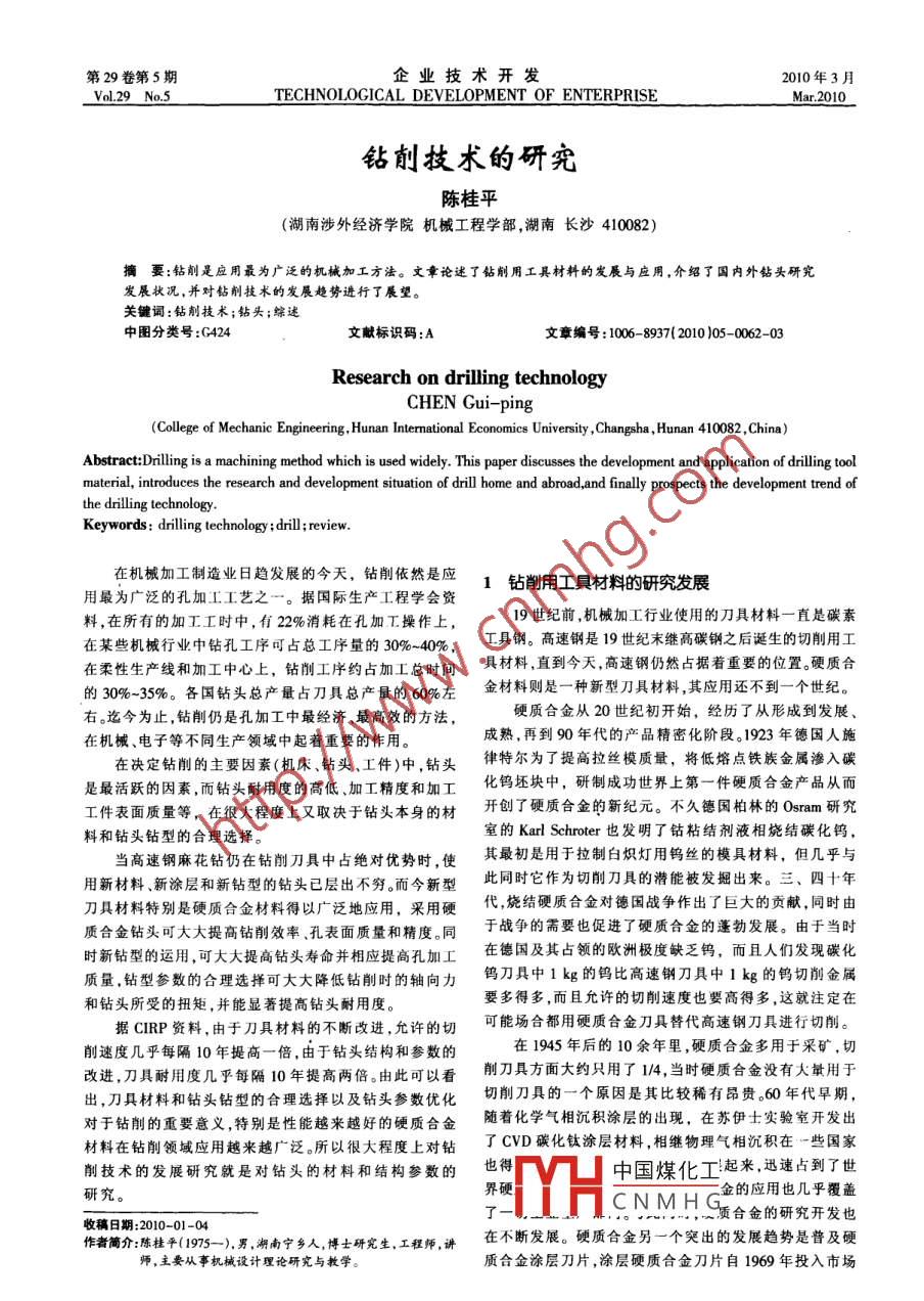 第29卷第5期企業(yè)技術開發(fā)2010年3月_Vol.29 No.5TECHNOLOGICAL DEVELOPMENT 0F ENTERPRISEMar.2010鉆削技術的研究陳桂平(湖南涉外經濟學院機械工程學部,湖南長沙410082)摘要:鉆削是應用最為廣泛的機械加工方法。 文章論述了鉆削用工具材料的發(fā)展與應用,介紹了國內外鉆頭研究發(fā)展狀況,并對鉆削技術的發(fā)展趨勢進行了展望。關鍵詞:鉆削技術;鉆頭;綜述.中團分類號:G424文獻標識碼:A文章編號:1006- 8937(2010 )05-0062-03Research on drilling technologyCHEN Gui-ping(College of Mechanic Engineering, Hunan Intemational Economics University ,Changsha, Hunan 410082 ,China)Abtract:Dilling is a machining method which is used widely. This paper discusses the development and application of dillig toolmaterial, introduces the research and development situation of drill home and abroad,and finally prospects the development trend ofthe dilling technology.Keywords: dilling technology ;rill;review.在機械加工制造業(yè)日趨發(fā)展的今天,鉆削依然是應1鉆削用工具材料的研究發(fā)展用最為廣泛的孔加工工藝之一。據(jù)國際生產工程學會資19世紀前,機械加工行業(yè)使用的刀具材料一直是碳素料,在所有的加工工時中,有22%消耗在孔加工操作上,在某些機械行業(yè)中鉆孔工序可占總工序量的30%-40%,工具鋼。高速鋼是19世紀末繼高碳鋼之后誕生的切削用工在柔性生產線和加工中心上,鉆削工序約占加工總時間具材料,直到今天,高速鋼仍然占據(jù)著重要的位置。硬質合的30%~35%。各國鉆頭總產最占刀具總產最的60%左金材料則是一種新型刀具材料,其應用還不到一個世紀。右。迄今為止,鉆削仍是孔加工中最經濟、最高效的方法,硬質合金從20世紀初開始,經歷了從形成到發(fā)展.在機械、電子等不同生產領域中起著重要的作用。成熟,再到90年代的產品精密化階段。1923年德國人施在決定鉆削的主要因素(機床、鉆頭、工件)中,鉆頭律特爾為了提高拉絲模質量,將低熔點鐵族金屬滲入碳是最活躍的因素,而鉆頭耐用度的高低、加工精度和加工化鎢坯塊中,研制成功世界上第一件硬質合金產品從而工件表面質量等,在很大程度上又取決于鉆頭本身的材開創(chuàng)了硬質合金的新紀元。不久德國柏林的Osram研究料和鉆頭鉆型的合理選擇。室的KarlSchroter也發(fā)明了鈷粘結劑液相燒結碳化鎢,當高速鋼麻花鉆仍在鉆削刀具中占絕對優(yōu)勢時,使其最初是用于拉制白熾燈用鎢絲的模具材料,但幾乎與用新材料.新涂層和新鉆型的鉆頭已層出不窮。而今新型此同時它作為切削刀具的潛能被發(fā)掘出來。三、四十年刀具材料特別是硬質合金材料得以廣泛地應用,采用硬代,燒結硬質合金對德國戰(zhàn)爭作出了巨大的貢獻,同時由質合金鉆頭可大大提高鉆削效率孔表面質量和精度。同于戰(zhàn)爭的需要也促進了硬質合金的蓬勃發(fā)展。由于當時時新鉆型的運用,可大大提高鉆頭壽命并相應提高孔加工在德國及其占領的歐洲極度缺乏鎢,而且人們發(fā)現(xiàn)碳化質量,鉆型參數(shù)的合理選撣可大大降低鉆削時的軸向力鎢刀具中1 kg的鎢比高速鋼刀具中1 kg的鎢切削金屬和鉆頭所受的扭矩,并能顯著提高鉆頭耐用度。要多得多,而且允許的切削速度也要高得多,這就注定在據(jù)CIRP資料,由于刀具材料的不斷改進,允許的切可能場合都用硬質合金刀具替代高速鋼刀具進行切削。削速度幾乎每隔10年提高一倍,由于鉆頭結構和參數(shù)的在1945年后的10余年里,硬質合金多用于采礦,切改進,刀具耐用度幾乎每隔10年提高兩倍。由此可以看削刀具方面大約只用了1/4,當時硬質合金沒有大量用于出,刀具材料和鉆頭鉆型的合理選擇以及鉆頭參數(shù)優(yōu)化切削刀具的一個原因是其比較稀有昂貴。60年代早期,對于鉆削的重要意義,特別是性能越來越好的硬質合金隨著化學氣相沉積涂層的出現(xiàn),在蘇伊士實驗室開發(fā)出材料在鉆削領域應用越來越廣泛。所以很大程度上對鉆了CVD碳化鈦涂層材料,相繼物理氣相沉積在-些國家削技術的發(fā)展研究就是對鉆頭的材料和結構參數(shù)的也中國煤化工起來,迅速占到了世研究。界硬二金的應用也幾乎覆蓋了:DH. CNM HS質合金的研究開發(fā)也收稿日期:2010-01-04作者簡介:陳桂平(1975-).男,湖南寧鄉(xiāng)人,博士研究生,工程師,講在不斷發(fā)展。硬質合金另一個突出的發(fā)展趨勢是普及硬師,主要從事機械設計理論研究與教學。質合金涂層刀片,涂層硬質合金刀片自1969年投入市場第29卷第5期.陳桂平:鉆削技術的研究63以來,在工業(yè)發(fā)達國家已占據(jù)了全部硬質合金刀片的角公式,但所給出橫刃斜角不是獨立變量,后刀面形狀不60%~70%。能唯一。1970年,S.Fuji ,M.F.Devries和S.M.Wu采用割平最近10年,我們可以看到,在成份和顯微結構上復面法將鉆尖后刀面的三維空間曲面化為二維研究,重新雜化的碳氮化鈦基硬質合金,即“金屬陶瓷"的使用正日給出了橫刃斜角的定義。1978年. W.D.Tsai和S.M.Wu將益增長。涂層硬質合金刀片已由早期的單涂層發(fā)展到了鉆尖后刀面的三種形式錐面、橢球面、雙曲面統(tǒng).一成二次雙涂層、三涂層以至多涂層,如瑞典山德維克公司最新涂曲面的標準方程,并給出幾何參數(shù)的計算公式,但并沒有層刀片GC3015、美國肯那曼特公司KC910都是雙涂層提出其刃磨方法,而鉆尖數(shù)學模型的建立是與其刃磨方(TiC-Al2O3),聯(lián)邦德國的Widalon 刀