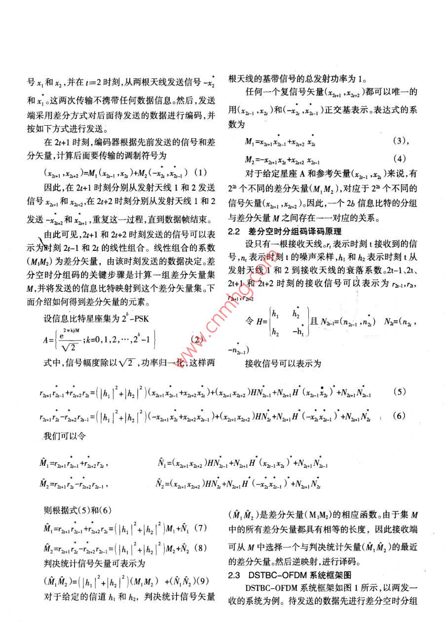 基于著分時分組碼的OFDM系綿的性能分析陳靜(南京郵電大學(xué)通信與信息工程學(xué)院南京210003)摘要本文介紹了差分空時分組碼的編譯碼原理,研究了采用差分空時分組碼的OFDM系統(tǒng)( DSTBC-OFDM)性能,仿真結(jié)果表明, DSTBC-OFDM系統(tǒng)的性能隨著子載波數(shù)及子信道數(shù)的增加而提高。通過仿真還證明了多天線技術(shù)與OFDM技術(shù)相結(jié)合,系統(tǒng)性能可得到提高,更適用于多徑無線信道,而且采用差分編碼技術(shù),接收端不需要信道估計,可以大大降低接收機的復(fù)雜度。關(guān)鍵詞多輸入多輸出正交頻分復(fù)用差分空時分組碼多徑信道子載波1引言送天線數(shù)目較多時也變得越來越困難,這將嚴(yán)重制約這些空時編碼的應(yīng)用。因此, Tarokh和 Jafarkhani移動通信的不斷發(fā)展和人們對通信需求的日益在空時分組碼理論的基礎(chǔ)上,提出了基于正交設(shè)計增長,要求在有效的頻譜資源上實現(xiàn)綜合業(yè)務(wù)的快的差分空時分組碼,該方案提供了簡單的差分編碼速傳輸,需要頻譜效率極高的技術(shù)。OFDM技術(shù),利和譯碼的方法。對于單天線系統(tǒng),差分相移鍵控用多載波之間的正交性,高效利用頻譜資源MMO(DSK)編碼,不要進行信道估計,該差分方案已經(jīng)( Multiple Input Multiple Output)技術(shù),可以在不增加在實際蜂窩移動通信系統(tǒng)中廣泛使用。例如美國數(shù)帶寬的情況下,成倍的提高通信系統(tǒng)的容量和頻譜字蜂窩系統(tǒng)標(biāo)準(zhǔn)IS54就使用了-DSK。本文利用率,一般的MIMO技術(shù)僅適用于平坦衰落信道,將差分方案擴展到MMO系統(tǒng)中,主要介紹了基于而OFDM技術(shù)可以將一個頻率選擇性衰落信道分割成若干并行的平坦衰落子信道,所以在MMO系統(tǒng)正交設(shè)計的差分空時分組碼,并以兩發(fā)一收的MI中采用OFDM技術(shù)能夠?qū)购蜏p小多徑傳輸引起的MO-OFDM系統(tǒng)為例,對其在M1225信道下的性能碼間干擾,使信道更符合MMo技術(shù)所需的傳輸特進行了仿真和分析。性2差分空時分組碼編譯碼原理目前空時編碼技術(shù)主要包括分層空時碼,空時分組編碼空時網(wǎng)格編碼。上述各類空時碼的研究均21差分空時分組碼編碼原理是在準(zhǔn)靜態(tài)衰落信道條件下進行的,且需要信道信當(dāng)發(fā)射天線數(shù)為2時,該方案首先發(fā)送兩個參息進行信道估計。然而在實際無線通信系統(tǒng)中,并不考調(diào)制信號x1和x2。根據(jù) Alamouti提出的空時分組能保證這個假設(shè)條件,信道估計在衰落較快或者發(fā)碼論,發(fā)送端在t=1時刻,從兩根天線同時發(fā)送信號x1和x2,并在t=2時刻,從兩根天線發(fā)送信號x2根天線的基帶信號的總發(fā)射功率為1。和x1。這兩次傳輸不攜帶任何數(shù)據(jù)信息。然后,發(fā)送任何一個復(fù)信號矢量(x21,x22)都可以唯一的端采用差分方式對后面待發(fā)送的數(shù)據(jù)進行編碼并用“和(-x2,x)正交基表示。表達式的系按如下方式進行發(fā)送。數(shù)為在2+1時刻,編碼器根據(jù)先前發(fā)送的信號和差分矢量,計算后面要傳輸?shù)恼{(diào)制符號為M2=-x2+1x2+x2+2x21(4)(x21,x2)=M1(x21,x2)+M2(-x2,x21)(1)對于給定星座A和參考矢量(x21,x2)來說,有因此,在2+1時刻分別從發(fā)射天線1和2發(fā)送2個不同的差分矢量(MM,),對應(yīng)于2個不同的信號x;和x2,在2+2時刻分別從發(fā)射天線1和2信號矢量(x21,x2)因此,一個2b信息比特的分組發(fā)送一x2和x2,重復(fù)這一過程直到數(shù)據(jù)幀結(jié)束。與差分矢量M之間存在一一對應(yīng)的關(guān)系。由此可見,2+1和2+2時刻發(fā)送的信號可以表22差分空時分組碼譯碼原理為時刻2-1和2的線性組合。線性組合的系數(shù)設(shè)只有一根接收天線。r表示時刻t接收到的信(MM2)為差分矢量,由該時刻發(fā)送的數(shù)據(jù)決定。差號,n表示時刻t的噪聲采樣,和h表示時刻t從分空時分組碼的關(guān)鍵步驟是計算一組差分矢量集發(fā)射天線1和2到接收天線的衰落系數(shù)。2-1、2、M,并將發(fā)送的信息比特映射到這個差分矢量集。下2+1和2+2時刻的接收信號可以表示為B,面介紹如何得到差分矢量的元素。廠2+1,r2+2設(shè)信息比特星座集為2-PSKh, h,令H且N2=(n21,n2)N2=(n2,2τkyl;k=0,1,2,…,2式中,信號幅度除以√2,功率歸一化,這樣兩接收信號可以表示為hstn2=((2+12(2(xmx2:+xx2)+(xnx:)BN2+N(x2:2)+M12,(5n-2:=(12+1221(-x1:x+2x2:)+(x212)BN2+N21H(22:)+N212,(6)我們可以令M1=2r2-1+r2+2r2N2=(x21x2)HN21+N21B(x21x2)+N2nN2M2=2+12-7222N=(x. x,HN,N,.H(-X. x,)+N.N則根據(jù)式(5)和(6)(M1M2)是差分矢量(MM2)的相應(yīng)函數(shù)。由于集MM1=2,h+252=(12+1)M+y(7)中的所有差分矢量都具有相等的長度,因此接收端Mh212M2+2(8)可從M中選擇一個與判決統(tǒng)計矢量(M,M2)的最近判決統(tǒng)計信號矢量可表示為的差分矢量。然后逆映射,進行譯碼。(MM=(1+1(MM1)+(所9)23 DSTBC-OFDM系統(tǒng)框架圖DSTBC-OFDM系統(tǒng)框架如圖1所示,以兩發(fā)對于給定的信道h1和h2,判決統(tǒng)計信號矢量收的系統(tǒng)為例。待發(fā)送的數(shù)據(jù)先進行差分空時分組channel A。3.1各差分系統(tǒng)間的性能比較P圖2給出了采用 DQPSK調(diào)制的OFDMDSTBC系統(tǒng),采用兩發(fā)一收的差分空時分組碼系統(tǒng)和采用兩發(fā)一收差分空時分組碼的OFDM系統(tǒng)三種差分系統(tǒng)的性能比較。從圖中可以看出,采用兩發(fā)一收差分空時分組碼的
