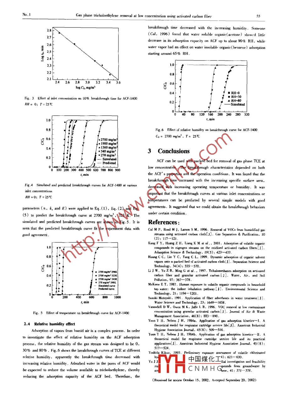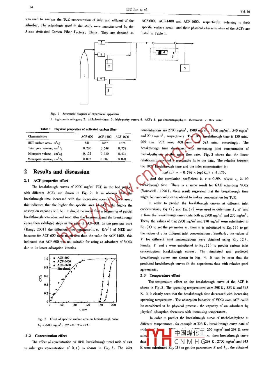 Journal f Entiroumemtal Sciences vol 16. No. 1. pp53-55,2004Article 1:|0010742(2004)01-0053-03CLC number: XS11 Document code: AGas phase tricholoethylene removal at low concentration using activatedcarbon fiberLIU Jun, HUANG Zheng-hong, WANG Zhan-sheng, KANG Fei-yu?(1. Department of Environment Scienee and Engineering, Tsinghua University, Beijing 100084. China. E-mail: liujun99@ mails. Tsinghua.edu.en2. Department of Material Science and Engineering, Tsinghua University. Beijing 100084, China)Abstract: The breakthrough adsorption behaviors of gas phase trichloroethylene in a packed bed of activated carbon fibers( ACF)wereestigated. The specific surtace area of the ACF was 600 mig. 1400 m'ig and 1600 m/g, respectively, and the concentration oftrichloroethylene ranged from 270 mg/ m'to 2700 mg/'m. Results showed that the capacity of adsorption increased with increasing specificsurface area, the relationship between the logarithms of 10% breakthrough time and concentration was approximately linear over theexperimental range, the breakthrough time decreased with increasing temperature and humidity. the breakthrough curves at different inletconcentration or different temperature can be predicted by several simple theoretical models with good agreementsKeywords: trichloroethylene; activated carbon fiber; adsorption; breakthrough curveIntroductiTricholoethylene TCE ), as an organic solvent, has been widely concentration and flow raleused in many fields with large quantity, and a large amount of TCEhasIf the adsorptive reaction is a nth order reaction, the half life ofbeen found to be emitted from the users, such mapollution, reactant is inversely proportional to the initial concentration raised toespecially for groundwater( Yu, 2000).It isgnized that (n-1)th power, then Eq (3)can be obtained(Yoon, 1984 b):conventional drinking water treatment processes have low efficiency in(3)removing tricholoethylene fmm water; new process must be used toWhere k, is proportionality constant; F is the flow rate. Eq (Iexposure to volatile organic compounds( vOC s )in water can occur frum Eq (2 )and Eq.(3)can be used to simulate and predict thepathways other than ingestion, inhalation and dermal absorption are also breakthrough curves for various inlet concentrationsimport pathways( Mekone, 1987), and the exposure dose through theIf the adsorption reaction operated under various temperatures,thethree pathways are the same order of magnitude and the major exposure Arhenius'equation is introduced to substitute for the constant kthway is inhalation( Yoshida, 1993). It is necessary to remove thevOCs both in drinking water and the volatiles from drinking watewhere k, is a constant; E is the activation energy R is the gasGranular activated carhon( GAC)has been applied for nany years constant, and T is the absolute temperature. Substitution of Eg. (4)Into control VOCs due to its high micropore volume and low priceEq- (3)gives Eq (5)(Huang, 1999):Recently activated carbon fiber( ACF) has been an interesting topic ofthe removal of vOCs because ACF has uniforrn micropore structuret=mr(5)faster adsorption kinetics, and a lower pressure drop comparing withEq (1), Eq (2)and Eq (5)can be used to simulate und predictCAC. Based on the superior characteristics of ACF, it is considered breakthrough curves under various temperaturefavorable for the treatment of VOCs. There are several reports(Yu1997:Suzuki,1991)about ACF absorbing VOCs in drinking 1 Materials and methodsater,however, few researches has been done to identify the feasibilityThe experiment system included a small ACF holder. a humidifierof ACF removing gas phase TCE at low concentration. In this work, the a tricholoethylene generator section, flow meters, and temperatureffcet of the specifie surface area, the inlet TE concentration, the controller, The schematic experimental now diagram is shown in Figadsorption temperature and the relatively humidity on the breakthrough High-purity nitrogen was used as the carrier gas. The gas phasecurves was studiedtricholoethylene was generated using temperature- controlled bubbler, andoduced by Yoon and Nelson ( Yootricholoethylene used was AR grade. The now rate through the bubble1984a) has been usedC= Ca 1+ exp[k'(rhumid gas was produced by bubbling the high-purity nitrogen throughWhere C is the exit concentration at breakthrough: Co is the inletvessel filled with water and the humid gas was mixed with dry high-puritynitrogen to get designed relative humidity. The ACF holder was a 15 cmconcentration: k'is a rale constant; r is 50% breakthrough time( raho long, 0.5 em inside diameter glass pipe. The total flow rate and theof exit lo inlet gas concentration of 0.5); and t is the operate time, koperate lemperature was kept at 200 em/ min and 25C. 200 mg ACFcan he express as Ey. (2)"YH中國煤化工hick andomatograph( GC)with ECDCNMHGCorresponding author54v.16was used to analyze the TCE eoncentration of inlet and effluent of the ACF 600, ACF-1400 and ACF-1600, respectively, referring to theiradsorber. The adsorbents used in the study were manufactured byspecific sudace areas, and their physical characteristies of the ACFs areAnsan Activated Carhon Fiber Factory, China. They are denoted as listed in Table I_47Fig. 1 Schematic diagram of experiment apparatushigh-purity nitrogen: 2. tricholocthylene: 3. high-purity water: 4. ACF: 5. gas chromatograph; 6.thermostat;7.flow meterTable 1 Physical properties of activated carbon fiberconcentrations are 2700 my/m, 1900 mg/m, 1360 mg/nt. 540 mg/mCharaeteristiesACF-600 ACF1400 ACF-1600 and 270 mg/m, respectively. The 10% breakthrough time is 150 minBET surface area, m/g1678205 min, 235 min,min and 583 min, accordingly.The減 al pore volume,cm3/gbreakthrough time decreased withMicropore volume. cmis0.1720,3200,432relationship provided a reasonable fit to the data. The relation betweenthe 10% breakthrough time and the inlet concentration is:2 Results and discussiong()=-0.576×log(C0)+4,1762.1 