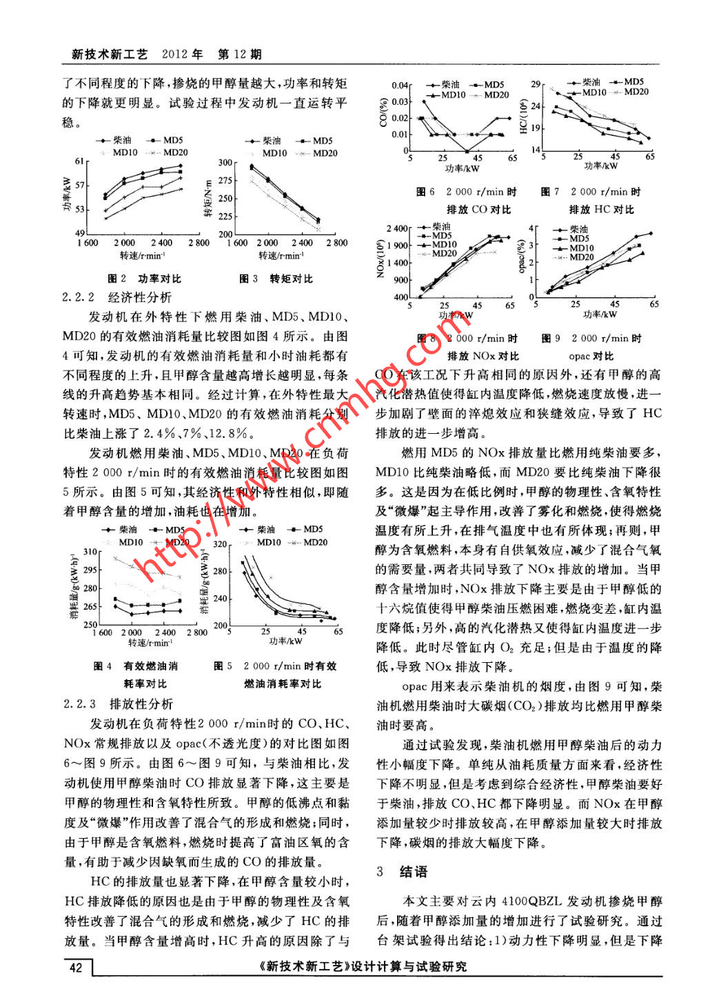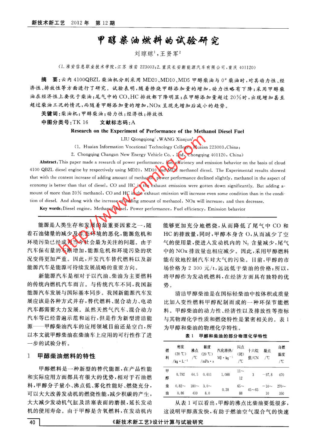 新技術(shù)新工藝2012年 第12期甲醇柴油燃料的試驗(yàn)研究劉瓊瓊',王賢軍2(1.淮安信息職業(yè)技術(shù)學(xué)院,江蘇淮安223003;2. 重慶長(zhǎng)安新能源汽車有限公司,重慶40120)摘要:云內(nèi) 4100QBZL柴油機(jī)分別采用MD20、MD10、MD5甲醇柴油與0#柴油時(shí),對(duì)其動(dòng)力性、經(jīng)濟(jì)性、排放性等方面進(jìn)行了研究。試驗(yàn)表明,隨著摻燒甲醇添加量的增加,動(dòng)力性略有下降;采用甲醇柴油在經(jīng)濟(jì)性.上要優(yōu)于柴油;尾氣中的CO.HC排放都下降明顯;在甲醇添加量超過(guò)20%時(shí),出現(xiàn)增加甚至超過(guò)柴油工況的情況,而隨著甲醇添加量的增加,NOx呈現(xiàn)先增加后減小的趨勢(shì)。關(guān)鍵詞:柴油機(jī);甲醇柴油;動(dòng)力性;經(jīng)濟(jì)性;排放性中圖分類號(hào):TK 16文獻(xiàn)標(biāo)志碼:AResearch on the Experiment of Performance of the Methanol Diesel FuelLIU Qiongqiong' ,W ANG Xianjun2(1. Huaian Information Vocational Technology College, Huaian 223003 ,China;2. Chongqing Changan New Energy Vehicle Co. , Lid, Chongqing 401 120, China)Abstract:This paper made a research of power performance, fuel efliciency and ernission behavior on the basis of cloud4100 QBZL diesel engine by respectively using MD20,MD10 and MD5 methanol diesel. The Experimental results showedthat with the content increase of adding amount of methanol, power performance declined slightly, methanol in the aspect ofeconomy is better than that of diesel, CO and HC in the exhaust emission were gotten down significantly. But adding a-mount of more than 20% methanol, CO and HC in the exhaust emission will increase even some condition than in the condi-tion of diesel. And along with the increase of adding amount of methanol, NOx will increase, and then decrease.Key words: Diesel engine, Methanol diesel, Power performance, Fuel efficiency, Emission behavior能源是人類生存和發(fā)展的最重要因素之一,隨能夠更加充分地燃燒,從而降低了尾氣中CO和著石油儲(chǔ)量的減少及生態(tài)環(huán)境的惡化,能源危機(jī)和HC的排放量,同時(shí),甲醇本身含O,從而減少了空環(huán)境污染已經(jīng)成為當(dāng)今社會(huì)最為關(guān)注的問(wèn)題。由于氣的使用量,使進(jìn)人發(fā)動(dòng)機(jī)內(nèi)的N2含量減少,尾氣汽車保有量的不斷增加,能源危機(jī)和環(huán)境污染的狀中的NOx排放量也相應(yīng)減少。因此,采用甲醇燃料況變得更加嚴(yán)重。因此,開(kāi)發(fā)汽車替代燃料以及新能有效地控制汽車對(duì)大氣的污染。目前,甲醇的市能源汽車是能源可持續(xù)發(fā)展戰(zhàn)略的重要方向。場(chǎng)價(jià)格為2 300元/t,遠(yuǎn)遠(yuǎn)低于柴油的價(jià)格;所以,新能源汽車是相對(duì)于以汽油.柴油為主要燃料將甲醇作為發(fā)動(dòng)機(jī)燃料,在經(jīng)濟(jì)方面具有獨(dú)特的優(yōu)的傳統(tǒng)內(nèi)燃機(jī)汽車而言。與傳統(tǒng)汽車不同,我國(guó)新勢(shì)。能源汽車發(fā)展與國(guó)際基本同步。我國(guó)新能源汽車發(fā)清潔甲醇柴油是在國(guó)標(biāo)輕柴油中按體積或質(zhì)量展應(yīng)該是各種方式并存,替代燃料、混合動(dòng)力、電動(dòng)比加人變性燃料甲醇配制而成的一種環(huán)保節(jié)能燃汽車都需要大力發(fā)展。雖然天然氣汽車、混合動(dòng)力料。甲醇柴油的動(dòng)力性、經(jīng)濟(jì)性以及排放性等指標(biāo)汽車等已經(jīng)普遍示范和運(yùn)行,但是作為新型清潔能與其物理化學(xué)性質(zhì)和燃燒特性是緊密相關(guān)的。表1源一甲醇柴油汽車的應(yīng)用領(lǐng)域目前還是空白,所為甲醇和柴油的物理化學(xué)特性。以本文就甲醇柴油在柴油車上應(yīng)用的可行性作了進(jìn)表1甲醇和柴油的部分物理化學(xué)特性一步的試驗(yàn)分析。密度沸黏度汽化潛熱/,內(nèi)點(diǎn)十六烷凝點(diǎn)自燃1甲 醇柴油燃料的特性(20 C),/M.kg-'(閉)值/CN /C溫度/kq.L-1/mPa.s/甲醇燃料是一種新型的替代能源,在產(chǎn)品性能甲110.792 64.5 0.6111. 0883- -97.8 470和實(shí)際應(yīng)用方面都具有很大的優(yōu)勢(shì),相對(duì)于石油燃12料,甲醇分子量小、沸點(diǎn)低、霧化性能好、燃燒充分,0.82~ 180~ 3.0~65-10~ 270~0.2845~65可以大大改善發(fā)動(dòng)機(jī)的燃燒性能,減少積碳的產(chǎn)生,油0.86 410 8.0810 35大大減少發(fā)動(dòng)機(jī)氣缸及活塞表面的磨損,延長(zhǎng)發(fā)動(dòng)從表1可以看出,甲醇的沸點(diǎn)比柴油要低很多,機(jī)的使用壽命。由于甲醇是含氧燃料,在發(fā)動(dòng)機(jī)內(nèi)這說(shuō)明甲醇蒸發(fā)快,有助于燃油空氣混合氣的快速《新技術(shù)新工藝》設(shè)計(jì)計(jì)算與試驗(yàn)研究.試驗(yàn)研究設(shè)計(jì)計(jì)算形成,利于完全燃燒;甲醇的凝點(diǎn)比柴油低得多,所溶的問(wèn)題,設(shè)計(jì)原理如圖1所示。以在環(huán)境溫度低時(shí)不會(huì)出現(xiàn)油路堵塞現(xiàn)象;甲醇的限壓閥黏度比柴油低,因此,其破碎和霧化程度也更好,這對(duì)以噴射方式供給燃料的內(nèi)燃機(jī)有利;柴油機(jī)的著尊|發(fā)動(dòng)火性能受很多因索影響,其中最主要的是燃料的十六烷值及自燃溫度;十六烷值是衡量柴油機(jī)中著火延遲期的最主要指標(biāo),其值越高,在柴油機(jī)中壓燃著火越快;其值越低,壓燃著火就越饅,甲醇的十六烷.值僅為3,約為柴油的1/20,按照國(guó)家標(biāo)準(zhǔn),要想使阿噴油家州發(fā)動(dòng)機(jī)-柴