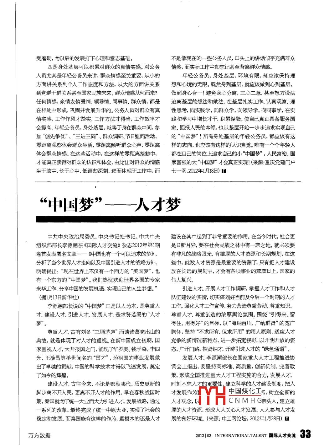 受磨礪,為以后的發(fā)展打下心理和意志基礎(chǔ)。不是像現(xiàn)在的一些公務(wù)人員,口頭上的講話似乎充滿群眾四是身處基層可以積累對群眾的真情實(shí)感。對公務(wù)情感,而實(shí)際工作中卻忘記甚至背離群眾情感。員尤其是年輕公務(wù)員來講,群眾情感至關(guān)重要,從小的年輕公務(wù)員,身處基層,環(huán)境有限,卻應(yīng)該保持理方面講關(guān)系到個(gè)人工作態(tài)度和方法,從大的方面講關(guān)系想和心境的無限。既然身到基層,就應(yīng)該做到心到基層,到黨群干群關(guān)系甚至國家民族未來。群眾情感從何而來?做到身心合一!避免身心分離,三心二意,甚至想方設(shè)法任何情感,親情友情愛情、領(lǐng)導(dǎo)情、同事情、群眾情,都是逃離基層的想法和做法。在基層扎實(shí)工作、認(rèn)真觀察、理在相處中形成、鞏固并發(fā)展升華的。公務(wù)人員對群眾有真性思考,向?qū)嵺`學(xué),向群眾學(xué),向領(lǐng)導(dǎo)學(xué),向同事學(xué),在實(shí)情實(shí)感,工作作風(fēng)才踏實(shí),工作方法才得當(dāng),工作效率才踐和學(xué)習(xí)中增長才干,積累經(jīng)驗(yàn),使自己真正具備服務(wù)國會提高。年輕公務(wù)員,身處基層,就等于身在群眾中間,參家、回報(bào)人民的本領(lǐng),也從基層開始一步步追求實(shí)現(xiàn)自己加“創(chuàng)先爭優(yōu)”、“三進(jìn)三同”、群眾調(diào)研、節(jié)日慰間活動,的“中國夢”!所有身處基層的年輕公務(wù)員,都應(yīng)該有這零距離觀察體會群眾生活,零距離傾聽群眾心聲,零距離樣的志向,也應(yīng)該有這樣的認(rèn)識自覺。唯有一個(gè)個(gè)年輕人體會群眾情感。在這些活動中,在這樣的零距離接觸中,都在自己的崗位上追求自己的小“中國夢”,人民富裕、國才能真正獲得對群眾的認(rèn)識和體會,由此讓對群眾的情感家富強(qiáng)的大“中國夢”才會真正實(shí)現(xiàn)!(來源重慶黨建門戶生于腦中,長于心中,低調(diào)卻深刻,進(jìn)而體現(xiàn)于工作中,而七一網(wǎng),2012年月18日)“中國夢”—人才夢中共中央政治局委員、中央書記處書記、中共中央建設(shè)在其中起到了非常重要的作用。在當(dāng)今時(shí)代,社會更組織部部長李源潮在《國際人才交流》雜志2012年第1期是日新月異,要在社會民族之林中有一席之地,就必須要卷首發(fā)表署名文章——《中國也有一個(gè)可以追求的夢》,有非凡的戰(zhàn)略眼光,有雄厚的人才資源和長期規(guī)劃,在這分析了當(dāng)今世界人才走向以及中國引進(jìn)人才的戰(zhàn)略方針,些中,就數(shù)人才資源是最重要的資源了,只有把人才建設(shè)明確提出:“現(xiàn)在世界上不僅有一個(gè)西方的“美國夢”,也放在長遠(yuǎn)的規(guī)劃中,才會有各項(xiàng)事業(yè)的蒸蒸日上,國家的有一個(gè)東方的“中國夢”。我們熱忱歡迎世界各國的專家偉大復(fù)興來華工作,分享中國的發(fā)展機(jī)遇,實(shí)現(xiàn)自己的人生夢想。引進(jìn)人才。開展人才工作調(diào)研,掌握人才工作和人才(據(jù)1月13日新華社)隊(duì)伍建設(shè)的實(shí)情,切實(shí)謀劃好當(dāng)前及今后一個(gè)時(shí)期的人才李源潮部長說的“中國夢”正是以人為本,是尊重人工作。強(qiáng)化人才工作宣傳努力營造尊重芳動、尊重知識才、建設(shè)人才、引進(jìn)人才、發(fā)展人才,是求賢若渴的人才尊重人才、尊重創(chuàng)造的濃厚輿論氛圍。圍繞“引得來、留得住、用得好”的目標(biāo),以“海納百川、廣納群賢”的寬廣尊重人才。古有劉備“三顧茅廬”而請諸葛亮出山的胸懷,堅(jiān)持“不求所有、但求所用”的用人原則,適應(yīng)人才典故,就是體現(xiàn)了對人才的重視。在新中國成立初期,國競爭的新情況新特點(diǎn),進(jìn)一步拓寬視野,以開明開放的姿家重視人才,大開報(bào)國之門,涌現(xiàn)了華羅庚、錢學(xué)森、李四態(tài),廣開門路,招賢納才,開辟引進(jìn)人才的“綠色通道”。光、王淦昌等舉世聞名的“國才”,為祖國的事業(yè)發(fā)展做發(fā)展人才。李源潮部長在國家重大人才工程推進(jìn)協(xié)出了卓越的貢獻(xiàn),中國的科學(xué)技術(shù)才得以飛速發(fā)展,奠定調(diào)會上指出,要堅(jiān)持高標(biāo)準(zhǔn)、高質(zhì)量,創(chuàng)新機(jī)制、完善政了如今的輝煌。策,形成全國推進(jìn)重大人才工程實(shí)施的合力。發(fā)展人才,建設(shè)人才。古往今來,不論是哪朝哪代,歷史更新的時(shí)刻不忘人才的重要性,建立科學(xué)的人才建設(shè)制度,把人腳步離不開人民,更離不開人才的作用。早在春秋戰(zhàn)國時(shí)才發(fā)展作為中國煤化工抓,樹立全新的期,秦國就為了統(tǒng)一大業(yè)而大力引進(jìn)人才,發(fā)展戰(zhàn)略,通過人才觀念,以CNMHG帶頭人,建立雄系列的改革,最終完成了統(tǒng)一中原大業(yè),實(shí)現(xiàn)了社會的厚的人才資源,形成人人關(guān)心人才發(fā)展、人人參與人才發(fā)穩(wěn)定和發(fā)展。而秦國能有這樣的作為,最根本的還是人才展的良好環(huán)境。(來源:中工網(wǎng)論壇,2012年1月28日)■20210607N0 NAL TALENT圍際人才交33