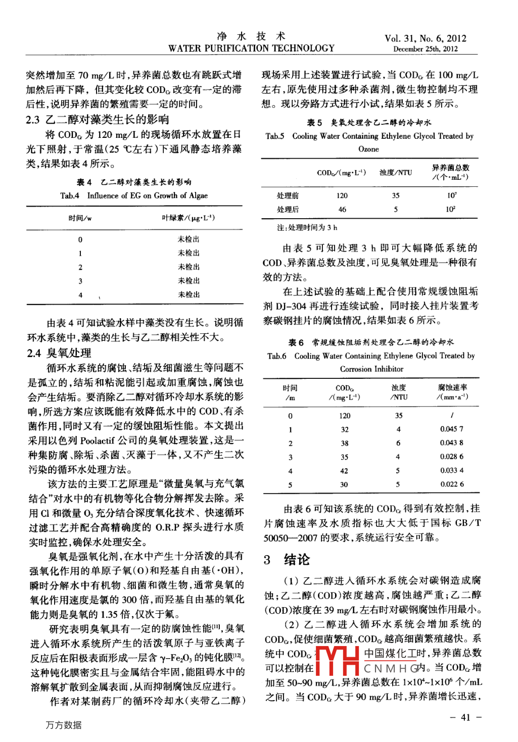 凈水技術(shù)2012,31(6):3842Water Purification Technology乙二醇污染的循環(huán)冷卻水處理試驗馮長春,焦莉莉,朱康生1,陳康1,張?zhí)┝x2(1華東理工大學上海多佳水處理科技有限公司,上海200237;2上海圖書館,上海200030)摘要該文通過電化學交流阻抗和腐蝕速率的測試,研究了碳鋼的腐蝕行為,并考察了乙二醇對異養(yǎng)菌及藻類的生長影響認為在被乙二醇污染的冷卻水處理中,臭氧處理是一種合適的解決方案。關鍵詞乙二醇循環(huán)冷卻水異養(yǎng)菌COD臭氧處理中圖分類號:TQ08514文獻標識碼:A文章編號:1009-0177(2012)06-0038-05Experiment of Treatment for Recirculated Cooling Water Polluted by Ethylene GlycolFeng Changchun, Jiao Lili, Zhu Kangsheng, Chen Kang, Zhang Taiyi(. Shanghai Duojia Water Treatment Science and Technology, East China University of and Technology, Shanghai 200237, china2. Shanghai Library, Shanghai 200030, ChinaAbstract The electrochemical impedance spectroscopy and corrosion rate in recirculated cooling water pullulated by ethyleneglycol were tested. Carbon steel corrosion behavior and effect of ethylene glycol on the growth of heterotrophic bacteria and algae werestudied. A suitable method of ozone process to treat recalculated cooling water polluted by ethylene glycol was put forwardKeywords ethylene glycol recirculated cooling water heterotropCOD ozonation在化工生產(chǎn)尤其是在制藥過程中存在反應的系統(tǒng)乙二醇的濃度。采用上海市自來水及試劑級乙復雜性,既有常溫冷卻又有低溫冷卻,因此制冷劑二醇來配置不同COD濃度的試驗用水。采用異養(yǎng)菌和冷卻水交叉通過同一反應釜的夾套,一般采用鹽富集培養(yǎng)法來配制含菌試驗用水。水或乙二醇作為制冷劑,由于鹽水的嚴重腐蝕性,12電化學交流阻抗測試目前普遍采用乙二醇。由于制冷劑和冷卻水的互試驗采用美國 PARSTAT2電化學工作站來研串,造成冷卻水中夾帶乙二醇,導致循環(huán)冷卻水系究不同乙二醇含量的水樣對碳鋼腐蝕的影響。其三統(tǒng)的運行障礙,表現(xiàn)為微生物的大量繁殖、粘泥超電極體系中輔助電極為鉑電極、參比電極為飽和甘標、腐蝕加快等影響傳熱及反應效果。汞電極,研究電極即測試對象為經(jīng)打磨拋光后的碳本文通過對乙二醇的電化學特性及其對碳鋼鋼金屬掛片。給電極施加5mV的正弦波電位在頻的腐蝕行為、乙二醇對細菌及藻類生長的影響等加率范圍為001Hz-100kHz的條件下進行交流阻抗以研究,以期找到相應的處理方法。試驗。1試驗方法13COD、異養(yǎng)菌、藻類測試1.1試驗配制水采用重鉻酸鉀法測水樣中的COD,用細菌測試瓶法測試水樣中的異養(yǎng)菌,以葉綠素a來表征由于系統(tǒng)中乙二醇含量和COD濃度存在對應水體藻類的數(shù)量并用熒光分光光度計法測試S。關系,根據(jù)化學反應式,每毫升水中1g乙二醇可以產(chǎn)生1.29gOD。因為乙二醇酒精類化學品極易蒸14腐蝕速率測試發(fā),難以測完,為了試驗測試的方便,用COD來表征采用圖1所示的自制循環(huán)水動態(tài)模擬裝置對碳鋼掛片在特定水質(zhì)條件下進行腐蝕速率測試碳[收稿日期]2012-05-02鋼掛片的V凵中國煤化工CB/T18175[基金項目上海市國際科技合作基金項目(112307048002000旋轉(zhuǎn)CNMHG作者筒介馮長春(1962-),男高級τ程師,研究方向為工業(yè)水處1.5循環(huán)水模擬裝置理[通訊作者]焦莉莉,電話:021-64252574;E-mal:jiaolilic@mail.sh.cn為了更好地模擬現(xiàn)場循環(huán)水系統(tǒng)運行情況,采方數(shù)據(jù)凈水技術(shù)Vol.3l,No.6,2012WATER PURIFICATION TECHNOLOGYDecember 25th 20126在COD=l1omgL-CODc1005001000150020001-控制裝置;2-水泵;3-加熱器;4試驗水浴5-恒溫水浴;6-轉(zhuǎn)子流量計;7-掛片圖3碳鋼在乙二醇溶液中的交流阻抗圖圖1腐蝕速率測試裝置Fig 3 EIS of Carbon Steel in Solution of EGFig 1 Test Device of Corrosion Rate表1乙二醇溶液中的等效電路參數(shù)用圖2裝置來進行乙二醇對異養(yǎng)菌生長影響的研Tab. 1 Circuit Parameters in Solution of EG究COD/(mg“LRs/nRct/Q)1898110330溶液電阻、電荷轉(zhuǎn)移電阻及低頻容抗弧最小,對碳鋼腐蝕影響最大;當CODa為39mg/時,溶液電阻、電荷轉(zhuǎn)移電阻及低頻容抗弧最大,對碳鋼的腐蝕作用最小;當COD繼續(xù)增加時,溶液電阻、電荷轉(zhuǎn)移電阻及低頻容抗弧呈減小的趨勢,即對碳鋼的腐蝕隨COD的增加而增大。碳鋼在乙二醇溶液中腐蝕的原因是由于乙二醇在電極上的活化性能比較高,容易發(fā)生氧化反1-抽氣;2-冷卻塔;3-填料;4-溫控儀應,水中的溶解氧為乙二醇在電極上氧化提供必要5-恒溫水槽;6-加熱棒;7-水泵;8-管道條件。文獻[6-7]表明當溶解氧小于1mg/L時可能圖2循環(huán)模擬裝置引起碳鋼的腐蝕,乙二醇氧化的中間產(chǎn)物醛類化合Fig 2 Dynamic Simulation Device of Circulated Cooling Water物可以吸附在電極表面上對電極產(chǎn)生毒化作用,乙2結(jié)果與討論二醇最終氧化為乙二酸,使水中的H濃度增加,從而進一步加速了碳鋼的腐蝕。21乙二醇對碳鋼腐蝕的影響乙二醇具有親水極性基團羥基,可以在金屬表21.1電化學測試面形成吸附膜閃,阻止金屬表面與水接觸,對金屬腐試驗考察了由乙二醇配制的不同COD濃度的蝕起抑制作用。但是乙二醇必須達到一定的濃度水樣中碳鋼的腐蝕電化學性能,其交流阻抗測試結(jié)吸附膜才能覆蓋整個金屬表面,起到保護作用。隨果如圖3和表1所示。中國煤化工、酸類物質(zhì)的濃由圖3和表1可CNMHG象,本試驗的結(jié)的低頻容抗弧半