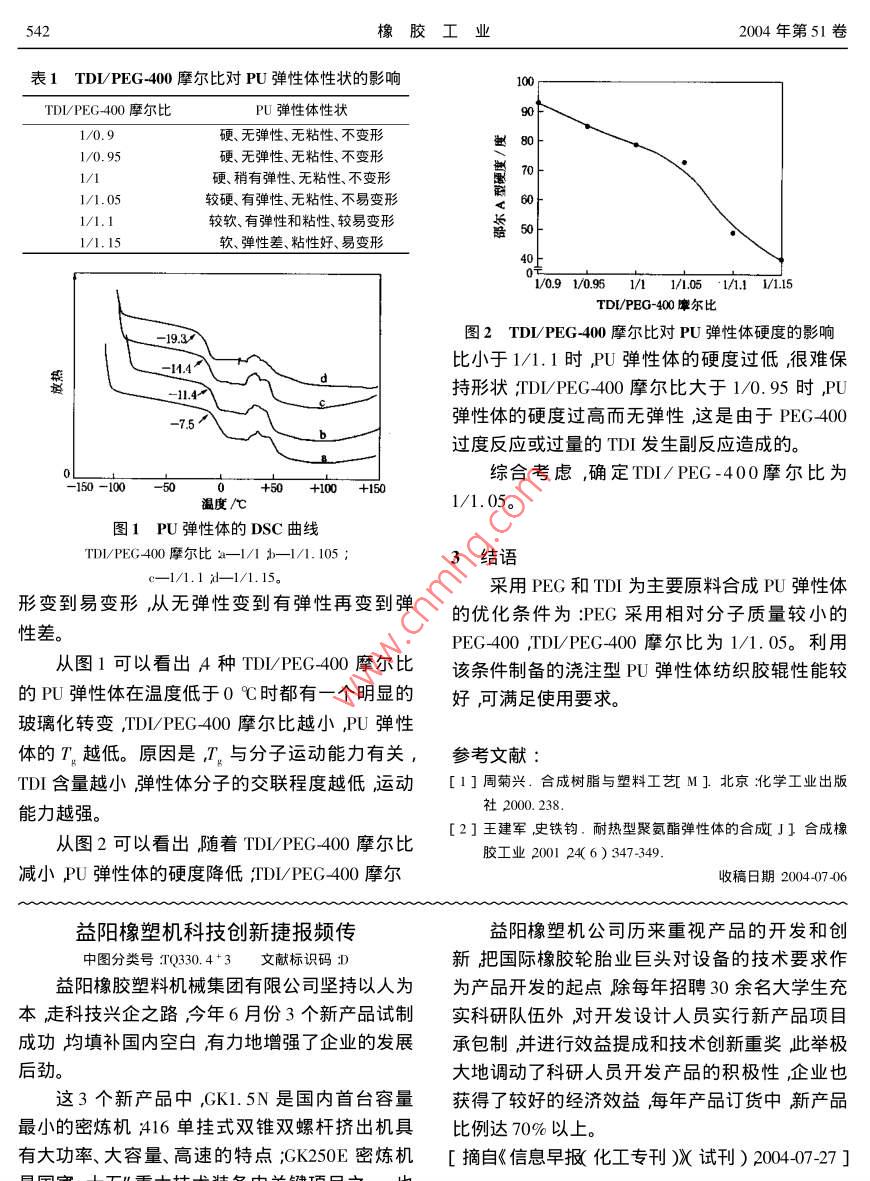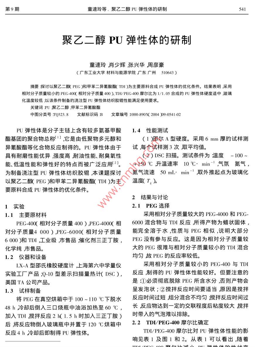 第9期童速玲等,聚乙二醇PU彈性體的研制41聚乙二醇PU彈性體的研制童速玲肖少輝漲興華周彥豪廣東工業(yè)大學材料與能源學院廣東廣州510643)摘要探討以聚乙二釀PG)和甲苯二異氰酸釀(TD)為主要原料合成PU彈性體的優(yōu)化條件。結(jié)果表明采用相對分子質(zhì)量較小的PEG40∝相對分子質(zhì)量400) TDLAPEG400摩爾比為1/1.05合成的PU彈性體硬度適中玻璃化溫度較低以該條件制備的澆注型PU彈性體紡織膠輥性能滿足使用要求。關(guān)鍵詞U聚乙二醇呷苯二異氰酸酯中圖分類號Q323.8文獻標識碼B文章編號1000890X(2004)94054102PU彈性體是分子主鏈上含有較多氨基甲酸1.4性能測試酯基團的聚合物總稱,它是由低聚物多元醇和(1)邵爾A型硬度。采用6mm厚的試樣測異氰酸酯等化合物反應(yīng)制得的。PU彈性體由于試每個試樣測3次取平均值。具有耐曆性能優(yōu)異強度高,耐油性能、耐臭氧性(2)DSC掃描。測試條件為溫度-100~能、低溫性能和彈性好的特點而被廣泛應(yīng)用+150℃升溫速率10℃·min氣氛氮氣為制備澆注型PU彈性體紡織膠輥本課題探討氮氣流速50ml·min取外推起點為玻璃化以聚乙二釀PEG和甲苯二異氰酸酯TDI)為主溫度7要原料合成PU彈性體的優(yōu)化條件。2結(jié)果與討論1實驗2.1PEG選擇11主要原材料采用相對分子質(zhì)量較大的PEG4000和PEG-PEG408相對分子質(zhì)量400)PEC400(相6000混合物與TD反應(yīng)所得產(chǎn)物為蠟狀固體,對分子質(zhì)量4000),EG-6000相對分子質(zhì)量能完全溶于水性質(zhì)與PEG相似說明大部分6000和TD江工業(yè)級市售品催化劑三正丁胺,PEG沒有參與反應(yīng)。這是因為相對分子質(zhì)量較化學純市售品大的PEG很難與相對分子質(zhì)量較小的TD混合1.2儀器和設(shè)備均勻故PEG的反應(yīng)率較低。LX-A型邵氏橡膠硬度計,上海第六中學量儀采用相對分子質(zhì)量較小的PEG400與TD實驗工廠產(chǎn)品沒Q-10型差示掃描量熱計(DsC),反應(yīng),制得的PU彈性體性能較好。但要注意的美國TA公司產(chǎn)品是①必須徹底脫除PEG所含水分否則產(chǎn)物會1.3試樣制備呈發(fā)泡狀;②攪拌反應(yīng)時間要適當原因是攪拌將PEC在真空烘箱中于100-110℃下脫水反應(yīng)時間過短組分混合不均勻攪拌反應(yīng)時間過48h冷卻后倒入三口燒瓶中油浴加熱至60℃,長反應(yīng)物達到一定的交聯(lián)程度后粘度較大攪拌加入TDI攪拌反應(yīng)2H(1.5h時加入三正丁胺)時帶入的氣泡難以排除。后將反應(yīng)物倒入玻璃瓶中并置于120℃烘箱中2.2 TDIPEG400摩爾比確定反應(yīng)4h冷卻后即制得PU彈性體。TDI/PEG400摩爾比對PU彈性體性能的影響見表1及圖1和2。從表1可以看出,隨著橡膠工業(yè)2004年第51卷表1 TDIPEG-400摩爾比對PU彈性體性狀的影響TDL PEG400摩爾比PU彈性體性狀1/0.9硬、無彈性、無粘性、不變形硬、無彈性、無粘性、不變形稍有彈性、無粘性、不變形l/L.0較硬、有彈性、無粘性、不易變形較軟、有彈性和粘性、較易變形l/1.I軟、彈性差、粘性好、易變形TDL/PEG-400摩爾比圖2 TDI PEG-400摩爾比對PU彈性體硬度的影響比小于1/1.1時PU彈性體的硬度過低很難保袋持形狀霪 TDU PEG400摩爾比大于1/0.95時PU彈性體的硬度過高而無彈性這是由于PEG400過度反應(yīng)或過量的TD發(fā)生副反應(yīng)造成的。綜合考慮,確定TD/PEG-400摩爾比為+50+100+150溫度圖1PU彈性體的DSC曲線TD/PEG400摩爾比x-1/1-1/1.1053結(jié)語c-1/1.11/1.15采用PEG和TD為主要原料合成PU彈性體形變到易變形從無彈性變到有彈性再變到彈的優(yōu)化條件為PEG采用相對分子質(zhì)量較小的性差。PEG400, TDI PEG400摩爾比為1/1.05。利用從圖1可以看岀A種TDL/PEG400摩爾比該條件制備的澆注型PU彈性體紡織膠輥性能較的PU彈性體在溫度低于0℃時都有一個明顯的好可滿足使用要求。玻璃化轉(zhuǎn)變, TDI/PEG400摩爾比越小,PU彈性體的T越低。原因是T與分子運動能力有關(guān),參考文獻TDI含量越小彈性體分子的交聯(lián)程度越低運動「1]周菊興·合成樹脂與塑料工藝M]北京北學工業(yè)出版能力越強社20002382]王建軍史鐵鈞.耐熱型聚氨酯彈性體的合成J]合成橡從圖2可以看出隨著 TDI PEG400摩爾比膠工業(yè)2001246)347-349減小PU彈性體的硬度降低 TDL/PEG400摩爾收稿日期20040706w-w-----益陽橡塑機科技創(chuàng)新捷報頻傳益陽橡塑機公司歷來重視產(chǎn)品的開發(fā)和創(chuàng)中圖分類號TQ330.4+3文獻標識碼新把國際橡膠輪胎業(yè)巨頭對設(shè)備的技術(shù)要求作益陽橡膠塑料機械集團有限公司堅持以人為為產(chǎn)品開發(fā)的起點除毎年招聘30余名大學生充本走科技興企之路今年6月份3個新產(chǎn)品試制實科研隊伍外對開發(fā)設(shè)計人員實行新產(chǎn)品項目成功均填補國內(nèi)空白有力地增強了企業(yè)的發(fā)展承包制并進行效益提成和技術(shù)創(chuàng)新重獎此舉極后勁。大地調(diào)動了科研人員開發(fā)產(chǎn)品的積極性企業(yè)也這3個新產(chǎn)品中GK1.SN是國內(nèi)首臺容量獲得了較好的經(jīng)濟效益每年產(chǎn)品訂貨中新產(chǎn)品最小的密煉機;16單掛式雙錐雙螺桿擠出機具比例達70%以上有大功率、大容量、高速的特點K25E密煉機[摘自《信息早報化工專刊)試刊)200407-27]