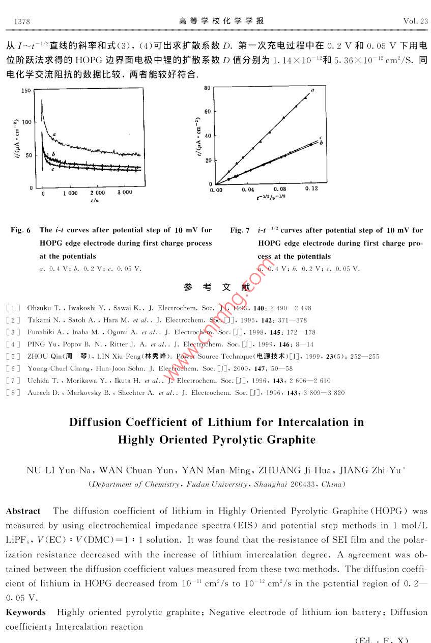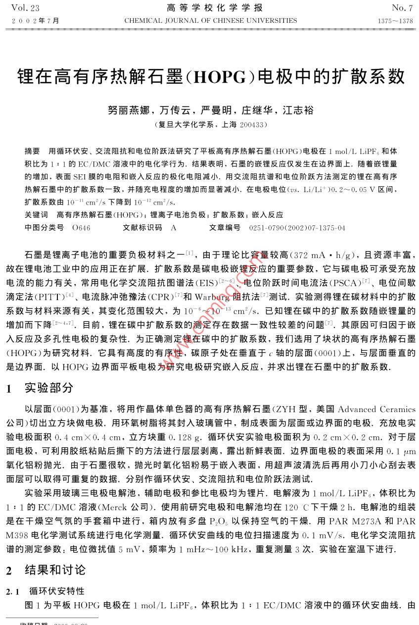 Vol.23高等學?;瘜W學報No. 72002年7月CHEMICAL JOURNAL OF CHINESE UNIVERSITIES1375~ 1378鋰在高有序熱解石墨(HOPG)電極中的擴散系數(shù)努麗燕娜,萬傳云,嚴曼明,莊繼華,江志裕(復旦大學化學系,上海200433)摘要用循環(huán)伏安、交流阻抗和電位階躍法研究了平板高有序熱解石墨(HOPG)電極在1mol/LLiPF。和體積比為1: 1的EC/DMC溶液中的電化學行為.結果表明,石墨的嵌鋰反應僅發(fā)生在邊界面上.隨著嵌鋰量的增加,表面SEI膜的電阻和嵌入反應的極化電阻減小.用交流阻抗譜和電位階躍方法測定的鋰在高有序熱解石墨中的擴散系數(shù)一致,并隨充電程度的增加而顯著減小,在電極電位(vs. Li/Li+ )0.2~0.05 V區(qū)間,擴散系數(shù)由10- "crm/s下降到10- -12 cm*/s.關鍵詞高有序熱解石 墨(HOPG);鋰離子電池負極;擴散系數(shù);嵌入反應中圖分類號O646文獻標識碼A文章編號0251-0790( 2002)07- 1375-04 :石墨是鋰離子電池的重要負極材料之一口,由于理論比容量較高(372 mA●h/g),且資源豐富,故在鋰電池工業(yè)中的應用正在擴展.擴散系數(shù)是碳電極嵌鋰反應的重要參數(shù),它與碳電極可承受充放電流的能力有關,常用電化學交流阻抗圖譜法(EIS)[2~-6]、電位階躍時間電流法(PSCA)P、電位間歇滴定法(PITT)[4、電流脈沖弛豫法(CPR)[7I和Warburg阻抗法2測試,實驗測得鋰在碳材料中的擴散系數(shù)與材料來源有關,其變化范圍較大,為10-°~10-13cm2/s.已知鋰在碳中的擴散系數(shù)隨嵌鋰量的增加而下降(2~4.7].目前,鋰在碳中擴散系數(shù)的測定存在數(shù)據(jù)一致性較差的問題口.其原因可歸因于嵌入反應及多孔性電極的復雜性.為正確測定鋰在碳中的擴散系數(shù),我們選用了塊狀的高有序熱解石墨(HOPG)為研究材料.它具有高度的有序性,碳原子處在垂直于c軸的層面(0001)上,與層面垂直的是邊界面,以HOPG邊界面平板電極為研究電極研究嵌入反應,并求出鋰在石墨中的擴散系數(shù).1實驗部分以層面(0001)為基準,將用作晶體單色器的高有序熱解石墨(ZYH型,美國Advanced Ceramics公司)切出立方塊做電極.用環(huán)氧樹脂將其封入玻璃管中,制成表面為層面或邊界面的電極.充放電實驗電極面積0.4 cmX0.4 cm,立方塊重0.128g.循環(huán)伏安實驗電極面積為0.2 cmX0.2 cm.對于層面電極,可利用膠紙粘貼后撕下的方法進行層層剝離,露出新鮮表面.邊界面電極的表面采用0.1 μm氧化鋁粉拋光.由于石墨很軟,拋光時氧化鋁粉易于嵌入表面,用超聲波清洗后再用小刀小心刮去表面層可以取得可重復的數(shù)據(jù).分別作循環(huán)伏安、交流阻抗和電位階躍法測試.實驗采用玻璃三電極電解池,輔助電極和參比電極均為鋰片.電解液為1 mol/L LiPF。,體積比為1:1的EC/DMC溶液(Merck公司).使用前研究電極和電解池均在120C下干燥2h.電解池的組裝是在干燥空氣氛的手套箱中進行,箱內放有多盤P2Os以保持空氣的干燥、用PAR M273A和PARM398電化學測試系統(tǒng)進行電化學測量.循環(huán)伏安曲線的電位掃描速度為0.1mV/s.電化學交流阻抗譜的測定參數(shù):電位微擾值5 mV,頻率為1 mHz~100kHz,重復測量3次.實驗在室溫下進行.2結果和討論2.1循環(huán)伏安特性圖1為平板HOPG電極在1mol/LLiPF。,體積比為1:1EC/DMC溶液中的循環(huán)伏安曲線.由1376高等學?;瘜W學報Vol.23圖1曲線a可見,第一次負向電位掃描時在0.5V左右有一電流峰,它對應于電解液的陰極分解和生成固體電解質界面層(SEI).電位進-步降低時,生成鋰碳嵌合物的陰極電流逐漸增加.當電位回掃時鋰碳嵌合物陽極氧化,出現(xiàn)陽極電極峰.在第二次電位掃描時,0.5 V的陰極電流峰消失,這可歸因于致密的固體電解質界面層阻止了溶液的分解.圖1曲線b是HOPG層面電極的循環(huán)伏安曲線,其氧化還原電流很小,與曲線a相比電流可以忽略.因此石墨的陰極嵌鋰反應僅發(fā)生在邊界面上.2. ot0. 20.0個2. 。乏-0.22/-0.4S 0.-0.60.4 t-0.80.00.40.81.1.60.30.6 0.9 1.2E/V(0s. 1/Li+)Fig. 1 Cyelic voltammograms of the HOPG edge plane Fig. 2 The relationship between working potential (a )electrode(a) and HOPG basal plane electrode(b)and open circuit potential (b) with the charge1 mol/L LiPF。,1 : 1 EC/DMC solution; v=0. 1 mV/amount y in Li,Co for a HOPG edge plane elec-s, A=0. 04 cm*,trode2.2生成鋰碳化合物的開路電極電位高有序熱解石墨邊界面電極的陰極充電過程包括生成固體電解質界面層和嵌鋰電極反應兩部分.圖2為平板邊界面電極以50μA/em2陰極充-定電量后的工作電位值(曲線a)和相應的開路24h后電位的穩(wěn)定值(曲線6).圖2每個點均由一個新電極測得.充電電量用Li,C中的y值表示.開路電位反映了電極的熱力學性能.從圖2可知,在y為0~0.1區(qū)間電極電位下降很快.這時耗去的電量用于溶液分解和生成固體電解質界面層[8].在y=0.1~0.4區(qū)間電極電位下降率減小,相應于成膜過程與嵌入反應共存階段.當y>0.4后開路電極電位隨充電量的變化緩慢,且出現(xiàn)一些平段.相應于生成不同中間階段的嵌入化合物D1.在y=1.2時,開路電位達到0 V,說明電極已全部生成LiC。,并開始析出金屬鋰.2.3鋰在高有序石 墨中的擴散系數(shù)2.3.1 電化學交流阻抗譜法 以50 μA/em2對高有序石墨邊界層面電極進行陰極充電,當充電到一定電位后穩(wěn)定24 h,然后測量電極的交流阻抗,依24次逐個進行測試.圖3為在第-次充電過程中測得20的電化學交流阻抗復平面圖.圖3曲線a相應電極16電位為2. 1 V, y=0,即未充電時的情況.曲線6相應的電位為0.8 V,處于生成固體電解質