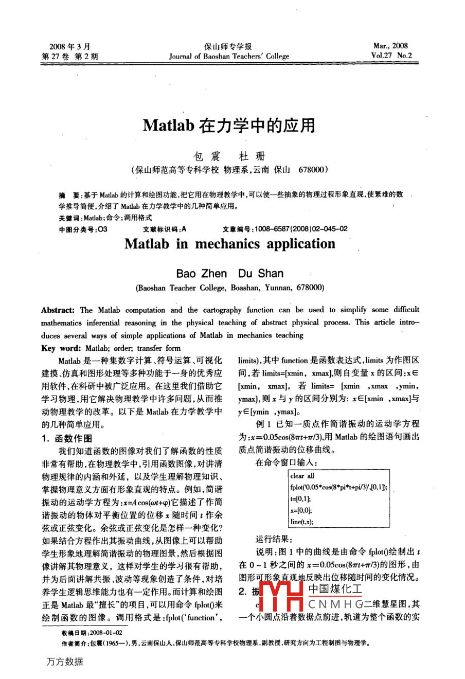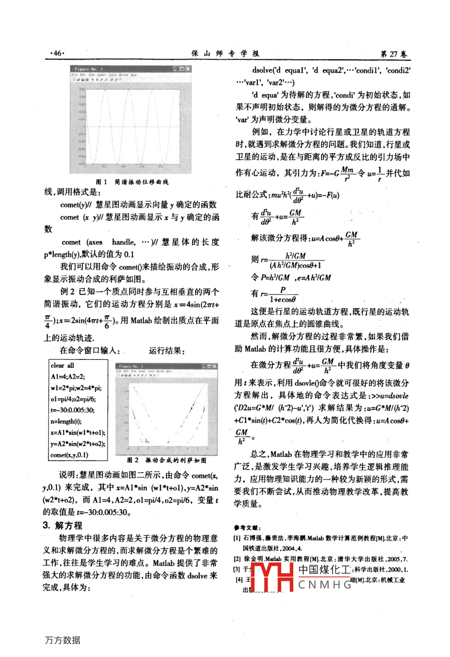2008年3月保山師專學(xué)報Mar.2008第27卷第2期Journal of Baoshan Teachers'CollegeVol 27 No. 2Matlab在力學(xué)中的應(yīng)用包震杜珊(保山師范高等專科學(xué)校物理系,云南保山678000)摘要:基于 Matlab的計算和繪圖功能把它用在物理教學(xué)中,可以使一些抽象的物理過程形象直觀使繁難的數(shù)學(xué)推導(dǎo)簡便,介紹了Maab在力學(xué)教學(xué)中的幾種簡單應(yīng)用。關(guān)鍵詞:Maab;命令;調(diào)用格式中圖分類號:O3文獻標識碼:A文章編號:10086587(2008)0204502Matlab in mechanics applicationBao zhen Du shan(Baoshan Teacher Collelege, Bashan, Yunnan, 678000Abstract: The Matlab computation and the cartography function can be used to simplify some difficultmathematics inferential reasoning in the physical teaching of abstract physical process. This article intro-duces several ways of simple applications of Matlab in mechanics teachingKey word: Matlab; order; transfer formMatlab是一種集數(shù)字計算、符號運算、可視化 limits,其中 function是函數(shù)表達式,lmts為作圖區(qū)建摸、仿真和圖形處理等多種功能于一身的優(yōu)秀應(yīng)間,若 limits=xmin,xmax]則自變量x的區(qū)間x∈用軟件,在科研中被廣泛應(yīng)用。在這里我們借助它[ xmin,xmax],若 limits=[xmin學(xué)習(xí)物理,用它解決物理教學(xué)中許多問題,從而推ymax],則x與y的區(qū)間分別為:x∈[min,xmax與動物理教學(xué)的改革。以下是 Matlab在力學(xué)教學(xué)中y∈ymin,ymax的幾種簡單應(yīng)用。例1已知一質(zhì)點作簡諧振動的運動學(xué)方程1.函數(shù)作圖為:x=0.05c05(8丌t+m/3),用 Matlab的繪圖語句畫出我們知道函數(shù)的圖像對我們了解函數(shù)的性質(zhì)質(zhì)點簡諧振動的位移曲線非常有幫助,在物理教學(xué)中,引用函數(shù)圖像,對講清在命令窗口輸入物理規(guī)律的內(nèi)涵和外延,以及學(xué)生理解物理知識掌握物理意義方面有形象直觀的特點。例如,簡諧fplot(0.05cs(8°pi·t+pi3y0,1D振動的運動學(xué)方程為:x= A cos(ot+q)它描述了作簡0,1k諧振動的物體對平衡位置的位移x隨時間t作余x=[00弦或正弦變化。余弦或正弦變化是怎樣一種變化如果結(jié)合方程作出其振動曲線,從圖像上可以幫助運行結(jié)果:學(xué)生形象地理解簡諧振動的物理圖景,然后根據(jù)圖說明:圖1中的曲線是由命令印lt0繪制出t像講解其物理意義,這樣對學(xué)生的學(xué)習(xí)很有幫助,在0-1秒之間的x=0.056c68m+m3)的圖形,由并為后面講解共振、波動等現(xiàn)象創(chuàng)造了條件,對培圖形可形象直觀地反映出位移隨時間的變化情況。養(yǎng)學(xué)生邏輯思維能力也有一定作用。而計算和繪圖2.振中國煤化工正是 Matlab最“擅長”的項目,可以用命令flot0來CNMHG二維慧星圖,其繪制函數(shù)的圖像。調(diào)用格式是: fplot( function',一個小圓點沿著數(shù)據(jù)點前進軌道為整個函數(shù)的實收稿日期:2008-01-02作者簡介:包震(1965—)男,云南保山人保山師范高等專科學(xué)校物理系副教授研究方向為工程制圖與物理學(xué)。保山師專學(xué)報第27卷dsolve('d equal, 'd equa2, ""condil','condi2'd equa'為待解的方程,cond為初始狀態(tài),如果不聲明初始狀態(tài),則解得的為微分方程的通解。var為聲明微分變量。例如,在力學(xué)中討論行星或衛(wèi)星的軌道方程時就遇到求解微分方程的問題。我們知道行星或衛(wèi)星的運動,是在與距離的平方成反比的引力場中圖1簡諧搛動位移曲線作有心運動,其引力為F=M令并代如線,調(diào)用格式是比耐公式:comet)∥慧星圖動畫顯示向量y確定的函數(shù)comet(xy慧星圖動畫顯示x與y確定的函數(shù)comet( axes handle,…慧星體的長度解該微分方程得:u=Acos+p+ ength(y),默認的值為0則我們可以用命令come0來描繪振動的合成,形(Ah/ GM)cos0+1象顯示振動合成的利薩如圖。令PhGM,e=Ah3GM例2已知一個質(zhì)點同時參與互相垂直的兩個簡諧振動,它們的運動方程分別是x=4sn(2mt+這便是行星的運動軌道方程,既行星的運動軌;x=2im4n+6)用M繪制出質(zhì)點在平面道是原點在焦點上的圓錐曲線。上的運動軌跡然而解微分方程的過程非常繁,如果我們借在命令窗口輸入:運行結(jié)果:助 Matlab的計算功能且很方便,具體操作是在微分方程+u中我們將角度變量Al=4;A2=2;wl=2用t來表示,利用dove0命令就可很好的將該微分方程解出,具體地的命令表達式是:>u= dsovle-300.005:30CD2u=G*M(h2)d2)求解結(jié)果為:u=C*M(h2)+Cl*sin()+C2*cos(),再人為簡化代換得:u=Acos0+x=A1·sin(w+ol);y=A2·sin(w2*t+2comet(x,y,0.I)總之, Matlab在物理學(xué)習(xí)和教學(xué)中的應(yīng)用非常圖2振動合威的利薩如圖廣泛,是激發(fā)學(xué)生學(xué)習(xí)興趣,培養(yǎng)學(xué)生邏輯推理能說明:慧星圖動畫如圖二所示,由命令come力,應(yīng)用物理知識能力的一種較為新穎的形式需y,0)來完成,其中x=Al·sin(w1t+l,y=A2°in要我們不斷嘗試,從而推動物理教學(xué)改革提高教而A1=4,A2=2,ol=pi變量學(xué)質(zhì)量的取值是t=-30.0005:30。3.解方程參考文獻:物理學(xué)中很多內(nèi)容是關(guān)于微分方程的物理意[石博強藤貴法李海鵬Malb數(shù)學(xué)計算范例教程M北京:中義和求解微分方程的,而求解微分方程是個繁難的國鐵道出版杜,2004,4工作往往是學(xué)生學(xué)習(xí)的難點。Mlb提供了非常徐金明M寒聞數(shù)程圖北京;清華大學(xué)出版址20,強大的求解微分方程的功能,由命令函數(shù) dsolve來3]于中國煤化工:科學(xué)出版社,01完