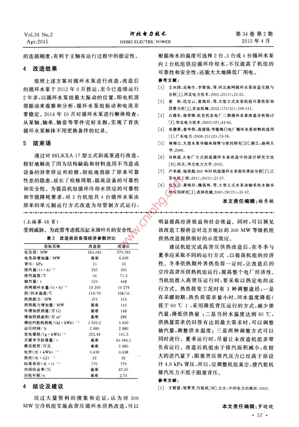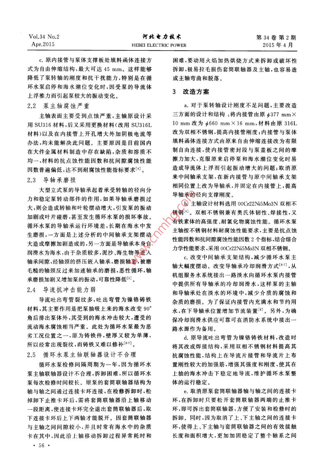 Vol.34 No.2河北電力技術(shù)第34卷第2期Apr.2015HEBEI ELECTRIC POWER2015年4月國產(chǎn)600MW機組循環(huán)水泵改造分析楊群發(fā)1,李智強?(1.廣東珠海金灣發(fā)電公司,廣東珠海519050;2.河北邯峰發(fā)電有限責任公司,河北 邯鄲056200)摘要:針對某公司國產(chǎn)600 MW機組循環(huán)水泵可靠性低的問題,從循環(huán)水泵的結(jié)構(gòu)、材料、設(shè)計等方面進行分析,認為循環(huán)水泵轉(zhuǎn)軸設(shè)計剛度不足、泵主軸被腐蝕、導(dǎo)軸承磨損等是造成循環(huán)水泵可靠性低的原因,提出改造方案,并說明改造效果。關(guān)鍵詞: 600 MW機組;循環(huán)水泵;可靠性中圖分類號:TK264.11文獻標志碼:B文章編號:1001 - 9898(2015)02 - 0055 -03Analysis on Renovation for Circulating Pump of Domestically- made600 MW Power Generation UnitYang Qunfa' ,Li Zhiqiang?(1.Guangdong Zhuhai Jinwan Power Company Limited, Zhuhai 519050 ,China;2.Hebei Hanfeng Company Limited, Handan 056200 ,China)Abstract: Aiming at the problem of circulating pump lower reliability,after analysis on the structure, material and system of theequipment,considers that the low relibility by less design rigidity of circulating pump shaft,corrosion of the chief axis , bearingwearing are the main reasons, then lays down the reformation plan,illustrates the reformation results.Key words:600 MW unit;circulating pump; reliability循環(huán)水泵是發(fā)電廠中流量最大的水泵,其主2原因分析要作用是向汽輪機凝汽器供給冷卻水,用以冷卻汽輪機排汽。一旦出現(xiàn)循環(huán)水中斷,將使機組被2.1 泵轉(zhuǎn)軸設(shè)計剛度不足迫停運。某公司2臺超臨界600MW機組,每臺.內(nèi)接管采用自由伸縮連接和開放式中間軸承機組配置2臺循環(huán)水泵,設(shè)備為某廠生產(chǎn)的支架[B],該設(shè)計主要有3方面的不足。88LKXA-17型立式斜流泵,循環(huán)水系統(tǒng)采用單元a.內(nèi)接管為φ377 mmX10 mm不銹鋼管,設(shè)制運行。循環(huán)水泵采用小內(nèi)接管加中間軸承支架計功能主要是作為保護水泵主軸的套管,忽略了形式結(jié)構(gòu),主軸為316不銹鋼外加保護套管,全長作為輔助功能的中間軸承支架作用,而作為中間約12m,由3根主軸通過聯(lián)軸器相連,4個導(dǎo)向軸軸承支架明顯偏小和單薄,支撐強度不足。承,其中一個為中間支架軸承,軸承潤滑和冷卻采b.由于中間軸承支架外圈與泵簡體設(shè)計為有用海水自潤滑方式。0.3~0.40 mm間隙的松裝結(jié)構(gòu),泵軸每轉(zhuǎn)- - 圈就1存在的問題對兩結(jié)合面一個敲擊作用力,極易造成中間軸承支架出現(xiàn)裂紋和損壞。另外中間軸承支架外圈與由于該泵內(nèi)接管采用自由伸縮連接和中間軸泵簡體材質(zhì)差異,加上海水的長期腐蝕作用,泵簡承支架結(jié)構(gòu),造成振動較大,進而引發(fā)諸多問題:出體與中間軸承支架的間隙越來越大,中間軸承支現(xiàn)過2次泵體損壞、主軸彎曲事故,檢修間隔周期架擺動也越來越大,最終導(dǎo)致導(dǎo)軸承磨損增大,隨非常短,每次解體檢修中間軸承支架均出現(xiàn)裂紋甚著軸承磨損增大,引起泵運行振動逐漸上升,進而.至斷裂、導(dǎo)軸承嚴重磨損、主軸腐蝕等現(xiàn)象1[12]。影響泵運行的可靠性。收稿日期:2014-12- 29作者簡介:楊群發(fā)(1967-).男.高級工程師,主要從事發(fā)電生產(chǎn)管理.研究工作。55●Vol.34 No.2河北電力技術(shù)第34卷第2期Apr.2015HEBEI ELECTRIC POWER2015年4月.c.原內(nèi)接管與泵體支撐板處填料函體連接方困難,要動用火焰加熱烘燒方式來拆卸或破壞性式為自由伸縮結(jié)構(gòu),最大可達45 mm。這樣能夠拆卸,極易拉毛損傷套簡聯(lián)軸器及主軸,也容易造降低了泵轉(zhuǎn)軸的剛度和抗干擾能力,特別是在循.成主軸彎曲和脫落。環(huán)水泵啟停和海水潮位變化時,因受泵的導(dǎo)流體3改造方案上浮推力而引起泵較大的振動變化。2.2泵主軸腐蝕嚴重a.對于泵轉(zhuǎn)軸設(shè)計剛度不足問題,主要改造主軸表面主要受到點蝕嚴重,主軸原設(shè)計采三方面的設(shè)計和結(jié)構(gòu):將內(nèi)接管由原φ377mmX用SU316材料,后又采用更換材料(改用SU316L10mm改為φ660mmX16mm,材料由原316L材料)以及在內(nèi)接管上開孔增大外加陰極電流等改為雙相不銹鋼,提高內(nèi)接管剛度;內(nèi)接管與泵體辦法,均未能解決此問題。主要原因是目前國內(nèi)填料函體連接方式由原來自由伸縮連接改為有限在大件金屬材料制造中存在缺陷,雜質(zhì)和溶質(zhì)不制自由連接,使內(nèi)接管密封段與泵蓋板之間的摩均一,材料的抗點蝕性能因數(shù)和抗間隙腐蝕性能擦力加大,克服原來啟停泵和海水潮位變化時易因數(shù)普遍偏低,達不到耐腐蝕性能指標要求4。造成導(dǎo)流體上浮而引起振動增大的問題;取消原來中間軸承支架,在新內(nèi)接管與原中間軸承支架2.3 導(dǎo)軸承磨損大型立式泵的導(dǎo)軸承起著承受轉(zhuǎn)軸的徑向分相同位置上改為導(dǎo)軸承,并固定在內(nèi)接管上,提高力和穩(wěn)定泵轉(zhuǎn)動部件的作用,如果導(dǎo)軸承磨損過導(dǎo)軸承的徑向支撐剛度。b.主軸設(shè)計材料選用00Cr22Ni5Mo3N雙相不大,則會造成轉(zhuǎn)軸和葉輪擺動增大,引發(fā)泵的振動銹鋼4。雙相不銹鋼兼有奧氏體韌性、焊接性,又加劇或葉片碰磨,甚至發(fā)生循環(huán)水泵的損壞事故。有鐵素體的高強度、耐氯化物腐蝕性能。循環(huán)水泵循環(huán)水泵的導(dǎo)軸承運行環(huán)境