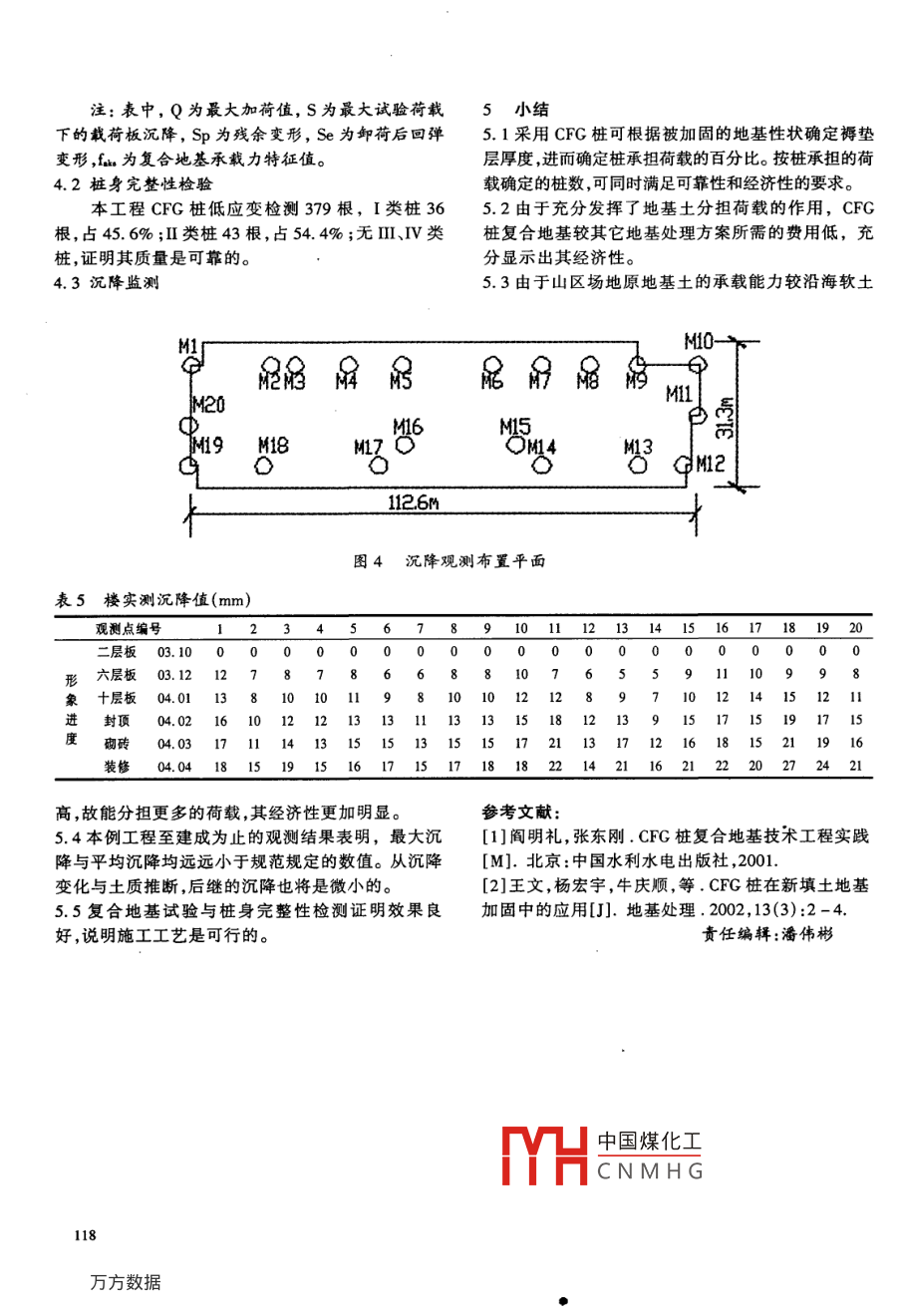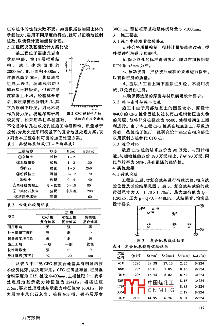 第4期閩西職業(yè)大學(xué)學(xué)報(bào)2004年12月Journal of Minxi Vocational CollegeDecember 2004CFG樁在山區(qū)的應(yīng)用張惇(福建工程學(xué)院土木工程系,福建福州3500070摘要:闡述CFG樁的簡(jiǎn)明工作原理。通過(guò)福建龍巖山區(qū)某工程的應(yīng)用實(shí)例說(shuō)明其設(shè)計(jì)概況、實(shí)施要點(diǎn)和應(yīng)用在山區(qū)非堅(jiān)硬地基中的應(yīng)用經(jīng)濟(jì)合理性,并列舉載荷板試驗(yàn)和沉降監(jiān)測(cè)等資料,證明其技術(shù)的可靠性。關(guān)鍵詞:非堅(jiān)硬地基;CFG樁;褥墊層厚度;復(fù)合地基;試驗(yàn)與監(jiān)測(cè)中圖分類號(hào):TU473.1文獻(xiàn)標(biāo)識(shí)碼:A文章編號(hào):1008-4797(2004)04-0116-03Application of CfG piles in mountain areasZHANG DunDept of Civil Engineering, Fujian University of Technology, Fuzhou, Fujian, 350007, China)Abstract: This article gives a brief introduction of the working principle of CFG piles and explains the design method and the main points of implementation through a project in Longyan mountainarea.Also, it illustrates the economic reasonability of application in non-hard foundation of mountainareas to verify the technology reliability by the experiment of loading and data of subsidence monitorKey words: non-hard foundation; CFG pile; cotton-padded mattress; compound foundation; experiment and monitor山區(qū)房屋傳統(tǒng)上多采用淺基礎(chǔ)。近年來(lái),由于房合(圖2),且大體為一直線。說(shuō)明圍壓對(duì)樁體強(qiáng)度和地產(chǎn)業(yè)的發(fā)展,山區(qū)小高層建筑數(shù)量激增,天然地基模量的影響不大。承載力不能滿足基底壓力要求的實(shí)例已較多見(jiàn)。常見(jiàn)的對(duì)策是采用樁基礎(chǔ)或復(fù)合地基等。實(shí)踐證明,對(duì)非堅(jiān)硬地層,適用的復(fù)合地基由于其成本低廉而更江影游受歡迎。尤其是CFG樁,對(duì)于地基土圍壓較低的山區(qū)場(chǎng)地更為適合。以下結(jié)合工程實(shí)例,介紹山區(qū)地基條件下,CFG樁的簡(jiǎn)單機(jī)理、相關(guān)工藝與實(shí)施效果,A,⊥ iii并展望其應(yīng)用前景。1CFG樁適合山區(qū)非堅(jiān)硬地基的機(jī)理圖1樁、土應(yīng)力對(duì)比隨褥墊層厚度變化示意CFG樁是水泥粉煤灰碎石樁的簡(jiǎn)稱。其樁體和表1樁承擔(dān)荷載占總荷載百分比如=Pp/P樁間土、褥墊層一起形成復(fù)合地基。設(shè)置褥墊層是荷載褥墊厚度(mm)CFG樁復(fù)合地基的一個(gè)核心技術(shù)。褥墊層本身是粒備注(P/kPa)20300狀材料墊層,改變其厚度可以調(diào)節(jié)樁土荷載分擔(dān)比652714樁長(zhǎng)2.25m,樁徑(圖1)。樁、土分擔(dān)總荷載的比例分別用p、表示。723226160mm,荷載板其中乙=Pp/P表示樁承擔(dān)總荷載百分比與褥墊層1.05m*1.05m厚度的關(guān)系(表1)。取CFG樁試樣進(jìn)行三軸壓縮試驗(yàn),結(jié)果表明在不同圍壓下的應(yīng)力應(yīng)變曲線基本重rv中國(guó)煤化工效果好的還是的主,[收稿日期]2004-CNMHG[作者簡(jiǎn)介]張惇(1967—),福建津州人,男,工程師,講師,從事教學(xué)及相應(yīng)工程實(shí)踐工作。CFG樁體的性能大致不變。如能根據(jù)被加固土體的300mm。預(yù)估筏形基礎(chǔ)最終沉降量S