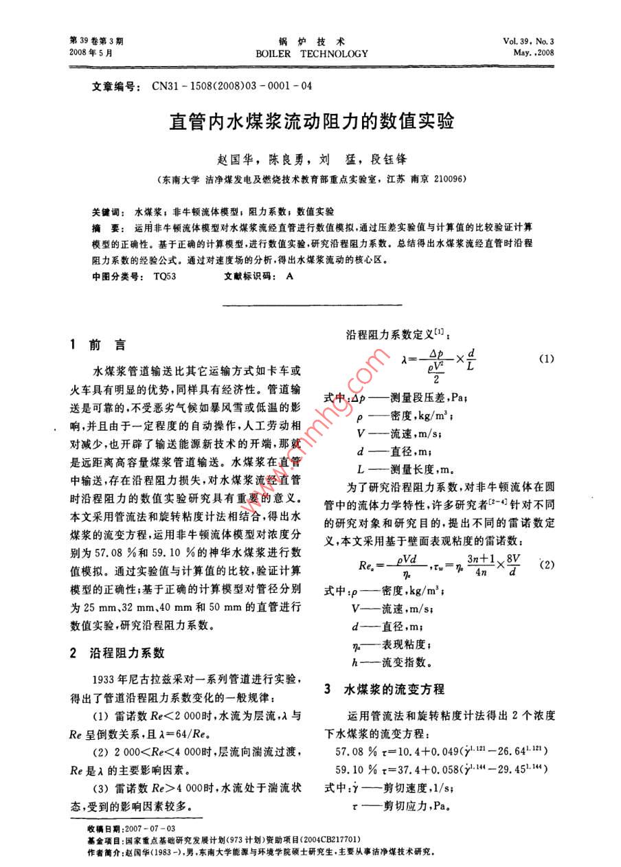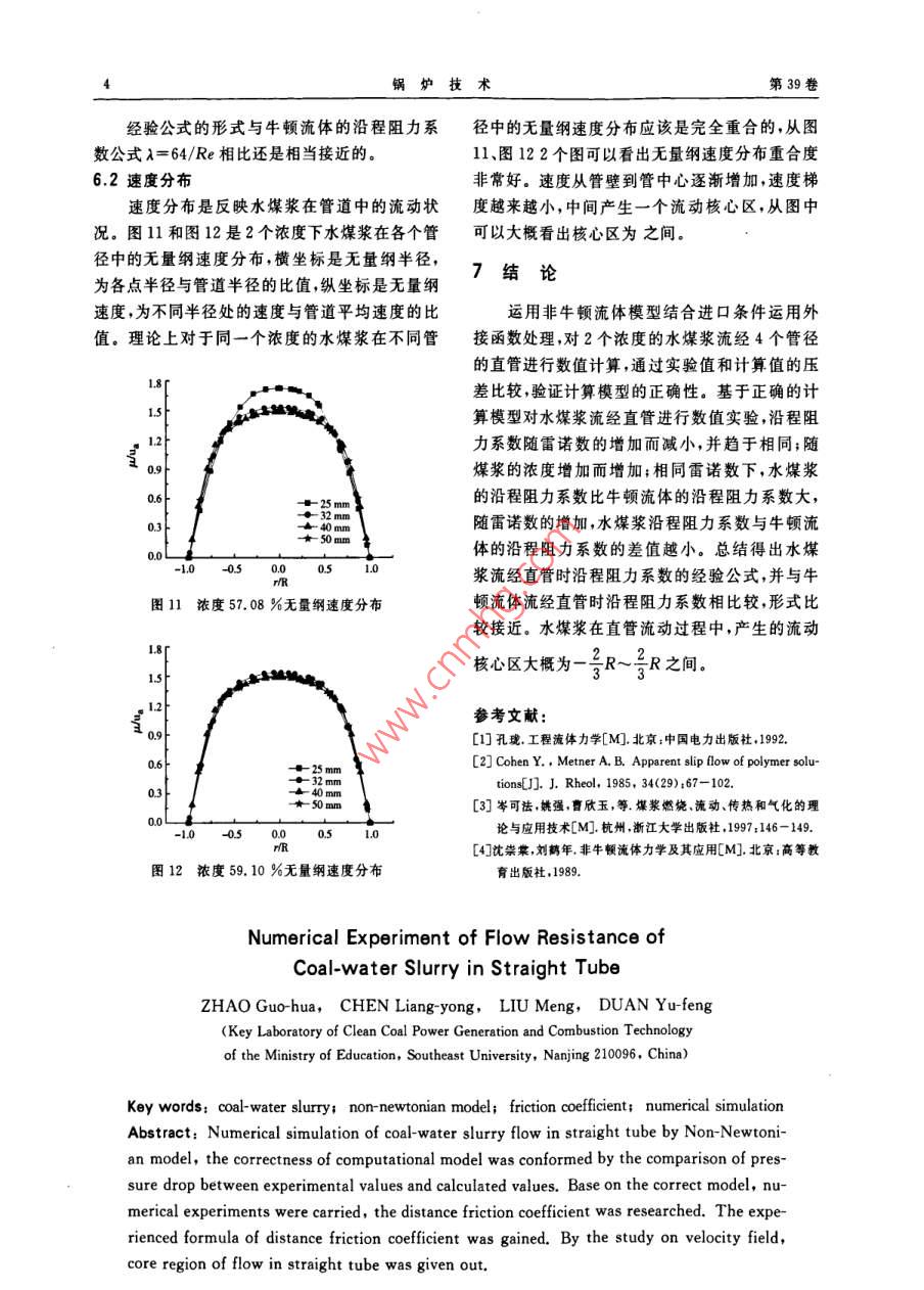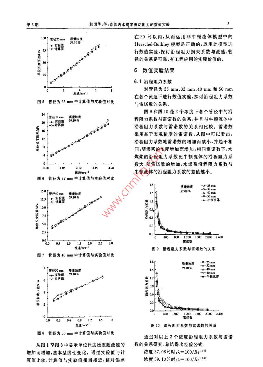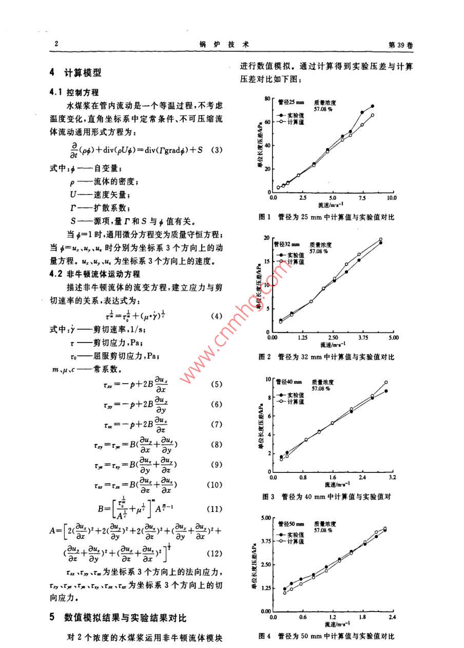 第39卷第3期鍋爐技術(shù)VoL, 39, No. 32008年5月BOILER TECHNOLOGY文章編號(hào):CN31-1508(2008)03-0001-04直管內(nèi)水煤漿流動(dòng)阻力的數(shù)值實(shí)驗(yàn)趙國華,陳良勇,劉猛,段鈺鋒(東南大學(xué)潔凈煤發(fā)電及燃燒技術(shù)教育部重點(diǎn)實(shí)驗(yàn)室,江蘇南京210096)關(guān)鍵詞:水煤漿;非牛頓流體模型;阻力系數(shù);數(shù)值實(shí)驗(yàn)摘要:運(yùn)用非牛頓流體模型對(duì)水煤漿流經(jīng)直管進(jìn)行數(shù)值模擬,通過壓差實(shí)驗(yàn)值與計(jì)算值的比較驗(yàn)證計(jì)算模型的正確性。基于正確的計(jì)算模型,進(jìn)行數(shù)值實(shí)驗(yàn)研究沿程阻力系數(shù)。總結(jié)得出水煤漿流經(jīng)直管時(shí)沿程阻力系數(shù)的經(jīng)驗(yàn)公式。通過對(duì)速度場的分析得出水煤漿流動(dòng)的核心區(qū)。中圖分類號(hào):TQ53文獻(xiàn)標(biāo)識(shí)碼:A沿程阻力系數(shù)定義[:1前言水煤漿管道輸送比其它運(yùn)輸方式如卡車或火車具有明顯的優(yōu)勢,同樣具有經(jīng)濟(jì)性。管道輸送是可靠的不受惡劣氣候如暴風(fēng)雪或低溫的影式中4D一測量段壓差Pa響,并且由于一定程度的自動(dòng)操作,人工勞動(dòng)相p—密度,kg/m2;V—流速,m/s;對(duì)減少,也開辟了輸送能源新技術(shù)的開端,那就是遠(yuǎn)距離高容量煤漿管道輸送。水煤漿在直管L—測量長度,m中輸送,存在沿程阻力損失,對(duì)水煤漿流經(jīng)直管為了研究沿程阻力系數(shù),對(duì)非牛頓流體在圓時(shí)沿程阻力的數(shù)值實(shí)驗(yàn)研究具有重要的意義。管中的流體力學(xué)特性,許多研究者針對(duì)不同本文采用管流法和旋轉(zhuǎn)粘度計(jì)法相結(jié)合得出水煤漿的流變方程,運(yùn)用非牛頓流體模型對(duì)濃度分的研究對(duì)象和研究目的,提出不同的雷諾數(shù)定義,本文采用基于壁面表觀粘度的雷諾數(shù):別為57.08%和59.10%的神華水煤漿進(jìn)行數(shù)值模擬。通過實(shí)驗(yàn)值與計(jì)算值的比較,驗(yàn)證計(jì)算a-,t=n+1×8(2)模型的正確性;基于正確的計(jì)算模型對(duì)管徑分別式中:P—密度kg/m為25mm32mm、40mm和50mm的直管進(jìn)行流速,m/s;數(shù)值實(shí)驗(yàn),研究沿程阻力系數(shù)。d—直徑2沿程阻力系數(shù)孫—表現(xiàn)粘度;h一流變指數(shù)1933年尼古拉茲采對(duì)一系列管道進(jìn)行實(shí)驗(yàn),得出了管道沿程阻力系數(shù)變化的一般規(guī)律:3水煤漿的流變方程(1)雷諾數(shù)Re<2000時(shí),水流為層流,λ與運(yùn)用管流法和旋轉(zhuǎn)粘度計(jì)法得出2個(gè)濃度Re呈倒數(shù)關(guān)系,且λ=64/Re。下水煤漿的流變方程:(2)20004000時(shí),水流處于湍流狀式中:Y—剪切速度態(tài),受到的影響因素較多。剪切應(yīng)力,Pa。收稿日期:2007-07-03基金項(xiàng)目:國家重點(diǎn)基礎(chǔ)研究發(fā)展計(jì)劃(973計(jì)劃)資助項(xiàng)目(2004CB217701)作者簡介:趙國華(1983-),男,東南大學(xué)能源與環(huán)境學(xué)院碩士研究生主要從事潔凈煤技術(shù)研究第39卷計(jì)算模型進(jìn)行數(shù)值模擬。通過計(jì)算得到實(shí)驗(yàn)壓差與計(jì)算壓差對(duì)比如下圖4.1控制方程水煤漿在管內(nèi)流動(dòng)是一個(gè)等溫過程,不考慮管徑25m量濃度溫度變化,直角坐標(biāo)系中定常條件、不可壓縮流實(shí)驗(yàn)值體流動(dòng)通用形式方程為:at pp)+div(pUs)=divgrad)+S(3)式中:—自變量P—流體的密度U—速度矢量r—擴(kuò)散系數(shù);s—源項(xiàng)量r和S與ψ值有關(guān)。圖1管徑為25mm中計(jì)算值與實(shí)驗(yàn)值對(duì)比當(dāng)∮=1時(shí),通用微分方程變?yōu)橘|(zhì)量守恒方程;當(dāng)=L、、時(shí)分別為坐標(biāo)系3個(gè)方向上的動(dòng)普徑32量方程。u2、42為坐標(biāo)系3個(gè)方向上的速度。154.2非牛頓流體運(yùn)動(dòng)方程描述非牛頓流體的流變方程,建立應(yīng)力與剪切速率的關(guān)系,表達(dá)式為:r2=+(py)式中:y—剪切速率,1/sr——剪切應(yīng)力,Pa;流速/m-1屈服剪切應(yīng)力,Pa;圖2管徑為32mm中計(jì)算值與實(shí)驗(yàn)值對(duì)比m、、c—常系數(shù)Tx=-p+2B 5管徑40質(zhì)量濃度Tx=-P+2B=x(6)r=r =B(2+-)BTn=tn=BO流速/m-13管徑為40mm中計(jì)算值與實(shí)驗(yàn)值對(duì)+uA-1(11)A=「2()2+2m2)2+2(y+(+ky+管徑50量濃度實(shí)驗(yàn)值+物y++2(12)出rx、r、r為坐標(biāo)系3個(gè)方向上的法向應(yīng)力rx、rs、rx、rs、ra、ra為坐標(biāo)系3個(gè)方向上的切向應(yīng)力5數(shù)值模擬結(jié)果與實(shí)驗(yàn)結(jié)果對(duì)比對(duì)2個(gè)濃度的水煤漿運(yùn)用非牛頓流體模塊圖4管徑為50mm中計(jì)算值與實(shí)驗(yàn)值對(duì)比第3期趙國華,等直管內(nèi)水煤漿流動(dòng)阻力的數(shù)值實(shí)驗(yàn)管徑25mm質(zhì)量濃度在20%以內(nèi),從而運(yùn)用非牛頓流體模型中的實(shí)驗(yàn)值Herschel- Bulkley模型是正確的,運(yùn)用此模型進(jìn)行數(shù)值實(shí)驗(yàn),探討沿程阻力損失系數(shù)與流速、管徑的關(guān)系是可靠、有工程應(yīng)用的實(shí)際價(jià)值的。6數(shù)值實(shí)驗(yàn)結(jié)果6.1沿程阻力系數(shù)對(duì)管徑為25mm、32mm、40mm和50mm在各個(gè)流速下進(jìn)行數(shù)值實(shí)驗(yàn),探討沿程阻力系數(shù)圖5管徑為25mm中計(jì)算值與實(shí)驗(yàn)值對(duì)比與雷諾數(shù)的關(guān)系。圖9和圖10是2個(gè)濃度下各個(gè)管徑