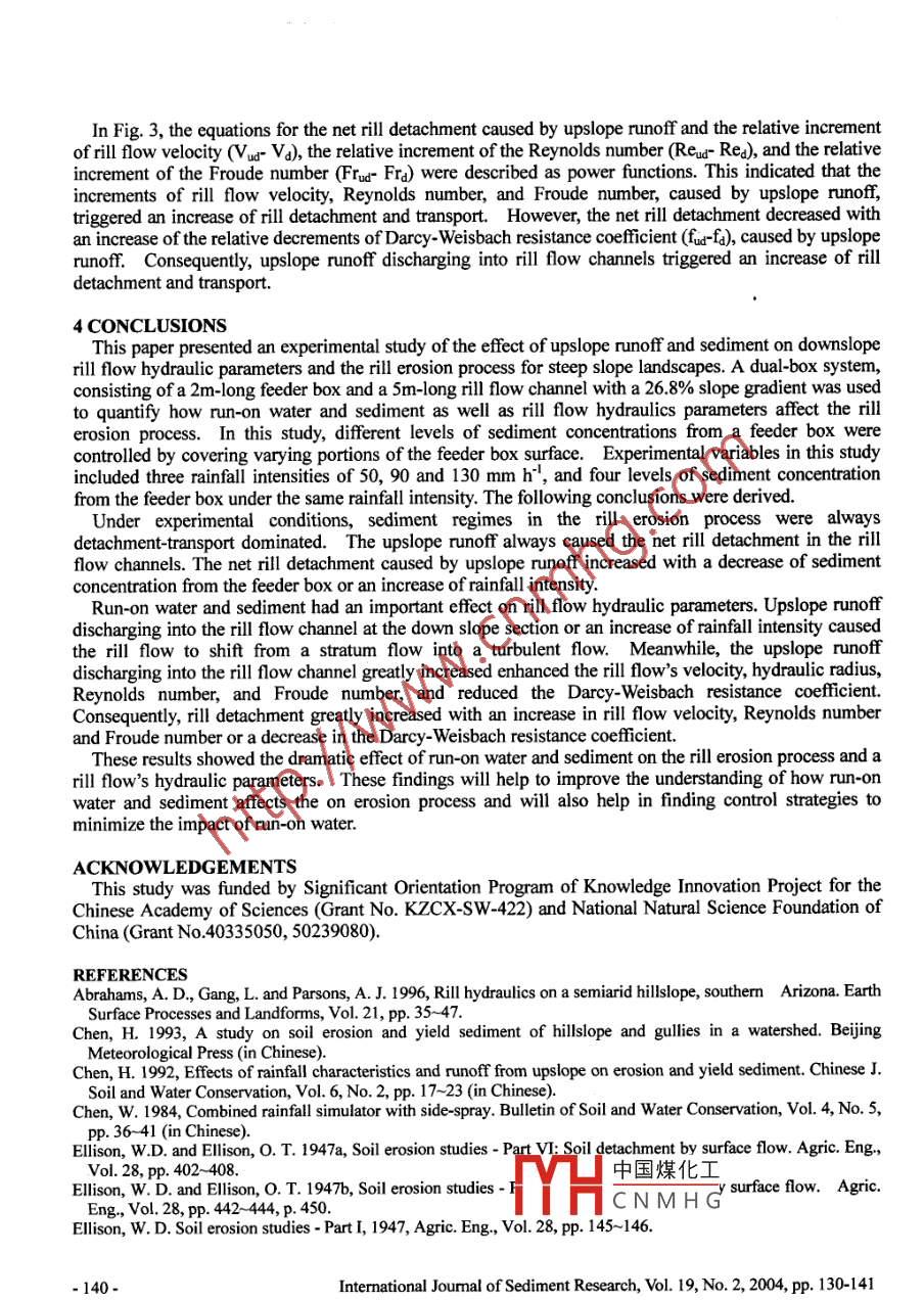 RILL EROSION PROCESS ANDRILL FLOW HYDRAULIC PARAMETERSFen-li ZHENG', Pei-qing XIAO2 and Xue-tian GAO'ABSTRACTIn the rill erosion process, run-on water and sediment from upslope areas, and rill flow hydraulicparameters have significant effects on sediment detachment and transport. However, there is a lackof data to quantify the effects of run-on water and sediment and rill flow hydraulic parameters on rillerosion process at steep hillslopes, especially in the Loess Plateau of China. A dual-box system,consisting of a 2-m-long feeder box and a 5-m-long test box with 26.8% slope gradient was used toquantify the effects of upslope runoff and sediment, and of rill flow hydraulic parameters on the rillerosion process. The results showed that detachment-transport was dominated in ril erosionprocesses; upslope runoff always caused the net rill detachment at the downslope rill flow channel,and the net rill detachment caused by upslope runoff increased with a decrease of runoff sedimentconcentration from the feeder box or an increase of rainfall intensity. Upslope runoff discharginginto the rill flow channel or an increase of rainfall intensity caused the rill flow to shift from astratum flow into a turbulent flow. Upslope runoff had an important effect on rill flow hydraulicparameters, such as rill flow velocity, hydraulic radius, Reynolds number, Froude number and theDarcy-Weisbach resistance coefficient. The net rill detachment caused by upslope runoff increasedas the relative increments of rill flow velocity, Reynolds number and Froude number caused byupslope runoff increased. In contrast, the net rill detachment decreased with an increase of therelative decrement of the Darcy- Weisbach resistance coefficient caused by upslope runoff. Thesefindings will help to improve the understanding of the effects of run-on water and sediment on theerosion process and to find control strategies to minimize the impact of run-on water.Key Words: Rill erosion process, Rill flow hydraulic parameters, Run-on water effects, The LoessPlateau of China1 INTRODUCTIONIn the rill erosion process, run- on water and sediment from the upslope area, and rill flow hydraulicparameters have significant effects on rill detachment and transport. However, there was few dataavailable to quantify the effects of run-on water and sediment as well as rill flow hydraulic parameters onthe rill erosion process at steep hillslopes, especially in the Loess Plateau of China. Therefore, it isnecessary to study the effects of upslope runoff and sediment and rill flow hydraulic parameters ondetachment and transport by rill flows.As compared to water flows in rivers and streams, the bed gradient of a rill flow is steeper, the flowdepth is shallower, and the channel shape is more irregular. It is necessary to determine whichparameters can be used to describe rill flow hydraulics and hydrodynamics. Moss et al.(1979) proposedthat the rill flow's basic mechanisms of erosion, transport, and deposition were similar to that of flows inriver channels. Therefore, the theories and methods for streams and rivers may be employed in studyingrill flows. The corresponding variables used to characterize flow dynamics, such as flow velocity,hydraulic radius, Reynolds number, Froude number, as well as the resistance coefficient, can be used tocharacterize rill flows.Several studies have been conducted to investigate the resistance coefficient of rill flows. Foster et al.1984) reported that the resistance cofficient was not greater than 0.5 for slope gradients of 1.7°0 to 5.16*,indicating that the resistance coefficient of rill flows did not vary greatly. However, Gilley et al. (GilleyResearch Prof, 2 Ph.D. Student and 3 Associate Prof, State KexI aharatnry nf Soil Frnein _and Dryland Farmingon Loess Plateaus, Institute of Soil and Water Conservation中國煤化工ces and Ministry ofWater Resources, Yangling, Shaanxi 712100, China), E-ml-rthwesterm Sci-TechCNM H G'University of Agriculture and Forestry, 26 Xinong Rd, YanglilNote: The original manuscript of this paper was received in May 2003. The revised version was received inMarch 2004. Discussion open until June 2005.-130-Intermational Journal of Sediment Research, Vol. 19, No. 2, 2004, pp. 130-141et al, 1990) proposed that when the Reynolds number was between 300 to 10000, the resistancecoefficient of rill flows varied greatly with runoff discharge and bed gradient.Subsequently, Abrahamset al. (1996) reported that for slopes of 0.74° to 3.2", the Darcy-Weisbach resistance cofficient in wideand shallow rills range from 0.2 to 2.84 in rill flows. Recently, Nearing and co-workers (Nearing, 1997)concluded that the Reynolds number was not a consistent predictor of hydraulic friction in rills. On thesteep hillslopes of the Loess Plateau of China, lttle information is currently available on the resistancecofficient of rill flows. Therefore, it is necessary to quantitatively study the resistance coefficient of rillflows, and the relationship between rill detachment and a rill flow's resistance coefficient.An early model concept of the effect of sediment in the eroding water on the erosion processes wasproposed more than 50 years ago by Ellison (1947) and Ellison and Ellison (1947a, 1947b). 'This modelconsiders sediment particles in the water as abrading agents and the detachment capacity of the flowingwater increases as the sediment content is increased. On the other hand, the flow also has a limitedsediment carrying capacity. Therefore, clear water has a high transporting capacity, a low detachingcapacity and causes very litte erosion. When the water is full of sediment, it has a high detachingcapacity, a low transporting capacity and again very lttle erosion. Maximum erosion occurs when theflow contains just enough abrasive sediment to detach as much soil as the flow will carry.For over so years, Ellison hypothesized how sediment in runoff water would affect erosion processes,but lttle work has been done to test