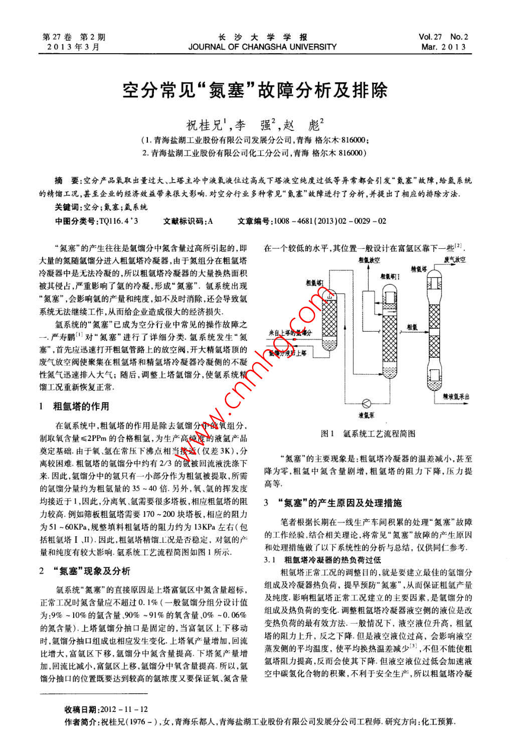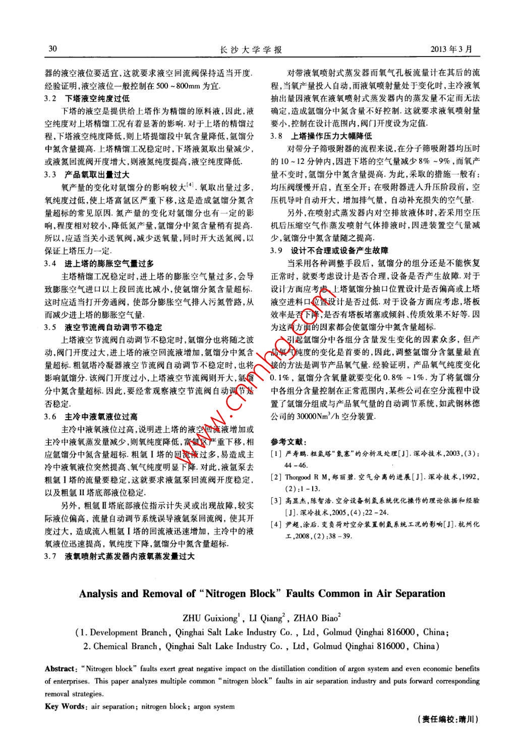 第27卷第2期長(zhǎng)沙大學(xué)學(xué)報(bào)Vol 27 No. 22013年3月JOURNAL OF CHANGSHA UNIVERSITYMar.2013空分常見“氮塞”故障分析及排除祝桂兄!,李強(qiáng)2,趙彪2(1.青海鹽湖工業(yè)股份有限公司發(fā)展分公司,青海格爾木8160002.青海鹽湖工業(yè)股份有限公司化工分公司,青海格爾木816000)摘要:空分產(chǎn)品氧取出量過大、上塔主冷中液氧液位過高或下塔液空純度過低等異常都會(huì)引發(fā)“氮塞”故障,給氬系統(tǒng)的精餾工況,甚至企業(yè)的經(jīng)濟(jì)效益帶來很大影響.對(duì)空分行業(yè)多種常見“氮塞”故障進(jìn)行了分析,并提出了相應(yīng)的排除方法關(guān)鍵詞:空分;氮塞;氬系統(tǒng)中圖分類號(hào):TQ64+3文獻(xiàn)標(biāo)識(shí)碼:A文章編號(hào):1008-4681(2013)02-0029-02“氮塞”的產(chǎn)生往往是氬餾分中氮含量過高所引起的,即在一個(gè)較低的水平,其位置一般設(shè)計(jì)在富氬區(qū)靠下一些2大量的氮隨氬餾分進(jìn)入粗氬塔冷凝器,由于氮組分在粗氬塔粗氬放空廢氣放空冷凝器中是無法冷凝的,所以粗氬塔冷凝器的大量換熱面積精塔被其侵占,嚴(yán)重影響了氬的冷凝,形成“氮塞”.氬系統(tǒng)出現(xiàn)粗氳氮塞”,會(huì)影響氬的產(chǎn)量和純度,如不及時(shí)消除,還會(huì)導(dǎo)致氬系統(tǒng)無法繼續(xù)工作,從而給企業(yè)造成很大的經(jīng)濟(jì)損失氬系統(tǒng)的“氮塞”已成為空分行業(yè)中常見的操作故障之一.嚴(yán)壽鵬對(duì)“氮塞”進(jìn)行了詳細(xì)分類.氬系統(tǒng)發(fā)生“氮來自上的氫餾分塞”,首先應(yīng)迅速打開粗氬管路上的放空閥開大精氬塔頂?shù)男阜忠夯厣纤U氣放空閥使聚集在粗氬塔和精氬塔冷凝器冷凝側(cè)的不凝性氮?dú)庋杆倥湃氪髿?隨后,調(diào)整上塔氬餾分,使氬系統(tǒng)精餾工況重新恢復(fù)正常.精液氬采出1粗氬塔的作用在氬系統(tǒng)中,粗氬塔的作用是除去氬餾分中的氧組分制取氧含量≤2PPm的合格粗氬,為生產(chǎn)高純度的液氬產(chǎn)品圖1氬系統(tǒng)工藝流程簡(jiǎn)圖奠定基礎(chǔ)由于氧、氬在常壓下沸點(diǎn)相當(dāng)接近(僅差3K),分離較困難粗氬塔的氬餾分中約有2/3的氬被回流液洗滌下“氮塞”的主要現(xiàn)象是:粗氬塔冷凝器的溫差減小,甚至的氬餾分量約為粗氬量的35-40倍另外,氧、氬的揮發(fā)度粗氬中氮含量劇增粗氬塔的阻力下降,壓力提來因此,氬餾分中的氬只有一小部分作為粗氬被提取所需降為均接近于1,因此,分離氧氫需要很多塔板相應(yīng)粗氬塔的阻3“氮塞”的產(chǎn)生原因及處理措施力較高例如篩板粗氬塔需要170~200塊塔板,相應(yīng)的阻力為51~60KPa,規(guī)整填料粗氬塔的阻力約為13KPa左右(包筆者根據(jù)長(zhǎng)期在一線生產(chǎn)車間積累的處理“氮塞”故障括粗氬塔Ⅰ、I).因此,粗氬塔精餾L況是否穩(wěn)定,對(duì)氬的產(chǎn)的工作經(jīng)驗(yàn),結(jié)合相關(guān)理論將常見“氮塞”故障的產(chǎn)生原因量和純度有較大影響氬系統(tǒng)工藝流程簡(jiǎn)圖如圖1所示和處理措施做了以下系統(tǒng)性的分析與總結(jié),僅供同仁參考3.1粗氬塔冷凝器的熱負(fù)荷過低2“氮塞”現(xiàn)象及分析粗氬塔正常工況的調(diào)整目的,就是要建立最佳的氬餾分氬系統(tǒng)“氮塞”的直接原因是上塔富氬區(qū)中氮含量超標(biāo),組成及冷凝器熱負(fù)荷,提早預(yù)防“氮塞”,從而保證粗氬產(chǎn)量正常工況時(shí)氮含量應(yīng)不超過0.1%(一般氬餾分組分設(shè)計(jì)值及純度影響粗氬塔正常工況建立的主要因素,是氬餾分的為:9%-10%的氬含量90%-9%的氧含量、0%-0.06%組成及熱負(fù)荷的變化調(diào)整相氬塔冷凝器液空側(cè)的液位是改的氮含量)上塔氫餾分抽口是固定的,當(dāng)富氬區(qū)上下移動(dòng)變熱負(fù)荷的最有效方法.一般情況下,液空液位升高,粗氬時(shí)氬餾分抽口組成也相應(yīng)發(fā)生變化上塔氧產(chǎn)量增加回流塔的阻力上升,反之下降但是液空液位過高,會(huì)影響液空比增大,富氬區(qū)下移,氬餾分中氮含量提高.下塔氮產(chǎn)量增蒸發(fā)側(cè)的平均溫度,使平均換熱溫差減少,不但不能使粗加回流比減小富氬區(qū)上移氬餾分中氧含量提高所以,氬氬塔阻力提高反而會(huì)使其下降但液空液位過低會(huì)加速液餾分抽口的位置既要達(dá)到較高的氬濃度又要保證氧、氮含量空中碳?xì)浠衔锏姆e聚,不利于安全生產(chǎn),所以粗氬塔冷凝收稿日期:2012-11-12作者簡(jiǎn)介:祝桂兄(1976-),女,青海樂都人,青海鹽湖工業(yè)股份有限公司發(fā)展分公司工程師研究方向:化工預(yù)算長(zhǎng)沙大學(xué)學(xué)報(bào)2013年3月器的液空液位要適宜,這就要求液空回流閥保持適當(dāng)開度對(duì)帶液氧噴射式蒸發(fā)器而氧氣孔板流量計(jì)在其后的流經(jīng)驗(yàn)證明,液空液位一般控制在500~800mm為宜程,當(dāng)氧產(chǎn)量投入自動(dòng),而液氧噴射量處于變化時(shí),主冷液氧3.2下塔液空純度過低抽出量因液氧在液氧噴射式蒸發(fā)器內(nèi)的蒸發(fā)量不定而無法下塔的液空是提供給上塔作為精餾的原料液,因此,液確定,造成氬餾分中氮含量不好控制.這就要求液氧噴射量空純度對(duì)上塔精餾工況有著顯著的影響.對(duì)于上塔的精餾過要小,控制在設(shè)計(jì)范圍內(nèi),閥門開度設(shè)為定值程,下塔液空純度降