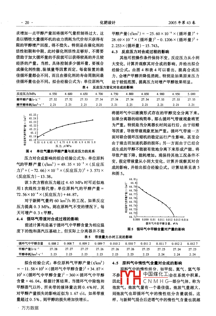 Feb.2005化肥設(shè)計43卷第1期16Chemical Fertilizer Design2005年2月化學(xué)工程甲醇合成過程的建模、分析與優(yōu)化孟慶軍(上海焦化有限公司,上海200241)摘要:通過物料衡算與熱量衡算,對甲醇合成反應(yīng)過程進(jìn)行了建模,以 matlab語言為工具進(jìn)行了多元非線性方程組的求解與驗證,從而定量給出了各種工況下的工藝指標(biāo)、各股物料參數(shù),定量分析和探討了各操作參數(shù)對合成反應(yīng)過程的影響。關(guān)鍵詞:物料平衡;熱力學(xué)平衡;建模;甲醇合成;操作優(yōu)化中圖分類號:TQ223.121文獻(xiàn)標(biāo)識碼:A文章編號:1004-8901(2005)01-0016-06Module Build-up, Analysis and Optimization for Methanol Synthesis ProcessQing-junShanghai Coking Company Ltd, Shanghai 200241 China)Abstract: Through both material balance calculation and heat balance calculation, module was established for synthetic reaction of methanol, taking matlab language as a tool, the solution and verification were made for multi-element and non-linear equation group so the process indexes under various working conditions and the material parameters of each stream were given, the effect of operating parameters on synthetic reaction was quantitatively analyzed and discussed.Key words: material balance; thermodynamically balancing; module building; methanol synthesis; operation optimization1甲醇生產(chǎn)控制因素分析如二甲醚等,以及未反應(yīng)的H2、CO、CO2和惰性氣,如CH、N2。出塔氣經(jīng)過與入塔氣和循環(huán)水換甲醇合成反應(yīng)工藝是一種較為成熟的技術(shù),最熱冷卻后,甲醇與水冷凝下來,在分離器中進(jìn)行氣常見的是魯奇工藝,采用銅基催化劑低壓法等溫合液分離。分離下來的粗甲醇入閃蒸槽,閃蒸出溶解成。其主要工藝流程見圖1氣后,送入精餾工段。分離器頂部出來的氣體,部分排放,除去原料氣中夾帶的惰性氣,以維持整個系統(tǒng)的壓力,其余的氣體循環(huán)返回,與新鮮氣加放氣壓混合后,再次入塔進(jìn)行反應(yīng)。影響合成反應(yīng)的條件較多,如原料氣的組成聯(lián)合循惰性氣含量,S、As等雜質(zhì)濃度,壓縮機(jī)的能力,合成塔反應(yīng)壓力,催化劑性能的好壞及溫度控制,弛冷卻器甲醇閃蒸放氣量的多少,換熱器與冷卻器的冷卻效果等。這系統(tǒng)粗甲醇些條件均會直接影響甲醇的產(chǎn)量、濃度、消耗與質(zhì)圖1甲醇合成系統(tǒng)流程圖量。根據(jù)甲醇合成反應(yīng)化學(xué)方程式,原料氣的氫/氫/碳摩爾比適宜的新鮮氣與循環(huán)氣經(jīng)壓縮機(jī)碳摩爾比應(yīng)該控制在20通常為了保持良好的反加壓到約50MPa,與合成塔出塔氣換熱到約215應(yīng)條件,氫氣略微過量,氫/碳摩爾比一般控制在℃后,進(jìn)入合成塔。在管殼式合成塔中裝有銅基催2.05中國煤化工源等條件限制,有時氫化劑的列管內(nèi)CO、OO2與H2反應(yīng)生成CH3OH,HCNMHG從而出現(xiàn)氫氣大反應(yīng)在約250℃的溫度下進(jìn)行。反應(yīng)熱通過管間鍋?zhàn)髡吆喗?孟慶軍(191年-),男,言林白山市人,193年畢業(yè)于爐水的蒸發(fā)帶走,以維持整個反應(yīng)器內(nèi)的恒溫。出華東理工大學(xué)煤化工專業(yè),工程師,從事化工工程的設(shè)計、開發(fā)和塔氣含有甲醇蒸氣、水蒸氣和少量的反應(yīng)副產(chǎn)物,技術(shù)管理工作第1期孟慶軍甲醇合成過程的建模、分析與優(yōu)化17量過剩,造成消耗較高的局面。原料氣中的惰性氣給出各種工況條件下的工藝指標(biāo)、入塔氣、出塔組分如果較高,則弛放氣就必須維持較高的量,以氣、循環(huán)氣、弛放氣、粗甲醇等各股物料流量及組保持平衡,從而會影響甲醇的產(chǎn)量和消耗。壓縮機(jī)成,并定量分析各個操作參數(shù)的變化對運(yùn)行工況的的能力也是決定甲醇合成生產(chǎn)負(fù)荷的一個因素,性影響,為甲醇合成的設(shè)計和操作提供依據(jù)。能較差或者進(jìn)入壽命后期的催化劑,因其合成單程2建模轉(zhuǎn)化率較低,往往需要更大的循環(huán)量才能保持生產(chǎn)負(fù)荷。甲醇合成反應(yīng)是體積縮小的反應(yīng),反應(yīng)壓力甲醇合成主反應(yīng)及平衡常數(shù)如下:的提高無論是從反應(yīng)平衡角度還是從反應(yīng)速度角度CO+ 2H2=CH3OH(1)來考慮,都有利于甲醇的生成。催化劑的性能決定了甲醇的反應(yīng)速度,從而控制著生產(chǎn)能力。其他影fH響甲醇合成的條件,如冷卻溫度以及分離器的分離CO+3H2=CH3OH+H2O(2)效果,如果冷卻效果不好、溫度較高或者液體甲醇分離不下來,則循環(huán)氣中甲醇含量就較大,那么不但在一個循環(huán)中分離下來的甲醇量會下降,從而降低了甲醇產(chǎn)能,而且循環(huán)氣中高濃度的甲醇還會使因為合成反應(yīng)在相對高溫和高壓下進(jìn)行,合成入塔氣中甲醇含量提高,不利于合成反應(yīng)的進(jìn)行。塔內(nèi)的各種物料已經(jīng)偏離了理想氣體狀態(tài),所以這以上所述各種操作條件是甲醇生產(chǎn)控制因素,里的平衡常數(shù)應(yīng)該用逸度而不是用分壓來表示而在工廠生產(chǎn)操作中,實(shí)際工況是千變?nèi)f化,如負(fù)逸度∫=p×中=p總×y;×中荷的波動、原料氣組成的變化、不同時期的催化劑式中,f為某組分的逸度;1為某組分的分壓;中性能、塔壓的變化等,此時操作人員需要根據(jù)經(jīng)驗為某組分的逸度系數(shù);p總為總壓;y為某組分的判斷,對操作條件進(jìn)行調(diào)整。至于不同工況下操作