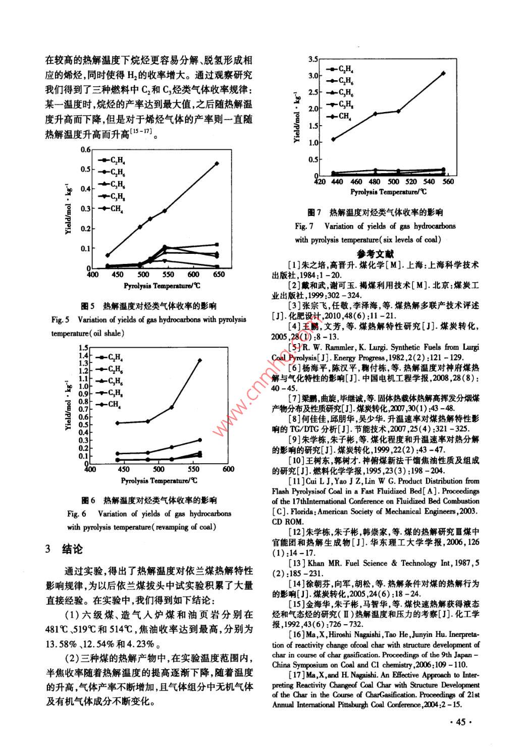 第31卷,總第177期《節(jié)能技術(shù)》Vol. 31 ,Sum. No. 1772013年1月,第1期ENERGY CONSERVATION TECHNOLOGYJanuary. 2013 ,No. 1熱解溫度對依蘭煤熱解特性的影響分析靳其龍,張字,郝繼宗,吳少華(哈爾濱工業(yè)大學(xué)燃燒工程研究所,黑龍江哈爾濱150001)摘要:本論文在處理量為2.5 kg/h的熱解實(shí)驗(yàn)裝置上,分別以兩種煙煤和一種油頁巖為原料,考察了熱解溫度對熱解產(chǎn)物產(chǎn)率、組成和性質(zhì)的影響規(guī)律。實(shí)驗(yàn)結(jié)果表明,當(dāng)反應(yīng)溫度分別為4819、514C、519時,六級煤、油頁巖、造氣入爐煤的焦油產(chǎn)率依次達(dá)到最高,產(chǎn)率分別為13. 58%、12.54%、4. 23%;在實(shí)驗(yàn)溫度范圍內(nèi),隨著溫度的升高,氣體產(chǎn)率不斷增加,且氣體組分不斷變化。關(guān)鍵詞:煤熱解;熱解溫度;焦油;煤氣中圈分類號:TK16文獻(xiàn)標(biāo)識碼:A文章編號:1002 -6339 (2013) 01 -0042 -04An Analysis of the Effect of the Temperature on thePerformance of Coal PyrolysisJIN Qi - long,ZHANG Yu,HAO Ji - zong, WU Shao - hua( Harbin Institute of Technology Institute of Combustion Engineering , Habin 150001 ,China)Abstract:In this paper , pyrolysis tests of two bituminous coals and one oil shale are crried out in a pyrol-ysis experiment device which treats 2.5 kg/h of fuel. Effect of pyrolysis temperature on the yield , compo-sition and properties were investigated. The results showed that, when the reaction temperature are re-spectively 4819 ,514C and 519C ,the tar's yield of VI cold ,oil shale and revamping coal reach the peakin sequence. The yield of the three are repectively 13. 58% , 12.54% and 4. 23% . In the temperaturerange,the gas yield increased with rising temperature and the composition changed constantly.Key words :coal pyrolysis ;temperature;tar;coal gas外,因石油和天然氣等資源的短缺,使得我國對石油0引言和天然氣進(jìn)口產(chǎn)生嚴(yán)重的依賴,無疑這一現(xiàn)狀將大我國是一-個富煤少油少氣的國家,在未來很長大制約著我國經(jīng)濟(jì)的可持續(xù)發(fā)展,甚至威脅到國家一段時間內(nèi)煤炭將 繼續(xù)占居我國能源的主導(dǎo)地位,安全。因此,為滿足我國經(jīng)濟(jì)持續(xù)高速發(fā)展對能源而我國煤炭的主要利用方式為直接燃燒,長期以來,供應(yīng)和環(huán)境保護(hù)的雙重需求,必須刻不容緩地改變導(dǎo)致了煤炭資源的嚴(yán)重浪費(fèi)和環(huán)境的嚴(yán)重污染,此傳統(tǒng)的煤炭生產(chǎn)和消費(fèi)方式,開發(fā)高效、潔凈的新型煤炭利用技術(shù)1-3]。煤熱解是煤體氣化、液化、精煉等化學(xué)過程的前提基礎(chǔ),是煤清潔利用技術(shù)的第-收稿日期2012-09-01 修訂稿日期 2012-11 -05基金項(xiàng)目:黑龍江省重大科技攻關(guān)項(xiàng)目(GA06A306)。步,與煤的熱加工技術(shù)聯(lián)系密切(4-5] ,故該實(shí)驗(yàn)研究作者簡介:靳其龍( 1988 -),男,碩士研究生,研究方向?yàn)榍鍧嵜旱臒峤馓匦跃哂?定的現(xiàn)實(shí)意義,且為依蘭“煤煤炭轉(zhuǎn)化及綜合利用技術(shù)。拔頭”中試實(shí)驗(yàn)提供- -定 的理論和設(shè)計(jì)依據(jù)?!?2●造氣入爐煤、油頁巖。煤樣的工業(yè)分析和元素分析1實(shí)驗(yàn)見表1。原煤粒徑<1 mm,實(shí)驗(yàn)前在110C真空烘1.1煤樣箱干燥2 h,實(shí)驗(yàn)中選用平均粒徑2.5 mm的石英砂實(shí)驗(yàn)采用的煤樣為黑龍江省依蘭縣的六級煤、作為固體熱載體。表1三種煤的元素分析及工業(yè)分析( 收到基)ab. 1 Element analysis and industry analysis of the three coals( As received basis)工業(yè)分析/[% ]FCAM元素分析/[%] C H0S六級煤48.03.442.16.554.9/ 5.428.61.00.2造氣入爐煤32.628.433.9.1造氣人爐煤46.54.314.11.0.油頁巖5.971.021.91.517.02.6,0.51.2實(shí)驗(yàn)平臺及流程熱載體與燃料在螺旋混合反應(yīng)器中充分混合、熱解;1.2.1實(shí)驗(yàn)平臺熱解氣熱載體與半焦混合物經(jīng)螺旋混合反應(yīng)器輸實(shí)驗(yàn)在一套高6 m,處理能力為2.5 kg/h的熱:送進(jìn)入移動床;熱解氣從移動床上端熱解氣出口排態(tài)螺旋混合反應(yīng)器熱解實(shí)驗(yàn)裝置上進(jìn)行,該裝置采出,經(jīng)過濾除塵裝置去除夾帶的固體顆粒后進(jìn)人冷用固體熱載體與燃料在螺旋混合反應(yīng)器混合加熱的凝系統(tǒng),在冷凝系統(tǒng)中被迅速冷卻得到液體產(chǎn)品,不熱解方式,有效的避免了高溫半焦顆粒間以及半焦可冷凝的油汽經(jīng)冷卻降溫后成為氣體排出;熱載體與器壁間的粘結(jié),使得整個實(shí)驗(yàn)裝置中固體物料流和半焦混合物則逐漸排出移動床。暢運(yùn)行。圖1是螺旋混合反應(yīng)器熱解實(shí)驗(yàn)裝置流程煤倉圖。該實(shí)驗(yàn)裝置主體部分主要由給煤系統(tǒng)加熱爐、砂倉螺旋混合反應(yīng)器移動床以及除塵裝置和冷凝系統(tǒng)給煤螺旋-除塵裝量+冷凝系統(tǒng)組成,實(shí)現(xiàn)了熱載體的儲存與加熱燃料的輸送、混合、反應(yīng)以及熱解產(chǎn)物的氣固分離和冷卻。實(shí)驗(yàn)時料閥合反應(yīng)器&料閥加熱爐溫度設(shè)定為700 ~ 950C ,除塵裝置溫度控制在350C左右。實(shí)驗(yàn)過程中,12組K型熱電偶監(jiān)測半焦/溫度并由計(jì)算機(jī)自動記錄溫度信號。圈1螺旋混合反應(yīng)器熱解實(shí)驗(yàn)裝置流程圖1.2.2分析儀器Fig.1 The schematic diagram of the screw mixer reactor for實(shí)驗(yàn)中,焦油用錐形瓶收集,對焦油的分析采用pyrolysisCP -3800(美國VARIAN公司生產(chǎn))和300 -M