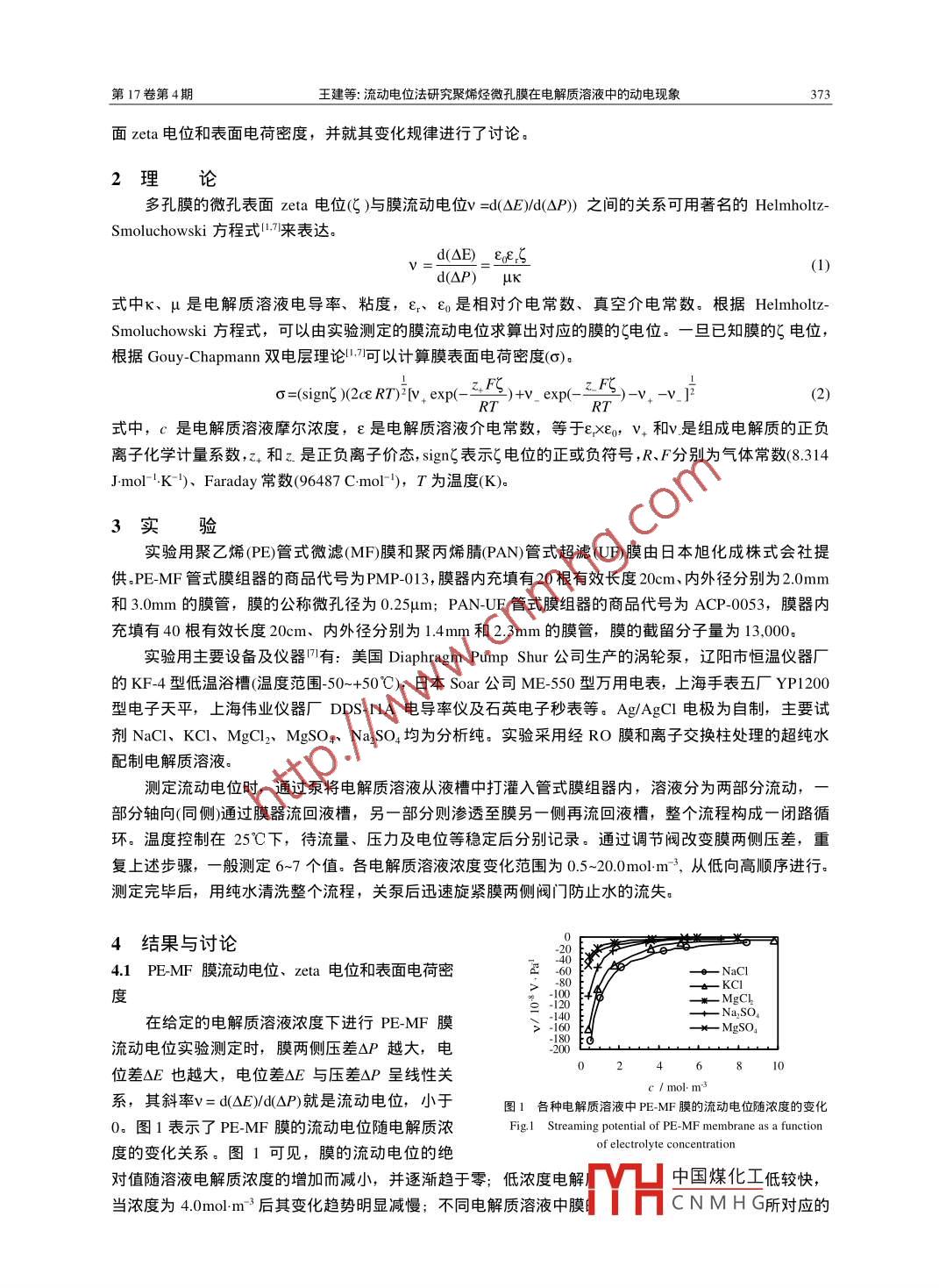 第17卷第4期高校化學(xué)工程學(xué)報No 4 Vol 172003年8月Journal of Chemical engineering of Chinese UniversitiesAug.2003文章編號:1003-9015(2003)04-0372-05流動電位法硏究聚烯烴微孔膜在電解質(zhì)溶液中的動電現(xiàn)象王建!,王曉琳2(1.淮海工學(xué)院化學(xué)工程系,江蘇連云港2205;2.清華大學(xué)化學(xué)工程系,北京100084)摘要:對NaCl、Kl、MgCl2、NaSO4、MgSO等5種電解質(zhì)溶液中2種不同微孔膜(管式聚乙烯微濾膜和管式聚丙烯腈超濾膜的流動電位進(jìn)行了實驗研究??疾炝穗娊赓|(zhì)濃度、離孑種類和價態(tài)對膜旳流動電位的影響。根據(jù)Helmholtz-Smoluchowski方程和 Gouy-Chapman理論算出2種膜的微孔表面zeta電位和電荷密度。結(jié)果表明,兩種微孔膜均由于離子的吸附而帶有負(fù)電荷,電解質(zhì)濃度、離子種類及價態(tài)對膜的流動電位、表面zeta電位和電荷密度均具有重要的影響關(guān)鍵詞:微濾膜;超濾膜;動電現(xiàn)象;流動電位;zeta電位;表面電荷密度中圖分類號:TQ028.8文獻(xiàn)標(biāo)識碼:A1前言膜流動電位是重要的膜動電現(xiàn)象之一。當(dāng)電解質(zhì)溶液在一定壓力差(ΔP)作用下以與膜面垂直(切向)方式通過多孔膜時,膜兩側(cè)(端)就會相應(yīng)地產(chǎn)生電位差(ΔE),而流動電位就是通過膜的凈電流為零時上述電位差隨壓力差變化的斜率,即d(ΔE)d(ΔP)。流動電位直接反映了膜微孔表面雙電層中有效電荷的分布信息,而膜表面的有效電荷往往來自于溶液旳離子吸附或膜微孔表面諸如羧基、氨基、磺酸基等一些官能團(tuán)的解離。膜表面電荷的存在,使得膜與溶液接觸界面附近的離子分布受到影響,與膜表面電荷同號的離子被排斥,異號離子則被吸引,從而在膜表面附近上形成所謂離子擴(kuò)散雙電層l當(dāng)溶液和膜表面之間因外場力(如濃度差、壓力差)的作用發(fā)生相對運(yùn)動時,會產(chǎn)生諸如濃差電位、流動電位等動電現(xiàn)象( electrokinetic phenomena)。為了描述上述動電現(xiàn)象,人們提出了諸如 Helmholtz模型、 Gouy-Chapmann模型及 Stern模型等雙電層理論2雙電層理論認(rèn)為在(膜)表面離子擴(kuò)散雙電層內(nèi)距表面某一距離處有—個(水)溶液與表面發(fā)生相對移動的“滑動面”,該處的電位與溶液主體的電位之差被稱為zeta電位。膜表面zeta電位是決定膜動電現(xiàn)象的一個重要參數(shù),與膜材質(zhì)、溶液體系密切相關(guān)。就高分子膜而言,較高的膜表面κeta電位,即較高的表面電荷密度,可以增加膜的透水率(因其自身親水性的提高),增強(qiáng)膜對離子的靜電排斥能力,以及有效地防止膠體污染物質(zhì)對膜的污染。因此當(dāng)今對微濾膜、超濾膜、納濾膜、反滲透膜、電滲析膜及離子交換膜等各種液體分離過程用膜而言,有關(guān)膜動電現(xiàn)象的研究已得到膜科學(xué)及界面科學(xué)等學(xué)術(shù)界同行們的廣泛關(guān)注μˉη。膜的流動電位可以通過實驗直接測定得到。將電解質(zhì)溶液加壓透過膜、測定膜兩側(cè)電位差所得到的流動電位,反映了膜內(nèi)部微孔表面的帶電性質(zhì),而在電解質(zhì)溶液流過膜表面時測定膜同一側(cè)壓力梯度下的電位差所得到的流動電位,則反映了膜外表面的帶電性質(zhì)4。一般來說,前者適用于描述微濾膜及較大截留分子量的超濾膜的微孔表面帶電性質(zhì),后者適用于反滲透膜、納濾膜及較小截留分子量的超濾膜的外表面帶電性質(zhì)。通過測定各種膜在不同操作條件下的膜流動電位,可以推算膜的表面zeta電位或電荷密度(σ),把握膜的正常適用范圍及其抗污染能力等本文選擇聚乙烯(P)管式微濾(MF)膜和聚丙烯腈(PAN管式超濾(UF膜作為研究對象,測定了幾種電解質(zhì)(NaCl、KCl、MgCl、Na2SO4和MgSO)溶液中不同濃度下PEMF膜和 PAN-UF膜的流動電位,根據(jù) Helmholtz- Smoluchowski理論和 Gouy-Chapmann理論,估算了PE-MF膜和 PAN-UF膜的表收稿日期:200209-22;修訂日期:2003-01-29中國煤化工基金項目:國家自然科學(xué)基金(29876018);國家863項目(2002AA328020m作者簡介:王建(1962-)男,江蘇淮安人,淮海工學(xué)院講師,碩士。通訊聯(lián)系人:王曉琳,E-mailCNMHG第17卷第4期王建等:流動電位法硏究聚烯烴微孔膜在電解質(zhì)溶液中的動電現(xiàn)象373面zeta電位和表面電荷密度,并就其變化規(guī)律進(jìn)行了討論。2理論多孔膜的微孔表面zeta電位(。)與膜流動電位v=d△E/d△P)之間的關(guān)系可用著名的 HelmholtzSmoluchowski方程式1來表達(dá)d△E)_Ed(△P)pK式中κ、μ是電解質(zhì)溶液電導(dǎo)率、粘度,ε、ε是相對介電常數(shù)、真空介電常數(shù)。根據(jù) HelmholtzSmoluchowski方程式,可以由實驗測定的膜流動電位求算出對應(yīng)的膜的電位。一旦已知膜的冫電位根據(jù) Gouy-Chapmann雙電層理論可以計算膜表面電荷密度(o)d=(Sign )ece RD v exp(z, FS)+y exp(2.F5)-v-vji式中,c是電解質(zhì)溶液摩爾濃度,ε是電解質(zhì)溶液介電常數(shù),等于εxE0,V,和是組成電解質(zhì)的正負(fù)離子化學(xué)計量系數(shù),x和乙是正負(fù)離子價態(tài),sign表示電位的正或負(fù)符號,R、F分別為氣體常數(shù)(8.314Jmol-1K)、 Faraday常數(shù)(96487Cmol-),T為溫度(K)3實驗實驗用聚乙烯(PE)管式微濾(MF膜和聚丙烯腈(PAN)管式超濾(U膜由日本旭化成株式會社提供。PE-MF管式膜組器的商品代號為PMP013,膜器內(nèi)充填有20根有效長度20cm、內(nèi)外徑分別為2.0mm