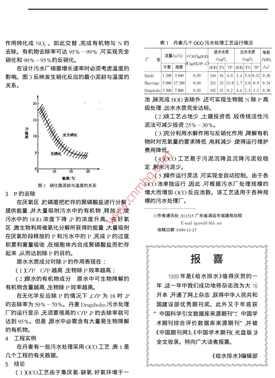 城市給排水·①CQ工藝對城市污水的處理張望軍提要主要介紹了一種新型的水處理工藝—OO工藝,包括其工藝設(shè)計特點BOD的去除與脫N除P原理、池型結(jié)構(gòu)和幾個工程實例。該工藝具有占地少、投資與運行費用低、出水水質(zhì)好的特點關(guān)鍵詞污水處理OCO工藝脫N除P0前言條件從而可以實現(xiàn)對 BODNP的同時去除。隨著對城市污水處理工藝研究的深入,人們的在厭氧區(qū)有機物被水解復(fù)雜的大分子和難生思路由多種工藝的組合轉(zhuǎn)向由單一工藝完成多工藝物降解的有機物被分解成簡單的小分子和易生物降組合。也就是說要求一種工藝能完成對污水的解的有機物。在該區(qū)污水的水力停留時間短通過BON、P及其它污染物的同時去除,如氧化溝、攪拌機使污水與污泥混合充分。SBR、 UNITANK等工藝。丹麥 Puritek A/S公司經(jīng)在缺氧區(qū)通過反硝化作用轉(zhuǎn)化為過多年的研究與實踐推出了OCO工藝。該工藝具這時要求污水中溶解氧濃度保持在一個較低水平有脫N除P功能強、自動化控制水平高投資省等(0.5mg/L以下)反硝化菌利用NO3作最終電子特點。受體進(jìn)行無氧呼吸而作為電子供體的有機物被分OO工藝流程解。典型的OCO工藝流程如圖1所示。在好氧區(qū),一些有機物被氧化分解成CO和HO并產(chǎn)生NH3部分有機物被轉(zhuǎn)化為污泥NH3通過硝化反應(yīng)被轉(zhuǎn)化為NO3。格橙】)①為了保證缺氧區(qū)反硝化反應(yīng)的發(fā)生必須使好氧區(qū)產(chǎn)生的NO3進(jìn)入缺氧區(qū)并形成環(huán)流OO工藝以攪拌機代替水泵產(chǎn)生環(huán)流操作原理如圖2。oCo反應(yīng)池圖1OO工藝流程1厭氧區(qū)2缺氧區(qū)3好氧區(qū)OO工藝實際上是集BODN、P去除于一池的活性污泥法。OCO反應(yīng)池是一個為生物處理提供物理/生化環(huán)境的動力系統(tǒng)池。原水經(jīng)過格柵、沉A好氧區(qū)攪拌機開動B好氧缺氧兩區(qū)挽拌機同時開動砂池的物理處理之后進(jìn)入OCO反應(yīng)池的1區(qū)在圖2O(O操作原理厭氧區(qū)污水與活性污泥混合混合液流入缺氧區(qū)2當(dāng)好氧區(qū)開動攪拌機缺氧區(qū)攪拌機關(guān)上時并在缺氧區(qū)與好氧區(qū)3之間循環(huán)一定時間后流入OCO中污水按圖2A所示方向流動兩區(qū)的污水混沉淀池澄清液排λ處理廠岀口污泥一部分回流到合減至最少。同時開動好氧、缺氧兩區(qū)攪拌機污水OCO反應(yīng)池另一部分作為剩余污泥予以處理按圖2B箭頭所示方向流動進(jìn)行充分混合使NO2BOD與N的去除進(jìn)入缺氧區(qū)發(fā)生反硝化反應(yīng)未降解完畢的有機物正是由于ωO反應(yīng)池中存在三種不同的操作進(jìn)入好氧區(qū)并被微生物降解NH3因硝化菌的硝化作用轉(zhuǎn)化成NO3。如此交替完成有機物與N的表1丹麥幾個oo污水處理工藝運行情況去除。有機物去除率可達(dá)95%~99%可實現(xiàn)完全進(jìn)水水質(zhì)出水水質(zhì)電耗流量/m3/dF/M/kOn硝化和90%~95%的反硝化。干季|WMsd人/mg/L/mg/L/kWh在設(shè)計污水廠細(xì)菌增長速率時必須考慮溫度的DDITNODTN TP /r影響。圖3反映發(fā)生硝化反應(yīng)的最小泥齡與溫度的1101801464013456020.0關(guān)系。Skaevinge5080172800.0423313.82.73.00.90.34Dragsholm 5 300 80005192319.2462.51.10.30池除完成BO去除外還可實現(xiàn)生物脫N除P高級處理出水水質(zhì)完全達(dá)標(biāo)(2)該工藝占地少建投資低較傳統(tǒng)活性污泥法可減少投資25%~30%。完全硝化(3)充分利用水解作用與反硝化作用降解有機物時對充氧量的要求降低電耗減少使得運行維護(hù)費用降低。乇硝化4)OO工藝易于污泥沉降且沉降污泥較穩(wěn)定剩余污泥少。溫度/℃5臊操作運行靈活可實現(xiàn)全自動控制。由于各圖3硝化菌泥齡與溫度的關(guān)系OO池單獨運行因此,可根據(jù)污水廠處理規(guī)模的3P的去除增大而增加OCO反應(yīng)池數(shù)。該工藝適用于各種規(guī)在厭氧區(qū)貯磷菌把貯存的聚磷酸鹽進(jìn)行分解,模的污水處理廠。提供能量并大量吸附污水中的有機物釋放P使污水中的BOD濃度下降,P的濃度升高。在好氧⊙作者通訊處511515廣東省清遠(yuǎn)市城建規(guī)劃局E-mail yzwj 163.net區(qū)微生物利用被氧化分解所獲得的能量大量吸附收稿日期1999-11-17在厭氧階段釋放的P和污水中的P,完成P的過度積累和奢量吸收在細(xì)胞體內(nèi)合成聚磷酸鹽而貯存起來從而達(dá)到除P的目的。原水水質(zhì)成分對除P的作用表現(xiàn)在報喜(1/PC/P越高生物除P效率越高2原水的有機物成分原水中可生物降解的1999年是《給水排水》值得慶賀的一有機物含量越高生物除P效率越高。氵年這一年中我們成功地將雜志改為大16在無化學(xué)反應(yīng)除P的情況下C/P為18時P開本開通了網(wǎng)上雜志獲得中華人民共和的去除率為50%-70%。丹麥 Dragsholm污水處理國建設(shè)部優(yōu)秀期刊獎。此外又于年底獲廠的運行顯示無須要很高的C/PP的去除率就可達(dá)到95%。但是原水中必需含有大量易生物降解中國科學(xué)引文數(shù)據(jù)庫來源期刊中國學(xué)術(shù)期刊綜合評價數(shù)據(jù)庫來源期刊”,并被的有機物。