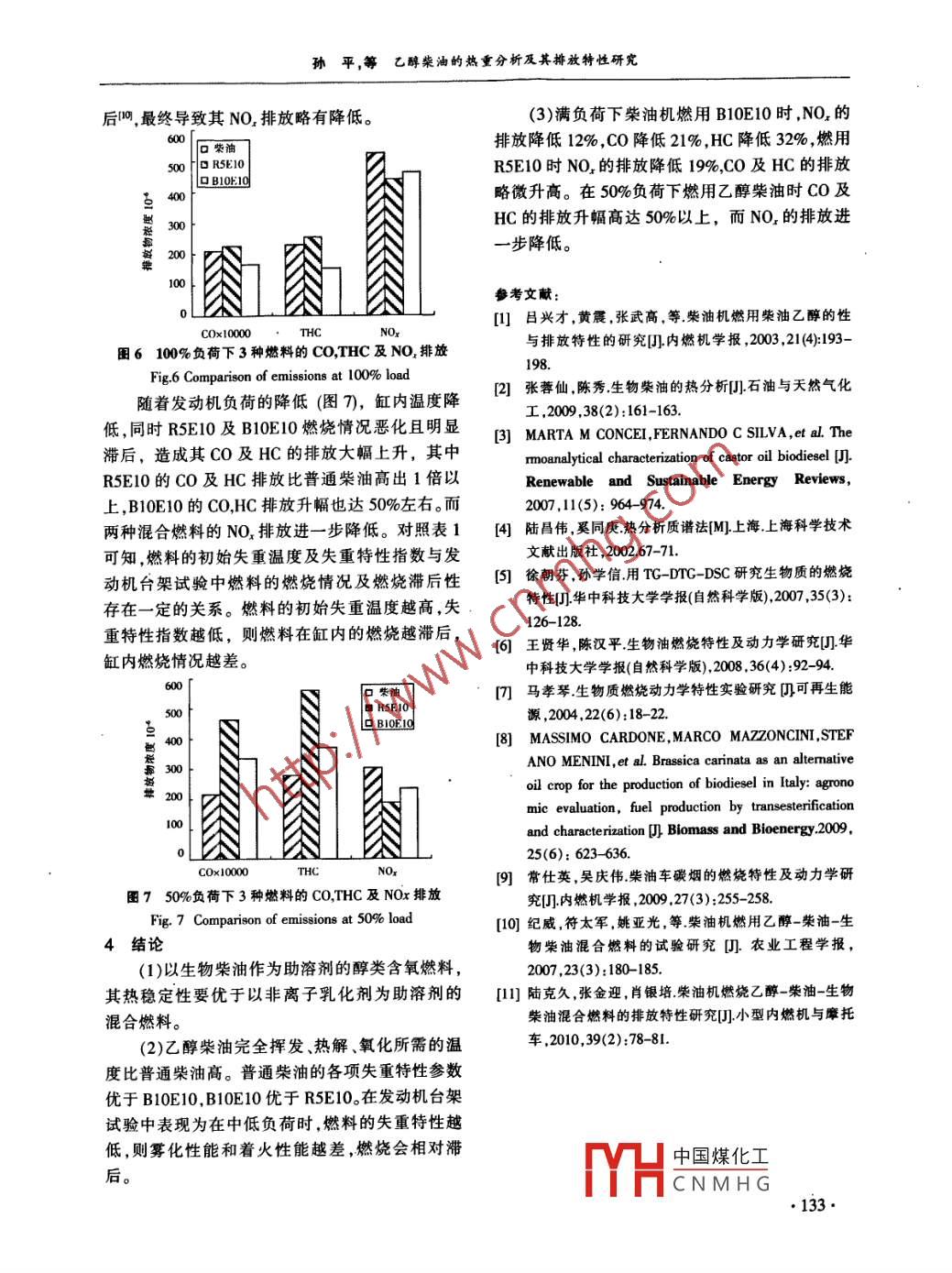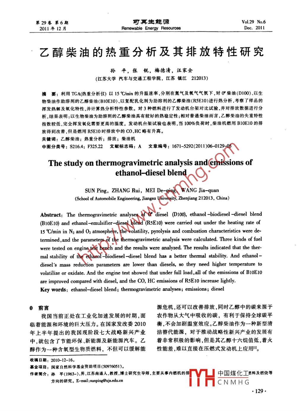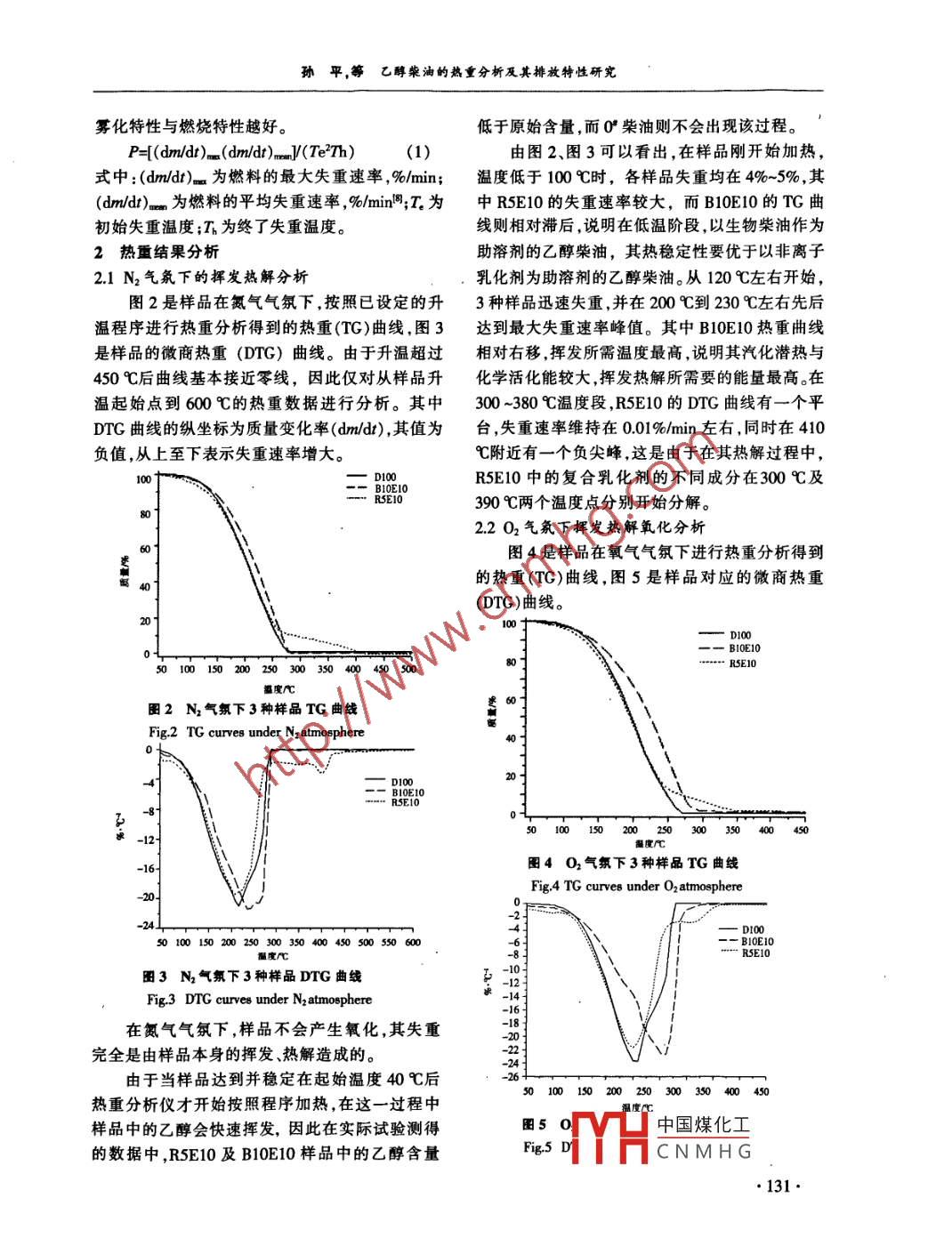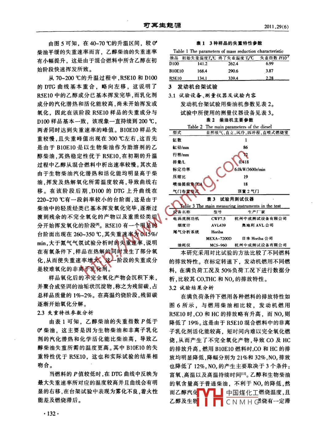 第29卷第6期可耳生能源Vol 29 No 62011年12月Renewable Energy Resourcesec. 2011乙醇柴油的熱重分析及其排放特性研究孫平,張銳,梅德清,汪家全(江蘇大學(xué)汽車與交通工程學(xué)院,江蘇鎮(zhèn)江212013)摘要:利用TGA(熱重分析儀)以15℃min的升溫速率,分別在氮氣及氧氣氣氛下,對0柴油(D100)、以生物柴油作助溶劑的乙醇柴油(B0E10)、以復(fù)配乳化劑為助溶劑的乙醇柴油(RSE10)進行熱分析,考察了樣品的揮發(fā)熱解及氧化特性,并計算熱分析特性參數(shù)。對3種燃料進行了發(fā)動機臺架對比試驗并對排放數(shù)據(jù)進行分析。結(jié)果表明:以生物柴油為助溶劑的乙醇柴油具有較好的熱穩(wěn)定性;相對普通柴油而言,乙醇柴油的失重特性指數(shù)較低,完全揮發(fā)氧化需要更高的溫度。發(fā)動機臺架試驗也表明,當(dāng)100%負(fù)荷時,柴油機燃用B10E10的排放得到改善,但是燃用R5E10時排放中的CO,HC略有升高。關(guān)鍵詞:乙醇柴油;熱重分析;排放;柴油機中圖分類號:S2164;F32522文獻標(biāo)志碼:A文章編號:1671-5292(2011)06-012905The study on thermogravimetric analysis and emissions ofethanol-diesel blendSUN Ping, ZHANG Rui, MEWANG Jia-g(School of Automobile Engineering, Jiangsu University, Zhenjiang 212013, China)Abstract: The thermogravimetric analyses of 0 diesel(D100), ethanol-biodiesel-diesel blend(B10E1O) and ethanol-emulsifier-diesel blend(R5E1o) were carried out under the heating rate of15C/min in N2 and O2 atmosphere the volatility, pyrolysis and combustion characteristics were de-termined, and the parameters of the thermogravimetric analysis were calculated. Three kinds of fuelwere tested on engine test bench and the results were analyzed. The results indicated that the thermal stability of the ethanol-biodiesel-diesel blend has a better thermal stability. And ethanoldiesel's mass reduction parameters are lower than diesels, so they need higher temperature tovolatilize or oxidate. and the engine test showed that under full load, all of the emissions of b10Ei0are improved compared with diesel, and the CO, HC emissions of R5E10 increase lightlyKey words: ethanol-diesel blend; thermogravimetric analyses; emissions; diesel0前言源危機,還可以改善排放,同時乙醇中的碳來源于我國當(dāng)前正處在工業(yè)化加速發(fā)展的時期,面農(nóng)作物從大氣中吸收的碳,有利于保持全球碳平臨著能源和環(huán)境的巨大壓力。在國家發(fā)改委2010衡,不會加劇溫室效應(yīng)。乙醇柴油作為一種新型清年上半年提出的我國現(xiàn)階段七大戰(zhàn)略新興產(chǎn)業(yè)潔替代能源,對于推動戰(zhàn)略性新興產(chǎn)業(yè)的發(fā)展有中,就包含了節(jié)能環(huán)保新能源及新能源汽車。乙著非常積極的影響,但是其乙醇十六烷值低,著火醇作為一種含氧型生物質(zhì)燃料,不但可以緩解能性能差,難以直接在壓燃式發(fā)動機上應(yīng)用。收稿日期:2010-12-16基金項目:國家自然科學(xué)基金資助項目(50976051)。作者簡介:孫平(1963-),男,江蘇南通人,教授博土研究生導(dǎo)師,主要從事內(nèi)燃機的拇中國煤化工然料及燃燒等方向的研究。E-mail:sunping@hjs.edu.cnYHCNMHG129可其生能漂2011,29(6)熱重分析作為研究燃料熱解及其燃燒性能的配復(fù)合乳化劑,10%無水乙醇的乙醇柴油,其中復(fù)有效手段,可以用于分析燃料的揮發(fā)性及可燃性,合乳化劑是由兩種非離子乳化劑按照一定比例配從而反映出燃料在柴油機中的著火性能與燃燒性比而成。能,對發(fā)動機的臺架試驗有一定的指導(dǎo)意義。為減小樣品質(zhì)量差異對試驗結(jié)果產(chǎn)生的影目前國內(nèi)熱分析主要集中于對生物柴油以及響,試驗所取樣品質(zhì)量均在15-20mg,同組試驗排放物顆粒的熱重分析。因此,試驗采用將乙醇與中各樣品質(zhì)量差小于10%。柴油混合的方法,在不改動柴油機結(jié)構(gòu)的基礎(chǔ)上1.3熱分析參數(shù)定義燃用乙醇柴油混合燃料,以期達到有效降低柴油1.3.1初始失重溫度及終了失重溫度定義機排放的目的,并對乙醇柴油的揮發(fā)、熱解、氧化在固體生物質(zhì)的熱分析方法中,通常采用TG及排放特性進行了研究。與DTG曲線定義燃料樣品的著火溫度T。如圖1熱重試驗1,將樣品的TG曲線和DTG曲線放置在同一個坐1.1熱重分析原理標(biāo)系中,過DTG曲線峰值點A作垂線并與TG曲熱重法( Thermogravimetric analysi是指樣線相交于一點B,然后過B點作TC曲線的切線。品在受熱過程中實質(zhì)上的質(zhì)量變化,是在一定的此切線與TG曲線起始平行線交于C點,則C點溫度程序控制下,測量樣品物質(zhì)的質(zhì)量與溫度之對應(yīng)的溫度即為樣品的著火溫度T間關(guān)系的試驗方法。應(yīng)當(dāng)注意的是,熱重分析之所141.22℃初始失重溫度T以定義為質(zhì)量變化而不是重量變化,是由于加熱DTG曲線時不但存在物理失重,還存在表觀失重。通過熱重法得到的樣品質(zhì)量與溫度之間的關(guān)系曲線,稱050之為熱重曲線,即TG( Thermogravimetry)曲線。微商熱重分析是指求得熱重曲線對溫度或者時間的一階導(dǎo)數(shù),得到微商熱重曲線(DTGTG曲線0Derivative Thermogravimetry),用來表征樣品質(zhì)量0350℃15變化的速率與時間或者溫度之間的關(guān)系。DTG曲時間rmin線的峰值和TG曲線的最大質(zhì)量變化相對應(yīng)。圖1初始失重溫度Te示意圖1.2試驗儀器及樣品Fig. l The scheme of the initial mass121試驗儀器reduction temperature T.熱重分析儀可以在給定氣氛下,測量樣品在由于C點對應(yīng)的是D