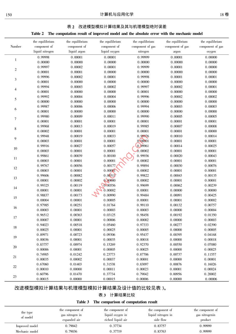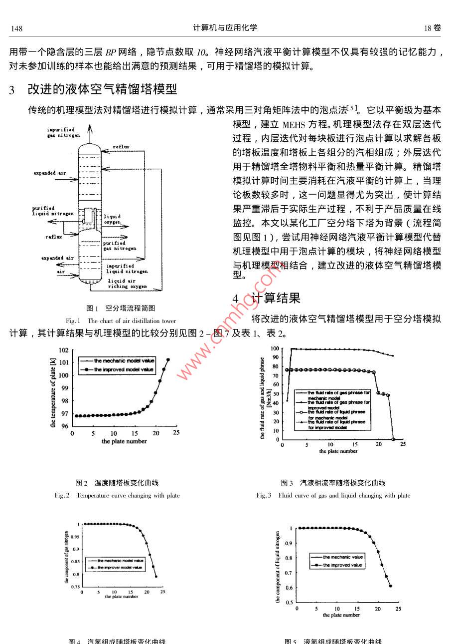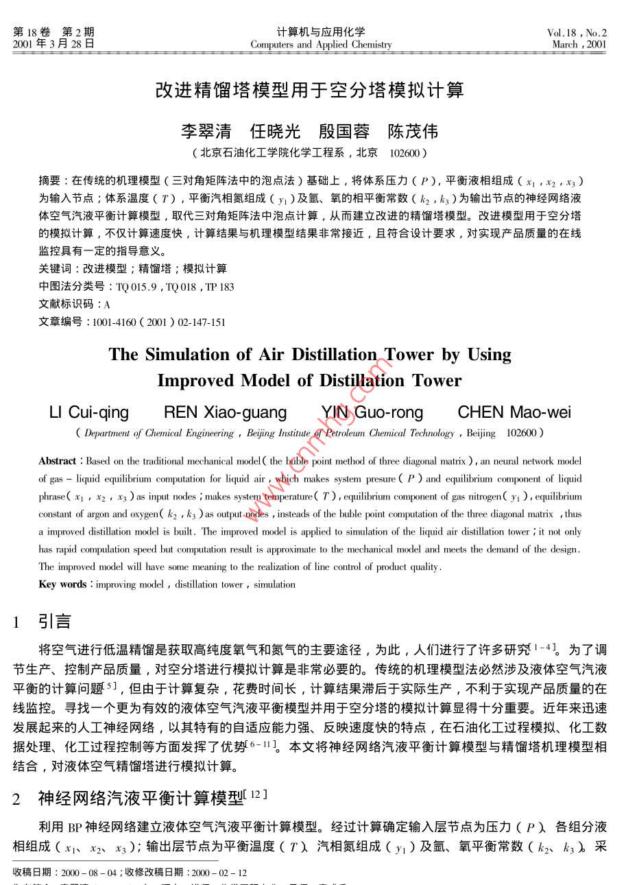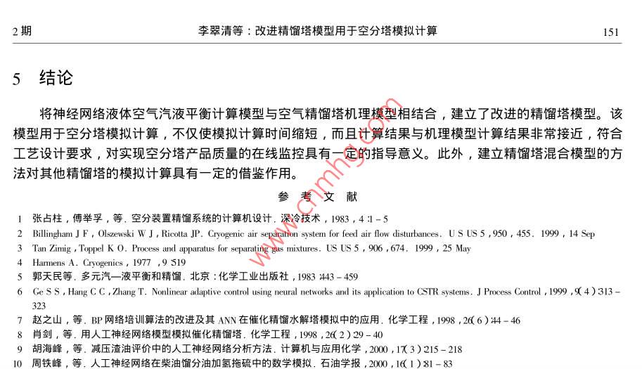第18卷第2期計(jì)算機(jī)與應(yīng)用化學(xué)Vol. 182001年3月28日d Applied ChemistryMarck改進(jìn)精餾塔模型用于空分塔模擬計(jì)算李翠清任曉光殷國(guó)蓉陳茂偉北京石油化工學(xué)院化學(xué)工程系,北京102600)摘要∶在傳統(tǒng)的機(jī)理模型(三對(duì)角矩陣法中的泡點(diǎn)法)基礎(chǔ)上,將體系壓力(P),平衡液相組成(x,x2,x3)為輸入節(jié)點(diǎn);體系溫度(T),平衡汽相氮組成(y)及氬、氧的相平衡常數(shù)(k2,k3)為輸岀節(jié)點(diǎn)的神經(jīng)網(wǎng)絡(luò)液體空氣汽液平衡計(jì)算模型,取代三對(duì)角矩陣法中泡點(diǎn)計(jì)箅,從而建立改進(jìn)的精餾塔模型。改進(jìn)模型用于空分塔的模擬計(jì)算,不僅計(jì)算速度快,計(jì)算結(jié)果與機(jī)理模型結(jié)果非常接近,且符合設(shè)計(jì)要求,對(duì)實(shí)現(xiàn)產(chǎn)品質(zhì)量的在線監(jiān)控具有一定的指導(dǎo)意義。關(guān)鍵詞∶改進(jìn)模型;精餾塔;模擬計(jì)箅中圖法分類號(hào):TQ015.9,TQ018,TP183文獻(xiàn)標(biāo)識(shí)碼:A文章編號(hào):1001-4160(201)02-147-15The Simulation of Air Distillation Tower by UsingImproved Model of Distillation TowerLI Cui-qIngRENXⅰ ao-guauang YIN Guo-rong CHEN Mao-WeiDepartment of Chemical Engineering, Beijing Institute of Petroleum Chemical Technology, Beijing 102600)Abstract: Based on the traditional mechanical model( the buble point method of three diagonal matrix ) an neural network modelof gas-liquid equilibrium computation for liquid air, which makes system presure( P)and equilibrium component of liquidphrase( xi,x2,x3) as input nodes makes system temperature( T), equilibrium component of gas nitrogen( yi), equilibriumonstant of argon and oxygen k?, k3 )as output nodes, insteads of the buble point computation of the three diagonal matrix thusa improved distillation model is built. The improved model is applied to simulation of the liquid air distillation tower it not onlyhas rapid compulation speed but computation result is approximate to the mechanical model and meets the demand of the designto the realization of line control of product qu:Key words: improving model distillate1引言將空氣進(jìn)行低溫精餾是獲取高純度氧氣和氮?dú)獾闹饕緩?為此,人們進(jìn)行了許多研究1-4。為了調(diào)節(jié)生產(chǎn)、控制產(chǎn)品質(zhì)量,對(duì)空分塔進(jìn)行模擬計(jì)算是非常必要的。傳統(tǒng)旳杋理模型法必然涉及液體空氣汽液平衡的計(jì)算問(wèn)題5,但由于計(jì)算復(fù)雜,花費(fèi)時(shí)間長(zhǎng),計(jì)算結(jié)果滯后于實(shí)際生產(chǎn),不利于實(shí)現(xiàn)產(chǎn)品質(zhì)量的在線監(jiān)控。尋找一個(gè)更為有效的液體空氣汽液平衡模型并用于空分塔的模擬計(jì)算顯得十分重要。近年來(lái)迅速發(fā)展起來(lái)的人工神經(jīng)網(wǎng)絡(luò),以其特有的自適應(yīng)能力強(qiáng)、反映速度快的特點(diǎn),在石油化工過(guò)程模擬、化工數(shù)據(jù)處理、化工過(guò)程控制等方面發(fā)揮了優(yōu)勢(shì)δ-]本文將神經(jīng)網(wǎng)絡(luò)汽液平衡計(jì)算模型與精餾塔機(jī)理模型相結(jié)合,對(duì)液體空氣精餾塔進(jìn)行模擬計(jì)算。2神經(jīng)網(wǎng)絡(luò)汽液平衡計(jì)算模型1利用BP神經(jīng)網(wǎng)絡(luò)建立液體空氣汽液平衡計(jì)算模型。經(jīng)過(guò)計(jì)算確定輸入層節(jié)點(diǎn)為壓力(P)各組分液相組成(x1、x2、x3);輸出層節(jié)點(diǎn)為平衡溫度(T)汽相氮組成(y1)及氬、氧平衡常數(shù)(k2、k3)采000-08-04日期:2000-02-12148計(jì)算機(jī)與應(yīng)用化學(xué)18卷用帶一個(gè)隱含層的三層B網(wǎng)絡(luò),隱節(jié)點(diǎn)數(shù)取10。神經(jīng)網(wǎng)絡(luò)汽液平衡計(jì)算模型不僅具有較強(qiáng)的記憶能力,對(duì)未參加訓(xùn)練的樣本也能給岀滿意的預(yù)測(cè)結(jié)果,可用于精餾塔旳模擬計(jì)算。3改進(jìn)的液體空氣精餾塔模型傳統(tǒng)的杋理模型法對(duì)精餾塔進(jìn)行模擬計(jì)算,通常采用三對(duì)角矩陣法中的泡點(diǎn)法5。它以平衡級(jí)為基本模型,建立MEHS方程。機(jī)理模型法存在雙層迭代nitr。gn過(guò)程,內(nèi)層迭代對(duì)每塊板進(jìn)行泡點(diǎn)計(jì)算以求解各板的塔板溫度和塔板上各組分的汽相組成;外層迭代用于精餾塔全塔物料平衡和熱量平衡計(jì)算。精餾塔expanded air模擬計(jì)算時(shí)間主要消耗在汽液平衡的計(jì)算上,當(dāng)理論板數(shù)較多時(shí),這一問(wèn)題顯得尤為突出,使計(jì)算結(jié)ifi.dquid nitro果嚴(yán)重滯后于實(shí)際生產(chǎn)過(guò)程,不利于產(chǎn)品質(zhì)量在線監(jiān)控。本文以某化工廠空分塔下塔為背景(流程簡(jiǎn)圖見圖1),嘗試用神經(jīng)網(wǎng)絡(luò)汽液平衡計(jì)算模型代替機(jī)理模型中用于泡點(diǎn)計(jì)算的模塊,將神經(jīng)網(wǎng)絡(luò)模型與機(jī)理模型相結(jié)合,建立改進(jìn)的液體空氣精餾塔模seE liquidriching oxycen4計(jì)算結(jié)果圖1空分塔流程簡(jiǎn)圖將改進(jìn)的液體空氣精餾塔模型用于空分塔模擬計(jì)算,其計(jì)算結(jié)果與機(jī)理模型的比較分別見圖2-圖7及表1、表2。101mechanic modelprayer meot1015dthe plate number圖2溫度隨塔板變化曲線板變化曲線Fig 2 Temperature curve changing with plateg 3 Fluid curve of gas and liquid chang期李翠清等:改進(jìn)精餾塔模型用于空分塔模擬計(jì)算1492.50E016.11圖6液氧組成隨塔板變化曲線圖7塔