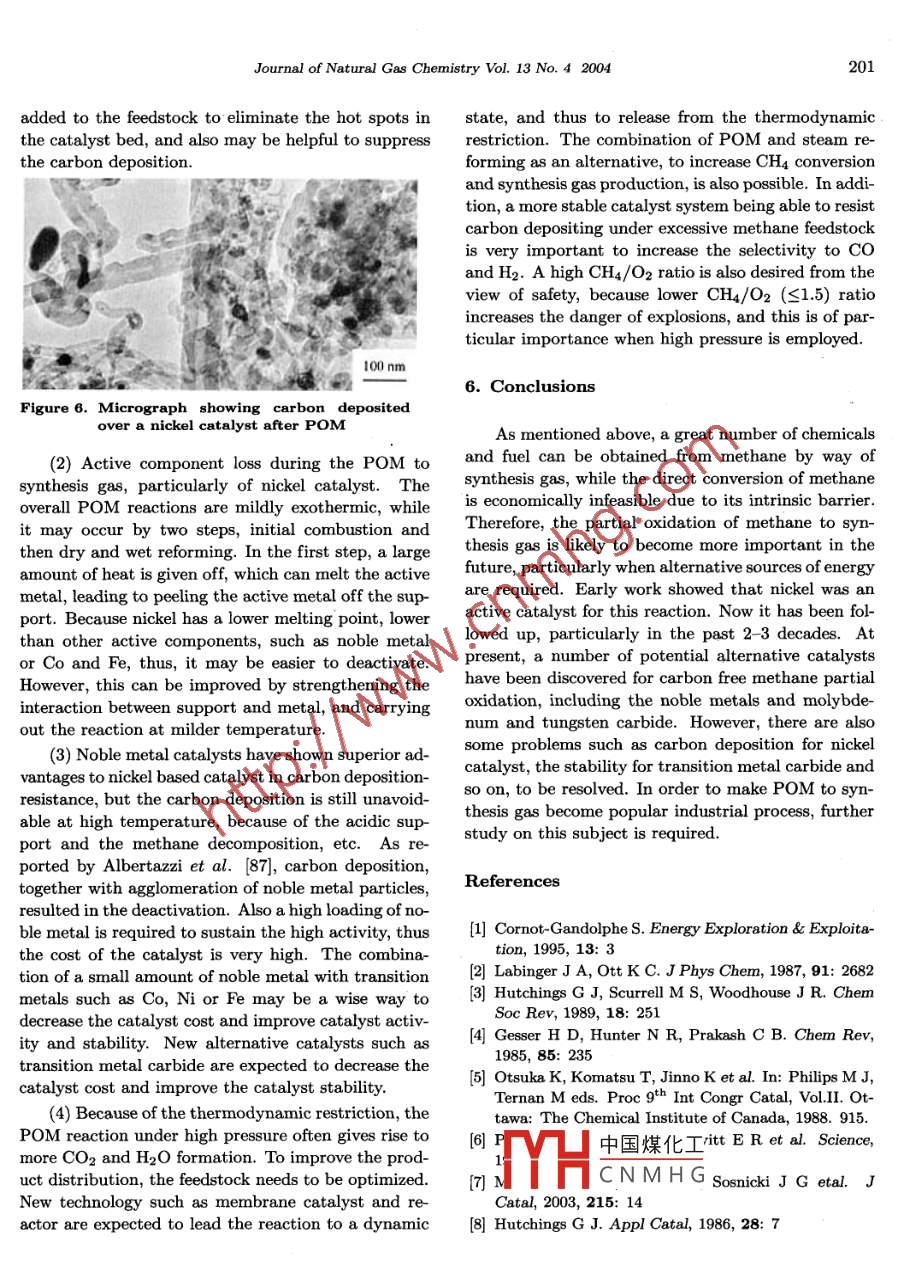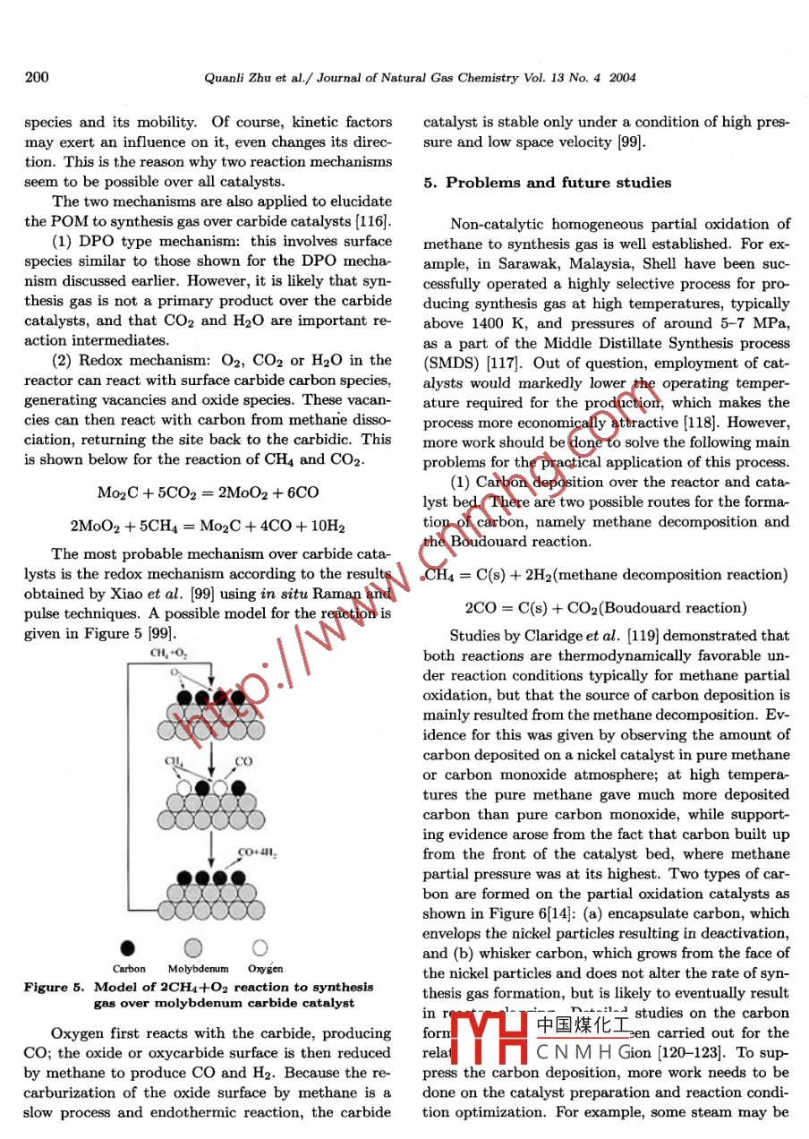 Journal of Natural Gas Chemistry 13(2004)191-203SCIENCE PRESSAdvances in the Partial Oxidation of Methane to Synthesis GasQuanli Zhu,2, Xutao Zhao, Youquan Deng1. Petrochemical Research Institute of Lanzhou Petrochemical Company, China National Petroleun CorporatLanzhou 790060, China; 2. State Key Laboratory for Oro Symthesis and Selective Oxidation, LanzhouInstitute of Chemical Physics, Chinese Academy of Sciences, Lanzhou 730000, ChinaManuscript received November 10, 2004; revised November 26, 2004Abstract: The conversion and utilization of natural gas is of significant meaning to the national economy,even to the everyday life of people. However, it has not become a popular industrial process as expecteddue to the technical obstacles. In the past decades, much investigation into the conversion of methane,predominant component of natural gas, has been carried out. Among the possible routes of methaneconversion, the partial oxidation of methane to synthesis gas is considered as an effective and economicallyfeasible one. In this article, a brief review of recent studies on the mechanism of the partial oxidation ofmethane to synthesis gas together with catalyst development is wherein presentedKey words: methane partial oxidation, synthesis gas, catalyst, reaction mechanism1. Introductionrate was no more than 30%[2, 3, and in the pro-cess of direct oxidation of methane to methanol 4]orNatural gas, which is. mainly composed of formaldehyde 5], the highest productive rate was 8%methane, is an abundant resource found: over the and 4%, respectively. It was recently reported that aworld and is predicated to outlast the oil reserves 50% of methanol productive rate was achieved by aby a significant margin 1]Most of these reserves,pilot plant in homogeneous catalysis, but still lowerhowever,are situated in the areas far away from the than what is expected (6, 7 ] On the other hand, themarkets of highest energy consumption, and the ex- mercury and concentrated sulfuric acid was used inpensive cost of compression, transportation and stor- this process, and the resulted sulfuric dioxide shouldage,makes the utilization of natural gas as an unpre- to be re-oxidized for recycle. Although there are inpossessing proposition. Contrary to it, petroleum is dustrial processes of the direct conversion of methane,elatively cheap and it can be conveniently disposed. such as the oxidation of methane and ammonium orIn order to make the utilization of natural gas more amine to cyanide [8 and the pyrolysis of methane toeconomically viable, a large amount of investigation acetylene[9, their marked disadvantage is that theseinto the conversion of methane to liquids or higher hy- processes are needed to operate at very high temperadrocarbons has been carried out in the past decades. ture, usually above 1300 K. Because of these reasons,Unfortunately, the productive rate in these processes it is very difficult for natural gas to compete withis still lower than what is expected, because these petroleum at presentproducts resulted from methane partial oxidation areIn order to elevate the additional value ofusually more chemically active than methane, which meth中國煤化工 hane can be theoretlimits methane converting to the expected products. ically-ways: one is the diFor example, in the process of direct oxidative cou- rectCNMHGch as as mentionedpling of methane to ethylene, the highest productive above, the oxidative coupling of methane to ethyCorrespondingauthorE-mail:qlzhu0001@sina.com192Quanli Zhu et al. /Journal of Natural Gas Chemistry Vol. 13 No. 4 2004lene the direct oxidation of methane to methanol depends to a great extent upon the employed catalystor formaldehyde, etc. It is impossible for these pro temperature, pressure and the ratio of methane tocesses to be applied to mass production unless great oxygen in feedstock, as well as kinetic factors. Threebreakthroughs of these technologies are achieved. The reactions possible to occur during POM are brieflyother is the indirect conversion of methane namely, expressed in Figure 2, wherein some thermodynamicconverting methane to any other products via syn- information is includedthesis gas, which is the mainly practical route for themethane conversion at the present time.COz+H2OC2H2Nowadays, there are three methods for produc-ing synthesis gas from methane: the steam reform-H2s/Sing, the dry reforming and the partial oxidation, ofCH]Cl Cl-HCI△O2HCNmethane. Compared with the former two, the partialoxidation of methane(Pom) possesses characteristicsas follows: (1) POM reaction is a mild exothermicetc.aHCHOreaction while the former two are endothermic reac-tions. Thus, the industrial process based upon POMC2H6tCaHACH3OHis energy saving. In view of this, the utilization ofCO+H2POM combined with steam reforming or dry reformFigure 1. Possible route for methane conversioning is more effective. (2)The molar ratio of H2 toCO in the resulted synthesis gas is close to 2 if POMreaction is carried out according to stoichiometric ra-CH4tio. This kind of synthesis gas containing little co 2 is1/202; partial oxidationan ideal feedstock for downstream processes, such asCo+Hmethanol synthesis, etc. ( 3) POM can be carried outTotalunder the condition of very high gas hourly space ve- CH4+202=CO2+2H20locity(GHSV), which makes the process require less (AH298-803 k/mol)(steam and cOCH4+H20-CO+3H2investment and less production scale to achieve thesame or larger capacity.CH4+CO2"2C0-+2H(△H98=+261kmo)However, carbon depositing over catalyst bed wasCHa+ CO,+H?0unavoidable even if POM was carried out precisely Figure 2. Thermodynamic representation of POMunder the condition of 2: 1 of the molar ratio of CHto o2, or less than 2: 1, and the coke formation waseven worse at higher temperature. POM, thus, didThe calculated product gas distribution at thenot get proper attention until the oil crisis. Since thethermodynamic equilibrium under the condition ofeighties'of last century, Green an