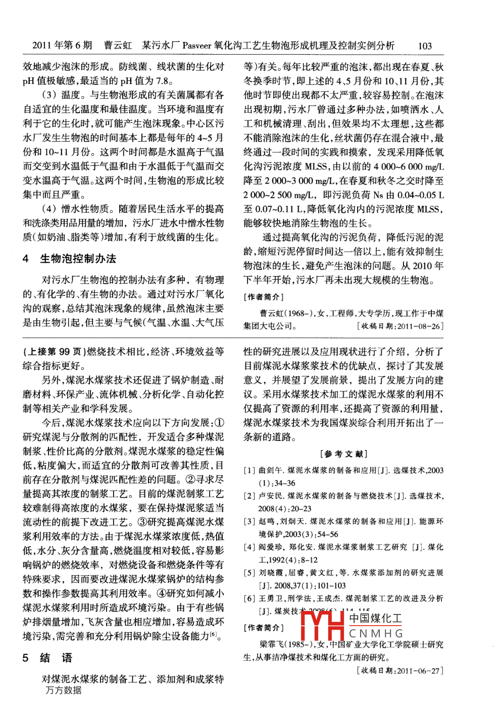 能源技術(shù)與管理011年第6期d10.3969isn.1672-99432011.06041資源綜合利用煤泥水煤漿技術(shù)研究進(jìn)展梁霏飛,吳國(guó)光,孟獻(xiàn)梁,張玉良,云增杰,羅曉強(qiáng),張靜(中國(guó)礦業(yè)大學(xué)化工學(xué)院,江蘇徐州221116)[摘要]隨著選煤技術(shù)的發(fā)展,煤泥產(chǎn)量日益上升。選煤廠煤泥粒度細(xì)、灰分高、含水量大不經(jīng)適當(dāng)處理難以有效利用。煤泥水煤漿是一種高灰水煤漿,是依托水煤漿技術(shù)而發(fā)展的一種新型燃料,有廣泛的應(yīng)用前景。針對(duì)煤泥水煤漿工藝、添加劑和成漿特性進(jìn)行闡述,分析了發(fā)展煤泥水煤漿技術(shù)的意義,展望了發(fā)展前景和發(fā)展方向。[關(guān)鍵詞]煤泥;水煤漿;添加劑;成漿特性;發(fā)展前景[中圖分類號(hào)]TQ536[文獻(xiàn)標(biāo)識(shí)碼]B[文章編號(hào)]1672-9943(2011)06-0984020引言粒及雜物外排。優(yōu)點(diǎn)是濃度較易控制,制漿能力較大;缺點(diǎn)是如果干煤粉量太大就很難被水迅速潤(rùn)煤泥是由微細(xì)粒煤、粉化矸石和水組成的粘濕,要求入料濃度不能變動(dòng)太大,對(duì)入料中的大顆稠物,具有粒度細(xì)、微粒含量多、水分和灰分髙、熱粒及雜物較難控制,環(huán)境污染嚴(yán)重。值低、粘結(jié)性較強(qiáng)、內(nèi)聚力大等特點(diǎn)。隨著選煤技兗州礦業(yè)集團(tuán)根據(jù)經(jīng)驗(yàn)將煤泥干燥后篩分后術(shù)的進(jìn)步,副產(chǎn)品煤泥的發(fā)熱量越來(lái)越低,大部分確定級(jí)配方案制漿,通過(guò)煤質(zhì)分析和煤漿穩(wěn)定性作為廢料遺棄,占用土地資源。有的礦區(qū)缺乏對(duì)煤試驗(yàn),選出了效果好、價(jià)格便宜、使用方便的添加泥的綜合治理,導(dǎo)致煤泥泛濫,選煤生產(chǎn)受到制劑,還找出了不同時(shí)間取樣的煤泥試樣的最佳制約,甚至影響礦井生產(chǎn),合理利用煤泥資源對(duì)選煤漿條件企業(yè)意義重大1。煤泥水煤漿技術(shù)利用煤泥作為12濕法制漿工藝原料,是在水煤漿技術(shù)基礎(chǔ)上發(fā)展起來(lái)的一種新煤泥濕法制漿工藝是將煤泥直接磨漿,磨后的制漿工藝,減少了濃縮、浮選以及真空過(guò)濾等環(huán)產(chǎn)品經(jīng)過(guò)濾、攪拌調(diào)漿。優(yōu)點(diǎn)是不需增加太多的設(shè)節(jié),生產(chǎn)成本低,簡(jiǎn)化了選煤廠的煤泥水處理系備,工藝簡(jiǎn)單、操作方便,不改變?cè)耗嗔6确植冀y(tǒng),是國(guó)家鼓勵(lì)發(fā)展的資源綜合利用項(xiàng)目2??芍频眯阅芰己玫臐{體,環(huán)境污染小;缺點(diǎn)是難以1煤泥水煤漿工藝研究進(jìn)展制得較高濃度的水煤漿,對(duì)入料中的大顆粒及雜物也較難控制。傳統(tǒng)的煤泥制漿工藝優(yōu)勢(shì)是集成了煤泥制開灤呂家沱礦采用旋流器組濕法制漿系統(tǒng)漿、污水處理、型煤型焦生產(chǎn)及煤漿氣化、高濃度濃縮機(jī)底流受壓力作用從而給入旋流器。底流和煤漿管道遠(yuǎn)距離輸送等技術(shù),是在現(xiàn)有資源和技溢流分別給亼制漿桶和煤泥沉淀池,制漿桶中漿術(shù)前提下的創(chuàng)新。缺陷是選用設(shè)備數(shù)量多、項(xiàng)目投體泵送至篩子去除大顆粒和雜物,之后給入儲(chǔ)漿資大,制約了產(chǎn)業(yè)化進(jìn)程,沒(méi)有專用制漿設(shè)備,代桶制得的煤泥水煤漿由曲桿泵送到爐前;邢臺(tái)礦用設(shè)備效率低、能耗大,影響經(jīng)濟(jì)效益和市場(chǎng)推務(wù)局東龐煤礦采用濃縮機(jī)濕法制漿系統(tǒng),選煤近年來(lái),依托水煤漿技術(shù)開發(fā)出的煤泥水煤漿濃縮機(jī)底流經(jīng)過(guò)泵進(jìn)入二次濃縮機(jī)中,二次濃縮工藝主要包括濕法制漿工藝和干法制漿工藝,合機(jī)溢流給入煤泥沉淀池,底流去除雜物之后給入理的制漿工藝有利于提高質(zhì)量和降低成本,煤泥攪拌池、攪拌池中的物料泵送到鍋爐。水煤漿工藝有待于進(jìn)一步研究。13中國(guó)煤化工1.1千法制漿工藝CNMH或7Ma的中灰煤煤泥干法制漿工藝是將烘娂干的煤泥用輸送機(jī)泥水煤漿生產(chǎn)線,利用煤泥制備高濃度水煤漿技運(yùn)至制漿桶后加水?dāng)嚢?經(jīng)泵送到篩子上去除粗術(shù)把中灰煤泥制備成水煤漿。工藝為煤泥經(jīng)濃縮粒和雜物,篩下物進(jìn)儲(chǔ)漿桶供鍋爐燃燒,篩上大顆過(guò)濾脫水后,經(jīng)運(yùn)輸系統(tǒng)運(yùn)至攪拌機(jī),同時(shí)加入活2011年第6期梁霏飛,等煤泥水煤漿技術(shù)研究進(jìn)展化劑和少量水,煤餅經(jīng)雙軸攪拌機(jī)的攪拌捏混,形發(fā)分含量,揮發(fā)分越高越容易點(diǎn)燃,火焰穩(wěn)定性越成具有一定流動(dòng)性的水煤漿。經(jīng)攪拌后,小部分水好。從燃燒角度來(lái)看,制漿用煤的揮發(fā)分含量不能煤漿返回?cái)嚢铏C(jī),大部分水煤漿送至球磨機(jī),產(chǎn)品太低,通常鍋爐要求>25%,爐窯要求>15%。從經(jīng)濾漿器過(guò)濾后,加入穩(wěn)定劑并攪拌均勻泵送至泵送和霧化的角度來(lái)看,要保證漿體在常溫和剪膠體磨,經(jīng)剪切、乳化作用形成成品。切率為100s1時(shí)粘度不高于1.0~1.2Pa·s兗礦集團(tuán)八一水煤漿公司用1臺(tái)400mm穩(wěn)定性:表示顆??钩两档哪芰?決定能否穩(wěn)8500mm的球磨機(jī),并應(yīng)用徐州礦源濃漿泵供料定存放、輸送。影響穩(wěn)定性的因素有煤的變質(zhì)程系統(tǒng),將高莊煤礦煤泥直接制漿供給八一熱電