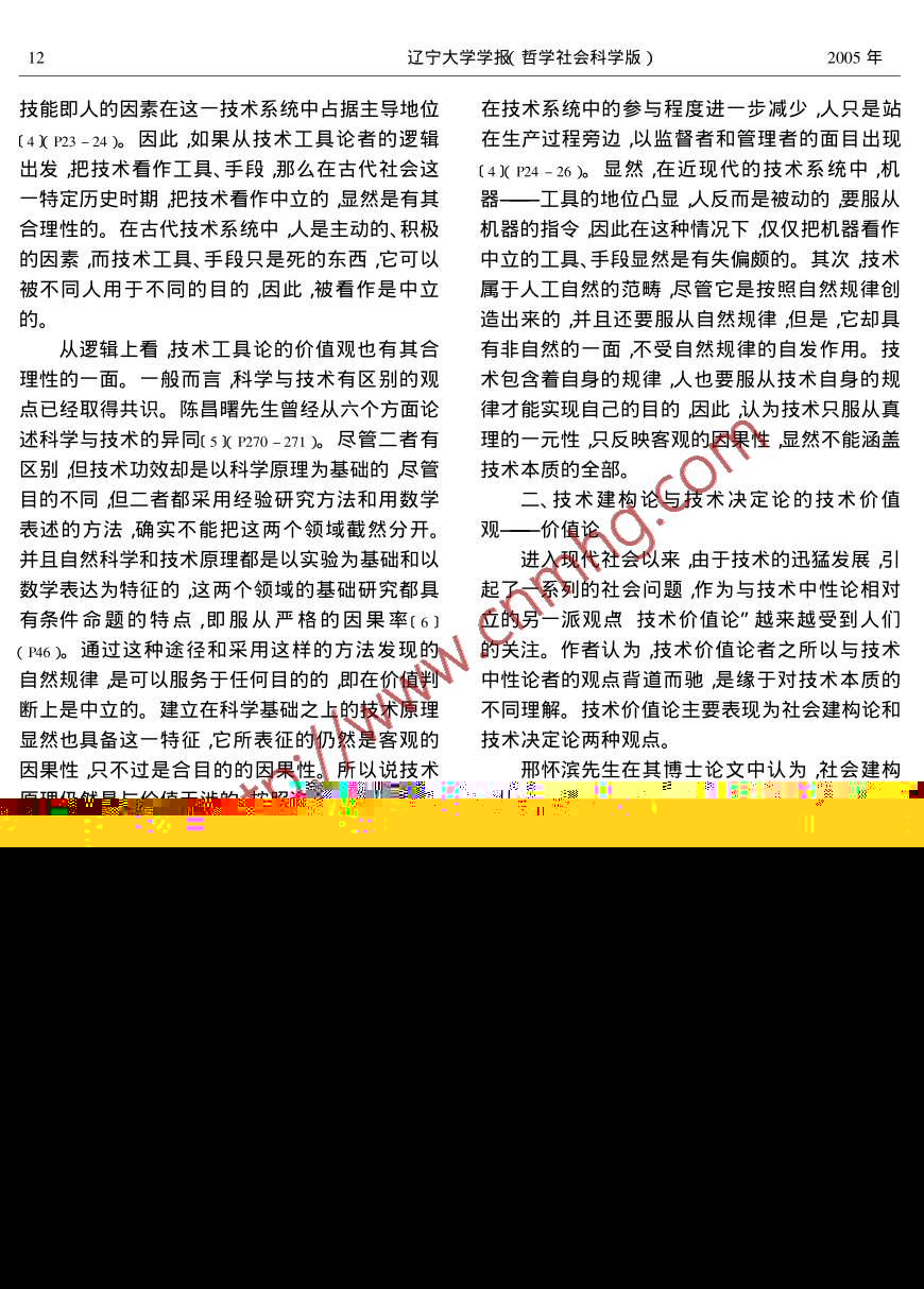 2005年3月遼寧大學(xué)學(xué)報(bào)(哲學(xué)社會(huì)科學(xué)版)Mar. 2005第33卷第2期Journal of Liaoning University ( Philosophy and Social Sciences ) Vol.33 No. 2從技術(shù)的本質(zhì)到技術(shù)的價(jià)值‘張鈴'傅暢梅( 1.沈陽(yáng)藥科大學(xué)基礎(chǔ)學(xué)院遼寧沈陽(yáng)1001606 2.沈陽(yáng)航空工業(yè)學(xué)院社科部遼寧沈陽(yáng)10034 )摘要:技術(shù)中性論與技術(shù)價(jià)值論之爭(zhēng)緣于對(duì)技術(shù)本質(zhì)的不同理解。技術(shù)工具論者片面地把技術(shù)理解為單純的工具、手段必然得出技術(shù)中性論的觀點(diǎn)。技術(shù)決定論及社會(huì)建構(gòu)論者從社會(huì)層面反思技術(shù),得出技術(shù)負(fù)載價(jià)值這-結(jié)論也有其邏輯必然性。技術(shù)過(guò)程論把技術(shù)理解為過(guò)程的存在在過(guò)程中實(shí)現(xiàn)了技術(shù)的自然屬性與社會(huì)屬性的統(tǒng)一因此 成功地消解了技術(shù)中性論與技術(shù)價(jià)值論的矛盾。關(guān)鍵詞技術(shù)中性論技術(shù)價(jià)值論技術(shù)過(guò)程論技術(shù)本質(zhì)中圖分類號(hào):B08文獻(xiàn)標(biāo)識(shí)碼:A文章編號(hào):1002 - 3291( 2005 )02 -0011 -04眾所周知,在學(xué)術(shù)界一直存在著技術(shù)中性術(shù)的應(yīng)用區(qū)別開(kāi)來(lái)技術(shù)同運(yùn)用技術(shù)所實(shí)現(xiàn)的后論( value-neutral )"與技術(shù)價(jià)值論( value-laden )"果沒(méi)有必然的聯(lián)系手槍可以打好人也可以打壞之爭(zhēng)技術(shù)到底是價(jià)值中立的純情少女”,還是人麻醉劑可以用來(lái)做外科手術(shù)又可用來(lái)謀財(cái)害技術(shù)本身就是負(fù)載價(jià)值的,是個(gè)一直都沒(méi)有厘清命(2x P289-291)。技術(shù)工具論者為支持其觀點(diǎn)所的問(wèn)題。縱觀技術(shù)中性論"者與技術(shù)價(jià)值論”提出的第二個(gè)論據(jù)即是技術(shù)手段與政治無(wú)關(guān),不者的觀點(diǎn)不難看出之所以有這樣的爭(zhēng)論主要源負(fù)載政治價(jià)值技術(shù)手段本身不包含階級(jí)性斧頭于對(duì)技術(shù)本質(zhì)的不同理解換句話說(shuō),價(jià)值中性論就是斧頭不分資本主義的斧頭還是社會(huì)主義的者與技術(shù)價(jià)值論者眼中的技術(shù)可能是根本不同斧頭作為中性的技術(shù)手段它對(duì)任何社會(huì)都起作的兩者之間存在著知識(shí)分裂”,而這一-點(diǎn)可能用[3] P37-39)。正是造成技術(shù)中性論者與技術(shù)價(jià)值論者不能達(dá)成從歷史.上看技術(shù)工具論的技術(shù)價(jià)值觀有其合觀點(diǎn)共識(shí)的根本原因。陳昌曙先生曾在關(guān)于技理性。技術(shù)是-種歷史現(xiàn)象,只有把技術(shù)工具論術(shù)是什么的對(duì)話”-文中指出弄清技術(shù)的本質(zhì)的技術(shù)價(jià)值觀放在技術(shù)歷史背景中去分析,才能是一件很難的事情”應(yīng)知難而繞”[1])(P14)。 然較客觀地對(duì)其進(jìn)行評(píng)價(jià)。在古代社會(huì),社會(huì)生產(chǎn)而對(duì)技術(shù)價(jià)值的理解技術(shù)本質(zhì)卻是-個(gè)繞不過(guò)力水平極其低下技術(shù)手段也非常落后,表現(xiàn)為去的問(wèn)題。刀、斧、鑿子等簡(jiǎn)單的手工工具。這種簡(jiǎn)單的工具一、技術(shù)工具論者的技術(shù)價(jià)值觀一中性論有著極其廣泛的適用范圍,它可以被不同人用于在技術(shù)工具論者看來(lái)技術(shù)即是工具、手段,不同的目的。生產(chǎn)過(guò)程表現(xiàn)為人直接把握I具直技術(shù)工具論者并不否認(rèn)技術(shù)的應(yīng)用和技術(shù)的應(yīng)用接作用于自然人借助工具作用于勞動(dòng)對(duì)象按照后果是有善惡之分的是存在價(jià)值判斷的但技術(shù)人自己的目的去改變它在古代技術(shù)體系中人控.本身即技術(shù)工具、手段卻是價(jià)值中立的,作 為中立制著技術(shù)手段人對(duì)技術(shù)手段擁有絕對(duì)的權(quán)利而的技術(shù)工具只有效率高低之分,而不應(yīng)從善惡等技術(shù)千段寧個(gè)梁有息木性所以,在這-技術(shù)體中國(guó)煤化工價(jià)值尺度出發(fā)去衡量它,即應(yīng)該把技術(shù)本身同技技能能工巧匠的經(jīng)驗(yàn)fYHCNM HG*收稿日期:2004-03-13作者簡(jiǎn)介張鈴( 1971- )女遼寧沈陽(yáng)人東北大學(xué)文法學(xué)院博士生沈陽(yáng)藥科大學(xué)講師。研究方向技術(shù)哲學(xué)。傅暢梅( 1972- ) 女遼寧大連人東北大學(xué)文法學(xué)院博士生沈陽(yáng)航空工業(yè)學(xué)院講師研究方向科學(xué)技術(shù)與社會(huì),技術(shù)倫理。遼寧大學(xué)學(xué)報(bào)(哲學(xué)社會(huì)科學(xué)版)2005年技能即人的因素在這-技術(shù)系統(tǒng)中占據(jù)主導(dǎo)地位在技術(shù)系統(tǒng)中的參與程度進(jìn)一步減少,人只是站[4X(P23-24)。 因此,如果從技術(shù)工具論者的邏輯在生產(chǎn)過(guò)程旁邊,以監(jiān)督者和管理者的面目出現(xiàn)出發(fā)把技術(shù)看作工具、手段那么在古代社會(huì)這[4)(P24-26)。顯然,在近現(xiàn)代的技術(shù)系統(tǒng)中,機(jī)一特定歷史時(shí)期把技術(shù)看作中立的顯然是有其器一工具的地位凸顯 人反而是被動(dòng)的要服從合理性的。在古代技術(shù)系統(tǒng)中人是主動(dòng)的、積極機(jī)器的指令,因此在這種情況下,僅 僅把機(jī)器