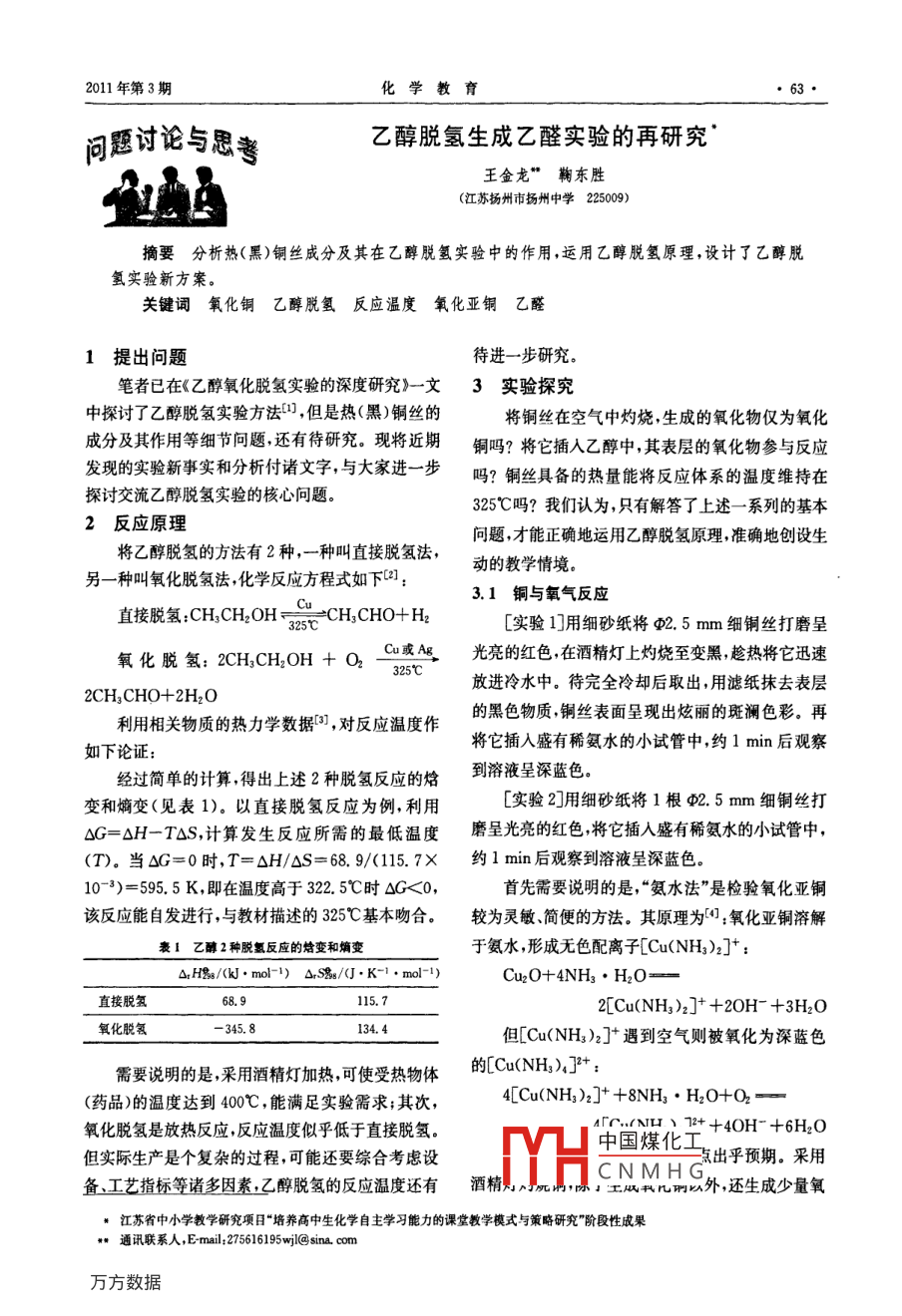 2011年第3期化學(xué)教育問思討論與思乙醇脫氫生成乙醛實驗的再研究王金龍“鞠東勝(江蘇揚州市揚州中學(xué)225009摘要分析熱(黑)銅絲成分及其在乙醇脫氫實驗中的作用,運用乙醇脫氫原理,設(shè)計了乙醇脫氫實驗新方案。關(guān)鍵詞氧化銅乙醇脫氫反應(yīng)溫度氧化亞銅乙醛1提出問題待進一步研究。筆者已在《乙醇氧化脫氫實驗的深度研究》一文3實驗探究中探討了乙醇脫氫實驗方法,但是熱(黑)銅絲的將銅絲在空氣中灼燒,生成的氧化物僅為氧化成分及其作用等細節(jié)問題還有待研究?,F(xiàn)將近期銅嗎?將它插入乙醇中,其表層的氧化物參與反應(yīng)發(fā)現(xiàn)的實驗新事實和分析付諸文字,與大家進一步嗎?銅絲具備的熱量能將反應(yīng)體系的溫度維持在探討交流乙醇脫氫實驗的核心問題。325℃嗎?我們認(rèn)為,只有解答了上述一系列的基本2反應(yīng)原理問題,才能正確地運用乙醇脫氫原理準(zhǔn)確地創(chuàng)設(shè)生將乙醇脫氫的方法有2種,一種叫直接脫氫法,動的教學(xué)情境另一種叫氧化脫氫法,化學(xué)反應(yīng)方程式如下23.1銅與氧氣反應(yīng)直接脫氫:CH3CH2OH= CH3 CHO+H2[實驗1]用細砂紙將φ2.5mm細銅絲打磨呈氧化脫氫:2 CH3 CH, OH+O,Cu或A光亮的紅色,在酒精燈上灼燒至變黑趁熱將它迅速放進冷水中。待完全冷卻后取出,用濾紙抹去表層2CH3 CHO-+2H,O利用相關(guān)物質(zhì)的熱力學(xué)數(shù)據(jù),對反應(yīng)溫度作*它插入盛有精水的小試管中,約1m后觀察經(jīng)過簡單的計算得出上述2種脫氫反應(yīng)的焓到溶液呈深藍色變和熵變(見表1)。以直接脫氫反應(yīng)為例,利用實驗2]用細砂紙將1根φ2.5mm細銅絲打△G=△H-T△S,計算發(fā)生反應(yīng)所需的最低溫度磨呈光亮的紅色將它插入盛有稀氨水的小試管中,(T)。當(dāng)△G=0時,T=△H/△S=68.9/(115.7×約1min后觀察到溶液呈深藍色0-3)=595.5K,即在溫度高于322.5℃時△G<0首先需要說明的是,“氨水法”是檢驗氧化亞銅該反應(yīng)能自發(fā)進行,與教材描述的325℃基本吻合。較為靈敏簡便的方法。其原理為:氧化亞銅溶解表1乙醇2種脫氫反應(yīng)的變和熵變于氨水形成無色配離子[Cu(NH)2]:△H3/(kJ·mol-1)△S88/(J·K-1·mol-1)Cu2O+4NH3·H2O=直接脫氫115.72LCu(NH3)2]++20H-+3H20氧化脫氫345.8134.4但[Cu(NH3)2]遇到空氣則被氧化為深藍色需要說明的是,采用酒精燈加熱可使受熱物體的[Cu(NH3)4]2+:(藥品)的溫度達到400℃,能滿足實驗需求;其次,4[Cu(NH3)2]++8NH3·H2O+O2=氧化脫氫是放熱反應(yīng),反應(yīng)溫度似乎低于直接脫氫。A「C,NL12++4OH-+6H2O中國煤化工但實際生產(chǎn)是個復(fù)雜的過程,可能還要綜合考慮設(shè)出乎預(yù)期。采用CNMH備、工藝指標(biāo)等諸多因素乙醇脫氫的反應(yīng)溫度還有酒精八,工我?guī)装∫酝膺€生成少量氧江蘇省中小學(xué)教學(xué)研究項目“培養(yǎng)高中生化學(xué)自主學(xué)習(xí)能力的課堂教學(xué)模式與策略研究”階段性成果通訊聯(lián)系人,Emal:275616195wl@ sina, com化學(xué)教育2011年第3期化亞銅。同時,用砂紙打磨銅除去表層氧化膜時磨量氧化物首先氧化乙醇生成少量乙醛。由于乙醇沸擦促使溫度升高,銅幾乎瞬間即被氧化。那么將熱點(78.3℃)低銅絲具有的高熱量主要用于乙醇的(黑)銅絲插人乙醇中,其表層氧化物與乙醇發(fā)生了沸騰蒸發(fā)并使之脫離反應(yīng)體系,銅與乙醇很難同時怎樣的反應(yīng)呢?達到325℃,進一步發(fā)生銅催化乙醇脫氫的可能性32乙醇與氧化亞銅、氧化銅反應(yīng)不高。即便發(fā)生了局部的短暫的脫氫反應(yīng),又由于3.2.1實驗步驟和現(xiàn)象乙醛沸點(20.8℃)較乙醇更低,前者停留在后者中(1)如圖1所示,在大試管底部放置1團棉花,的可能性更是微乎其微。滴入半滴管無水乙醇;放置1團石棉絨,加入2藥匙3.3乙醇直接脫氫法氧化亞銅或氧化銅然后再放置1團石棉絨以防止3.3.1實驗操作、現(xiàn)象與結(jié)論藥品粉末進入導(dǎo)氣管。導(dǎo)管末端插入盛有1mL水(1)如圖2所示,在大試管中依次放入1團棉的小試管中?;?、半滴管無水乙醇和細銅絲團。將試管水平固定在鐵架臺上,導(dǎo)管末端插入盛有1mL水的小試管①②@④中細銅絲團酒精棉團①酒精棉團,②④石棉絨,③銅的氧化物,⑤水水圖1銅的氧化物使乙醇脫氯實驗裝置簡圖(2)對準(zhǔn)氧化亞銅或氧化銅部位加熱,水中不斷田2銅催化乙醇脫氯實驗裝置簡圖有氣泡冒出。乙醇因間接受熱快速揮發(fā),其蒸氣與(2)用酒精燈對準(zhǔn)銅絲部位加熱,觀察到不斷有氧化亞銅或氧化銅接觸。一會幾,觀察到試管內(nèi)壁氣泡從水中冒出。加熱3min后即可停止反應(yīng)。均出現(xiàn)光亮的銅鏡(3)在1mL新制銀氨溶液中加人10~15滴小(3)加熱3min后,即可停止反應(yīng)。在1mL新試管中的溶液振蕩,用沸水浴加熱,約1min后試制銀氨溶液中加入10滴小試管中的溶液振蕩,用管內(nèi)壁出現(xiàn)光亮的銀鏡說明小試管中有乙醛。沸水浴加熱,約45s后試管內(nèi)壁均出現(xiàn)光亮的銀3.3.2分析評價鏡。在《乙醇氧化脫氫實驗的深度研究》中使用氣唧3.2.2結(jié)論鼓入空氣時口,帶走了部分熱量,會降低反應(yīng)溫度進在加熱的條件下,氧化亞銅和氧化銅都使乙醇而降低乙醇脫氫速率。乙醇直接脫氫實驗則具有加脫氫生成乙醛水和銅,化學(xué)反應(yīng)方程式如下:熱時間短、反應(yīng)溫度穩(wěn)定、能清晰地表明銅做催化