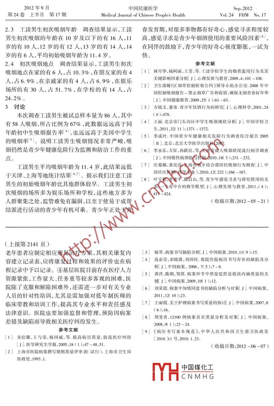 2012年9月中國民康醫(yī)學(xué)Sep,2012第24卷上半月第17期Medical Journal of Chinese Peoples HealthVol.24 FHM No. 17的投人,逐步提高職工的工作積極性,進(jìn)而提高精神參考文獻(xiàn)衛(wèi)生服務(wù)質(zhì)量。[1] 黎舉紅,毛文軍.成都市精神衛(wèi)生機(jī)構(gòu)服務(wù)人員現(xiàn)狀[ J].四川醫(yī)學(xué),2008 ,7( 29 ):928 -929.總之,醫(yī)師人力資源是保證醫(yī)療質(zhì)量的基礎(chǔ),也[2] 耿嵐.精神衛(wèi)生人才現(xiàn)狀與開發(fā)對策[ J].中國醫(yī)院,2007 ,3是人類精神健康和保證生命質(zhì)量的重要資源,因此(1):38 -40.加強(qiáng)精神科醫(yī)師的培養(yǎng),提高待遇保證他們學(xué)以致[3]秦小榮,毛文軍.成都市精神衛(wèi)生機(jī)構(gòu)服務(wù)人員現(xiàn)狀[J].四川用,極大地發(fā)揮科學(xué)技術(shù)作用,使他們在面對機(jī)遇與醫(yī)學(xué),2006 ,27( 7 ):704 -705.挑戰(zhàn)并存的嶄新世紀(jì),很快適應(yīng)時(shí)代的需要,不斷完[4]林海程,林勇強(qiáng),馬光瑜.廣東精神衛(wèi)生機(jī)構(gòu)從業(yè)人員的現(xiàn)狀調(diào)查[ J].中華醫(yī)院管理,2006,(3 ):199 -200.善專業(yè)技能,提高科研與創(chuàng)新能力,為發(fā)展精神科事[5] 譚友國,當(dāng)前我國精神衛(wèi)生工作的現(xiàn)狀和對策[ J].中國衛(wèi)生業(yè)做出應(yīng)有的貢獻(xiàn)。事業(yè)管理,2004,( 6 ):364 -366.(收稿日期:2012 -05 -24 ).[調(diào)查報(bào)告]河南省工讀男生吸煙行為調(diào)查王長虹',李昊”,鄒楓”,張捷2( 1.新鄉(xiāng)醫(yī)學(xué)院第二臨床學(xué)院,河南 新鄉(xiāng)453003 ;2.新鄉(xiāng)醫(yī)學(xué)院心理學(xué)系)l摘要]目的:了解工讀男生吸煙行為現(xiàn)狀,為制定控?zé)煷胧┨峁┛茖W(xué)依據(jù)。方法:2011年4月,采用集體自填問卷調(diào)查方法,對選取對象進(jìn)行“被試基本信息調(diào)查表”和“青少年吸煙行為問卷”調(diào)查,以了解工讀生吸煙行為現(xiàn)狀。結(jié)果:工讀男生吸煙比率為67%,且無論嘗試吸煙現(xiàn)在吸煙還是近1個(gè)月超過20天吸煙的人數(shù)比率,工讀生都顯著高于非工讀生。工讀男生平均初始吸煙年齡為11.4歲,初次吸煙地點(diǎn)多在娛樂場所和學(xué)校。結(jié)論:工讀男生吸煙情況較為嚴(yán)峻,且初始吸煙年齡較小,初始地點(diǎn)多為人多聚集處。[關(guān)鍵詞]工讀男生;吸煙行為;調(diào)查doi: 10. 3969/j. issn. 1672 - 0369.2012. 17. 049中圖分類號(hào): R163 .文獻(xiàn)標(biāo)識(shí)碼: B文章編號(hào):1672 -0369( 2012 )17 -2144 -02目前,青少年吸煙、飲酒等物質(zhì)濫用行為已日益為重度吸煙。嚴(yán)重,12~18歲在校學(xué)生的吸煙率為12.2%~2結(jié)果.51. 9%1,不僅如此,青少年的物質(zhì)濫用行為還呈逐2.1 工讀學(xué)生吸煙人數(shù) 調(diào)查結(jié)果顯示,工讀生中年增加和低齡化的趨勢(2-31。我國有關(guān)青少年物質(zhì)共有58人吸煙,所占比例為67%。濫用行為的研究主要集中在普通中學(xué)生和18歲以2.2 工讀學(xué)生與非工讀學(xué)生吸煙相關(guān)行為報(bào)告率下的校外青少年中,很少有研究關(guān)注在校生中的特本次被調(diào)查學(xué)生中,不管出于任何目的,進(jìn)行嘗試殊群體一工讀學(xué)生的物質(zhì)濫用行為。本文旨在通過吸煙的工讀生有16人,占調(diào)查總數(shù)的18. 6% ;而現(xiàn)了解工讀學(xué)生吸煙現(xiàn)狀,為制定控?zé)煷胧┨峁┛茖W(xué)在仍在吸煙的有22人,占25.6%;近1個(gè)月吸煙超依據(jù)。過20天的有20人,占23.2%。對于非工讀生而言,1研究方法進(jìn)行嘗試吸煙的有1人,占調(diào)查總數(shù)的0.9% ;現(xiàn)在1.1 研究對象 選擇河南省鄭州市工讀學(xué)校和洛仍在吸煙的有2人,占1.9% ;近1個(gè)月吸煙超過20陽市工讀學(xué)校的初一、初二在校男生86人與河南師天的有6人,占5.6%,見表1。經(jīng)過卡方檢驗(yàn),無論范大學(xué)實(shí)驗(yàn)中學(xué)初一、初二在校男生107人參加本嘗試吸煙、現(xiàn)在吸煙還是近1個(gè)月超過20天吸煙的次調(diào)查,由于工讀學(xué)校女生人數(shù)過少,故被試全為男人數(shù)比率,工讀生都顯著高于非工讀生。生。中國煤化工煙相關(guān)行為報(bào)告率/%1.2 研究工具2011年4月,采用集體自填問卷調(diào)|YHCNMH G現(xiàn)在吸煙近1個(gè)月≥20天吸煙查方法,對選取對象進(jìn)行“青少年吸煙行為問卷”調(diào)工讀學(xué)生818. 625.623.2*查。指標(biāo)含義:在過去曾經(jīng)吸過煙,為嘗試吸煙;在非工讀學(xué)生070.91.95.6過去30天中,≥1天吸煙為現(xiàn)在吸煙,≥20天吸煙*:P<0.001。21442012年9月中國民康醫(yī)學(xué)Sep,2012第24卷上半月第17期Medical Journal of Chinese Peoples HealthVol.24 FHM No. 172.3工讀男生初次吸煙年齡調(diào)查結(jié)果顯示,工讀春發(fā)育期,對很多事物都有好奇心,感覺尋求程度較男生初次吸煙的年齡在10歲及以下的有16人,11高,感覺尋求是青少年煙酒使用的重要風(fēng)險(xiǎn)因素[8],歲的有10人,12歲的有12人,13歲的有14 人,14在同伴的鼓勵(lì)下,青少年的好奇心極度膨脹,一試為歲的有6人,平均初始吸煙年齡為11.4歲???。2.4 初次吸煙地點(diǎn) 調(diào)查結(jié)果顯示,工讀男生初次吸煙地點(diǎn)在家的有6人,占10. 3% ,在朋友家的有4[1]林丹華,楊阿麗,王芳,等.工讀學(xué)校學(xué)生的物質(zhì)濫用行為及其人,占6.9% ,在親戚家的有4人,占6.9% ,在娛樂關(guān)鍵影響因素分析[ J ].心理發(fā)展與教