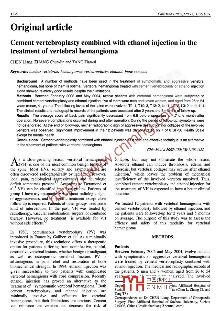 1136Chin Med j 2007: 120(13 ) 1136-1139Original articleCement vertebroplasty combined with ethanol injection in thetreatment of vertebral hemangiomaCHEN Liang, ZHANG Chun-lin and TANG Tian-siKeywords: lumbar vertebrae; hemangioma; vertebroplasty; ethanol; bone cementsBackground A number of methods have been used in the treatment of symptomatic and aggressive vertebralhemangioma, but none of them is optimal. Vertebral hemangioma treated with cement vertebroplasty or ethanol injectionhe showed relatively good results despite their limitationsMethods Between February 2002 and May 2004, twelve patients with vertebral hemangioma were subjected tocombined cement vertebroplasty and ethanol injection, five of them were men and seven women, and aged from 26 to 54years(mean, 41 years). The following levels of the spine were involved: T9: 1, T10: 3, T12: 2, L1: 1, L2: 2, L3: 2 and L4: 1The clinical results and radiographic records of the patients were assessed after 2 years and 5 months of follow-upResults The average score of back pain significantly decreased from 6.5 before operation to 1.7 one month afteroperation. No severe complications occurred during and after operation. During the period of follow-up, symptoms werenot deteriorated. At the end of follow-up, neither radiographic sign of aggressive destruction nor collapse of the involvedvertebra was observed. Significant improvement in the 12 patients was demonstrated on 7 of 8 SF-36 Health Scaleexcept for mental healthConclusions Cement vertebroplasty combined with ethanol injection as a safe and effective technique is an alternativeto the treatment of patients with vertebral hemangiomaChin Med J2007;120(13):136-1139As a slow-growing lesion, vertebral hemangioma collapse, but may not obliterate the whole lesion(VH) is one of the most common benign tumors of Absolute ethanol can induce thrombosis, edema andthe spine. Most HVs, solitary and asymptomatic, are sclerosis, but vertebral collapse may occure after ethanoloften discovered radiographically by incident. However, injection, which leaves the problem of mechanicallocal pain, radiological aggressiveness and neurologic insufficiency of the involved vertebra unsolved. Thusdeficit sometimes present. According to Deramond et combined cement vertebroplasty and ethanol injection foral, VHs can be classified into four groups. Patientthe treatment of vh is expected to have a better clinicalgroup I have asymptomatic VH without radiologicoutcomeof aggressiveness, and no specific treatment except closefollow-up is required. Patients of other groups need some We treated 12 patients with vertebral hemangioma withkind of intervention. In the past, VH was treated by cement vertebroplasty followed by ethanol injection, andradiotherapy, vascular embolization, surgery, or combined the patients were followed-up for 2 years and 5 monthstherapy. However, no treatment is available for VH on average. The purpose of this study was to assess thewithout side effectsefficacy and safety of this modality for vertebrhemangiomaIn 1987, percutaneous vertebroplasty (Pv)wasintroduced in France by Galibert et al. As a minimallyMETHODSinvasive procedure, this technique offers a therapeuticoption for patients suffering from noninfective, painfuL, Patientsdestructive vertebral lesions, whether benign or malignant, Between February 2002 and May 2004, twelve patientsas well as osteoporotic vertebral fracture. Pv is with symptomatic or aggressive vertebral hemangiomaadvantageous in pain relief and restoration of bone were treated by cement vertebroplasty combined withbiomechanical strength. In 1994, ethanol injection was ethanol injection. The medical and radiographic records ofgiven successfully to two patients with complicatedthe patients, 5 men and 7 women, aged from 26 to 54vertebral hemangioma with cord compression. Recently yeaethanol injection has proved an alternative to the中國(guó)煤化 taye. ine votedtreatment of symptomatic vertebral hemangioma. Both DeparCNMH Girs Afiliated Hospital ofcement vertebroplasty and ethanol injection areTang TS)can reinforce the vertebra and decrease the risk of 215006, China(Email: chenliangnal. comChinese Medical Joumal 2007: 120(13 ) 1136-1139levels of the spine included T9: 1, T10; 3, T12: 2, Ll: 1, average (1 year and 6 months-3 years and 9 months)L2: 2, L3: 2 and LA: 1. According to Deramond's Medical Outcome Trust Short-Form 36 (SF-36)classification, seven patients belonged to group 2 and five questionnaire including 8 scales such as physical function,belonged to group 3. The vertebral body was involved in bodily pain and mental health was used for patienteach patient, while the tumor spreaded to the pedicle in 3 based outcome analysis. These data were converted aspatients. Before the operation, each patient was asked to recommended by Ware to a transformed scale of 0 to 100,complete visual numerical scales rating their average the higher score indicating better resultsback pain (0-10), which was coded as 0: none, 5moderate and 10: most severe. All patients underwent Statistical analysisX-ray examination and CT of the involved level All data were expressed as mean t standard deviation(SD). Comparison was made by Studen's I test. Theresults were considered significant when a P value wasSurgical procedureless than 0.05For the first 2 patients, we performed aangiography to identify and embolize the feedingRESULTSof the tumor before operation. For the other 10this procedure was abandoned, Percutaneous All patients were operated on via a bipedicular technique,vertebroplasty was performed under local anesthesia by a one side for cement vertebroplasty and the other for ethanolbilateral transpedicular approach (one side for cement injection. The average operation time for each level wavertebroplasty, the opposite side for ethanol injection). 52 minutes(40-80 minutes). Neither violation of the wallThis technique was safe only under high-quality of the pedicle and neurologic complication 