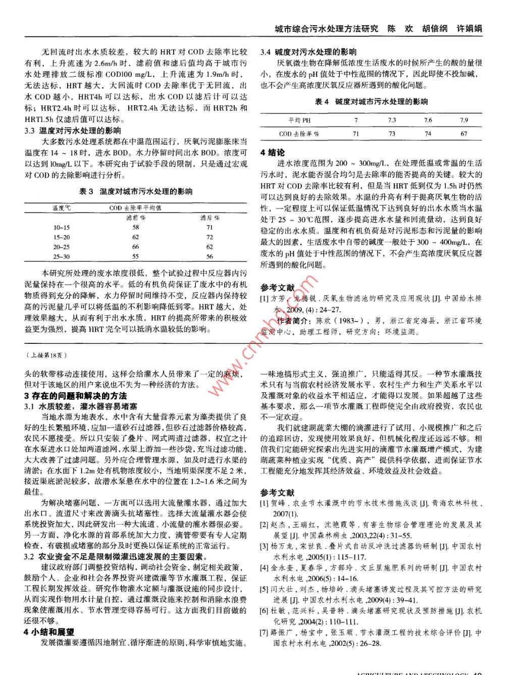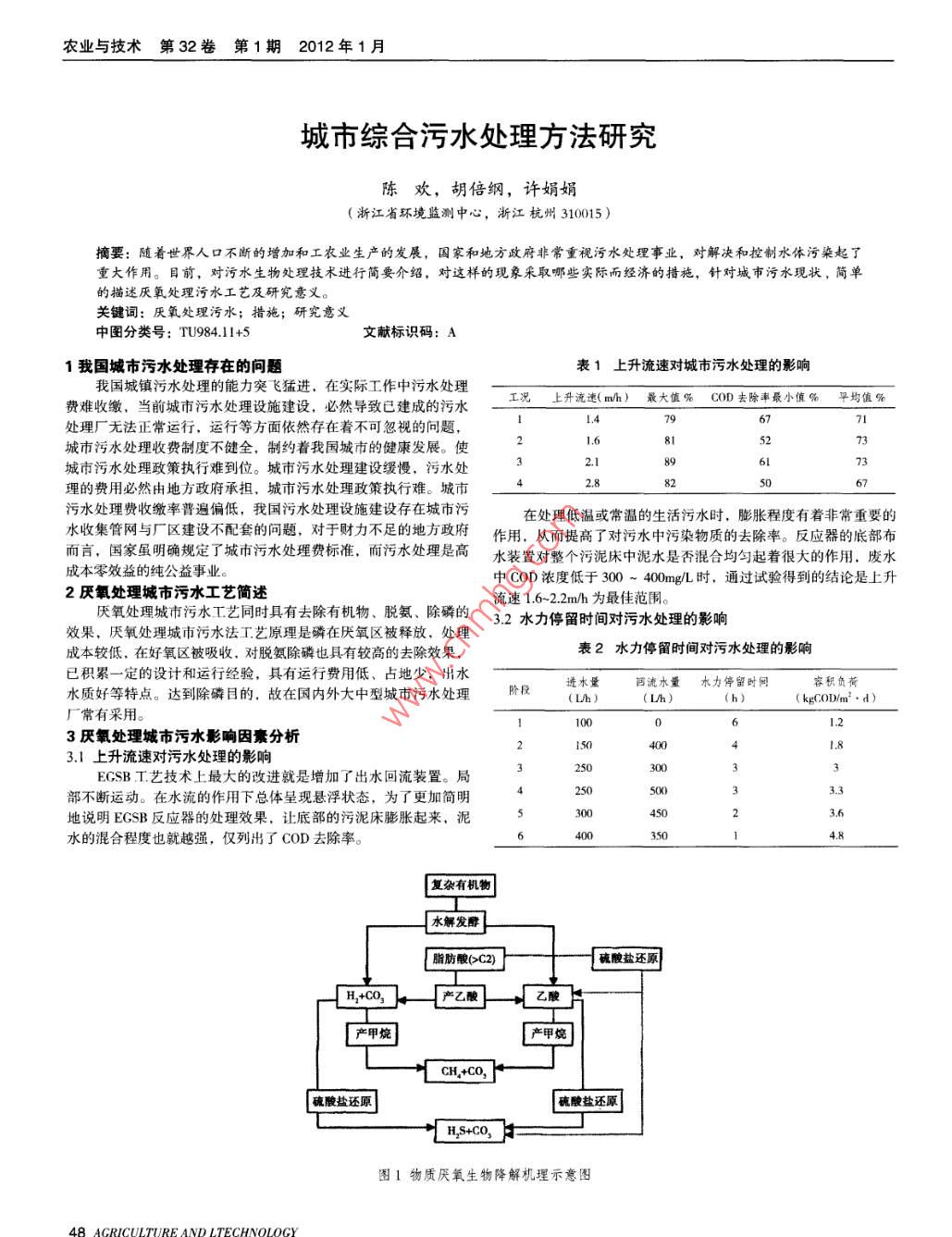 農(nóng)業(yè)與技術(shù)第32卷第1期2012年1月城市綜合污水處理方法研究陳歡,胡倍綱,許娟娟(浙江省環(huán)境監(jiān)測中心,浙江杭州310015)摘要:隨著世界人口不斷的增加和工農(nóng)業(yè)生產(chǎn)的發(fā)展,國家和地方政府非常重視污水處理事業(yè),對解決和控制水體污染起了重大作用。目前,對污水生物處理技術(shù)進(jìn)行簡要介紹,對這樣的現(xiàn)象釆取哪些實(shí)際而經(jīng)濟(jì)的措施,針對城市污水現(xiàn)狀,簡單的描述厭氧處理污水工藝及研究意義。關(guān)鍵詞:厭氧處理污水;措施;研究意義中圖分類號;TU98411+5文獻(xiàn)標(biāo)識碼:A1我國城市污水處理存在的問題表1上升流速對城市污水處理的影響我國城鎮(zhèn)污水處理的能力突飛猛進(jìn),在實(shí)際工作中污水處理工況上升流遨(m)最大值%COD費(fèi)難收繳,當(dāng)前城市污水處理設(shè)施建設(shè),必然導(dǎo)致已建成的污水率最小值%早均值%處理廠無法正常運(yùn)行,運(yùn)行等方面依然存在著不可忽視的問題城市污水處理收費(fèi)制度不健全,制約著我國城市的健康發(fā)展。使城市污水處理政策執(zhí)行難到位。城市污水處理建設(shè)緩慢,污水處理的費(fèi)用必然由地方政府承擔(dān),城市污水處理政策執(zhí)行難。城市污水處理費(fèi)收繳率普遍偏低,我國污水處理設(shè)施建設(shè)存在城市污在處理低溫或常溫的生活污水時,膨脹程度有著非常重要的水收集管網(wǎng)與廠區(qū)建設(shè)不配套的問題,對于財力不足的地方政府作用,從而提高了對污水中污染物質(zhì)的去除率。反應(yīng)器的底部布而言,國家雖明確規(guī)定了城市污水處理費(fèi)標(biāo)準(zhǔn),而污水處理是高水裝置對整個污泥床中泥水是否混合均勻起著很大的作用,廢水成本零效益的純公益事業(yè)中COD濃度低于300~400mg/L時,通過試驗得到的結(jié)論是上升2厭氧處理城市污水工藝簡述流速1.6-2.2m/h為最佳范圍。厭氧處理城市污水工藝同時具有去除有機(jī)物、脫氨、除磷的32水力停留時間對污水處理的影響效果,厭氧處理城市污水法工藝原理是磷在厭氧區(qū)被釋放,處理成本較低,在好氧區(qū)被吸收,對脫氨除磷也具有較高的去除效果,表2水力停留時間對污水處理的影響已積累一定的設(shè)計和運(yùn)行經(jīng)驗,具有運(yùn)行費(fèi)用低、占地少,出水水質(zhì)好等特點(diǎn)。達(dá)到除磷目的,故在國內(nèi)外大中型城市污水處理階段進(jìn)水量回流水量水力停留時間容積負(fù)荷(L/h)(Lh)(h)( kgcoD/m2·d)廠常有采用。3厭氧處理城市污水影響因素分析3.1上升流速對污水處理的影響EGSB工藝技術(shù)上最大的改進(jìn)就是增加了出水回流裝置。局部不斷運(yùn)動。在水流的作用下總體呈現(xiàn)懸浮狀態(tài),為了更加簡明地說明EGSB反應(yīng)器的處理效果,讓底部的污泥床膨脹起來,泥300水的混合程度也就越強(qiáng),僅列出了COD去除率。350復(fù)雜有機(jī)物水解發(fā)酵仁脂肪酸(>C2)硫艘鹽還原+co產(chǎn)甲烷產(chǎn)甲烷CH+C酸鹽還原硫酸鹽還原H2 S+co,圖1物質(zhì)厭氧生物降解機(jī)理示意圖城市綜合污水處理方法研究陳歡胡倍綱許娟娟無回流時出水水質(zhì)較差,較大的HRT對COD去除率比較3.4堿度對污水處理的影響有利,上升流速為26m/h時,濾前值和濾后值均高于城市污厭氧微生物在降解低濃度生活廢水的時候所產(chǎn)生的酸的量很水處理排放二級標(biāo)準(zhǔn)coD00mgL,上升流速為1.9m/h時,小,在廢水的pH值處于中性范圍的情況下,因此即使不投加堿,無法達(dá)標(biāo),HRT越大,大回流時COD去除率優(yōu)于無回流,出也不會產(chǎn)生高濃度厭氧反應(yīng)器所遇到的酸化問題水COD越小,HRT4h可以達(dá)標(biāo),出水COD以濾后計可以達(dá)標(biāo);HRT24h時可以達(dá)標(biāo),HRT24h無法達(dá)標(biāo),而HRT2h和表4堿度對城市污水處理的影響HRT5h僅濾后值可以達(dá)標(biāo)。平均PH7.37.633溫度對污水處理的影響OD去除率%7174大多數(shù)污水處理系統(tǒng)都在中溫范圍運(yùn)行,厭氧污泥膨脹床當(dāng)溫度在14~18時,進(jìn)水BOD。水力停留時間出水BOD。濃度可4結(jié)論以達(dá)到omg/L以下。本研究由于試驗手段的限制,只是通過宏觀進(jìn)水濃度范圍為200~300mg,在處理低溫或常溫的生活對COD的去除影響進(jìn)行分析污水時,泥水能否混合均勻是去除率的能否提高的關(guān)鍵。較大的表3溫度對城市污水處理的影響HRT對COD去除率比較有利,但是當(dāng)HRT低到僅為15h時仍然可以達(dá)到良好的去除效果。水溫的升高有利于提高厭氧生物的活溫度℃COD去除率平均值性,一定程度上可以保證低溫情況下達(dá)到良好的出水水質(zhì)當(dāng)水溫濾前%處于25~30℃范圍,逐步提高進(jìn)水水量和回流量動,達(dá)到良好10~15穩(wěn)定的出水水質(zhì)。溫度和有機(jī)負(fù)荷是對污泥形態(tài)和污泥量的影響15~206220-25最大的因素,生活廢水中自帶的堿度一般處于300-400mgL,在25-30廢水的pH值處于中性范圍的情況下,不會產(chǎn)生高濃度厭氧反應(yīng)器所遇到的酸化問題。本研究所處理的廢水濃度很低,整個試驗過程中反應(yīng)器內(nèi)污泥量保持在一個很高的水平。低的有機(jī)負(fù)荷保證了廢水中的有機(jī)參考文獻(xiàn)物質(zhì)得到充分的降解,水力停留時間維持不變,反應(yīng)器內(nèi)保持較山1方芳,龍騰銳,厭氧生物