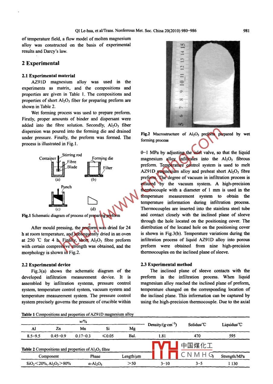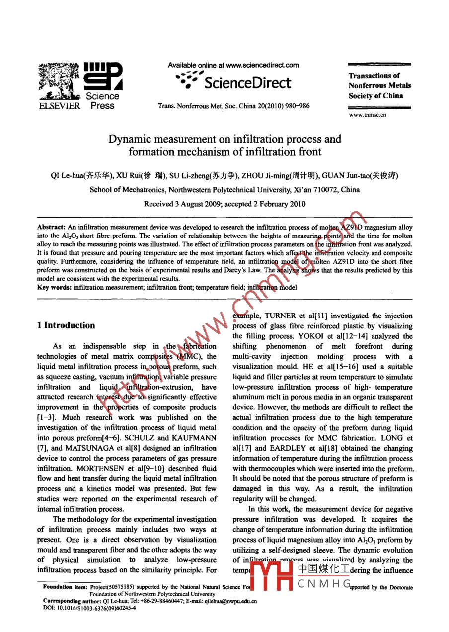 Available online at www.sciencedirect.comTransactions of罵ScienceDirectNonferrous MetalsSociety of ChinaEL SEVIER PressTrans. Nonferrous Met. Soc. China 20(2010) 980-986www.nmsc.cnDynamic measurement on infiltration process andformation mechanism of infiltration frontQI Le-hua(齊樂華),XU Rui(徐瑞), sU Li-zheng(蘇力爭), ZHOU ji-ming(周計明), GUAN Jun-tao(關(guān)俊濤)School of Mechatronics, Northwestern Polytechnical University, Xi'an 710072, ChinaReceived 3 August 2009; accepted 2 February 2010Abstract: An infiltration measurement device was developed to research the infiltration process of molten AZ9ID magnesium alloyinto the Al2O3 short fbre preform. The variation of relationship between the heights of measuring points and the time for moltenalloy to reach the measuring points was ilustrated. The effect of infilration process parameters on the infiltration front was analyzed.It is found that pressure and pouring temperature are the most important factors which affect the infiltration velocity and compositequality. Furthermore, considering the infuence of temperature field, an infiltration model of molten AZ91D into the short fibrepreform was constructed on the basis of experimental results and Darcy's Law. The analysis shows that the results predicted by thismodel are consistent with the experimental results.Key words: infiltration measurement; infiltration front; temperature field; infltration modelexample, TURNER et al[1] investigated the injection1 Introductionprocess of glass fibre reinforced plastic by visualizingthe flling process.YOKOI et al[12-14] analyzed theAs an indispensable step in the fabricationshifing phenomenon of melt forefront duringtechnologies of metal matrix composites (MMC), themulti-cavity injection molding processliquid metal infilration process in porous preform, suchvisualization mould. HE et al[15-16] used a suitableas squeeze casting, vacuum infiltration, variable pressureliquid and filler particles at room temperature to simulateinfiltration and liquid infiltration- extrusion, havelow-pressure infiltration process of high- temperatureattracted research interest due to significantly effectivealuminum melt in porous media in an organic transparentimprovement in the properties of composite productsdevice. However, the methods are difficult to reflect the[1-3]. Much research work was published on theactual infitration process due to the high temperatureinvestigation of the infiltration process of liquid metalcondition and the opacity of the preform during liquidinto porous preform[4- 6]. SCHULZ and KAUFMANNinfiltration processes for MMC fabrication. LONG et[7], and MATSUNAGA et al[8] designed an infiltrational[17] and EARDLEY et a[18] obtained the changingdevice to control the process parameters of gas pressureinformation of temperature during the infiltration processinfilration. MORTENSEN et a[9 - -10] described fluicwith thermocouples which were inserted into the preform.flow and heat transfer during the liquid metal infiltrationIt should be noted that the porous structure of preform isprocess and a kinetics model was presented. But fewdamaged in this way. As a result, the infiltrationstudies were reported on the experimental research ofregularity will be changed.intermnal infilration process.In this work, the measurement device for negativeThe methodology for the experimental investigationpressure infilration was developed. It acquires theof infiltration process mainly includes two ways atchange of temperature information during the infiltrationpresent. One is a direct observation by visualizationprocess of liquid magnesium alloy into Al2O3 preform bymould and transparent fiber and the other adopts the wayutilizing a self- designed sleeve. The dynamic evolutionof physical simulation to analyze low-pressureof infiltration nrcece was vinalized by analyzing theinfiltration process based on the similarity principle. Fortemp中國煤化工dering the influenceFoundntion item: Project(50575185) supported by the National Natual Science FoTYHCNMHGoporedbytheDoteFoundation of Northwestern Polytechnical UniversityCorresponding author: QI Le-hua; Tel: +86. 29-88460447; E-mail: qilehua@nwpu.cdu.cnDOI: 10.1016/S1003-6326(09)60245-4QI Le-hua, et al/Trans. Nonferrous Met. Soc. China 20(2010) 980-986981of temperature field, a flow model of molten magnesiumalloy was constructed on the basis of experimentalnresults and Darcy's law.2 Experimental2.1 Experimental materialAZ9ID magnesium alloy was used in thexperiments as matrix, and the compositions andproperties are given in Table 1. The compositions andproperties of short Al2O3 fiber for preparing preform areshown in Table 2.Wet forming process was used to prepare preform.Firstly, proper amounts of binder and dispersant wereadded into the fibre solution. Secondly, Al2O3 fberdispersion was poured into the forming die and drainedFig.2 Macrotructure of Al2O3 preform prepared by wetunder pressure. Finally, the preform was formed. Theforming processprocess is ilustrated in Fig.1.0- -1 MPa by adjusting the inlet valve, so that the liquidContainerStirring rodForming diemagnesium alloy infiltrates into the Al2O3 fbrous, Fibre。Bladeiterpreform. Temperature control system is used to meltAZ91D magnesium alloy and preheat short Al2O3 fbrepreform. The degree of vacuum in infiltration process is(aensured by the vacuum system. A high-precisionPunchthermocouple with a diameter of 1 mm is used in thetemperature measurement system to obtain thetemperature information during infiltration process.口(c(d)Thermocouples are inserted into the stainless steel tubeFig.1 Schematic diagram of process of preparing preformand contact closely with the inclined plane of sleevethrough the hole located on the positioning cover. TheAfter mould pressing, the preform was dried for 24distribution of the located hole on the positioning coverh at room temperature, and subsequently dried in an ovenis sbown in Fig.3(b). Temperature variations durin