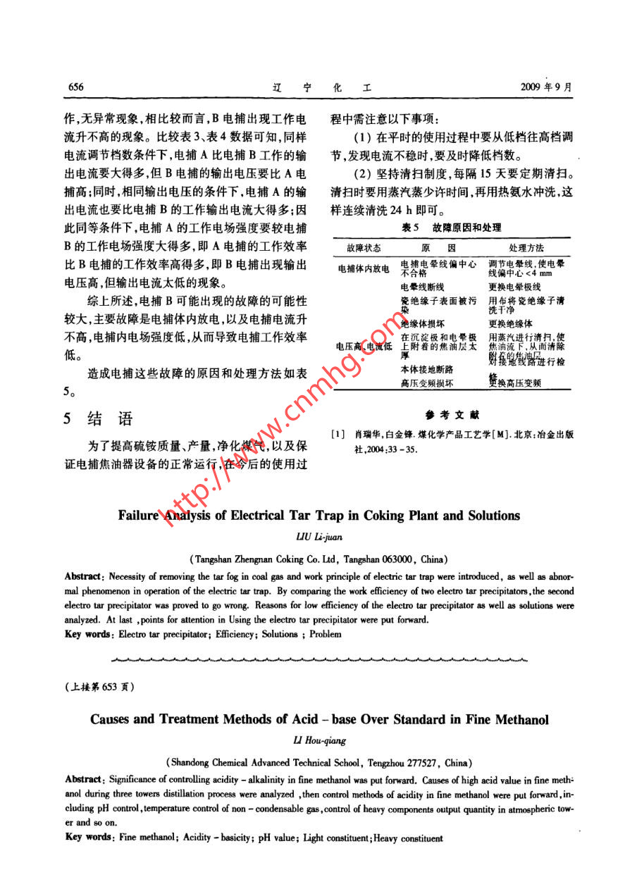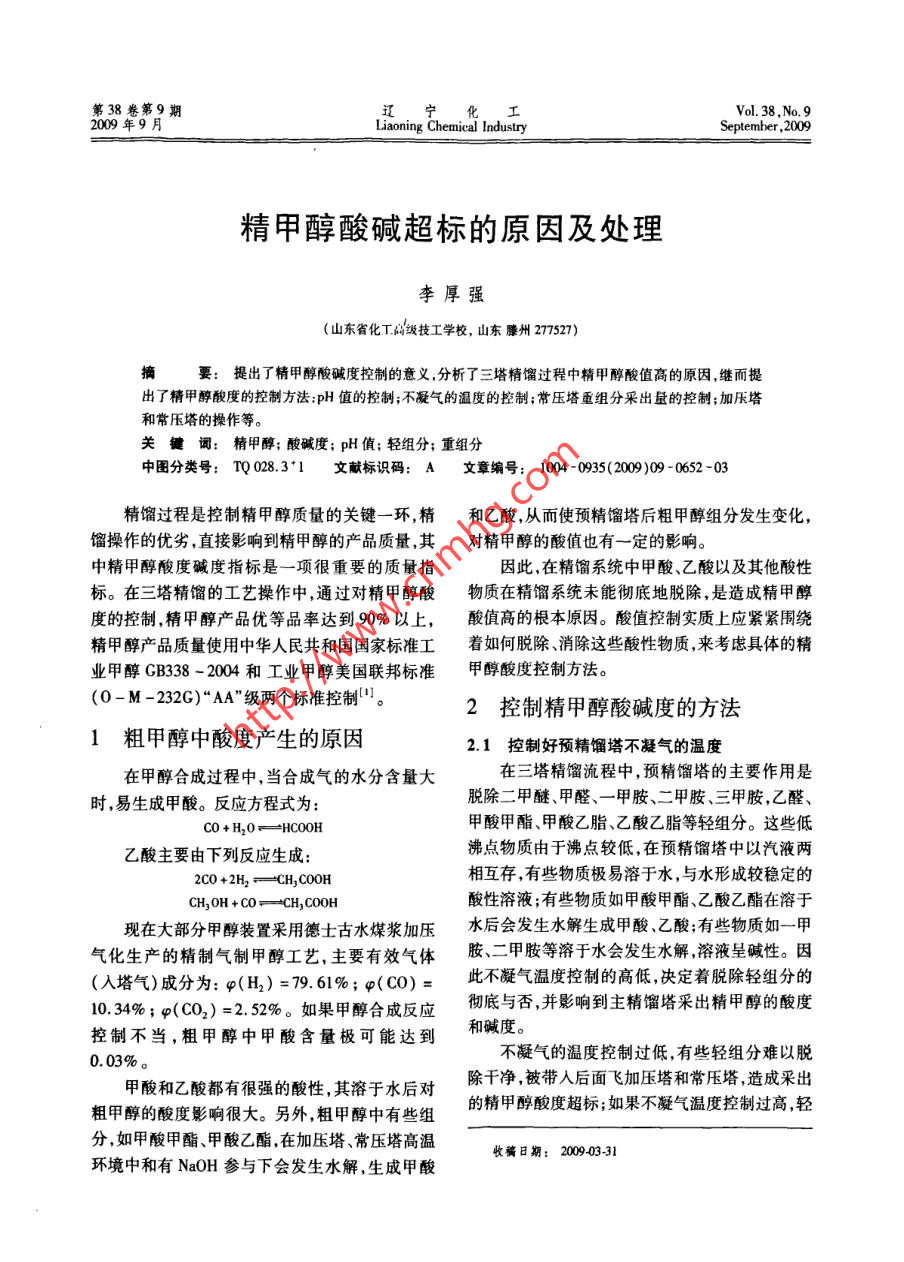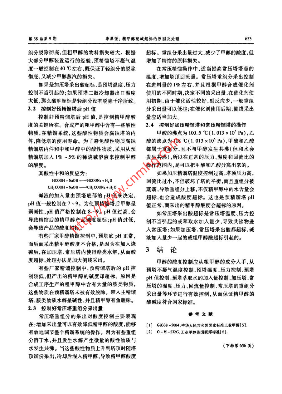 .第38卷第9期遼,寧化工Vol. 38,No,92009年9月Liaoning Chemical IndustrySeptember ,2009精甲醇酸堿超標的原因及處理李厚強(山東省化T的級技工學校,山東滕州277527)要:提出了精甲醇酸堿度控制的意義,分析了三塔精餾過程中精甲醇酸值高的原因,繼而提出了精甲醇酸度的控制方法:pH值的控制;不凝氣的溫度的控制;常壓塔重組分采出量的控制;加壓塔和常壓塔的操作等。關鍵聞:精甲醇;酸堿度;pH值;輕組分;重組分中圖分類號: TQ 028.3*1文獻標識碼: A文章編號: 1004 -0935(2009)09 -0652 -03精餾過程是控制精甲醇質量的關鍵- -環(huán),精和乙酸,從而使預精餾塔后粗甲醇組分發(fā)生變化,餾操作的優(yōu)劣,直接影響到精甲醇的產品質量,其對精甲醇的酸值也有一定的影響。中精甲醇酸度堿度指標是一項很重要的質量指因此,在精餾系統(tǒng)中甲酸、乙酸以及其他酸性標。在三塔精餾的工藝操作中,通過對精甲醇酸物質在精餾系統(tǒng)未能徹底地脫除,是造成精甲醇度的控制,精甲醇產品優(yōu)等品率達到90%以上,酸值高的根本原因。酸值控制實質上應緊緊圍繞精甲醇產品質量使用中華人民共和國國家標準工著如何脫除、消除這些酸性物質,來考慮具體的精業(yè)甲醇GB338-2004和工業(yè)甲醇美國聯(lián)邦標準甲醇酸度控制方法。(0- M -232G)“AA"級兩個標準控制"。2控制精甲醇酸堿度的方法1粗甲醇中酸度產生的原因2.1控制好預精餾 塔不凝氣的溫度在甲醇合成過程中,當合成氣的水分含量大在三塔精餾流程中,預精餾塔的主要作用是時,易生成甲酸。反應方程式為:脫除二甲醚、甲醛、- -甲胺、二甲胺、三甲胺,乙醛、CO + H20- =HC0OH甲酸甲酯、甲酸乙脂、乙酸乙脂等輕組分。這些低乙酸主要由下列反應生成:沸點物質由于沸點較低,在預精餾塔中以汽液兩2CO +2H2 -CH,C00H相互存,有些物質極易溶于水,與水形成較穩(wěn)定的CHgOH+ C0一CH,COOH酸性溶液;有些物質如甲酸甲酯、乙酸乙酯在溶于現在大部分甲醇裝置采用德士古水煤漿加壓水后會發(fā)生水解生成甲酸.乙酸;有些物質如一甲氣化生產的精制氣制甲醇工藝,主要有效氣體胺、二甲胺等溶于水會發(fā)生水解,溶液呈堿性。因(人塔氣)成分為: φ(H2) =79.61%;中(CO) =此不凝氣溫度控制的高低,決定著脫除輕組分的10.34%; p(CO2) =2. 52%。如果甲醇合成反應徹底與否,并影響到主精餾塔采出精甲醇的酸度控制不當,粗甲醇中甲酸含量極可能達到和堿度。不凝氣的溫度控制過低,有些輕組分難以脫0. 03%。甲酸和乙酸都有很強的酸性,其溶于水后對除干凈,被帶人后面飛加壓塔和常壓塔,造成采出粗甲醇的酸度影響很大。另外,粗甲醇中有些組的精甲醇酸度超標;如果不凝氣溫度控制過高,輕分,如甲酸甲酯、甲酸乙酯,在加壓塔、常壓塔高溫收稿日期: 2009-03-31環(huán)境中和有NaOH參與下會發(fā)生水解,生成甲酸第38卷第9期李厚強:精甲醇酸堿超標的原因及處理653組分脫除徹底,但粗甲醇的物料損失較大。根據超標。重組分采出量過大,減少了甲醇的酸度,但大部分甲醇裝置運行的經驗,預精餾塔不凝氣溫增加了精餾的原料損失。度一般控制在40 C左右,既保證了輕組分的脫除在常壓精餾操作中,適當提高常壓塔塔釜的徹底,又減少甲醇蒸汽的損失。溫度,增加塔頂回流量。常壓塔重組分采出控制如果是加壓塔采出酸超標,是預塔溫度、壓力在進料量的1%左右,并且根據甲醇合成催化劑控制不當引起的;如果預塔二繳冷卻器出口溫度使用的不同時期,決定不同的采出量,在催化劑使太低,那么酸度超標是輕組分沒有脫除千凈所致。用初期,由于催化活性較好,副反應少,一般重組2.2控制好預精餾塔后 pH值分采出量可以低些;在催化劑使用后期,側線采出控制好預精餾塔后pH值,是控制精甲醇酸量應適當加大。度的關鍵所在。合成產的粗甲醇中含有- -些酸性2.4控制好 加壓精餾塔和常壓精餾塔的操作物質,在精餾系統(tǒng),這些酸性物質會腐蝕塔的內甲酸的沸點為100.5 C(1.013x10' Pa),乙件,降低塔的使用壽命。為了避免酸性物質腐蝕酸的沸點為118 C(1.013x10' Pa) ,甲酸和乙酸精餾塔內件和中和甲醇中的酸性物質,采用從預都屬于重組分,且不與甲醇發(fā)生共沸(但和水會精餾塔加入1%~5%的稀燒堿溶液來控制甲醇發(fā)生共沸),所以在正常的壓力、溫度和回流比的的酸度。操作范圍內,是可以把甲酸和乙酸分離出來的。其酸性中和的反應為:如果加壓精餾塔溫度控制過高,塔頂壓力高,HCOOH + NaOH =一HCOONa + H20回流比過小,不但破壞了塔的平衡,而且重組分被CH,COOH + NaOH --CH,COONa + H20蒸餾,導致重組分上移,不僅精甲醇中的水含量會堿液的加入量由預塔底部的pH值來決定,超標,也會造成酸度超標。這也是預精餾塔pHpH值一般控制在7~9。為使預精餾塔后甲醇呈值正常,而采出的精甲醇酸度會超標的原因。弱堿性,pH值嚴格控制在8~9。pH 值過高,會如常壓塔采出酸超標是常壓塔溫度、壓力控導致精餾后的精甲醇產品堿度超標;pH值過低,制不當引起的或萃取水加入量少,導致共沸物進會導致產品的酸度超標。人常壓塔;如果加壓塔、常壓塔采出酸都超標,堿有些廠家甲醇精餾控制中,預塔底pH正常,液加入量少一起的或粗甲醇酸超標引起的。而后面采出精甲醇酸度不合格,是因為在加人燒堿后,在加壓塔、常壓塔內使得酯類水解,從而酸3結論度超標,處理辦法是加大側線采出。甲醇的酸度控制應從粗甲醇的成分人手,從有