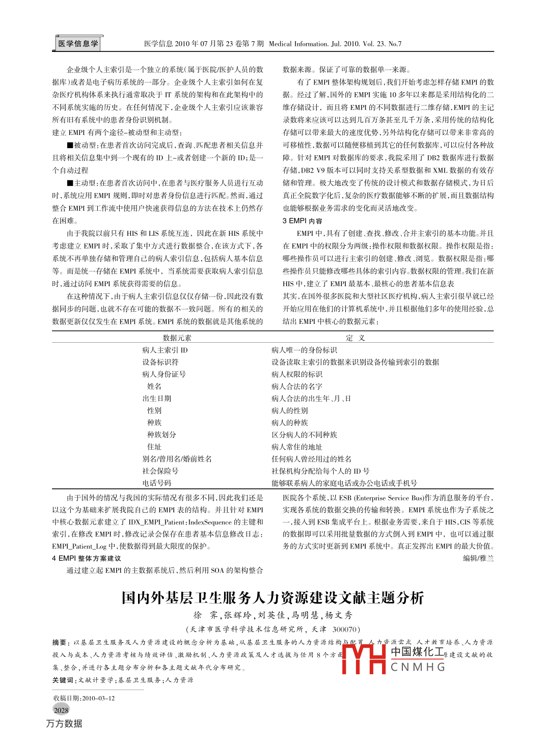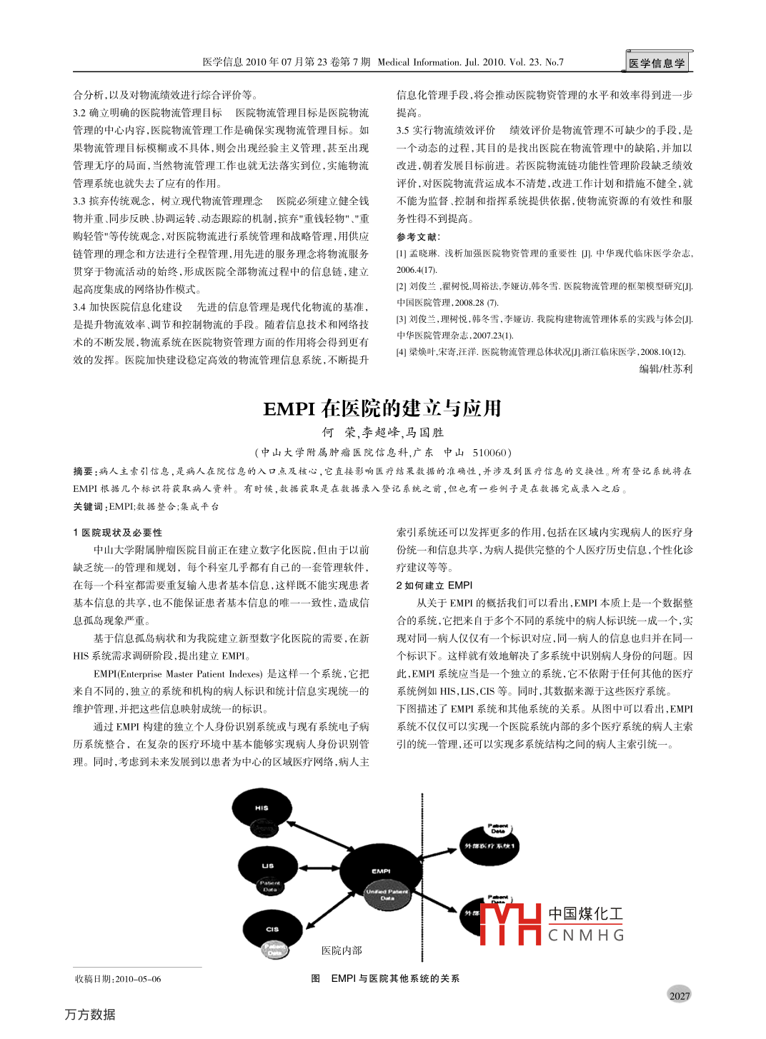 醫(yī)學(xué)信息2010年07月第23卷第7期 Medical Information.Jul.2010.Vol.23.No.7醫(yī)學(xué)信息學(xué)合分析,以及對物流績效進(jìn)行綜合評價等信息化管理手段,將會推動醫(yī)院物資管理的水平和效率得到進(jìn)一步32確立明確的醫(yī)院物流管理目標(biāo)醫(yī)院物流管理目標(biāo)是醫(yī)院物流提高管理的中心內(nèi)容,醫(yī)院物流管理工作是確保實(shí)現(xiàn)物流管理目標(biāo)。如3.5實(shí)行物流績效評價績效評價是物流管理不可缺少的手段,是果物流管理目標(biāo)模糊或不具體,則會岀現(xiàn)經(jīng)驗(yàn)主義管理,甚至岀現(xiàn)一個動態(tài)的過程,其目的是找岀醫(yī)院在物流管理中的缺陷,并加以管理無序的局面,當(dāng)然物流管理工作也就無法落實(shí)到位,實(shí)施物流改進(jìn),朝著發(fā)展目標(biāo)前進(jìn)。若醫(yī)院物流鏈功能性管理階段缺乏績效管理系統(tǒng)也就失去了應(yīng)有的作用。評價,對醫(yī)院物流營運(yùn)成本不清楚,改進(jìn)工作計(jì)劃和措施不健全,就33擯棄傳統(tǒng)觀念,樹立現(xiàn)代物流管理理念醫(yī)院必須建立健全錢不能為監(jiān)督、控制和指揮系統(tǒng)提供依據(jù),使物流資源的有效性和服物并重、同步反映、協(xié)調(diào)運(yùn)轉(zhuǎn)、動態(tài)跟蹤的機(jī)制,擯棄“重錢輕物"、”重務(wù)性得不到提高。購輕管"等傳統(tǒng)觀念,對醫(yī)院物流進(jìn)行系統(tǒng)管理和戰(zhàn)略管理,用供應(yīng)參考文獻(xiàn):鏈管理的理念和方法進(jìn)行全程管理,用先進(jìn)的服務(wù)理念將物流服務(wù)1孟曉琳.淺析加強(qiáng)醫(yī)院物資管理的重要性中華現(xiàn)代臨床醫(yī)學(xué)雜志貫穿于物流活動的始終,形成醫(yī)院全部物流過程中的信息鏈,建立2006417起高度集成的網(wǎng)絡(luò)協(xié)作模式。2]劉俊蘭,翟樹悅周裕法,李婭訪韓冬雪.醫(yī)院物流管理的框架模型研究34加快醫(yī)院信息化建設(shè)先進(jìn)的信息管理是現(xiàn)代化物流的基準(zhǔn)中國醫(yī)院管理,2008.28(7是提升物流效率、調(diào)節(jié)和控制物流的手段。隨著信息技術(shù)和網(wǎng)絡(luò)技13劉俊蘭,理樹說,韓冬雪,李婭訪,我院構(gòu)建物流管理體系的實(shí)踐與體會術(shù)的不斷發(fā)展物流系統(tǒng)在醫(yī)院物資管理方面的作用將會得到更有中華醫(yī)院管理雜志2002301效的發(fā)揮。醫(yī)院加快建設(shè)穩(wěn)定高效的物流管理信息系統(tǒng),不斷提升陽4]梁煥葉宋寄,汪洋.醫(yī)院物流管理總體狀況浙江臨床醫(yī)學(xué),200810012).EMPI在醫(yī)院的建立與應(yīng)用何榮,李超峰,馬國勝(中山大學(xué)附屬腫瘤醫(yī)院信息科,廣東中山510060)摘要:病人主索引信息,是病人在院信息的入口點(diǎn)及核心,它直接影響醫(yī)療結(jié)釆數(shù)據(jù)的準(zhǔn)確性,并涉及到醫(yī)療信息的交換性。所有登記系統(tǒng)將在EMPI根據(jù)幾個標(biāo)識符獲取病人資科。有時候,數(shù)據(jù)獲取是在數(shù)據(jù)錄入登記系統(tǒng)之前,但也有一些例子是在數(shù)據(jù)完成錄入之后。關(guān)鍵詞:EMPI;數(shù)據(jù)整合;集成平臺1醫(yī)院現(xiàn)狀及必要性索引系統(tǒng)還可以發(fā)揮更多的作用,包括在區(qū)域內(nèi)實(shí)現(xiàn)病人的醫(yī)疔身山大學(xué)附屬腫瘤醫(yī)院目前正在建立數(shù)字化醫(yī)院,但由于以前份統(tǒng)一和信息共享,為病人提供完整的個人醫(yī)療歷史信息,個性化診缺乏統(tǒng)一的管理和規(guī)劃,每個科室?guī)缀醵加凶约旱囊惶坠芾碥浖熃ㄗh等等在每一個科室都需要重復(fù)輸入患者基本信息,這樣既不能實(shí)現(xiàn)患者2如何建立EMP基本信息的共享,也不能保證患者基本信息的唯一一致性,造成信從關(guān)于EMP的概括我們可以看出,EMPI本質(zhì)上是一個數(shù)據(jù)整息孤島現(xiàn)象嚴(yán)重合的系統(tǒng),它把來自于多個不同的系統(tǒng)中的病人標(biāo)識統(tǒng)一成一個,實(shí)基于信息孤島病狀和為我院建立新型數(shù)字化醫(yī)院的需要,在新現(xiàn)對同一病人僅僅有一個標(biāo)識對應(yīng),同一病人的信息也歸并在同HS系統(tǒng)需求調(diào)研階段,提出建立EMPI個標(biāo)識下。這樣就有效地解決了多系統(tǒng)中識別病人身份的問題。因EMPI( Enterprise Master Patient Indexes)是這樣一個系統(tǒng),它把此,EMP系統(tǒng)應(yīng)當(dāng)是一個獨(dú)立的系統(tǒng),它不依附于任何其他的醫(yī)療來自不同的,獨(dú)立的系統(tǒng)和機(jī)構(gòu)的病人標(biāo)識和統(tǒng)計(jì)信息實(shí)現(xiàn)統(tǒng)一的系統(tǒng)例如HS,LS,CˉS等。同時,其數(shù)據(jù)來源于這些醫(yī)療系統(tǒng)。維護(hù)管理,并把這些信息映射成統(tǒng)一的標(biāo)識。下圖描述了EMP系統(tǒng)和其他系統(tǒng)的關(guān)系。從圖中可以看出,EMPI通過EMPI構(gòu)建的獨(dú)立個人身份識別系統(tǒng)或與現(xiàn)有系統(tǒng)電子病系統(tǒng)不僅僅可以實(shí)現(xiàn)一個醫(yī)院系統(tǒng)內(nèi)部的多個醫(yī)療系統(tǒng)的病人主索系統(tǒng)整合,在復(fù)雜的醫(yī)療環(huán)境中基本能夠?qū)崿F(xiàn)病人身份識別管引的統(tǒng)一管理,還可以實(shí)現(xiàn)多系統(tǒng)結(jié)構(gòu)之間的病人主索引統(tǒng)-理。同時,考慮到未來發(fā)展到以患者為中心的區(qū)域醫(yī)療網(wǎng)絡(luò),病
