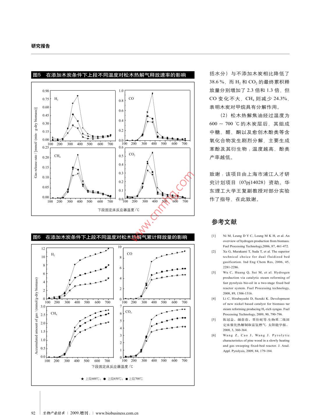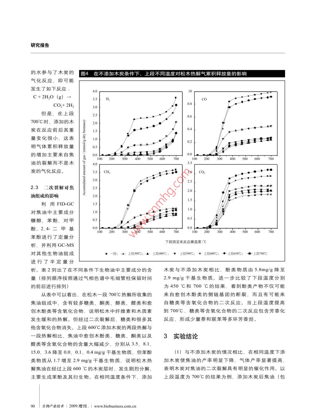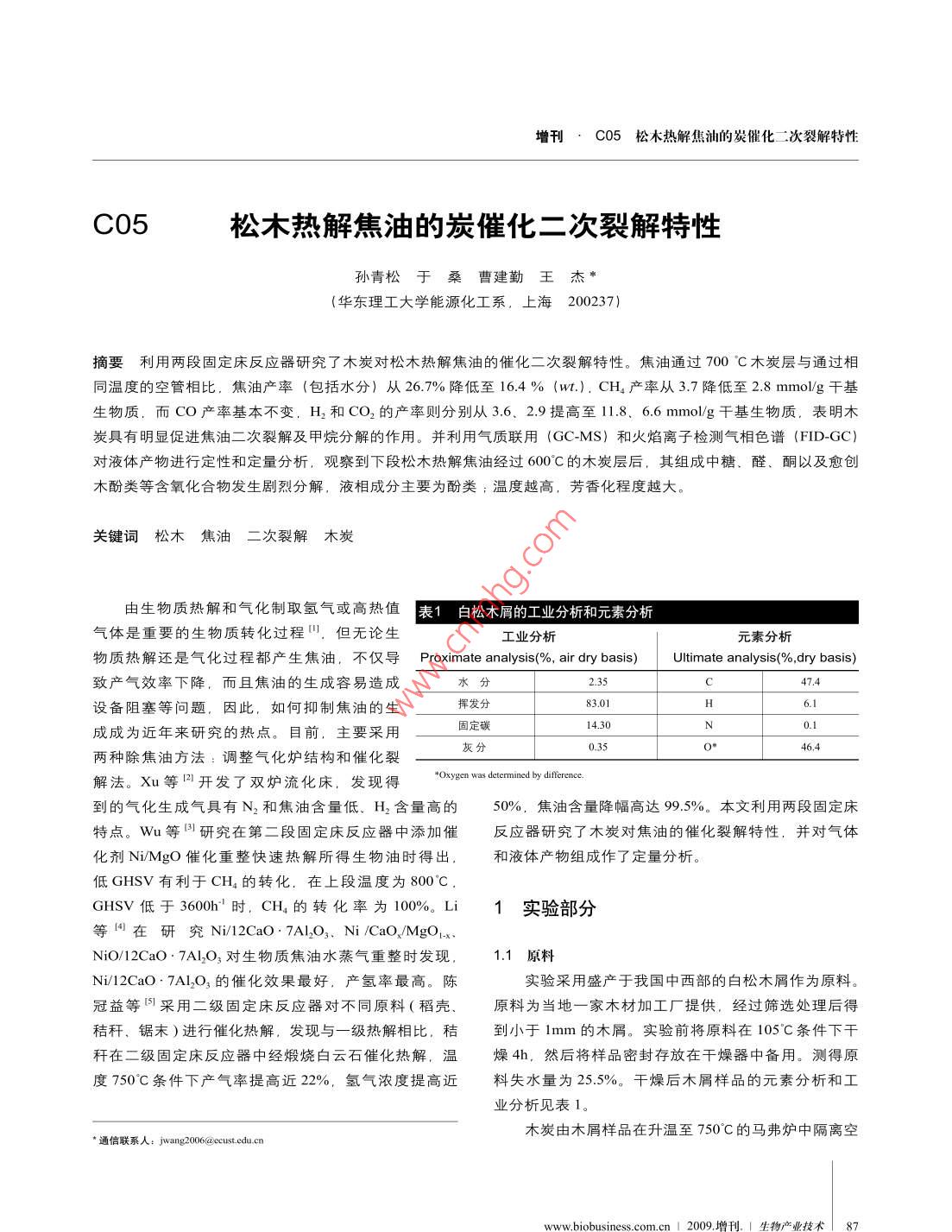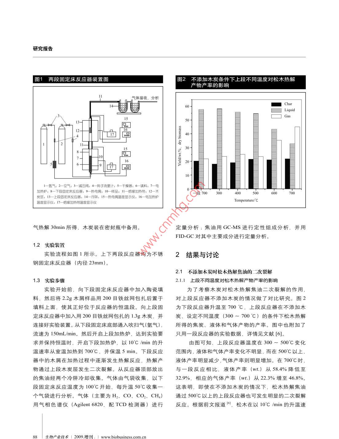 增刊,C05 松木熱解 焦油的炭催化二次裂解特性C05松木熱解焦油的炭催化二次裂解特性(華東理工大學(xué)能源化工系,上海200237)摘要利用兩段固定床反應(yīng)器研究了木炭對松木熱解焦油的催化二次裂解特性。焦油通過700°C木炭層與通過相同溫度的空管相比,焦油產(chǎn)率(包括水分)從26.7%降低至16.4 % (wt.). CH,產(chǎn)率從3.7降低至2.8 mmolg干基生物質(zhì),而CO產(chǎn)率基本不變,H2 和CO2的產(chǎn)率則分別從3.6.2.9 提高至11.8. 6.6 mmol/g干基生物質(zhì)表明木炭具有明顯促進(jìn)焦油二次裂解及甲烷分解的作用。并利用氣質(zhì)聯(lián)用(GC-MS) 和火焰離子檢測氣相色譜(FID-GC)對液體產(chǎn)物進(jìn)行定性和定量分析,觀察到下段松木熱解焦油經(jīng)過600°C的木炭層后,其組成中糖.醛、酮以及愈創(chuàng)木酚類等含氧化合物發(fā)生劇烈分解,液相成分主要為酚類; 溫度越高,芳香化程度越大。關(guān)鍵詞松木焦油二次裂解木炭由生物質(zhì)熱解和氣化制取氫氣或高熱值|表1白松木屑的工業(yè)分析和元素分析I氣體是重要的生物質(zhì)轉(zhuǎn)化過程",但無論生工業(yè)分析元素分析物質(zhì)熱解還是氣化過程都產(chǎn)生焦油,不僅導(dǎo)Proximate analysis(%, air dry basis)Ultimate analysis(%,dry basis)致產(chǎn)氣效率下降,而且焦油的生成容易造成水分2.35C7.4設(shè)備阻塞等問題,因此,如何抑制焦油的生揮發(fā)分83.01H6.1成成為近年來研究的熱點。目前,主要采用固定碳14.30N0.10.35O6.4兩種除焦油方法:調(diào)整氣化爐結(jié)構(gòu)和催化裂*Oxygcn was determined by difrerece.解法。Xu等剛開發(fā)了雙爐流化床,發(fā)現(xiàn)得到的氣化生成氣具有N2和焦油含量低、H2 含量高的50%,焦油含量降幅高達(dá)99.5%。本文利用兩段固定床特點。Wu等目研究在第二段固定床反應(yīng)器中添加催反應(yīng)器研究了木炭對焦油的催化裂解特性,并對氣體化劑Ni/MgO催化重整快速熱解所得生物油時得出.和液體產(chǎn)物組成作了定量分析。低GHSV有利于CH4的轉(zhuǎn)化,在.上段溫度為800'C.GHSV低于3600h'時,CH,的轉(zhuǎn)化率為100%。Li1實驗部分等網(wǎng)在研究Ni/12CaO.7Al2O3、Ni /CaO、MgOx.Ni0/12CaO.7Al2O3對生物質(zhì)焦油水蒸氣重整時發(fā)現(xiàn),1.1 原料Ni/12CaO .7AI2O3的催化效果最好,產(chǎn)氫率最高。陳實驗采用盛產(chǎn)于我國中西部的白松木屑作為原料。冠益等可采用二級固定床反應(yīng)器對不同原料(稻殼、原料為當(dāng)?shù)匾患夷静募庸S提供,經(jīng)過篩選處理后得秸稈、鋸末)進(jìn)行催化熱解,發(fā)現(xiàn)與一級熱解相比,秸到小于1mm的木屑。實驗前將原料在105"C條件下干稈在二級固定床反應(yīng)器中經(jīng)煅燒白云石催化熱解,溫燥4h,然后將樣品密封存放在干燥器中備用。測得原度750"C條件下產(chǎn)氣率提高近22%,氫氣濃度提高近料失水量為25.5%。干燥后木屑樣品的元素分析和工業(yè)分析見表1。.木炭由木屑樣品在升溫至750^C的馬弗爐中隔離空*通信聯(lián)系人: jwang2006@ecust.edu.cn2009,增刊,1生物產(chǎn)業(yè)技術(shù)| 87研究報告圖1兩段固定床反應(yīng)器裝置圖圖2不添加木炭條件下上段不同溫度對松木熱解產(chǎn)物產(chǎn)率的影響1氣體接收.分析60-13-原5040-2I-16|章2(1-氬氣:2-空氣:3一減壓閥: 4-轉(zhuǎn)子流量計:5一干燥器:6一填料:7一電加熱爐: 8一下段固定床反應(yīng)器,9-熱電偶: 10-樣品: 11一絕緣加熱帶。12-木-段700 30040000600700炭層,13-上段固定床反應(yīng)器,14 -冷阱, 15-熱電偶溫度顯示儀。16- 電加熱爐Temperature/C溫度顯示儀: 17-絕緣加熱帶溫度顯示儀氣熱解30min所得,木炭裝在密封瓶中備用。定量分析:焦油用GC-MS進(jìn)行定性組成分析,并用FID-GC對其中主要成分進(jìn)行定量分析。1.2實驗裝置實驗流程如圖1所示。上下兩段反應(yīng)器均為不銹2結(jié)果與討論 .鋼固定床反應(yīng)器(內(nèi)徑23mm)。2.1 不添加木炭時松木熱解焦油的二次裂解1.3 實驗步驟2.1.1上段不同溫 度對松木熱解產(chǎn)物產(chǎn)率的影響實驗開始前,向下段固定床反應(yīng)器中加入陶瓷填為了考察木炭對松木熱解焦油二次裂解的作用.料,然后將2.2g木屑樣品用200目鐵絲網(wǎng)包扎后置于對上段反應(yīng)器不添加木炭的情況做了對比研究。圖2填料上面,使其正好位于反應(yīng)器的恒溫段。向上段固為下段反應(yīng)器升溫至700°C,上段反應(yīng)器在不添加木:定床反應(yīng)器中加入用200目鐵絲網(wǎng)包扎的1.3g木炭,并炭、設(shè)定不同溫度(300 ~ 700 °C)的條件下松木熱解連接好實驗裝置。從下段固定床底部通入吹掃氣(氬氣),所得的焦炭、液體和氣體產(chǎn)物的產(chǎn)率。圖中也附加了.流速為150mL/min。 然后開啟上段加熱爐,達(dá)到實驗要只用一段反應(yīng)器的實驗數(shù)據(jù),詳情見文獻(xiàn)[6]。求并保持恒溫時,開啟下段加熱爐,以10°C /min的升由圖可知,.上段反應(yīng)器溫度在300 ~ 500°C變化溫速率從室溫加熱到700'C,并保溫5 min。下段反應(yīng)范圍內(nèi),液體和氣體產(chǎn)率變化不明顯.而在500"C以上,器中的木屑在加熱過程中逐漸發(fā)生熱解反應(yīng),熱解產(chǎn)液體產(chǎn)率明顯減少,氣體產(chǎn)率則明顯增加。在700°C時,物通過上段木炭層發(fā)生二次裂解。從反應(yīng)器頂部放出與一段反應(yīng)相比,液體產(chǎn)率(wt.) 從58.4%降低至的焦油經(jīng)兩個冷阱冷卻收集。氣體由氣袋收