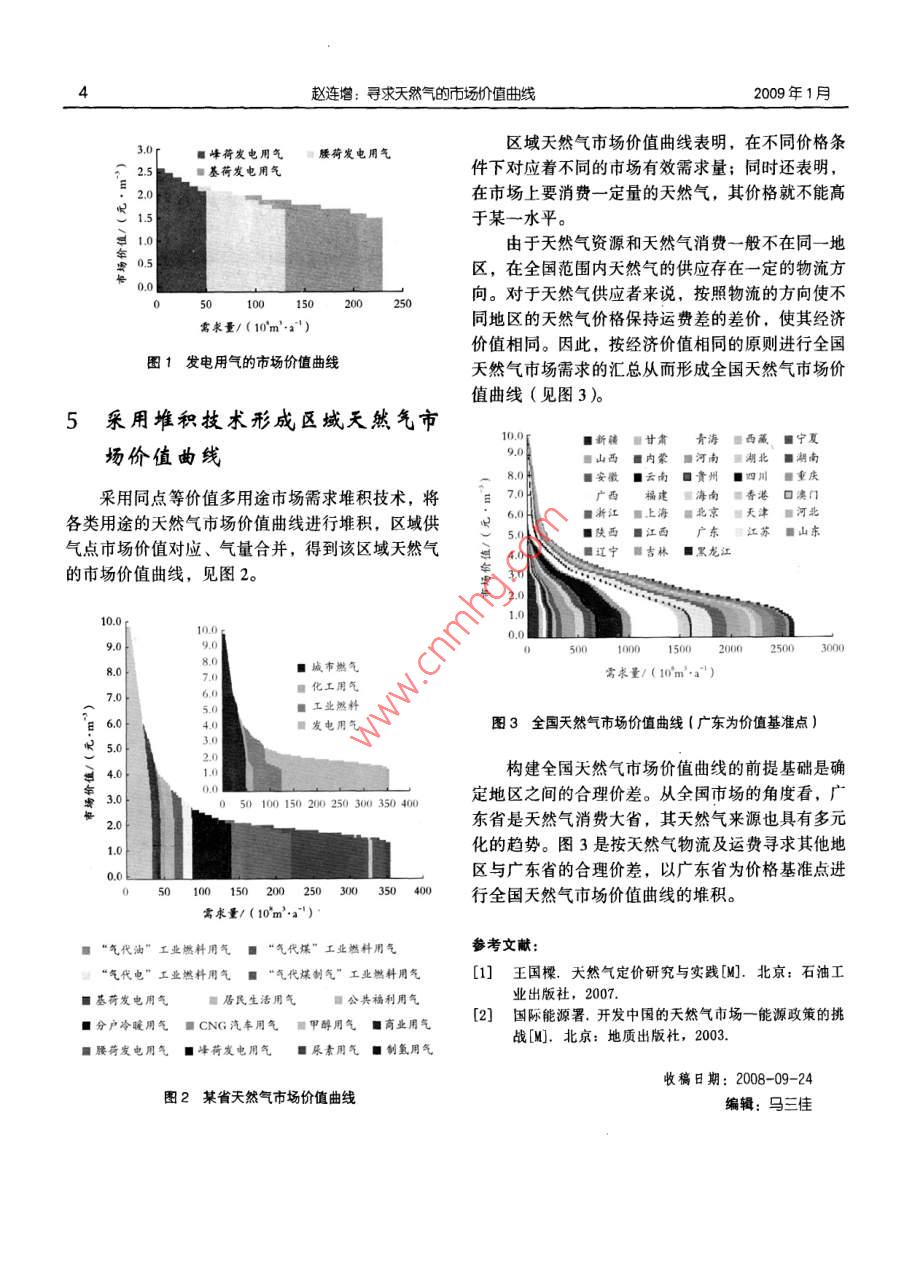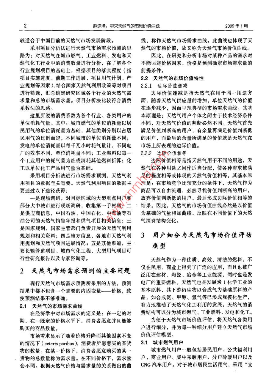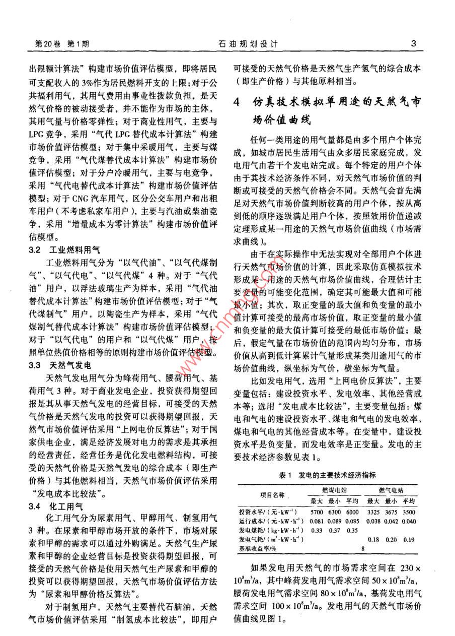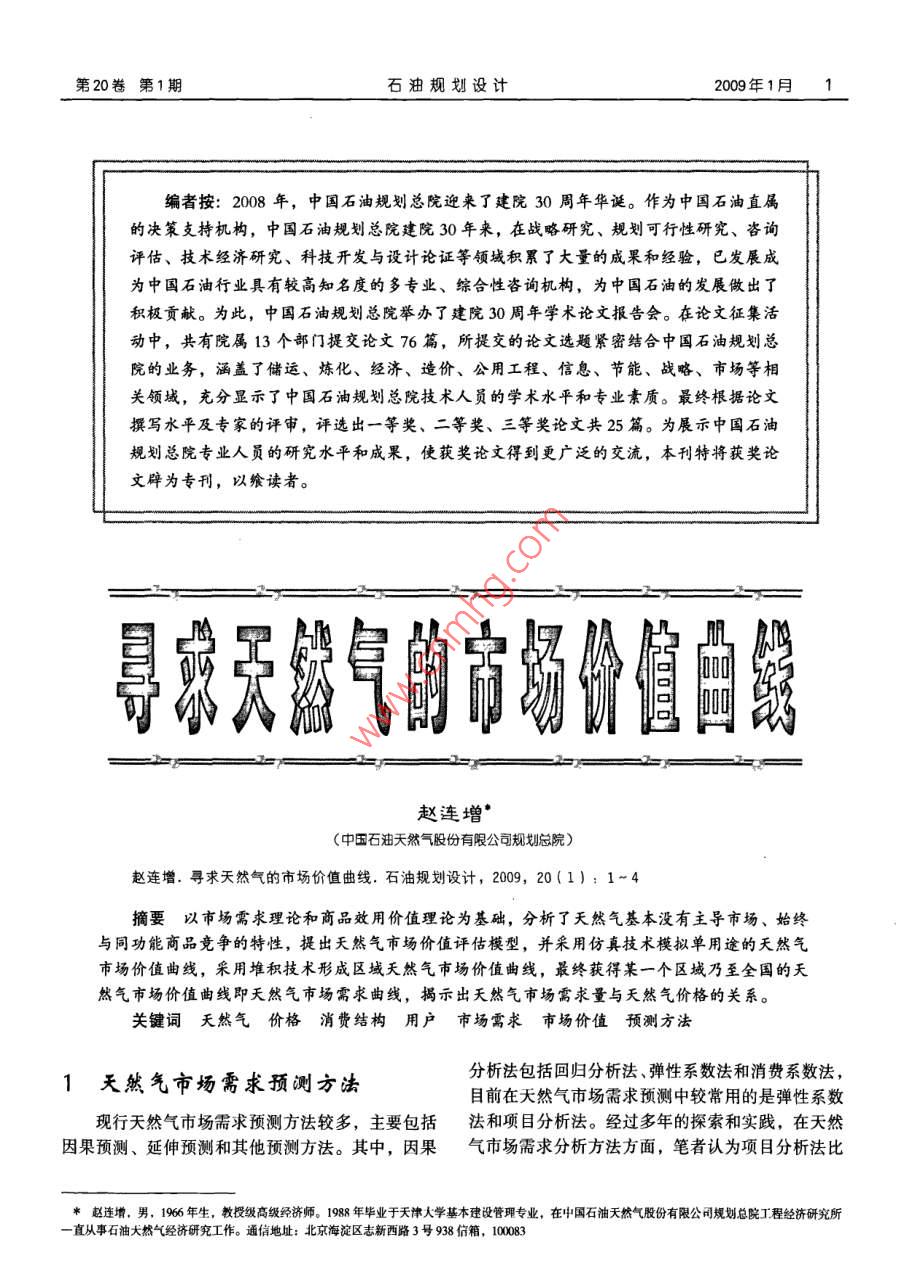 第20卷第1期石油規(guī)劃設(shè)計(jì)2009年1月編者按:2008年,中國(guó)石油規(guī)劃總院迎來了建院30周年華誕。作為中國(guó)石油直屬的決策支持機(jī)構(gòu),中國(guó)石油規(guī)劃總院建院30年來,在戰(zhàn)略研究、規(guī)劃可行性研究、咨詢?cè)u(píng)估、技術(shù)經(jīng)濟(jì)研究、科技開發(fā)與設(shè)計(jì)論證等領(lǐng)域積累了大量的成果和經(jīng)驗(yàn),已發(fā)展成為中國(guó)石油行業(yè)具有較高知名度的多專業(yè)、綜合性咨詢機(jī)構(gòu),為中國(guó)石油的發(fā)展做出了積極貢獻(xiàn)。為此,中國(guó)石油規(guī)劃總院舉辦了建院30周年學(xué)術(shù)論文報(bào)告會(huì)。在論文征集活動(dòng)中,共有院屬13個(gè)部門提交論文76篇,所提交的論文選題緊密結(jié)合中國(guó)石油規(guī)劃總院的業(yè)務(wù),涵蓋了儲(chǔ)運(yùn)、煉化、經(jīng)濟(jì)、造價(jià)、公用工程、信息、節(jié)能、戰(zhàn)略、市場(chǎng)等相關(guān)領(lǐng)域,充分顯示了中國(guó)石油規(guī)劃總院技術(shù)人員的學(xué)術(shù)水平和專業(yè)素質(zhì)。最終根據(jù)論文撰寫水平及專家的評(píng)審,評(píng)選出一等獎(jiǎng)、二等獎(jiǎng)、三等獎(jiǎng)?wù)撐墓?5篇。為展示中國(guó)石油規(guī)劃總院專業(yè)人員的研究水平和成果,使獲獎(jiǎng)?wù)撐牡玫礁鼜V泛的交流,本刊特將獲獎(jiǎng)?wù)撐谋贋閷??以饗讀者。號(hào)經(jīng)自的竊每自曲懿趙連增(中國(guó)石油天然氣股份有限公司規(guī)劃總院)趙連增.尋求天然氣的市場(chǎng)價(jià)值曲線.石油規(guī)劃設(shè)計(jì),2009,20(1):1-4摘要以市場(chǎng)需求理論和商品效用價(jià)值理論為基礎(chǔ),分析了天然氣基本沒有主導(dǎo)市場(chǎng)、始終與同功能商品競(jìng)爭(zhēng)的特性,提出天然氣市場(chǎng)價(jià)值評(píng)估模型,并采用仿真技術(shù)模擬單用途的天然氣市場(chǎng)價(jià)值曲線,采用堆積技術(shù)形成區(qū)域夭然氣市場(chǎng)價(jià)值曲線,最終獲得某一個(gè)區(qū)域乃至全國(guó)的天然氣市場(chǎng)價(jià)值曲線即天然氣市場(chǎng)需求曲線,揭示出天然氣市場(chǎng)需求量與天然氣價(jià)格的關(guān)系關(guān)鍵詞天然氣價(jià)格消費(fèi)結(jié)構(gòu)用戶市場(chǎng)需求市場(chǎng)價(jià)值預(yù)測(cè)方法1天然氣市場(chǎng)需求預(yù)測(cè)方法分析法包括回歸分析法、彈性系數(shù)法和消費(fèi)系數(shù)法目前在天然氣市場(chǎng)需求預(yù)測(cè)中較常用的是彈性系數(shù)現(xiàn)行天然氣市場(chǎng)需求預(yù)測(cè)方法較多,主要包括法和項(xiàng)目分析法。經(jīng)過多年的探索和實(shí)踐,在天然因果預(yù)測(cè)、延伸預(yù)測(cè)和其他預(yù)測(cè)方法。其中,因果氣市場(chǎng)需求分析方法方面,筆者認(rèn)為項(xiàng)目分析法比*趙連增,男,1966年生,教授級(jí)高級(jí)經(jīng)濟(jì)師。1988年畢業(yè)于天津大學(xué)基本建設(shè)管理專業(yè),在中國(guó)石油天然氣股份有限公司規(guī)劃總院工程經(jīng)濟(jì)研究所直從事石油大然氣經(jīng)濟(jì)研究工作。通信地址:北京海淀區(qū)志新西路3號(hào)938信箱,趙連增:尋求天然氣的市場(chǎng)價(jià)值曲線2009年1月較適合于中國(guó)目前的天然氣市場(chǎng)發(fā)展階段。線,稱作天然氣市場(chǎng)需求曲線。此曲線也體現(xiàn)了天采用項(xiàng)目分析法進(jìn)行天然氣市場(chǎng)需求預(yù)測(cè)的思然氣的市場(chǎng)價(jià)值,故又稱為天然氣市場(chǎng)價(jià)值曲線。路為:對(duì)天然氣在城市燃?xì)?、工業(yè)燃料、發(fā)電和天因此,在研究和分析市場(chǎng)對(duì)某種產(chǎn)品的需求時(shí)然氣化工行業(yè)中的消費(fèi)數(shù)量進(jìn)行分析,在了解各個(gè)不能回避價(jià)格因素,價(jià)格是預(yù)測(cè)確定市場(chǎng)需求量的行業(yè)規(guī)劃項(xiàng)目的基礎(chǔ)上,根據(jù)項(xiàng)目的落實(shí)程度(指前提條件。項(xiàng)目實(shí)施進(jìn)度、前期工作進(jìn)展、項(xiàng)目用氣計(jì)劃、產(chǎn)22天然氣的市場(chǎng)價(jià)值特性業(yè)規(guī)劃等因素,結(jié)合國(guó)家天然氣利用政策等對(duì)項(xiàng)目2.2.1邊際價(jià)值遞減進(jìn)行篩選,匯總確定研究區(qū)域各個(gè)行業(yè)的天然氣需邊際價(jià)值遞減是指天然氣在用于同一用途方求量和總的市場(chǎng)需求量。項(xiàng)目分析法比較符合消費(fèi)面,隨著天然氣供應(yīng)量的增加,單位天然氣的價(jià)值系數(shù)法的思路。在逐步減少,因而呈現(xiàn)典型的市場(chǎng)需求曲線。其基這里所說的消費(fèi)系數(shù)為各個(gè)行業(yè)、各類用戶的本原理是:天然氣用戶個(gè)體之間由于技術(shù)經(jīng)濟(jì)條件單位消耗氣量。其中:城市燃?xì)獾膯挝幌牧恳跃硬煌?對(duì)天然氣價(jià)值的判斷必然不同。天然氣首先民用氣的單位消耗量為基礎(chǔ),其他類別分別以占居滿足價(jià)值判斷高的用戶,有余量再滿足價(jià)值判斷低民用氣的比例而定,不同城市的單位消耗量不同;的用戶,而最后的余量所滿足的價(jià)值就是天然氣在發(fā)電的單位消耗量以每千瓦小時(shí)耗氣量計(jì),不同電市場(chǎng)上所表現(xiàn)的邊際價(jià)值。廠的效率不同,單位消耗量不同;工業(yè)燃料以每一2.2.2邊際價(jià)值相等個(gè)工業(y