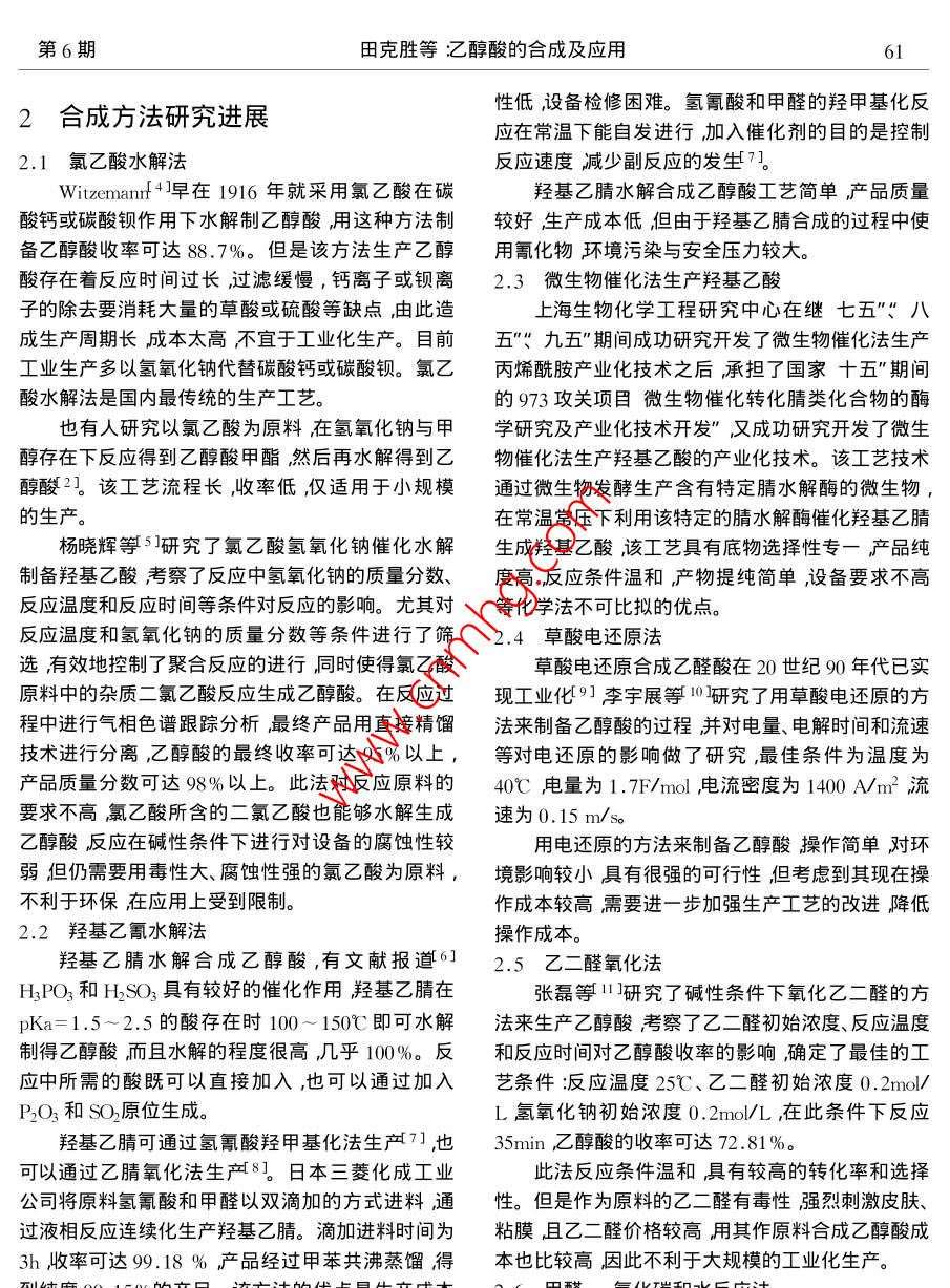 60天然氣化工2006年第31卷乙醇酸的合成及應(yīng)用田克勝王保偉許根慧(天津大學(xué)化工學(xué)院綠色合成與轉(zhuǎn)化教育部重點(diǎn)實(shí)驗(yàn)室天津300072摘要評述了的乙醇酸的合成方法并介紹了其用途指出應(yīng)開發(fā)綠色、經(jīng)濟(jì)的C1化學(xué)合成路線。關(guān)鍵詞乙醇酸合成方法應(yīng)用中圖分類號TQ223.2文獻(xiàn)標(biāo)識碼A文章編號1001-92120066-60-04乙醇酸又稱羥基乙酸、甘醇酸是最簡單的a-羥 2HOCH2CO2HHOCH2CO2CH2CO2H+H2O (1)基酸。在自然界尤其是甘蔗、甜菜以及未成熟的葡萄汁中存在但其含量甚低,且與其它物質(zhì)共存難 2HOCH2CO2HO=+2H2O(2)于提純分離。工業(yè)上采用合成的方法來得到。乙醇 nHOCH2COH→HOCH2COOH+(n-1)H2O(3)酸是一種重要的有機(jī)合成中間體和化工產(chǎn)品純品(1)和(2)兩種酯化物很容易水解生成游離的乙為無色易潮解晶體工業(yè)品有70%的淡黃色水溶液醇酸(3)成了高分子聚合物這種聚酯可以用作等多種規(guī)格。其可用于生產(chǎn)乙二醇可制取纖維染醫(yī)學(xué)工程材料和生物降解材料。色劑、皮革染色劑、鞣革劑、清洗劑和焊接劑的配料此外,乙醇酸還可以和乳酸等有機(jī)物發(fā)生共聚。等聚乳酸-乙醇酸(PLGA)是一種重要的生物降解材目前全球產(chǎn)能約13萬t/2國內(nèi)雖有一定規(guī)料具有無毒生物兼容、可在生物體內(nèi)外降解等獨(dú)模的生產(chǎn)但生產(chǎn)工藝相對落后產(chǎn)品質(zhì)量不高在特性能廣泛應(yīng)用于縫合補(bǔ)強(qiáng)材料、手術(shù)縫合線、藥相當(dāng)程度上仍然依賴進(jìn)口。因此加強(qiáng)對乙醇酸的物緩釋載體組織工程等醫(yī)用高分子領(lǐng)域研究十分必要。1.2.2加氫反應(yīng)1乙醇酸的性質(zhì)乙醇酸加氫得到一種很重要的有機(jī)化工原料乙二醇:1.1乙醇酸的物理性質(zhì)3(4)乙醇酸常溫下為無色結(jié)晶固體易潮解熔點(diǎn)1.2.3氨化反應(yīng)80℃沸點(diǎn)100℃(分解)閃點(diǎn)300℃(分解)相對密乙醇酸氨化生成DL-甘氨酸:度d2=1.49溶于水、乙醇、丙酮和乙酸微溶于乙醚。這種最簡單的氨基酸用途很廣泛??捎糜谏a(chǎn)1.2乙醇酸的化學(xué)性質(zhì)除草劑甘磷、植物生長調(diào)節(jié)劑增甘磷可用作藥物溶乙醇酸分子中含有一個(gè)羧基和一個(gè)羥基,它既劑金霉素緩沖劑以及多種藥物合成的中間體另外是一種有機(jī)酸又是一種醇,同時(shí)具有有機(jī)酸和醇的還可以作調(diào)味劑糖精去苦味劑飼料添加劑等。性質(zhì)。1.2.4氧化脫氫反應(yīng)1.2.1聚合反應(yīng)4乙醇酸氧化脫氫可以用來合成乙醛酸:乙醇酸分子自身含有羥基和羧基官能團(tuán)能夠 2HOCH2COOH+O2-2 OCHCOOH+2H2O (6)發(fā)生自身聚合反應(yīng):乙醛酸也是一種很重要的化工原料可用于生收稿日期:2006-0-11作者簡介田克勝(1982)男碩士產(chǎn)香蘭素、口服青霉素和尿囊素。也用于生產(chǎn)減壓生聯(lián)系話7000郵花田米花腫值苗劉第6期田克勝等乙醇酸的合成及應(yīng)用612合成方法研究進(jìn)展性低設(shè)備檢修困難。氫氰酸和甲醛的羥甲基化反應(yīng)在常溫下能自發(fā)進(jìn)行加入催化劑的目的是控制2.1氯乙酸水解法反應(yīng)速度減少副反應(yīng)的發(fā)生7 Witzemanr4早在1916年就采用氯乙酸在碳羥基乙腈水解合成乙醇酸工藝簡單產(chǎn)品質(zhì)量酸鈣或碳酸鋇作用下水解制乙醇酸,用這種方法制較好生產(chǎn)成本低但由于羥基乙腈合成的過程中使備乙醇酸收率可達(dá)88.7%。但是該方法生產(chǎn)乙醇用氰化物環(huán)境污染與安全壓力較大酸存在著反應(yīng)時(shí)間過長,過濾緩慢,鈣離子或鋇離2.3微生物催化法生產(chǎn)羥基乙酸子的除去要消耗大量的草酸或硫酸等缺點(diǎn)由此造上海生物化學(xué)工程研究中心在繼七五”八成生產(chǎn)周期長成本太高不宜于工業(yè)化生產(chǎn)。目前五九五期間成功研究開發(fā)了微生物催化法生產(chǎn)工業(yè)生產(chǎn)多以氫氧化鈉代替碳酸鈣或碳酸鋇。氯乙丙烯酰胺產(chǎn)業(yè)化技術(shù)之后承擔(dān)了國家十五期間酸水解法是國內(nèi)最傳統(tǒng)的生產(chǎn)工藝。的973攻關(guān)項(xiàng)目微生物催化轉(zhuǎn)化腈類化合物的酶也有人研究以氯乙酸為原料在氫氧化鈉與甲學(xué)研究及產(chǎn)業(yè)化技術(shù)開發(fā)”又成功研究開發(fā)了微生醇存在下反應(yīng)得到乙醇酸甲酯然后再水解得到乙物催化法生產(chǎn)羥基乙酸的產(chǎn)業(yè)化技術(shù)。該工藝技術(shù)醇酸21。該工藝流程長收率低,僅適用于小規(guī)模通過微生物發(fā)酵生產(chǎn)含有特定腈水解酶的微生物,的生產(chǎn)。在常溫常壓下利用該特定的腈水解酶催化羥基乙腈楊曉輝等研究了氯乙酸氫氧化鈉催化水解生成羥基乙酸該工藝具有底物選擇性專一產(chǎn)品純制備羥基乙酸考察了反應(yīng)中氫氧化鈉的質(zhì)量分?jǐn)?shù)、度高反應(yīng)條件溫和產(chǎn)物提純簡單設(shè)備要求不高反應(yīng)溫度和反應(yīng)時(shí)間等條件對反應(yīng)的影響。尤其對等化學(xué)法不可比擬的優(yōu)點(diǎn)。反應(yīng)溫度和氫氧化鈉的質(zhì)量分?jǐn)?shù)等條件進(jìn)行了篩2.4草酸電還原法選有效地控制了聚合反應(yīng)的進(jìn)行同時(shí)使得氯乙酸草酸電還原合成乙醛酸在20世紀(jì)90年代已實(shí)原料中的雜質(zhì)二氯乙酸反應(yīng)